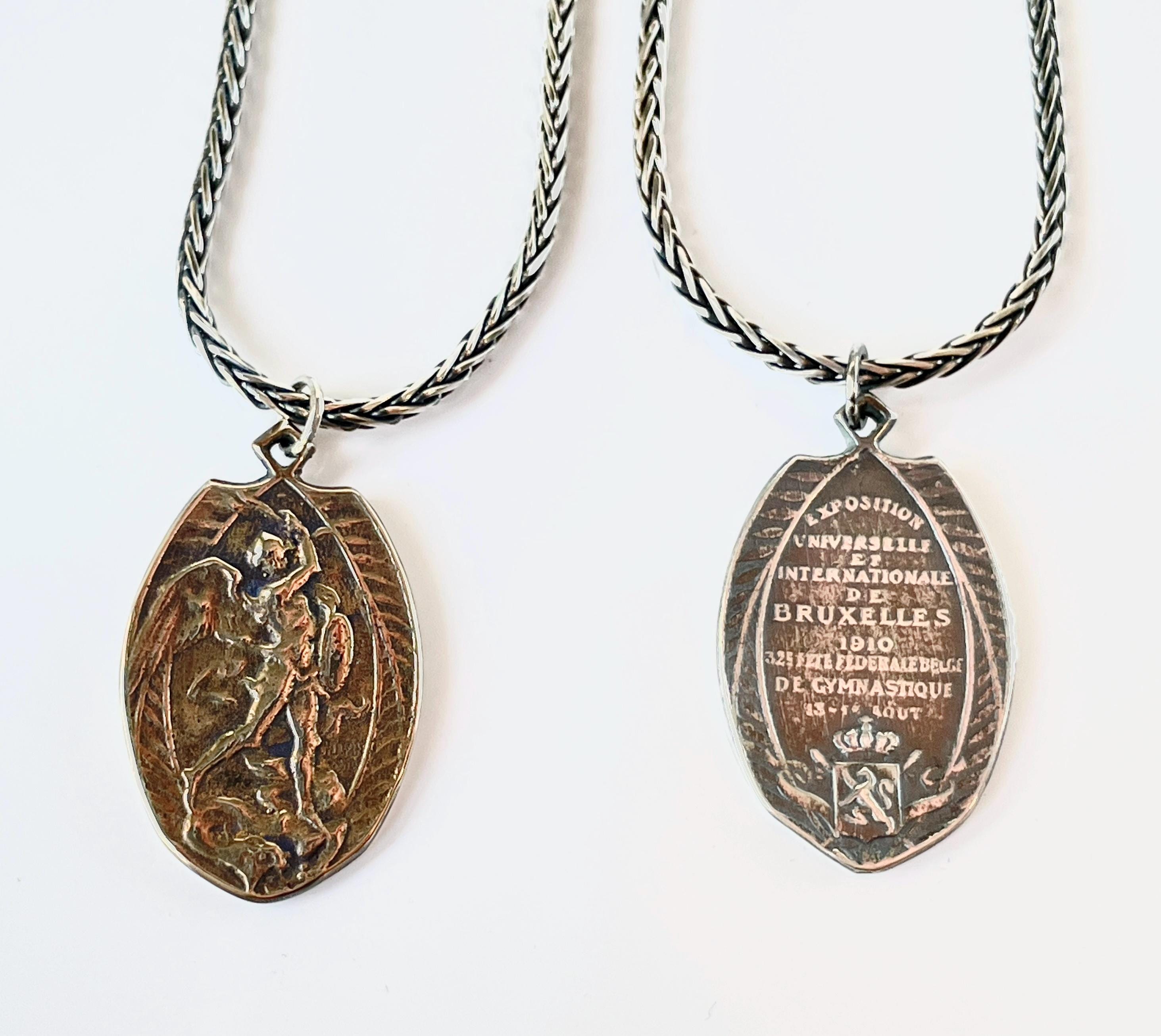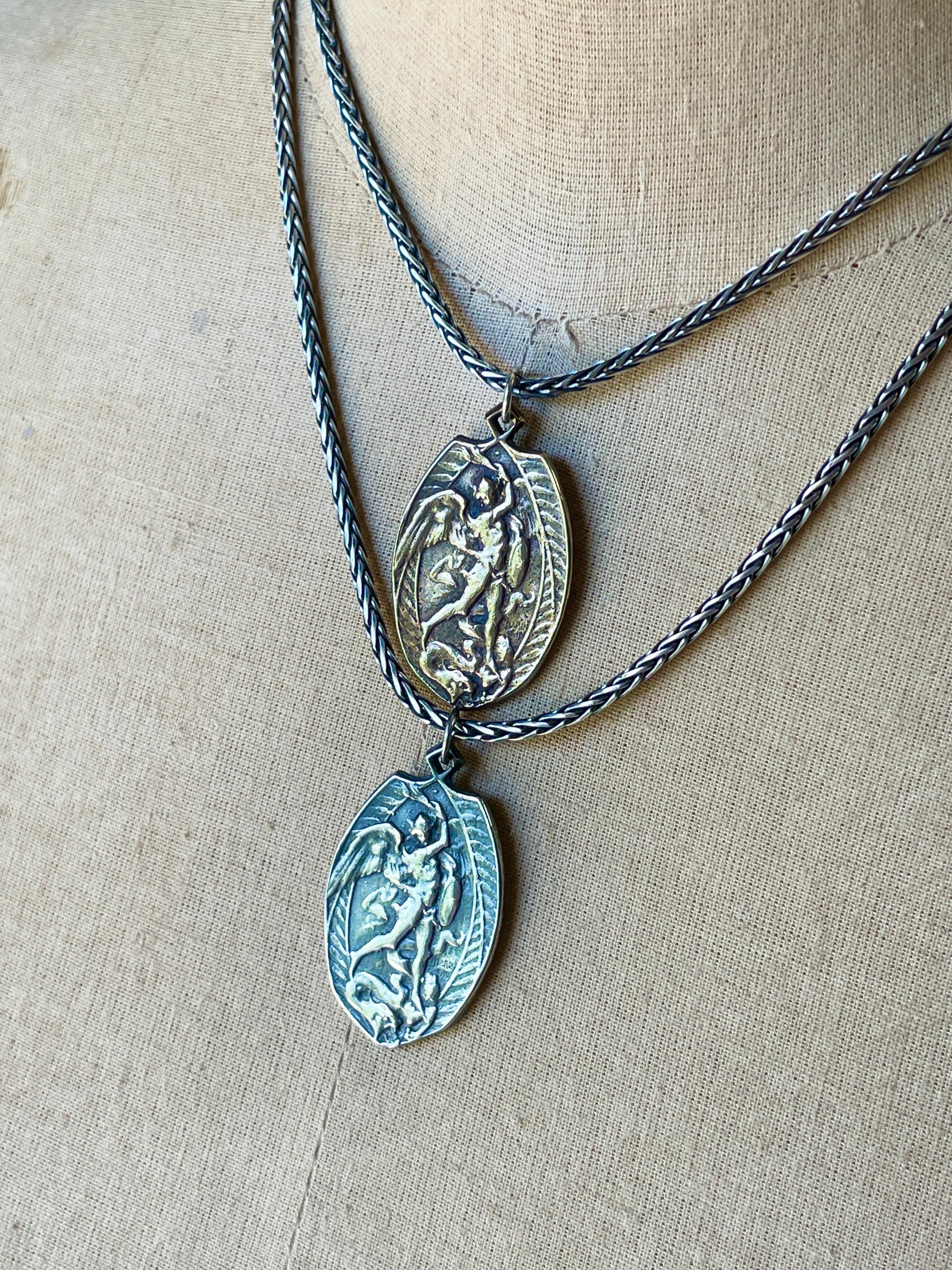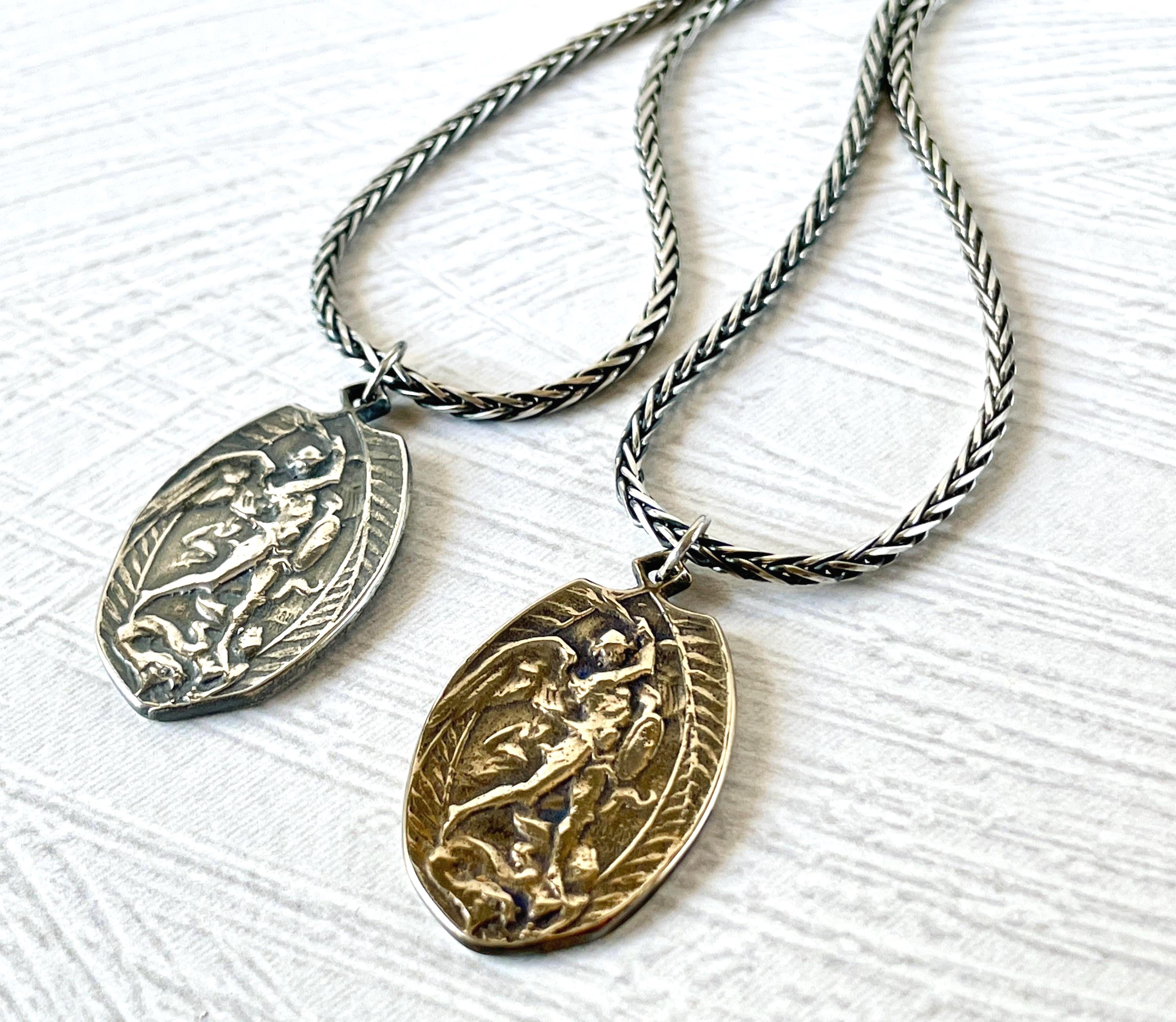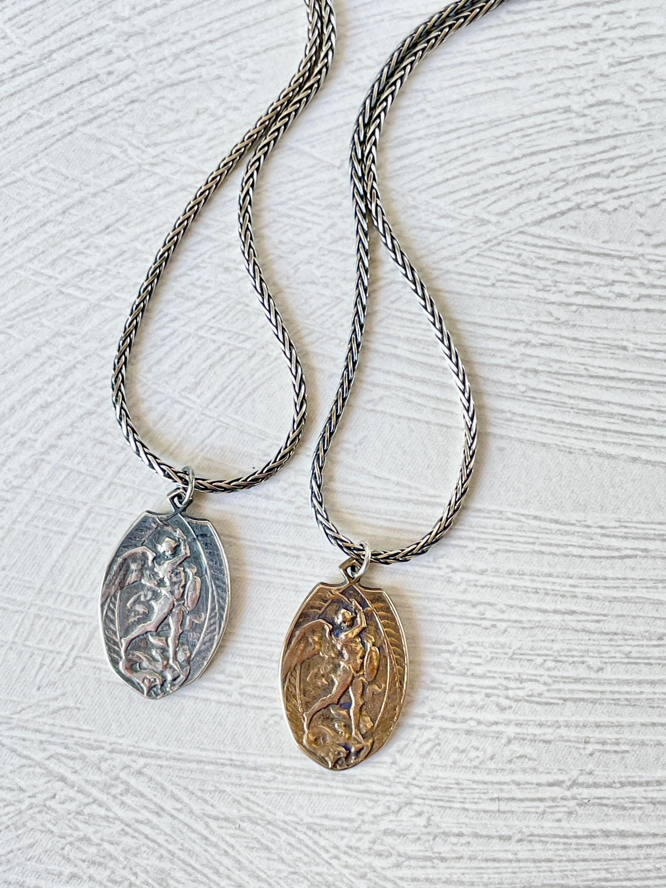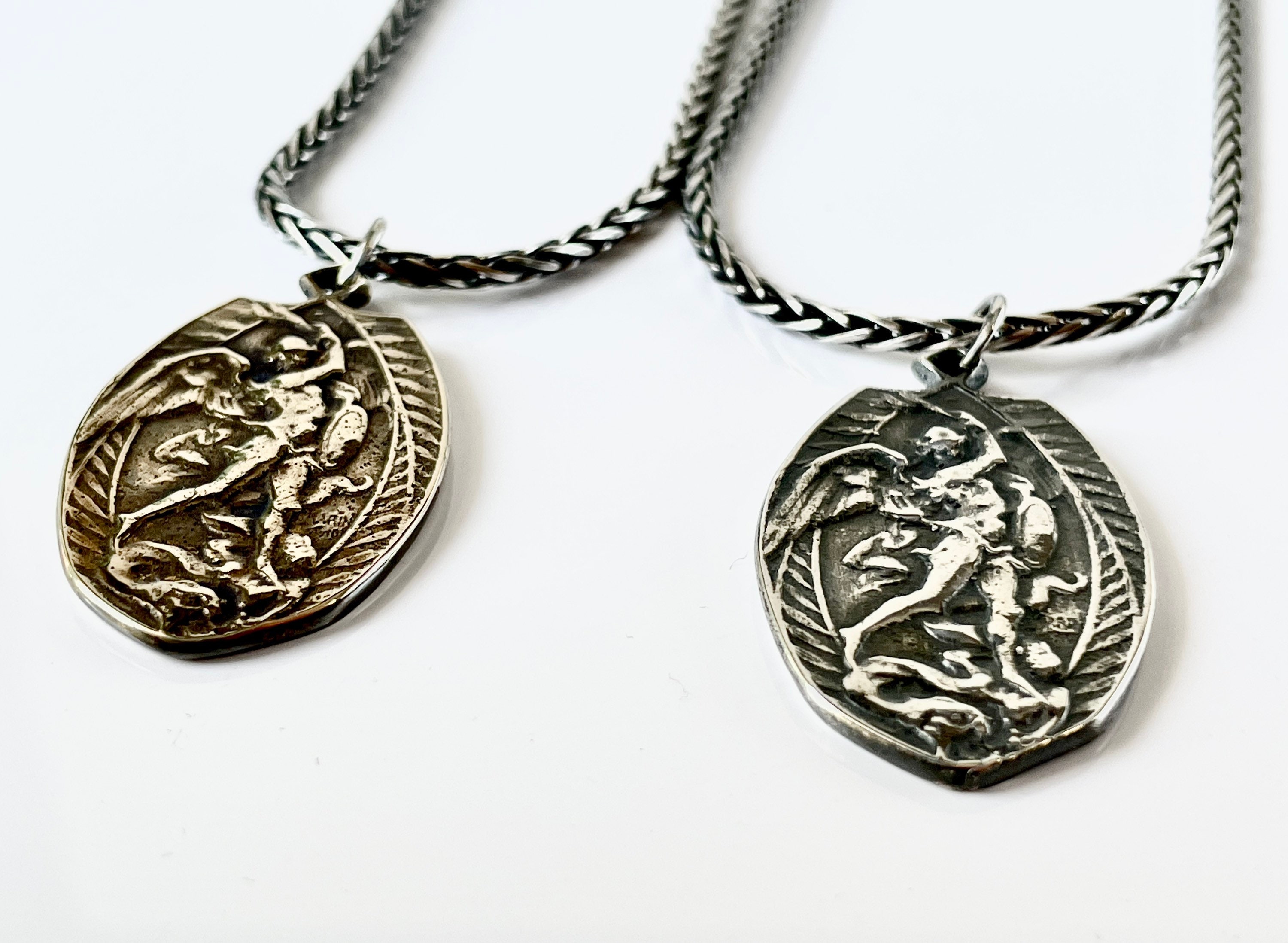 This substantial St. Michael medal is artisan-cast in solid sterling silver in our Gallivant Collective studio, recreated from a rare antique medallion designed by Belgian artist Jacques Marin (1877–1950). The original circa-1910 medal is part of our private collection, and we are honored to offer this faithful reproduction with all the depth, presence, and detail of the original work.