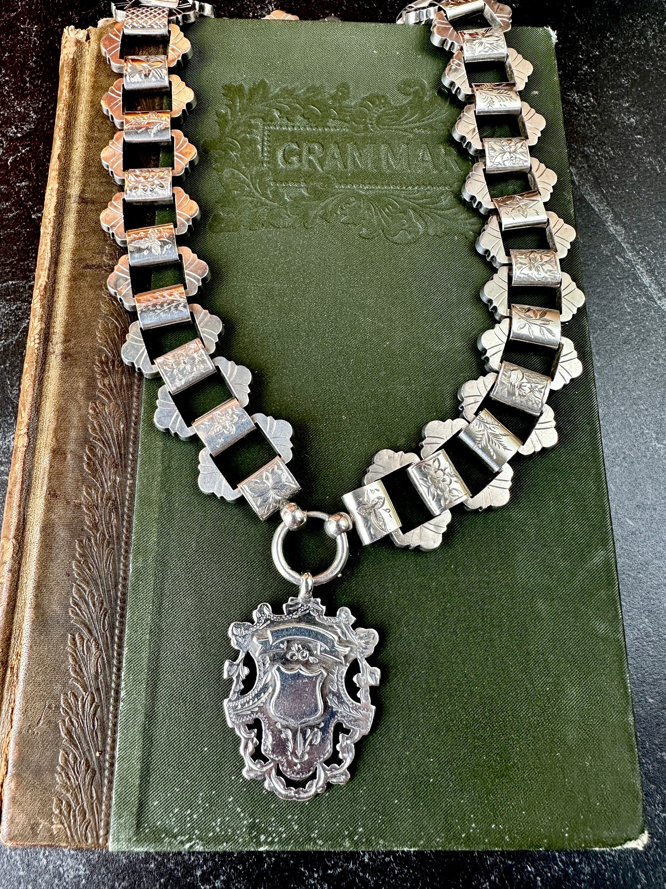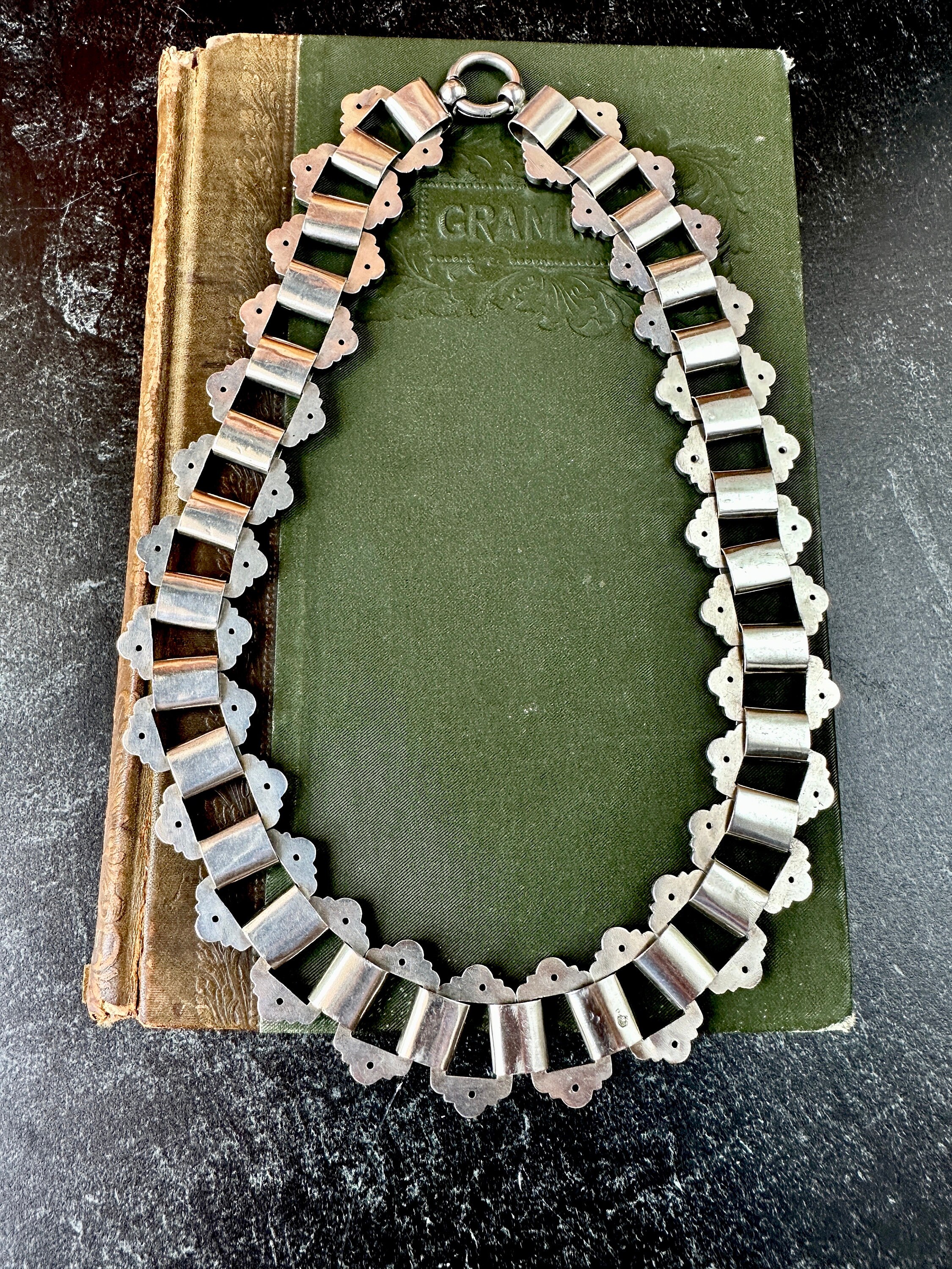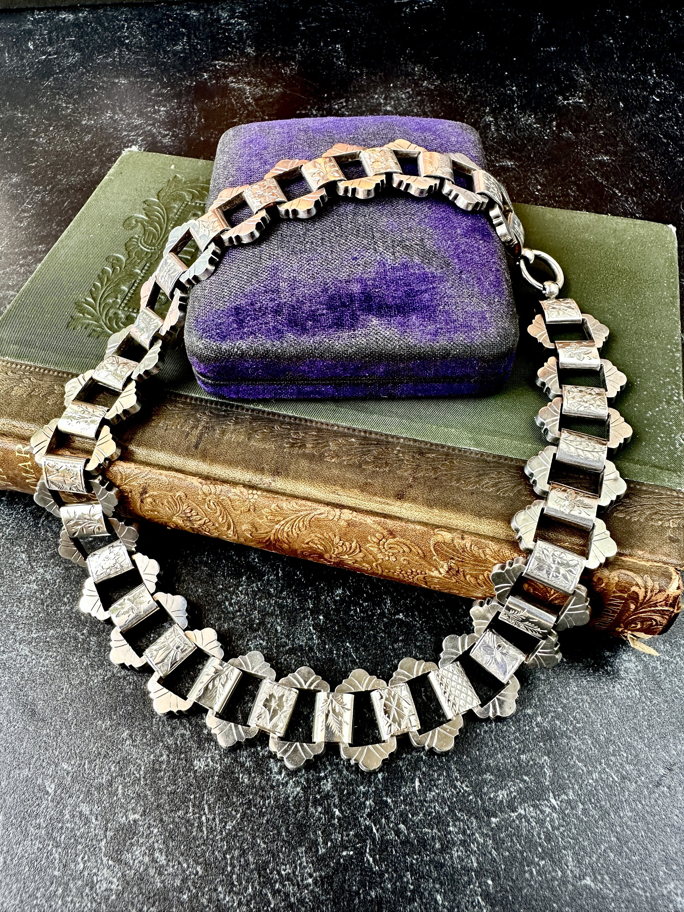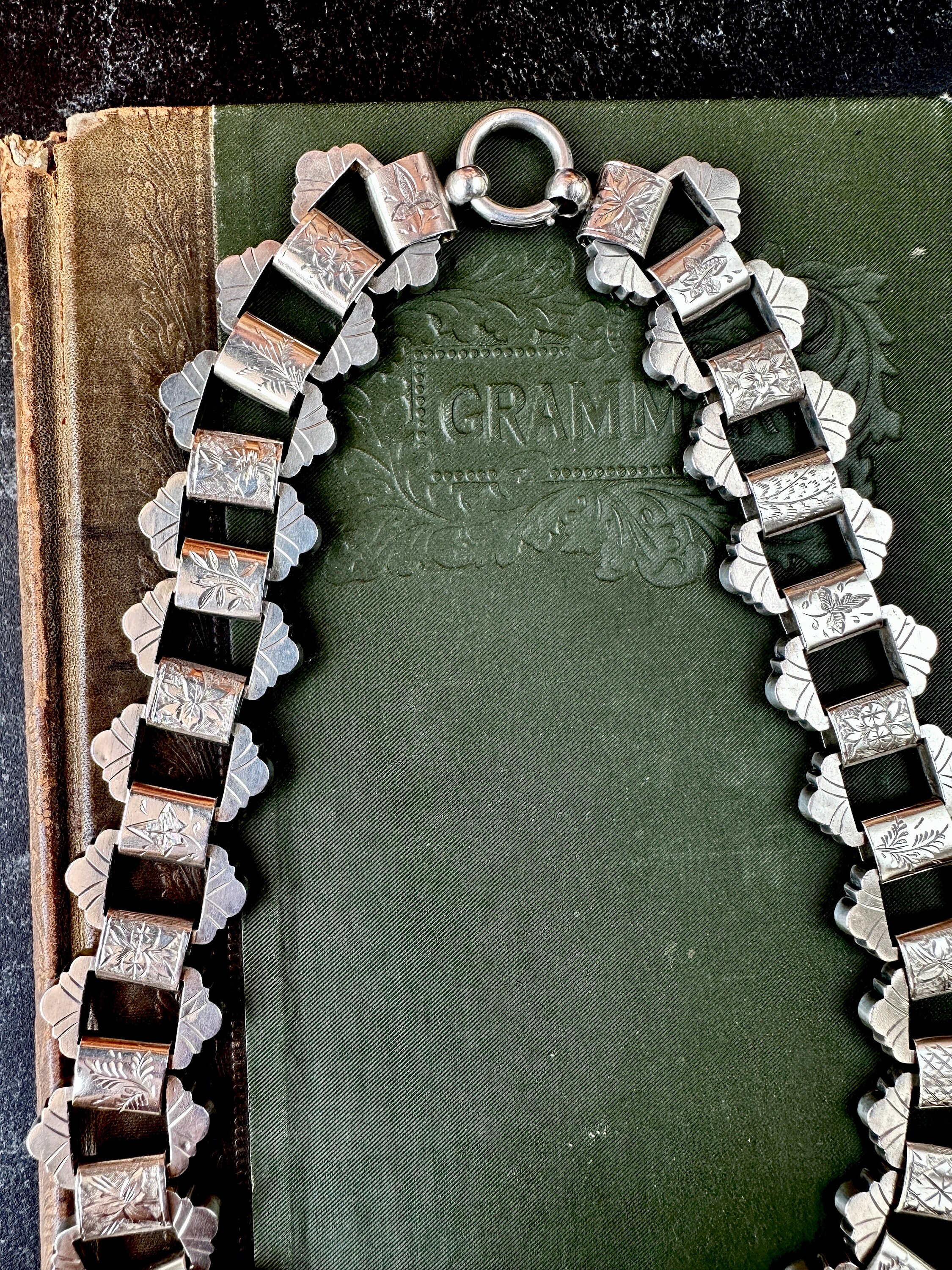 This bold Victorian sterling silver book chain necklace, circa 1860–1880, is a beautifully made example of the era’s most iconic chain style. Each link is individually hand-engraved with a different botanical motif, ferns, foliage, starbursts, creating a richly textured collar that sits beautifully against the neckline. Substantial at 19 inches long and nearly an inch wide as well as weighing 65 grams, it’s a rare larger-scale version of the classic book chain.