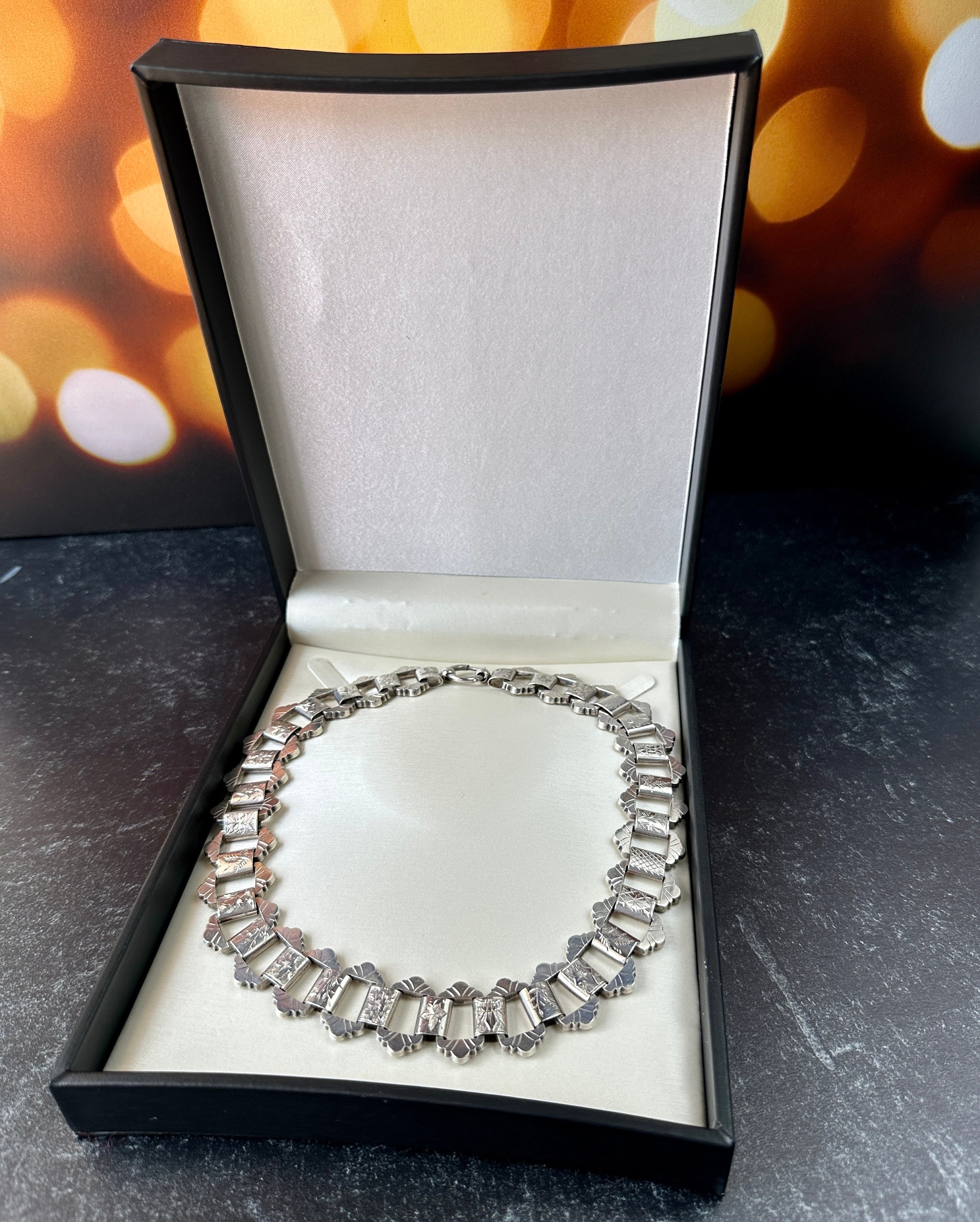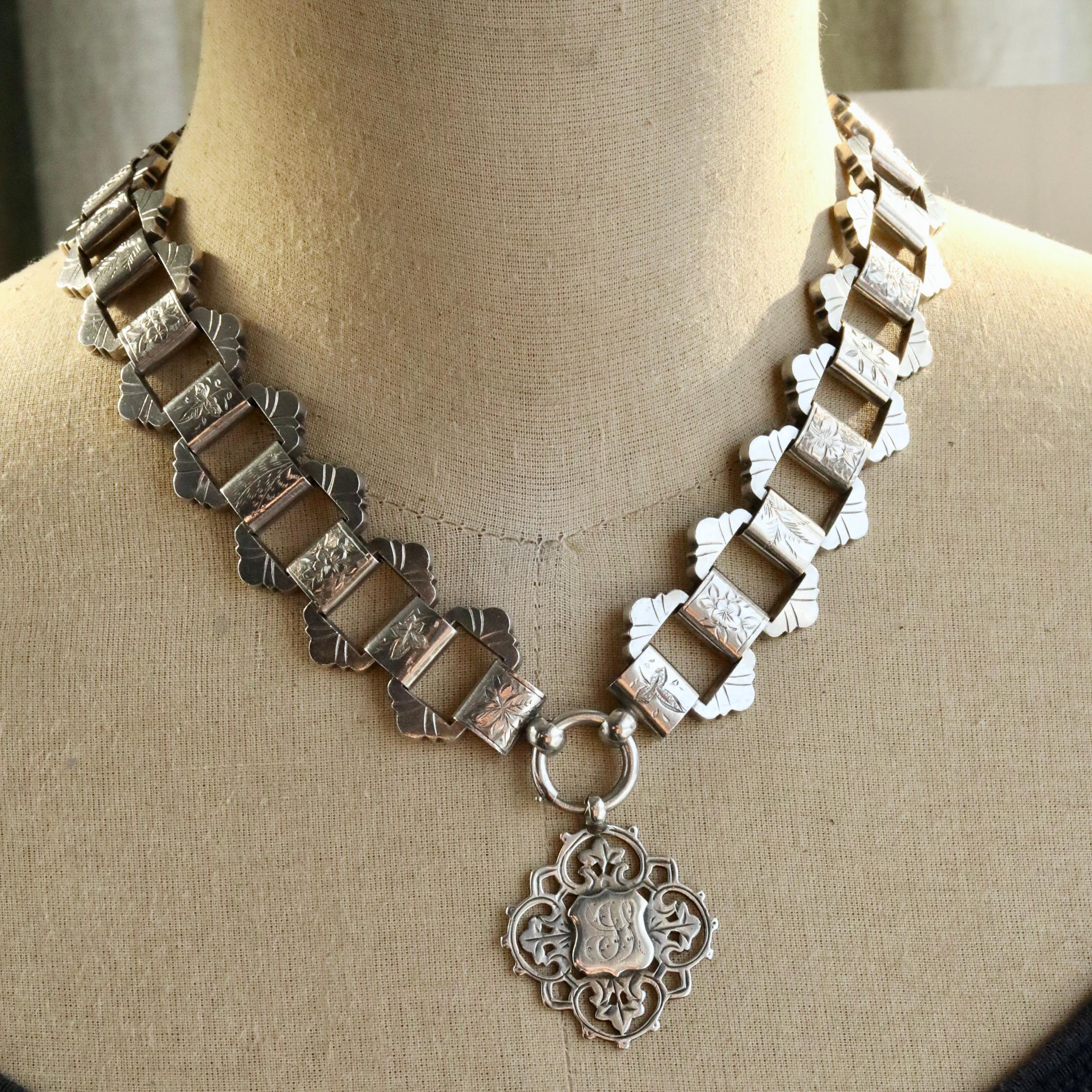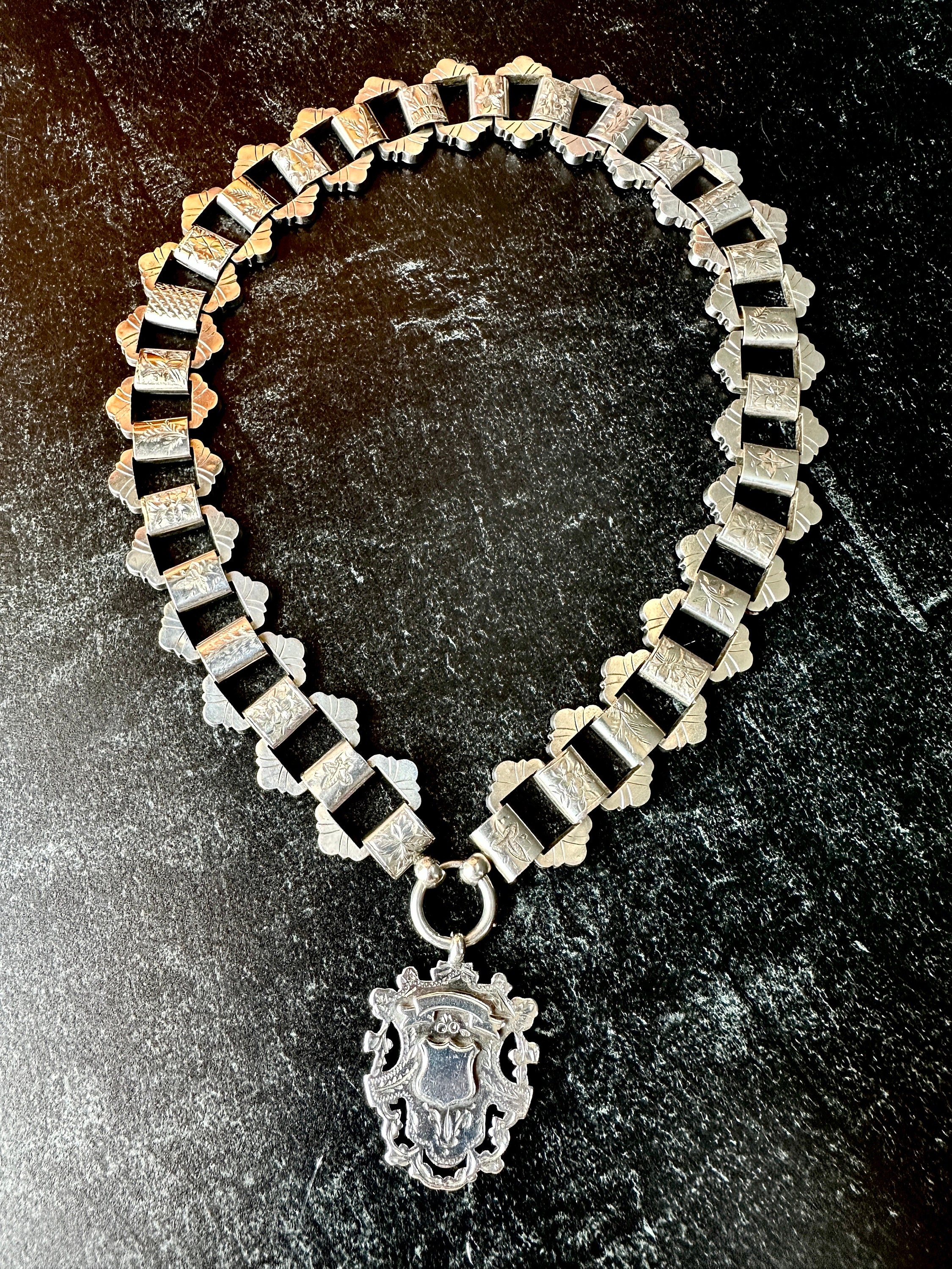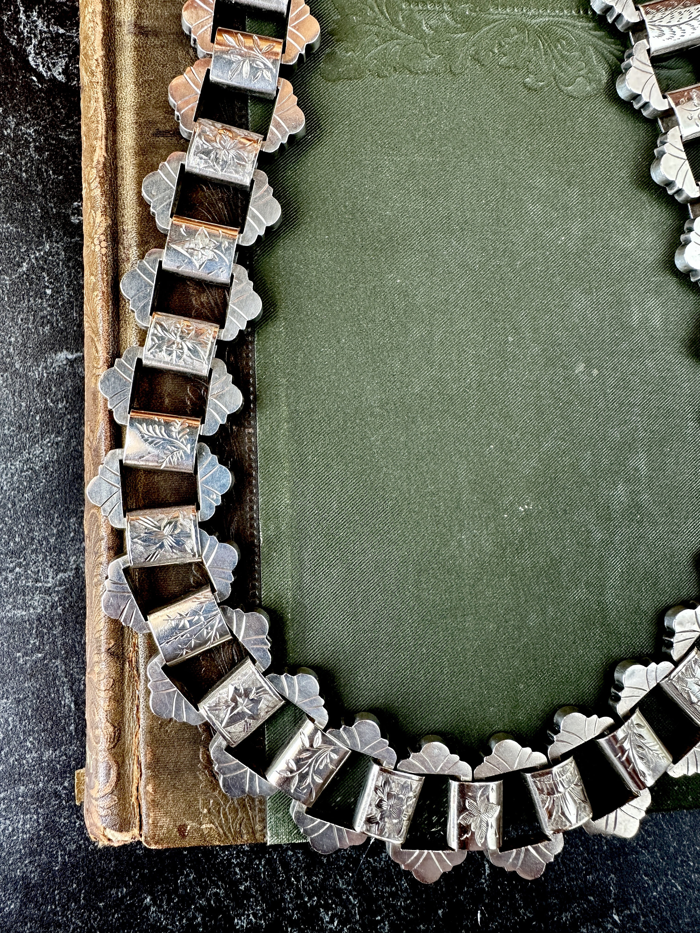 This bold Victorian sterling silver book chain necklace, circa 1860–1880, is a beautifully made example of the era’s most iconic chain style. Each link is individually hand-engraved with a different botanical motif, ferns, foliage, starbursts, creating a richly textured collar that sits beautifully against the neckline. Substantial at 19 inches long and nearly an inch wide as well as weighing 65 grams, it’s a rare larger-scale version of the classic book chain.