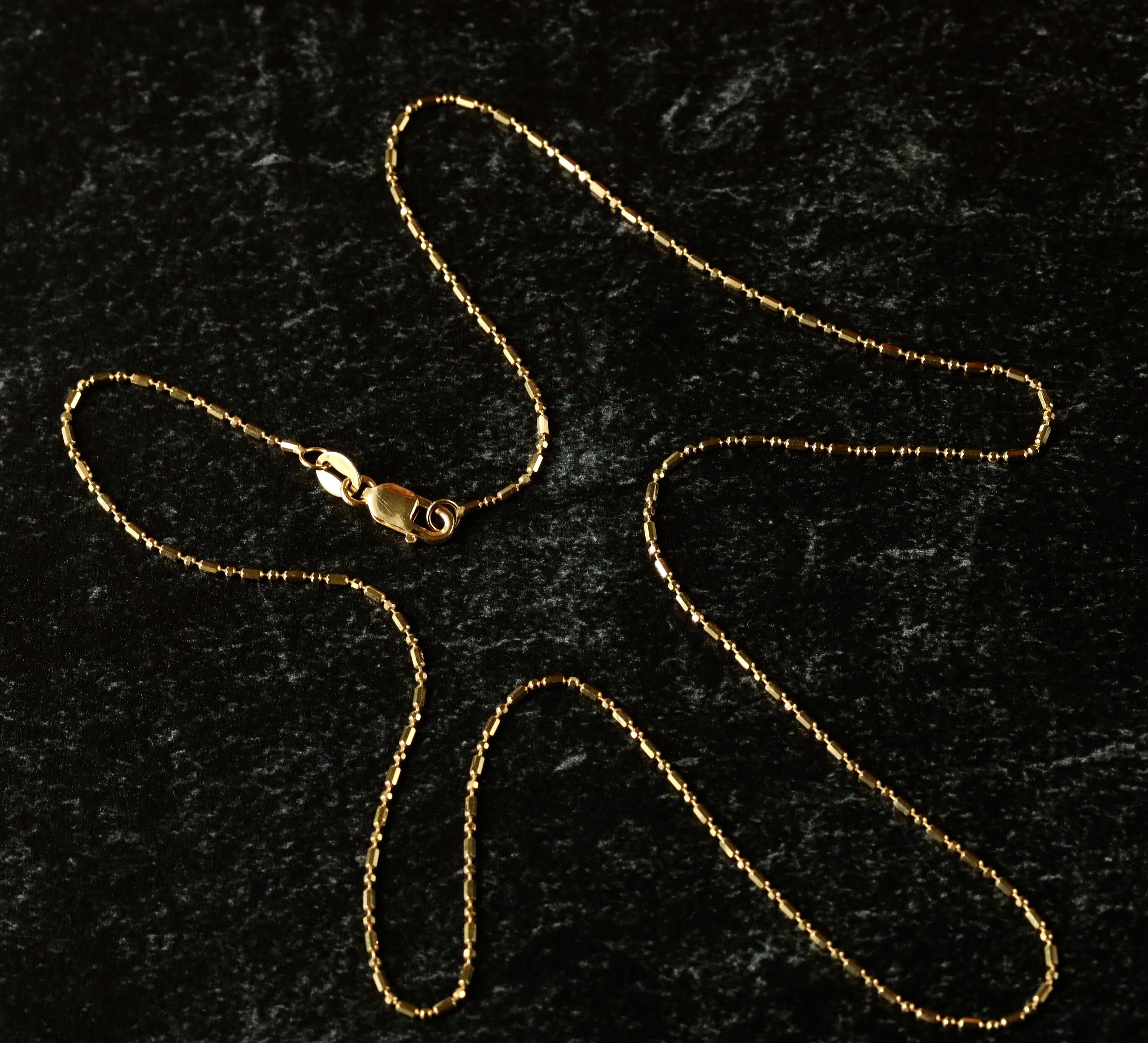 A finely crafted solid 14k gold bead chain with alternating faceted round and cylindrical beads that catch the light with subtle sparkle. At 0.9mm wide, this delicate chain is perfect for wearing alone or pairing with small pendants and drops. A beautiful, minimalist essential for everyday wear.