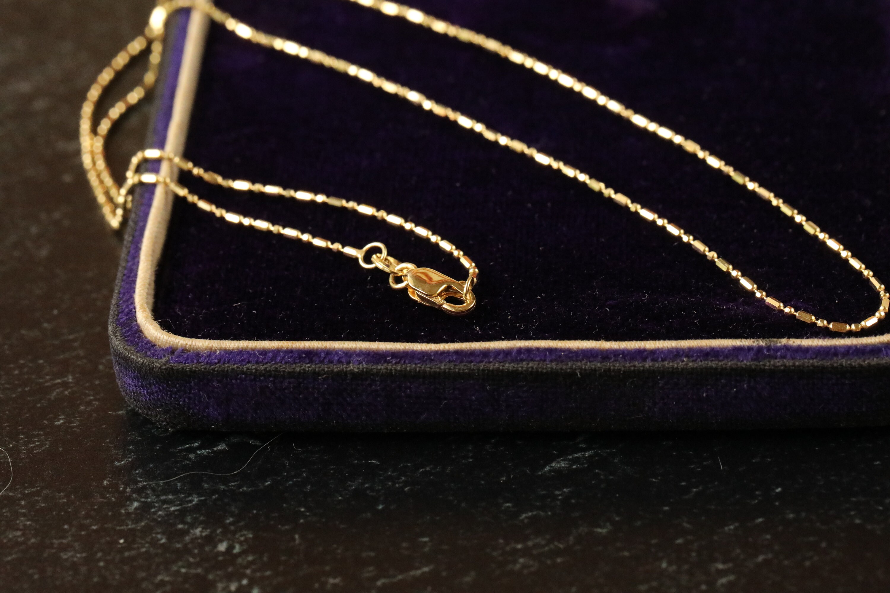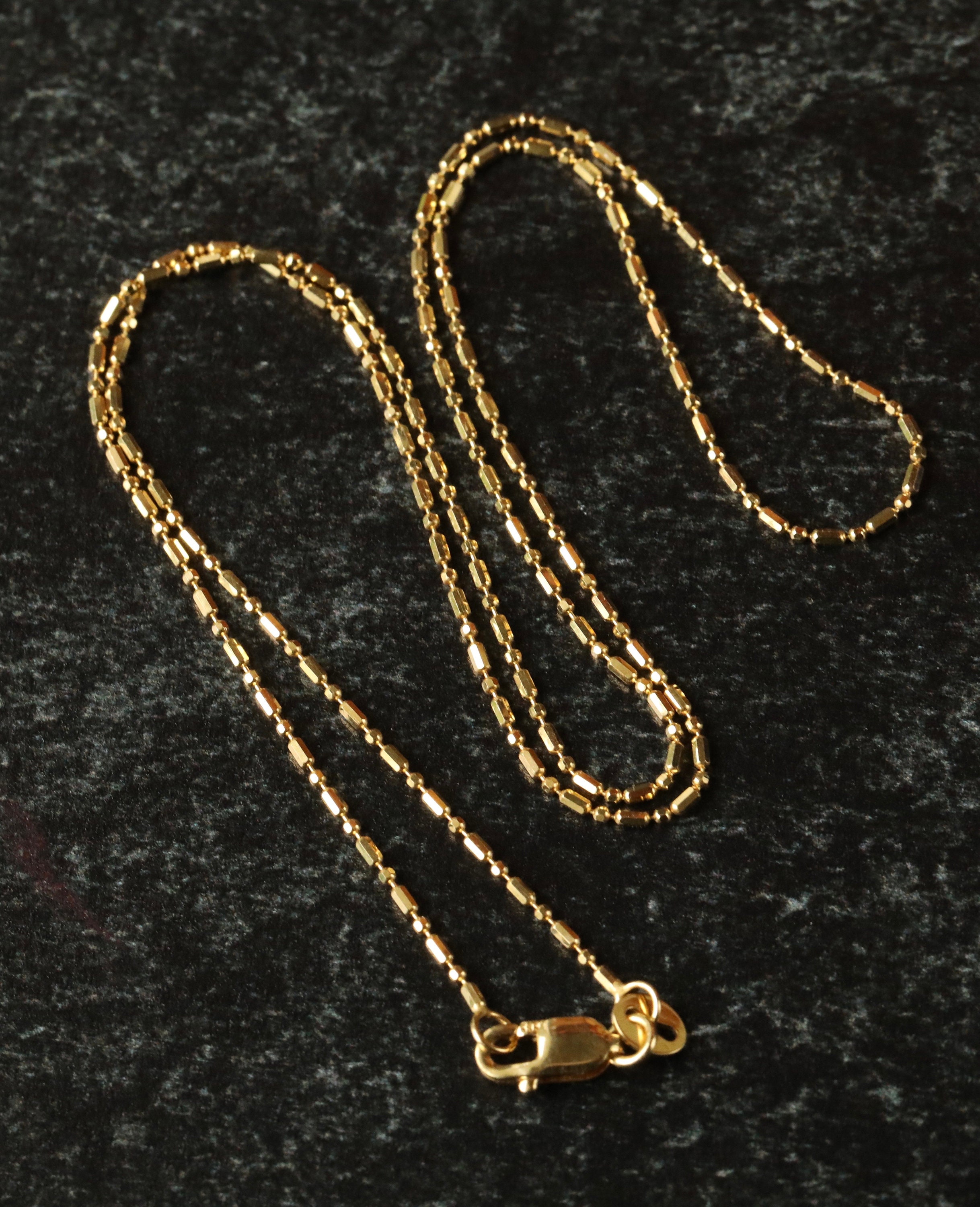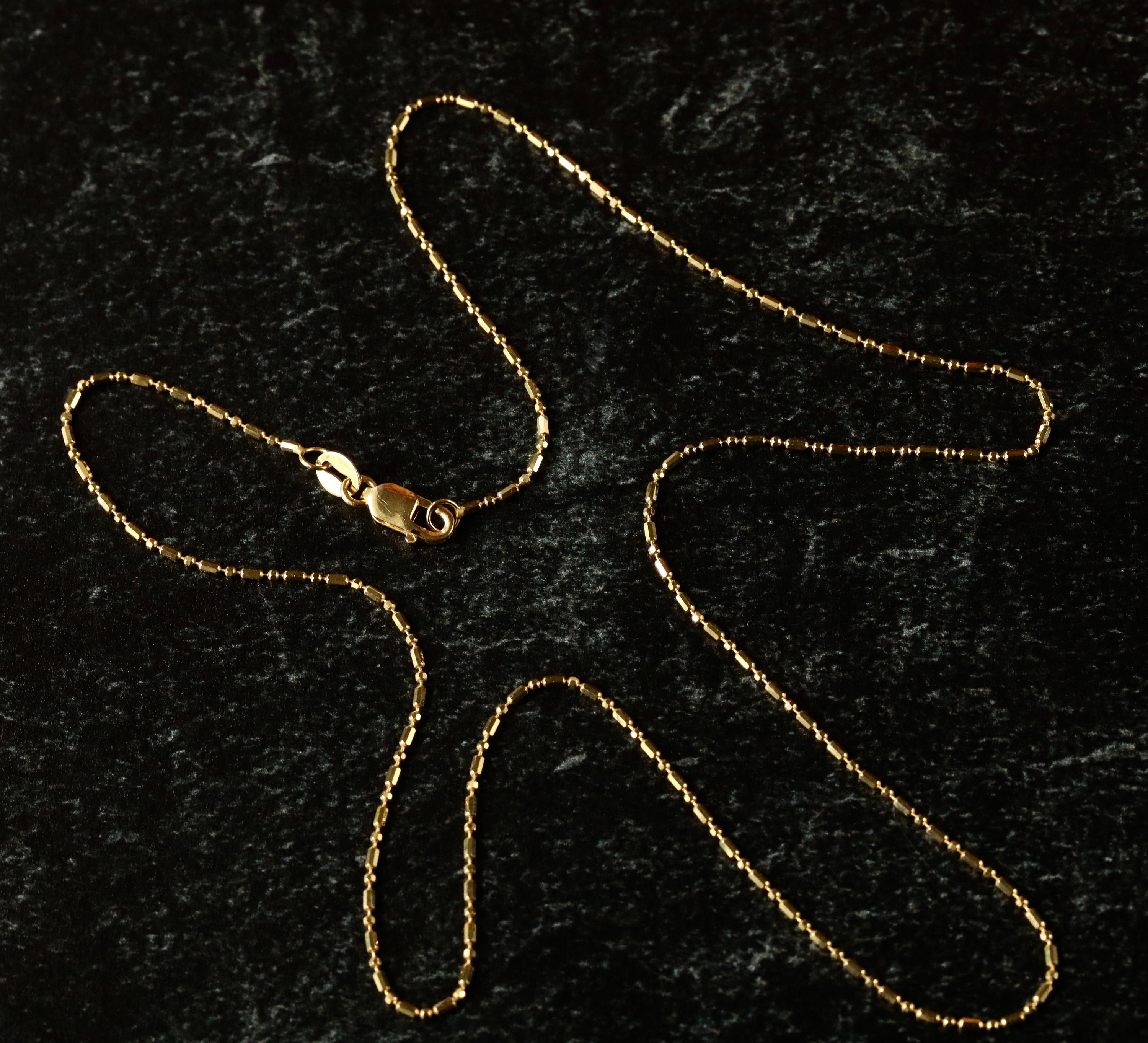 A finely crafted solid 14k gold bead chain featuring alternating faceted round and cylindrical beads that reflect light with refined sparkle. The 0.9mm width gives this chain a delicate, minimalist profile that works beautifully alone or layered with other fine gold pieces.