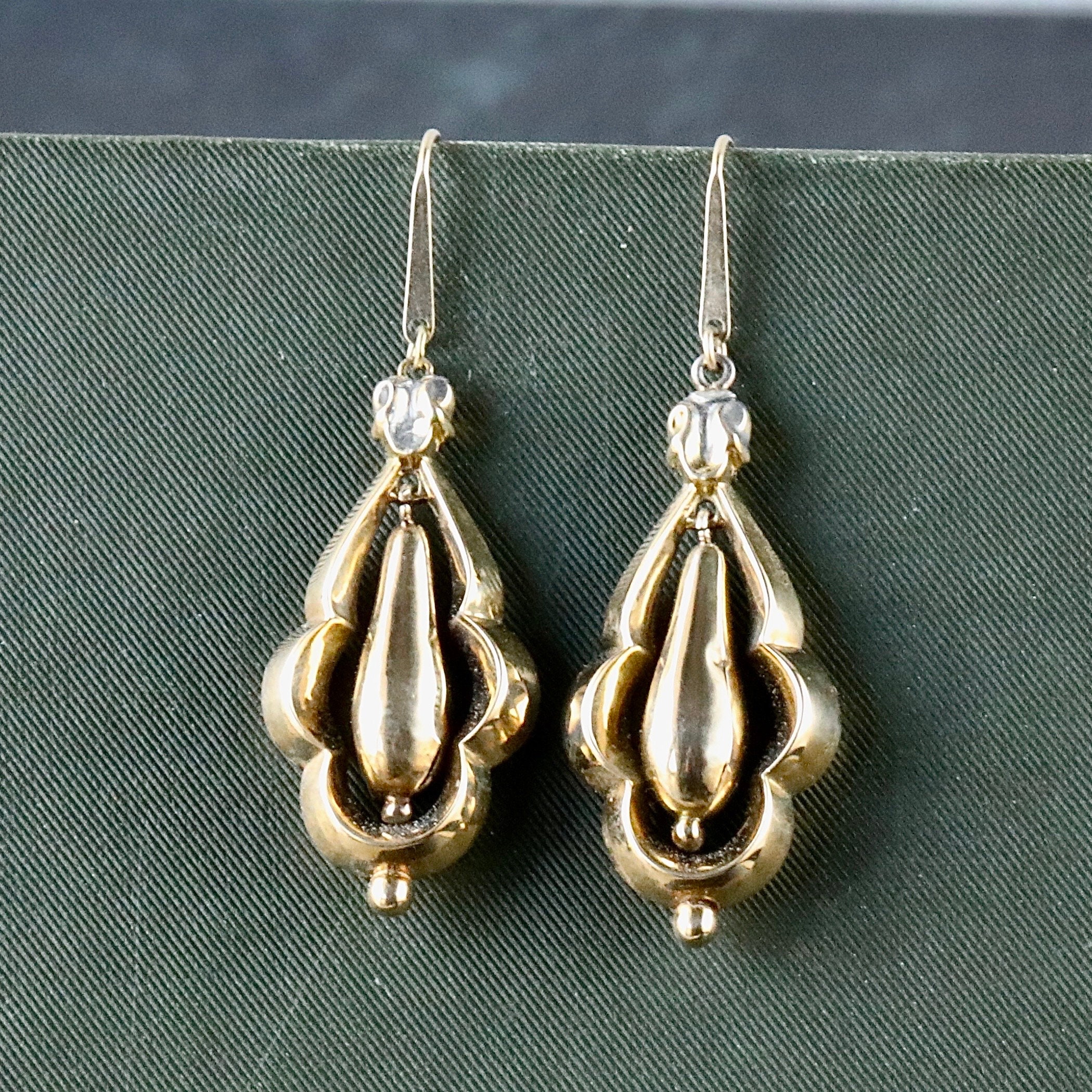 A pair of Victorian 14k gold drop earrings with sculptural hollow-body construction and graceful movement. The teardrop inner elements swing freely within scalloped outer frames, creating dimension and lightness while remaining comfortable on the ear.