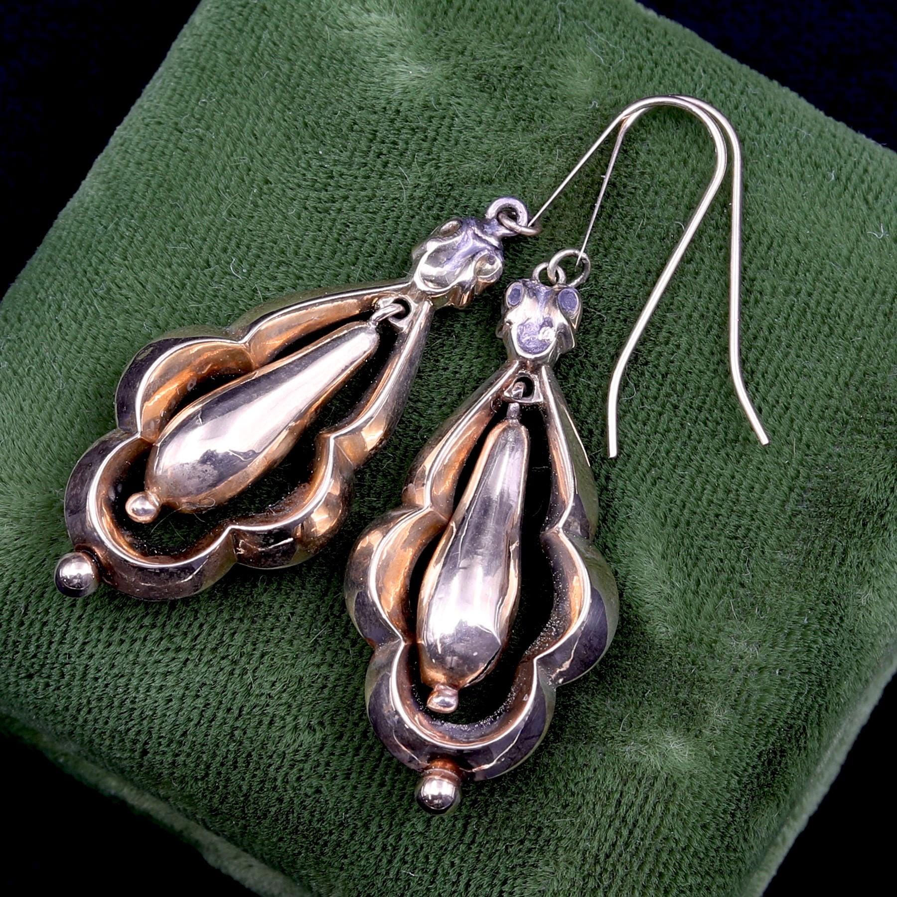 These earrings represent a higher-quality example of Victorian hollow drops, fully finished on both sides and carefully hand formed. The construction gives the visual presence of solid gold while remaining lightweight and wearable for extended periods, a hallmark of well-designed 19th-century jewelry.