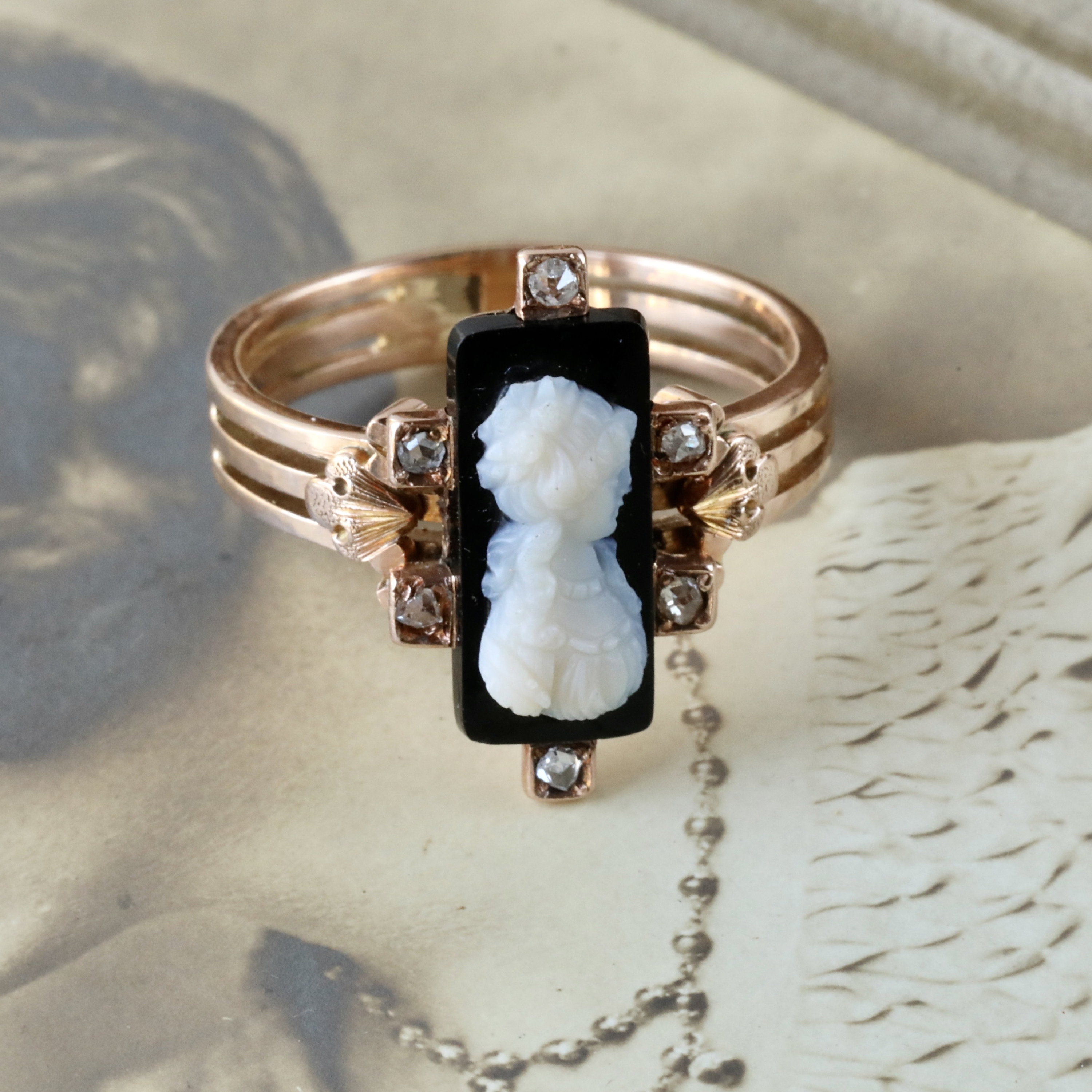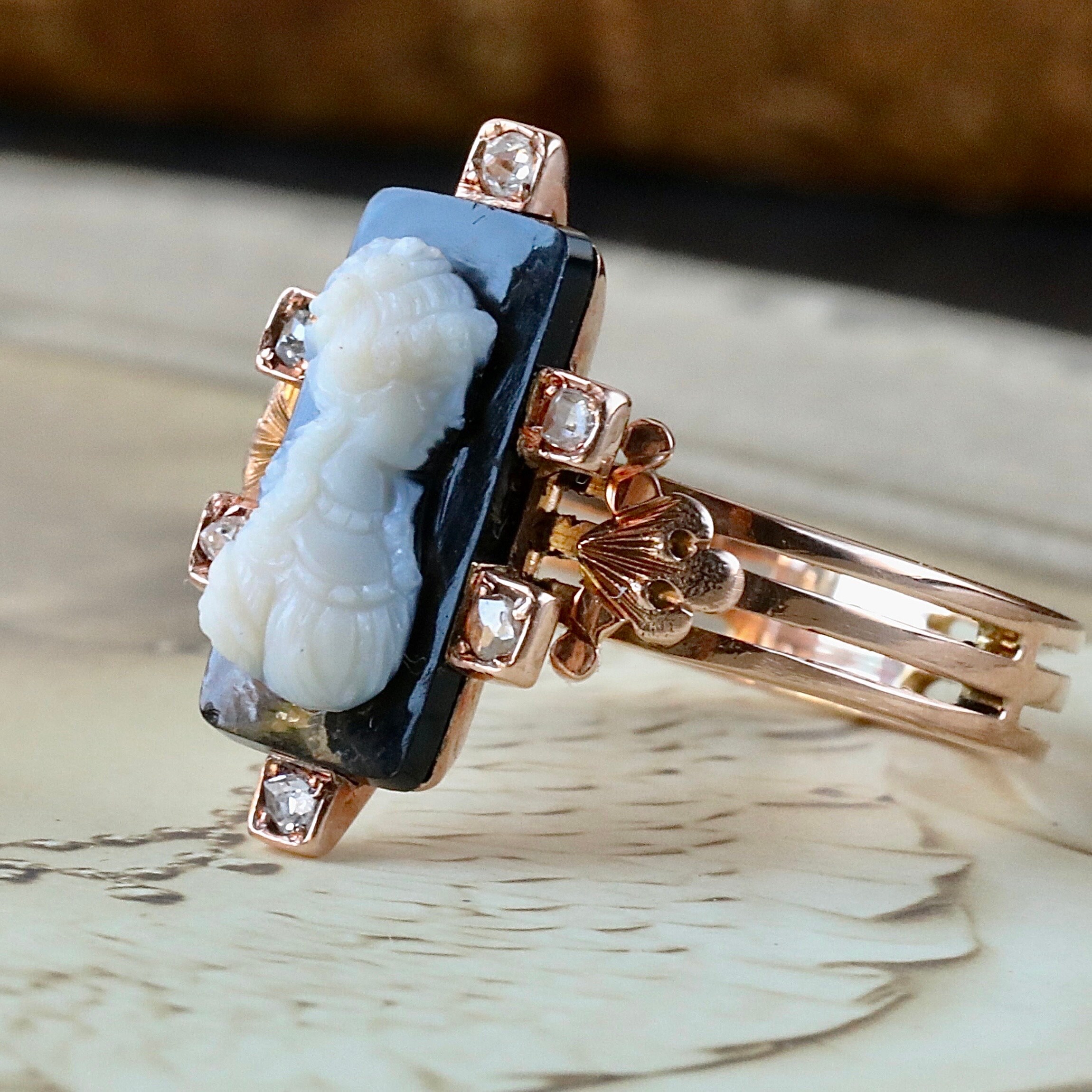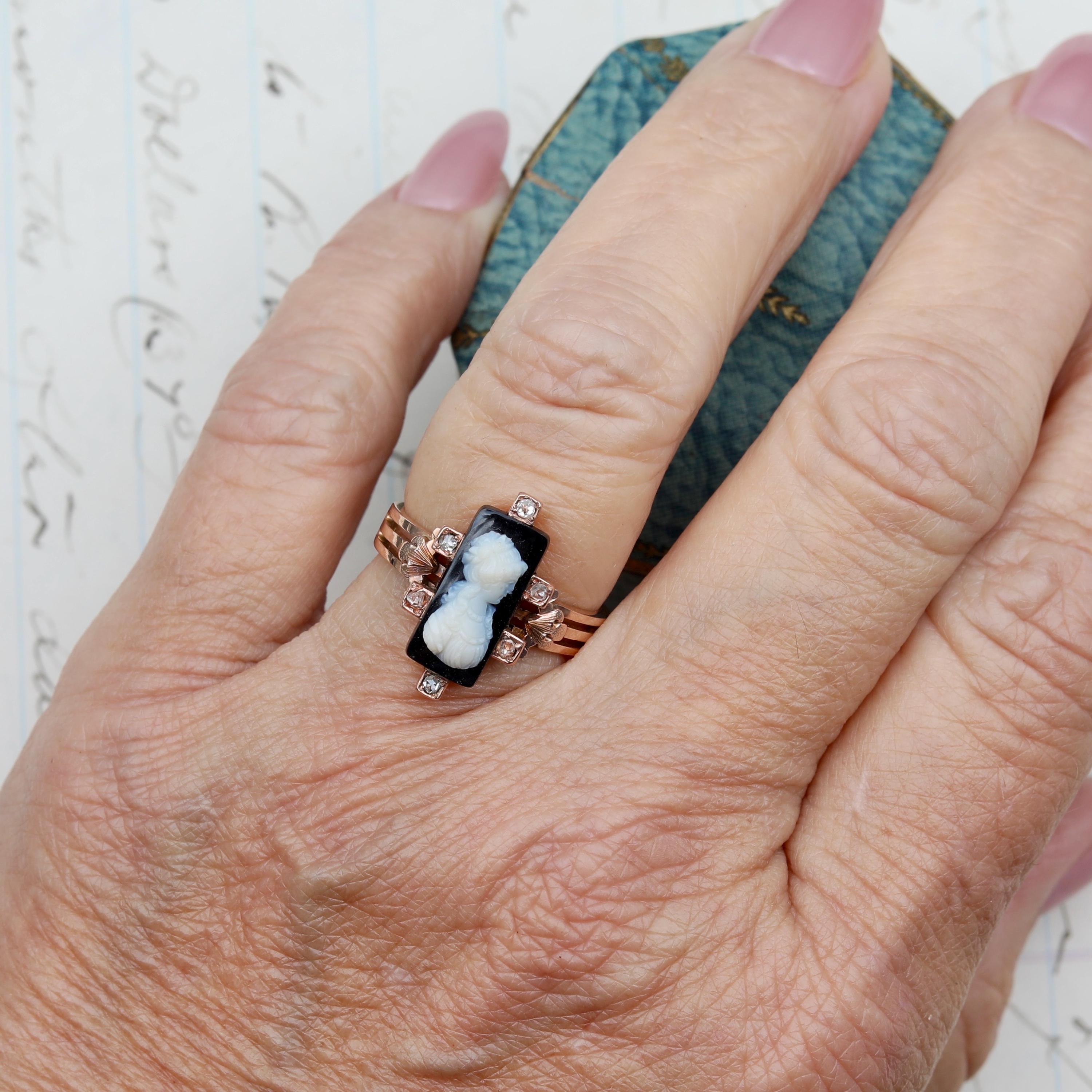 The cameo itself is finely rendered, depicting a young woman in profile with delicate drapery and hair detail. Rose-cut diamonds accent the frame, subtle, antique, and full of period charm. The triple-band shoulders feature engraved Victorian motifs and add to its distinctive silhouette.