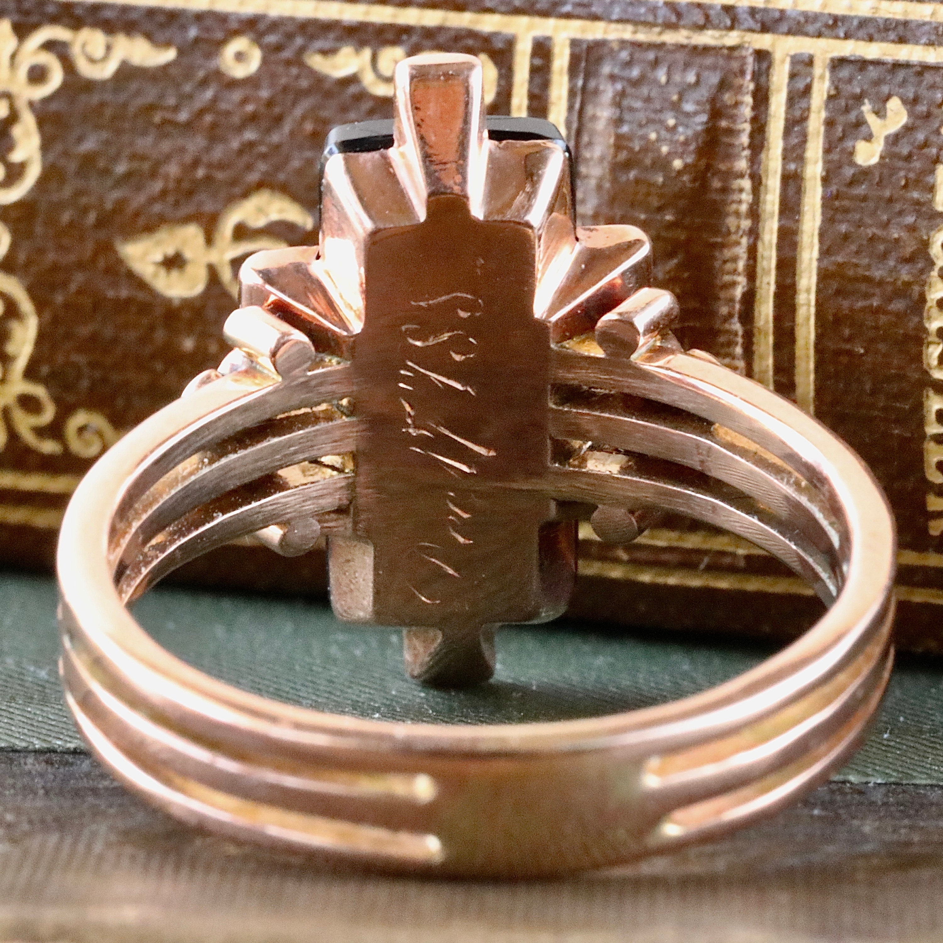 A beautifully carved Victorian onyx and hardstone cameo, framed by six glittering rose-cut diamonds and set in warm 14k rose gold. This elongated navette-style ring dates to the late 19th century and is further personalized by an interior inscription: “Dec. 17, 188?”, the final digit softened with time. A truly intimate survivor of the era.
