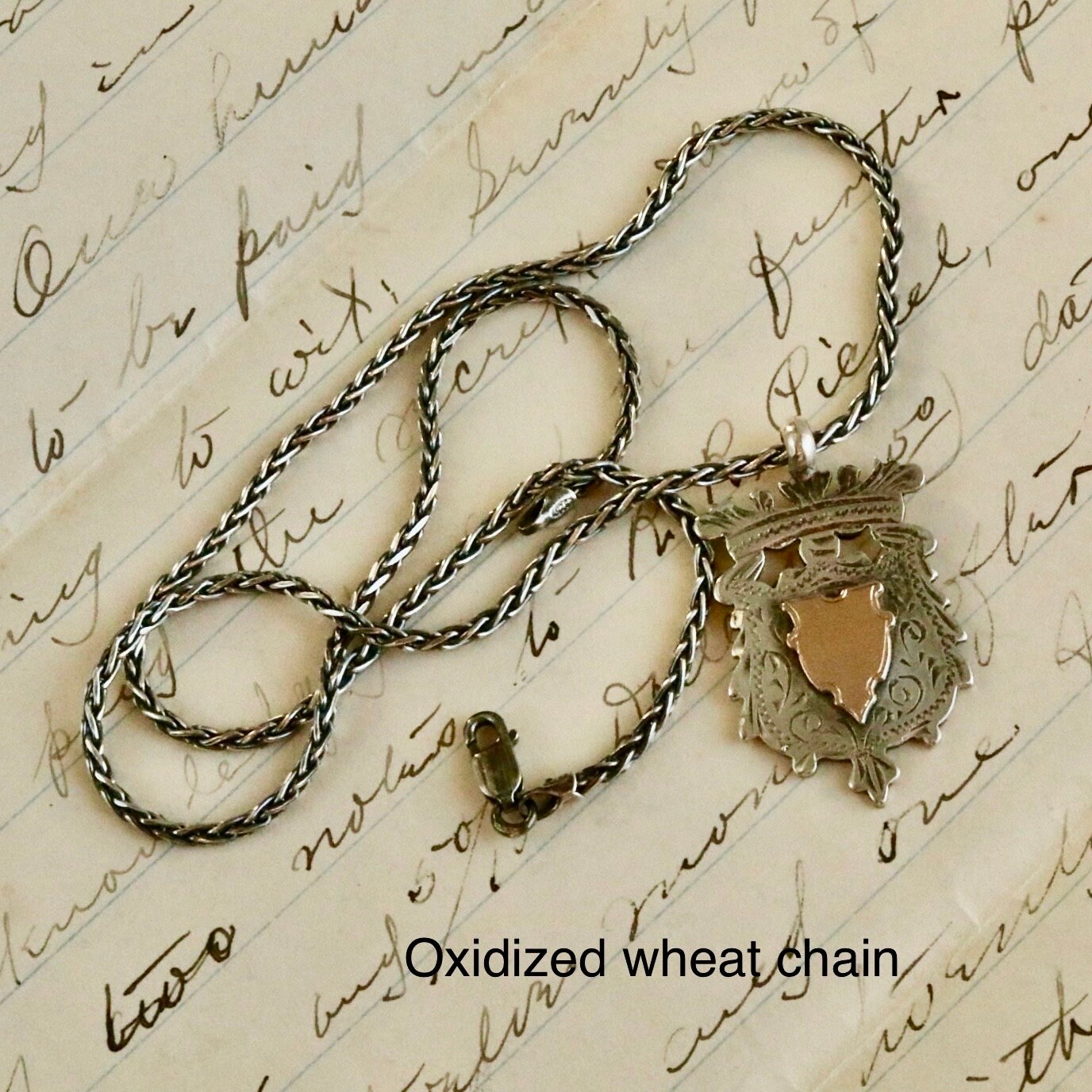 Originally worn on a gentleman’s watch chain, the fob now makes a striking unisex pendant. The combination of sterling and rose gold gives it warmth and depth, while its military history lends a bold, slightly gothic character. Paired with our Italian-made sterling wheat chain, it becomes a comfortable, stylish necklace—perfect for layering or wearing as a standalone statement.