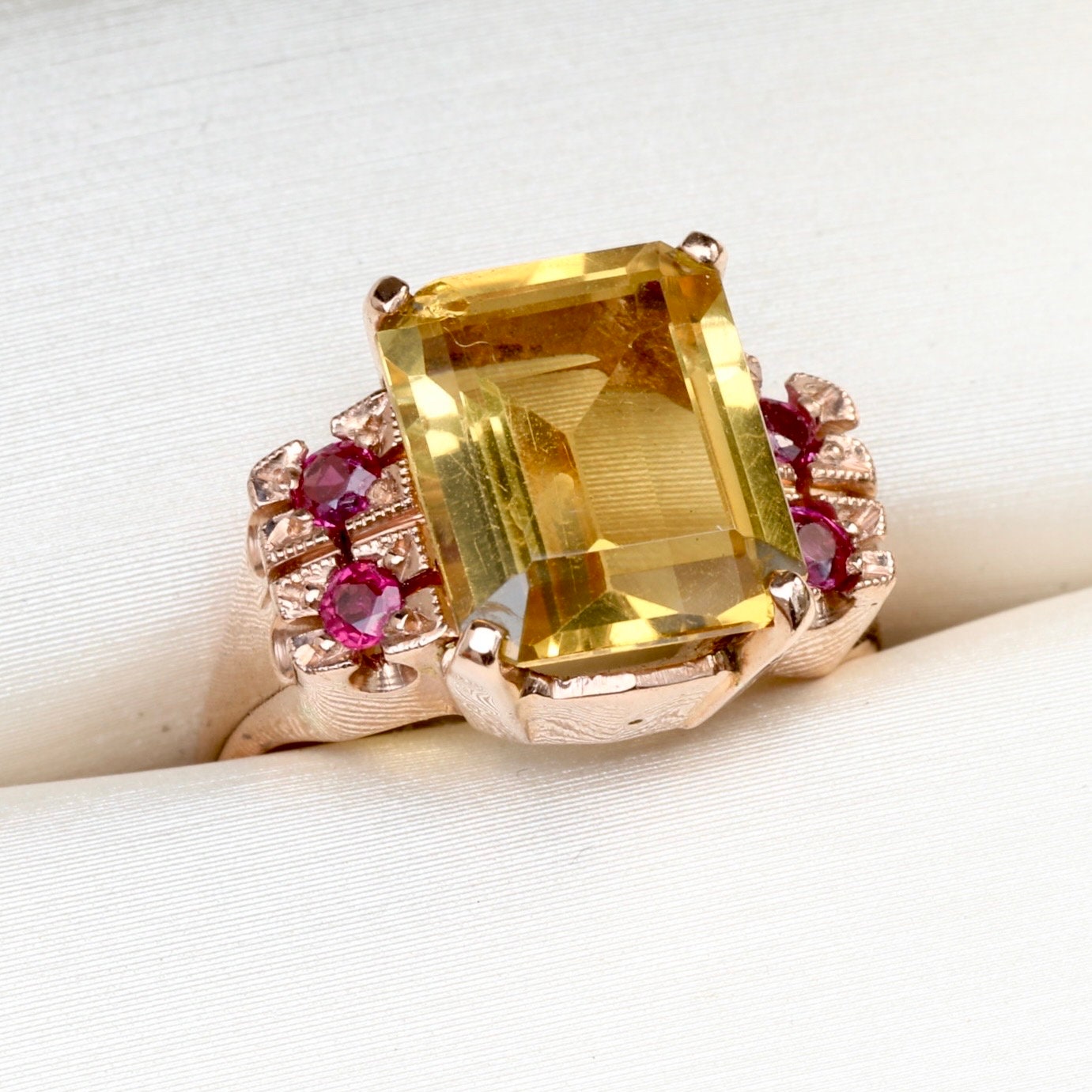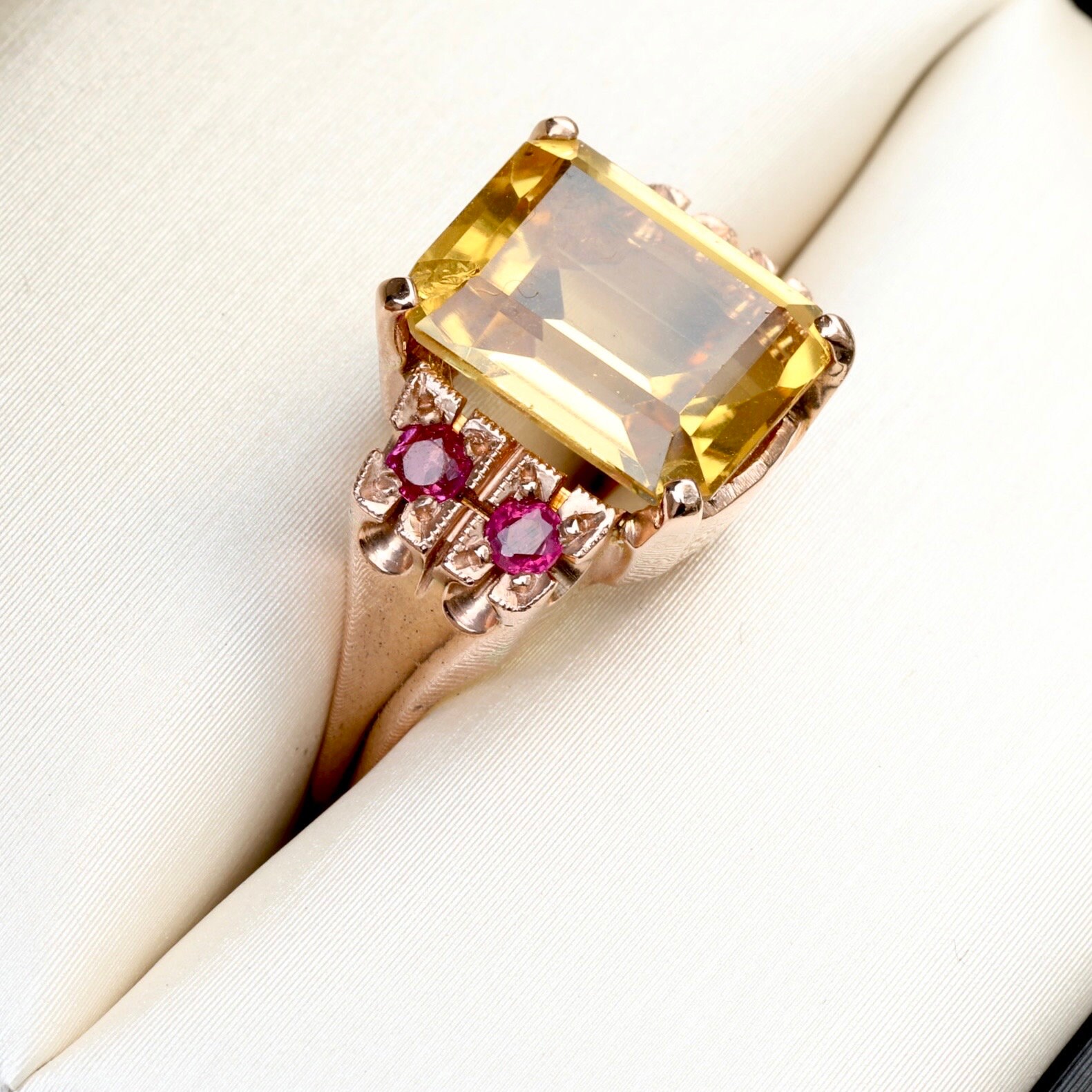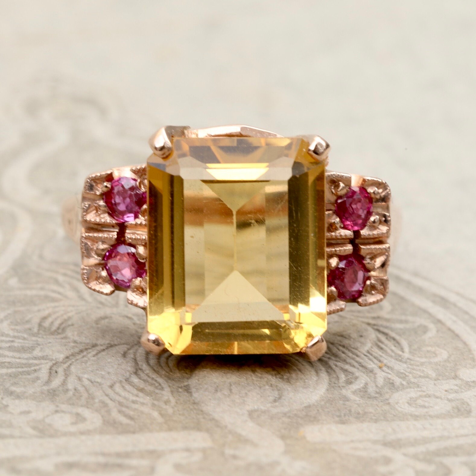 A bold and beautifully preserved Retro-era ring from the 1940s, set with a luminous 3.64ct emerald-cut citrine, framed by four bright natural rubies. Crafted in warm 14k rose gold, the ring features hand-applied milgrain and carved details around the ruby settings—hallmarks of mid-century craftsmanship.