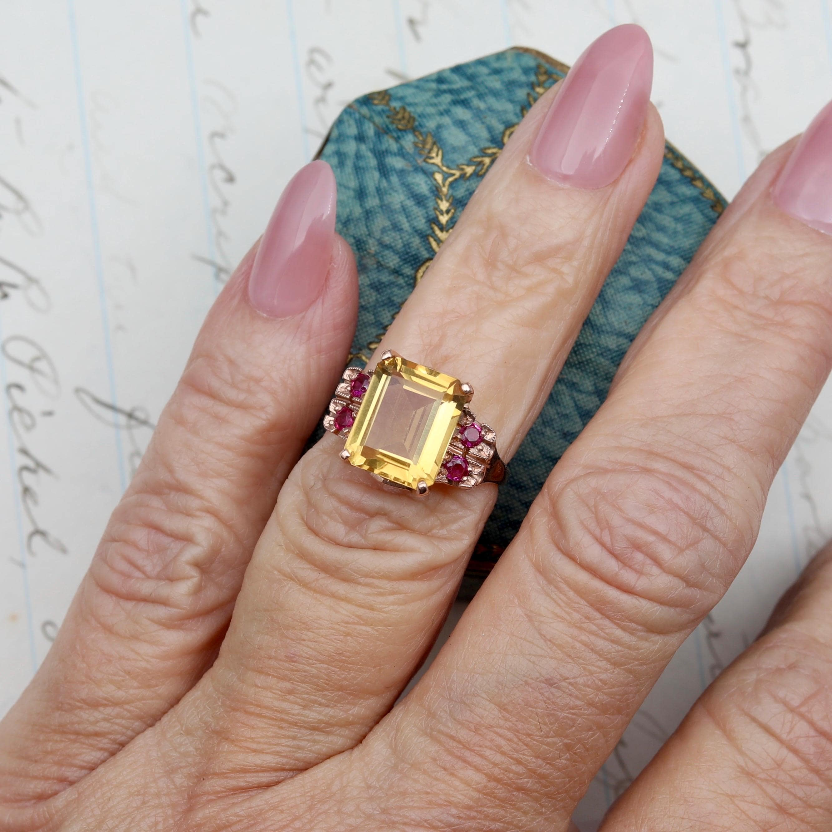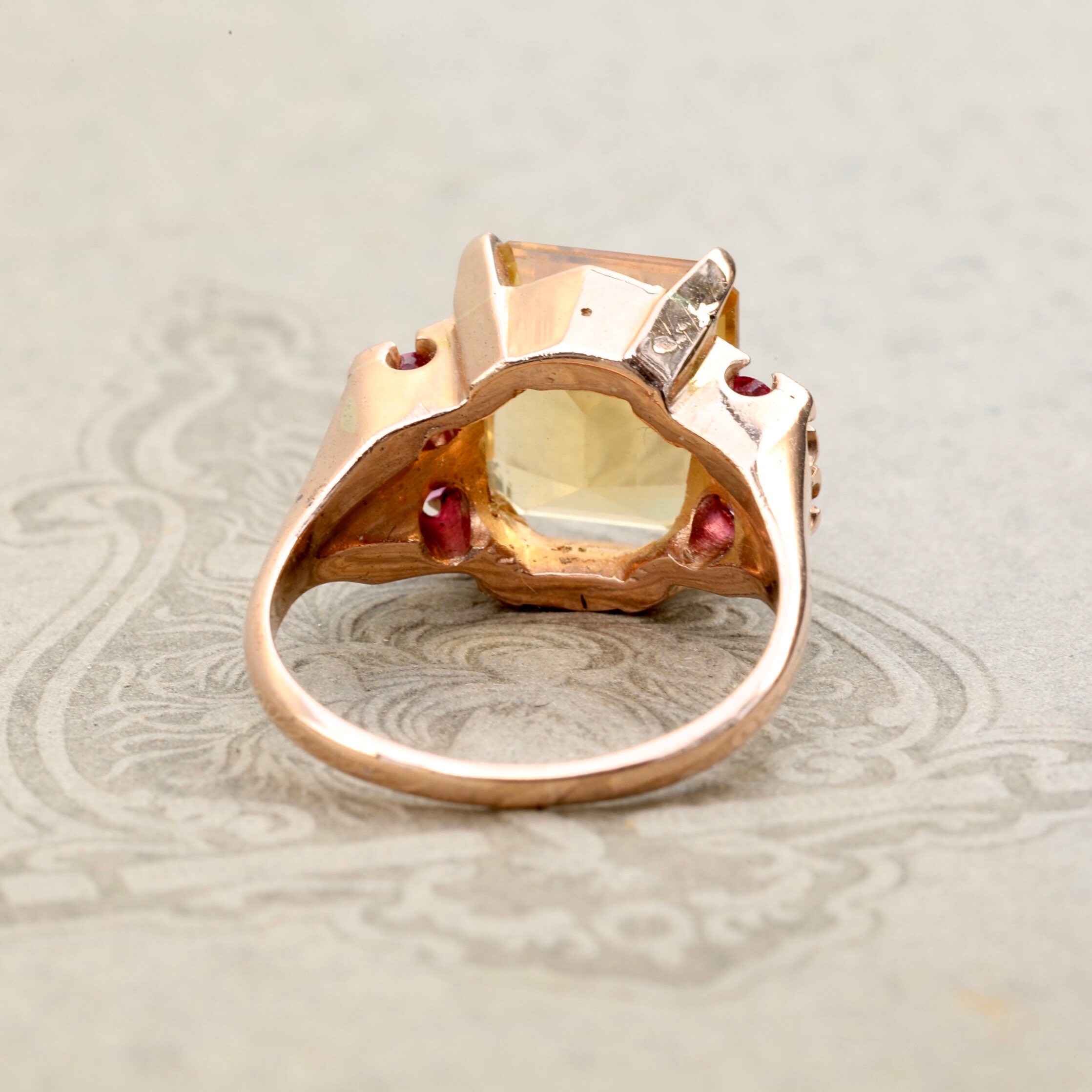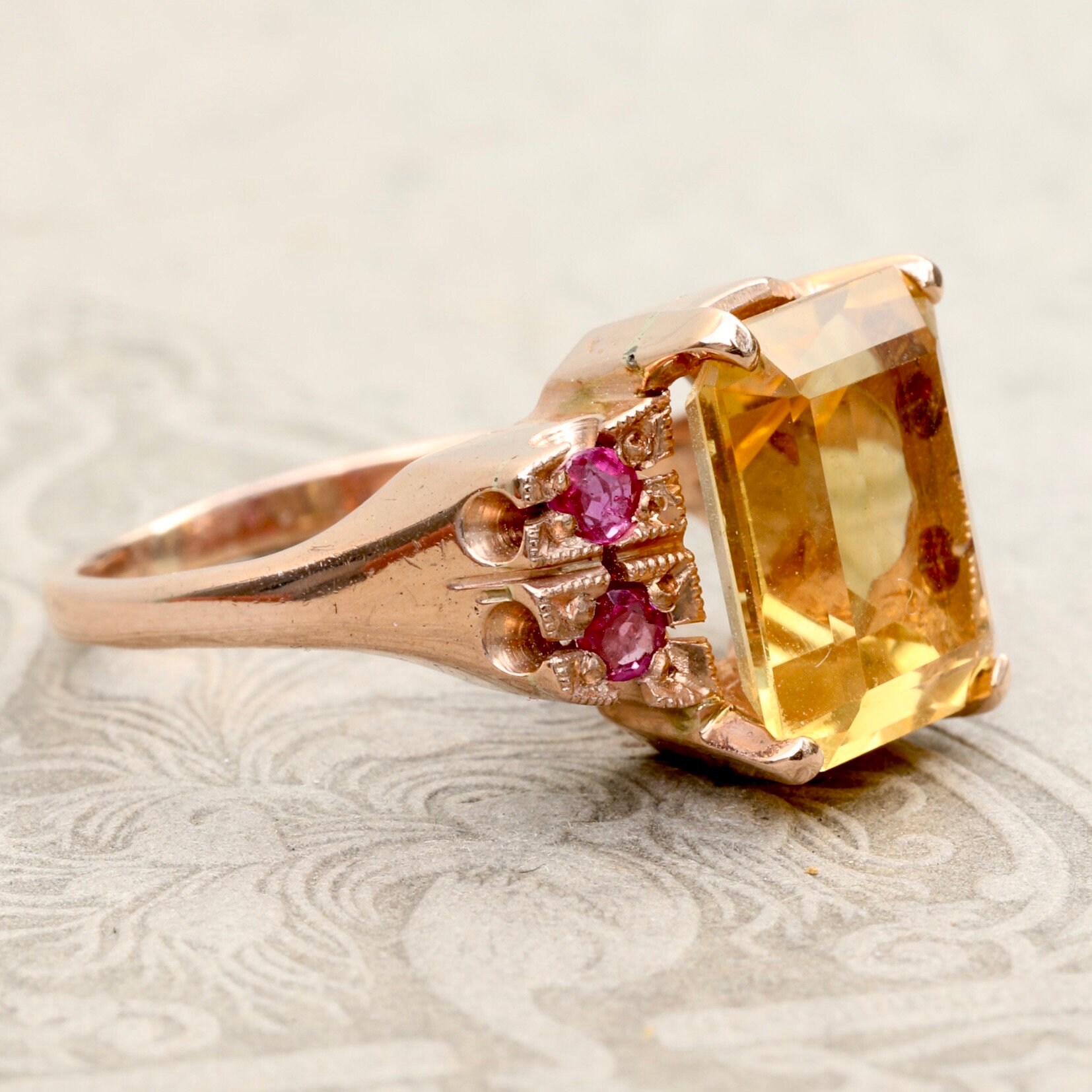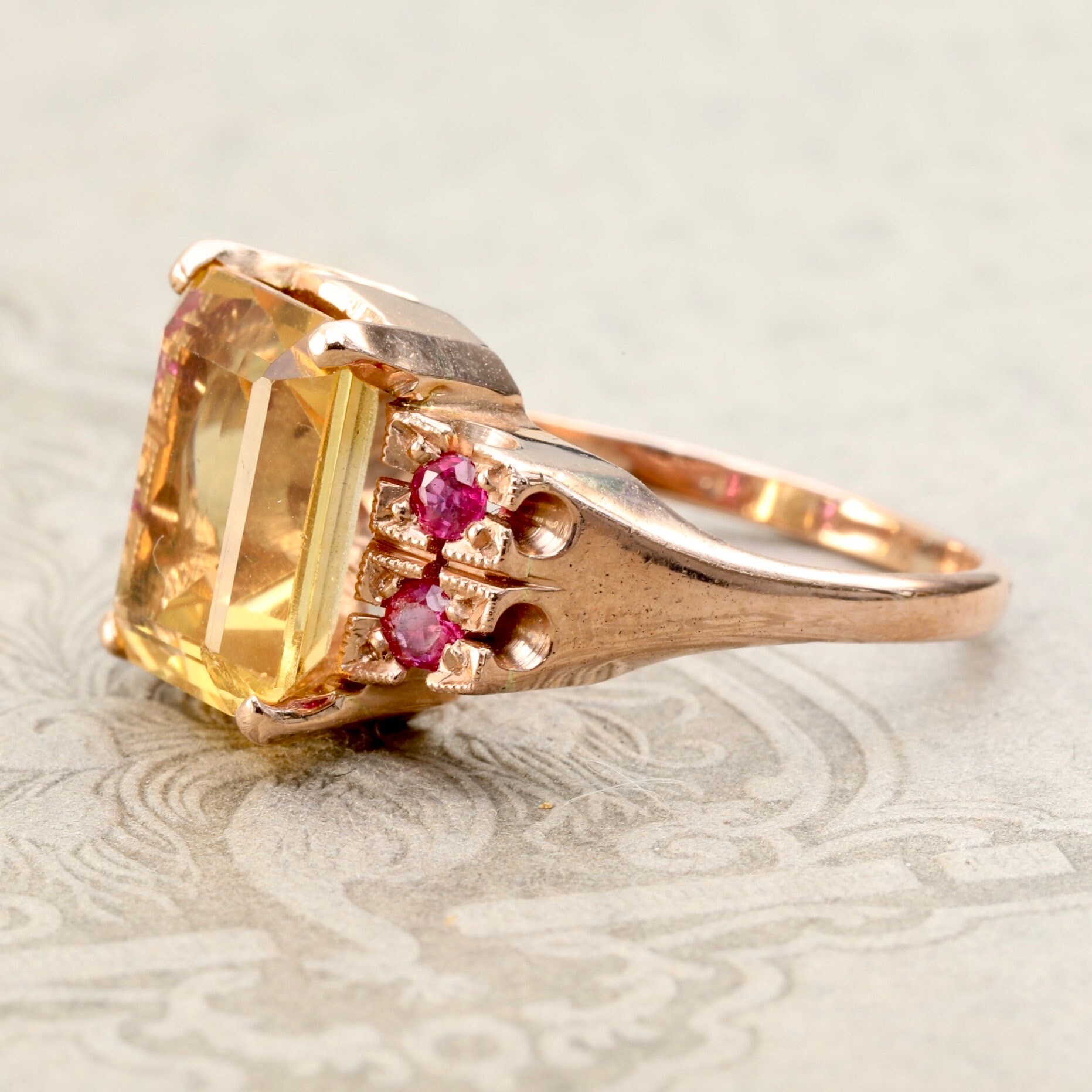 A bold and beautifully preserved Retro-era ring from the 1940s, set with a luminous 3.64ct emerald-cut citrine, framed by four bright natural rubies. Crafted in warm 14k rose gold, the ring features hand-applied milgrain and carved details around the ruby settings—hallmarks of mid-century craftsmanship.