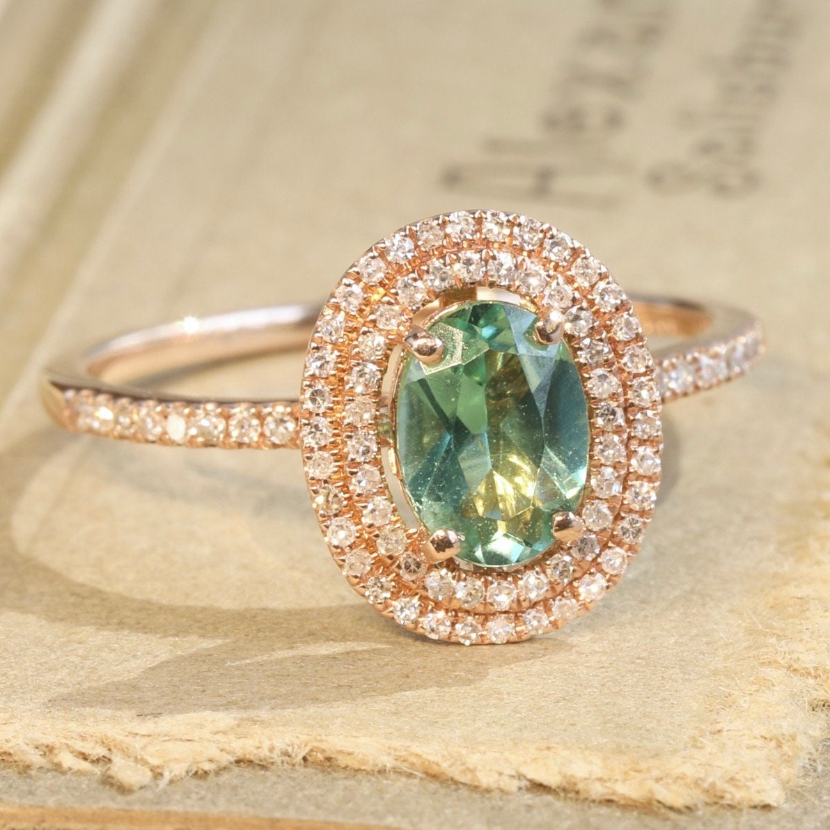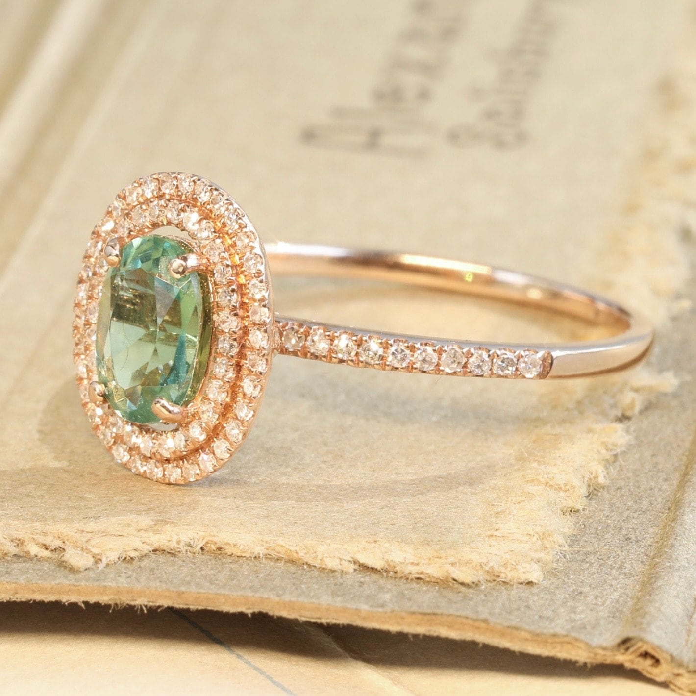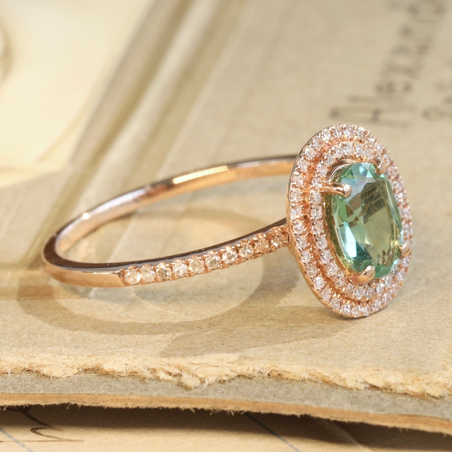 An oval paraiba-colored tourmaline in a vivid green-blue hue is framed by a double halo of finely set diamonds, all crafted in solid 14k light rose gold. The center tourmaline weighs approximately 0.85 carats and is complemented by rows of pavé-set diamonds extending along the shank, creating a refined, light-catching profile. The rose gold has a soft blush tone that enhances the color of the stone while remaining understated on the hand.
