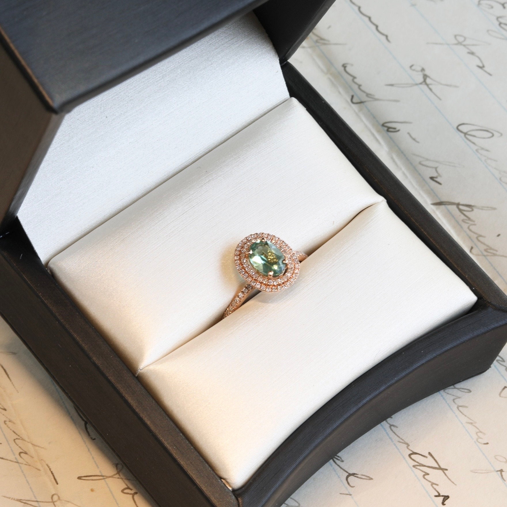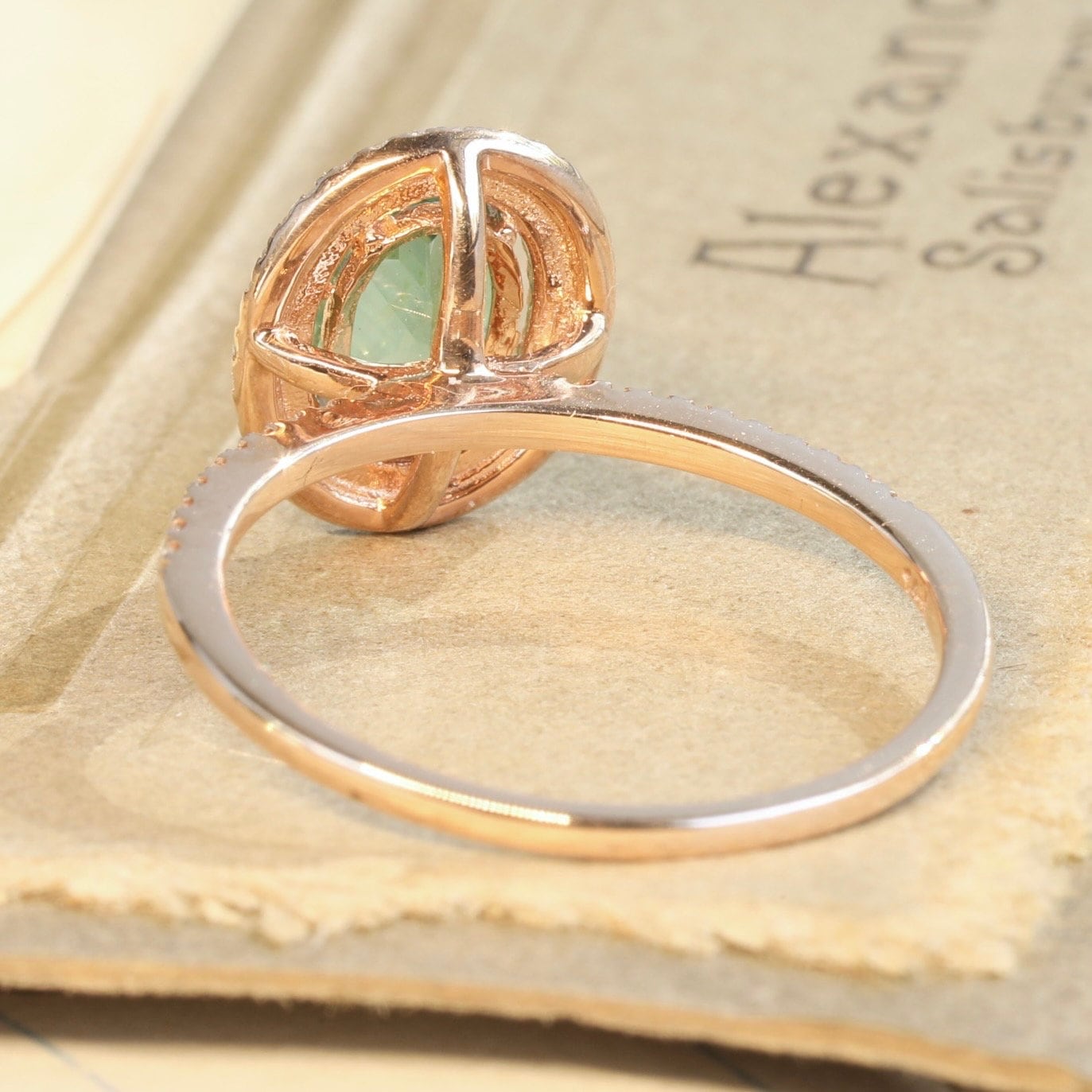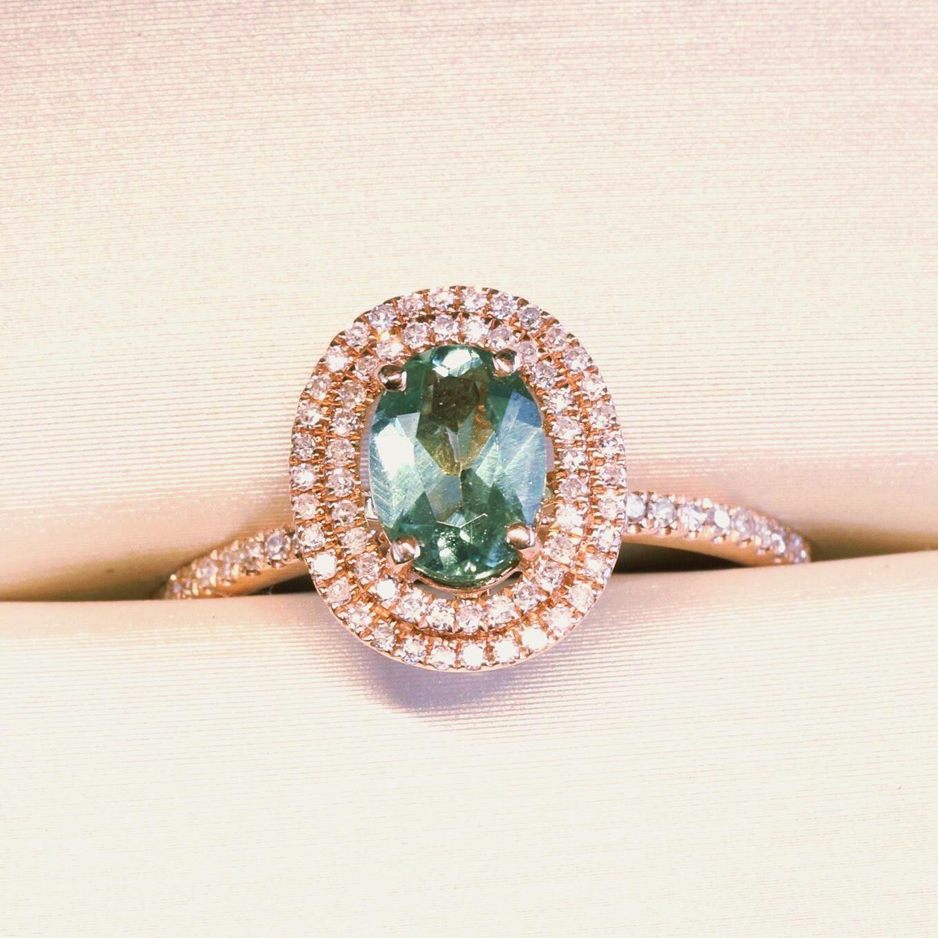 An oval paraiba-colored tourmaline in a vivid green-blue hue is framed by a double halo of finely set diamonds, all crafted in solid 14k light rose gold. The center tourmaline weighs approximately 0.85 carats and is complemented by rows of pavé-set diamonds extending along the shank, creating a refined, light-catching profile. The rose gold has a soft blush tone that enhances the color of the stone while remaining understated on the hand.
