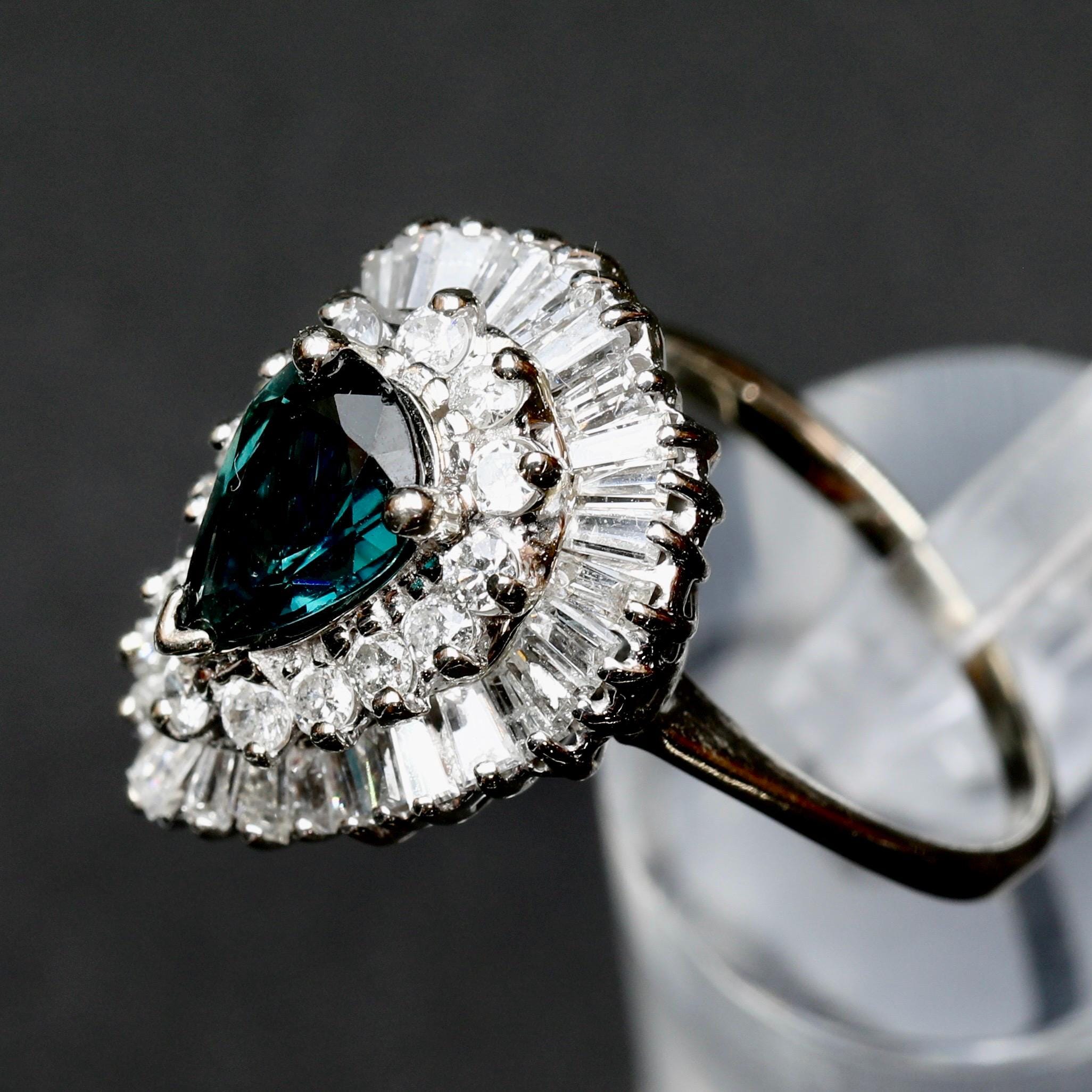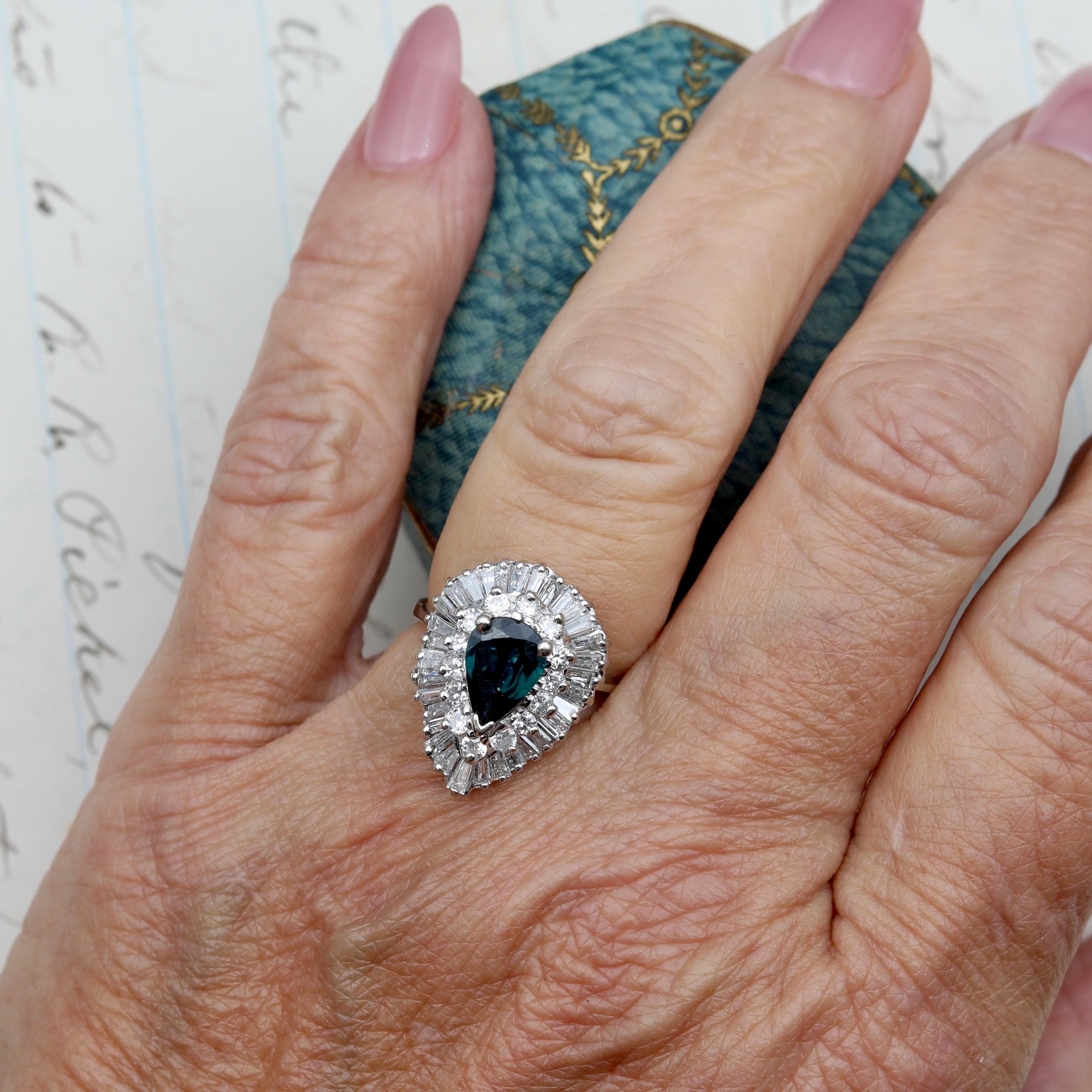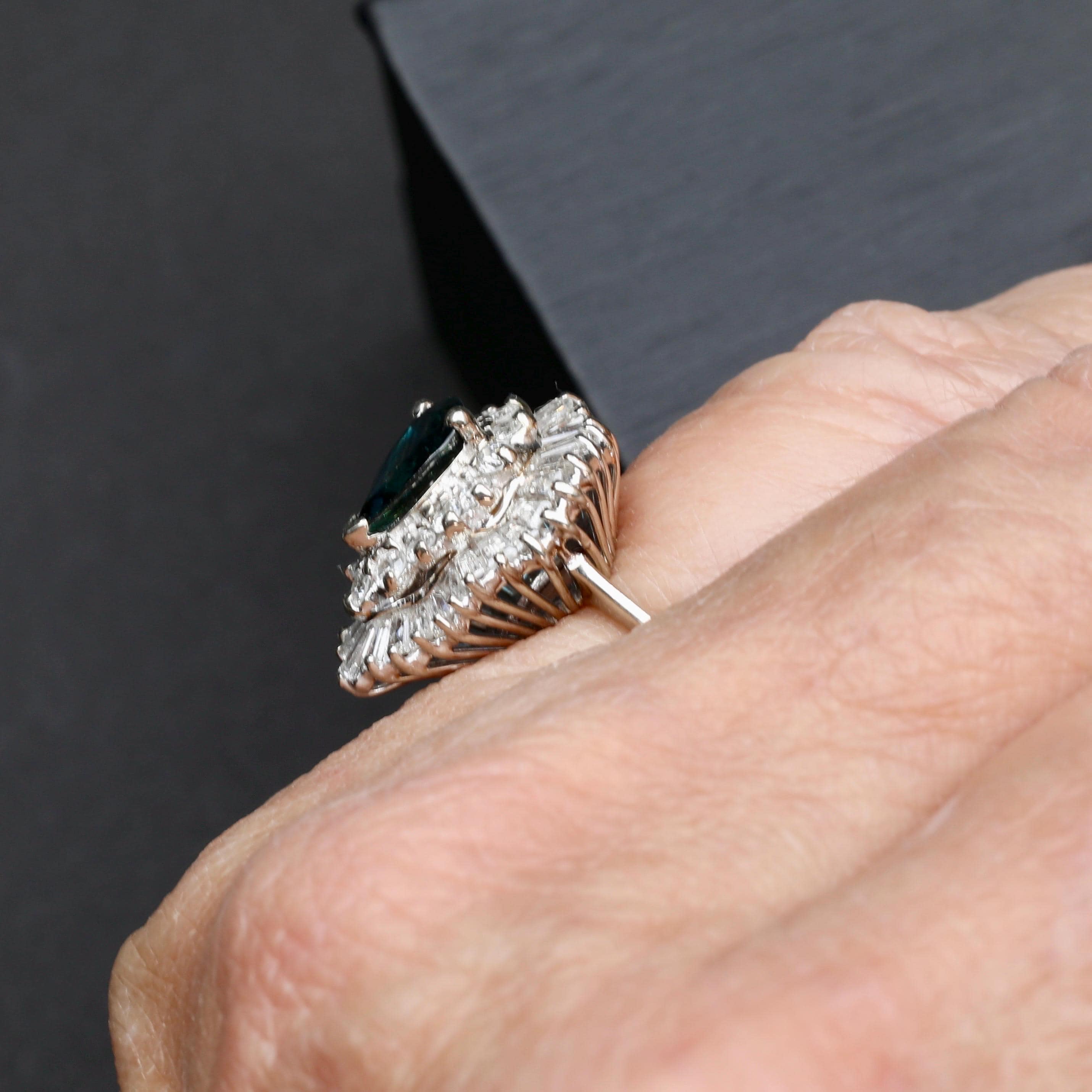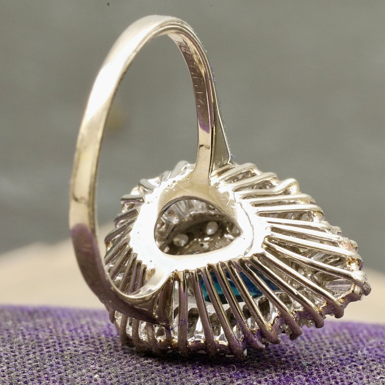 This breathtaking 18K tourmaline and diamond ballerina ring is a perfect choice for an anniversary, an October birthday, or anyone who appreciates bold vintage luxury. Crafted in solid 18K white gold, this incredible 1980s statement ring features a vibrant 2.07-carat pear-cut tourmaline framed by an explosion of light from 46 natural diamonds. The ballerina halo, one of the most intricate and labor-intensive designs in fine jewelry, creates shimmering motion from every angle, giving the ring its unmistakable architectural presence.