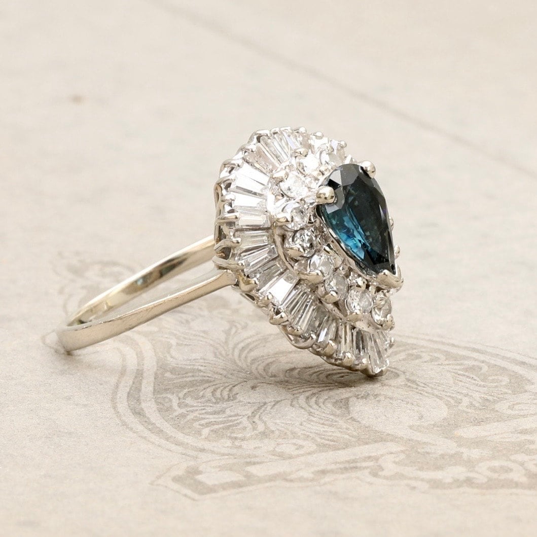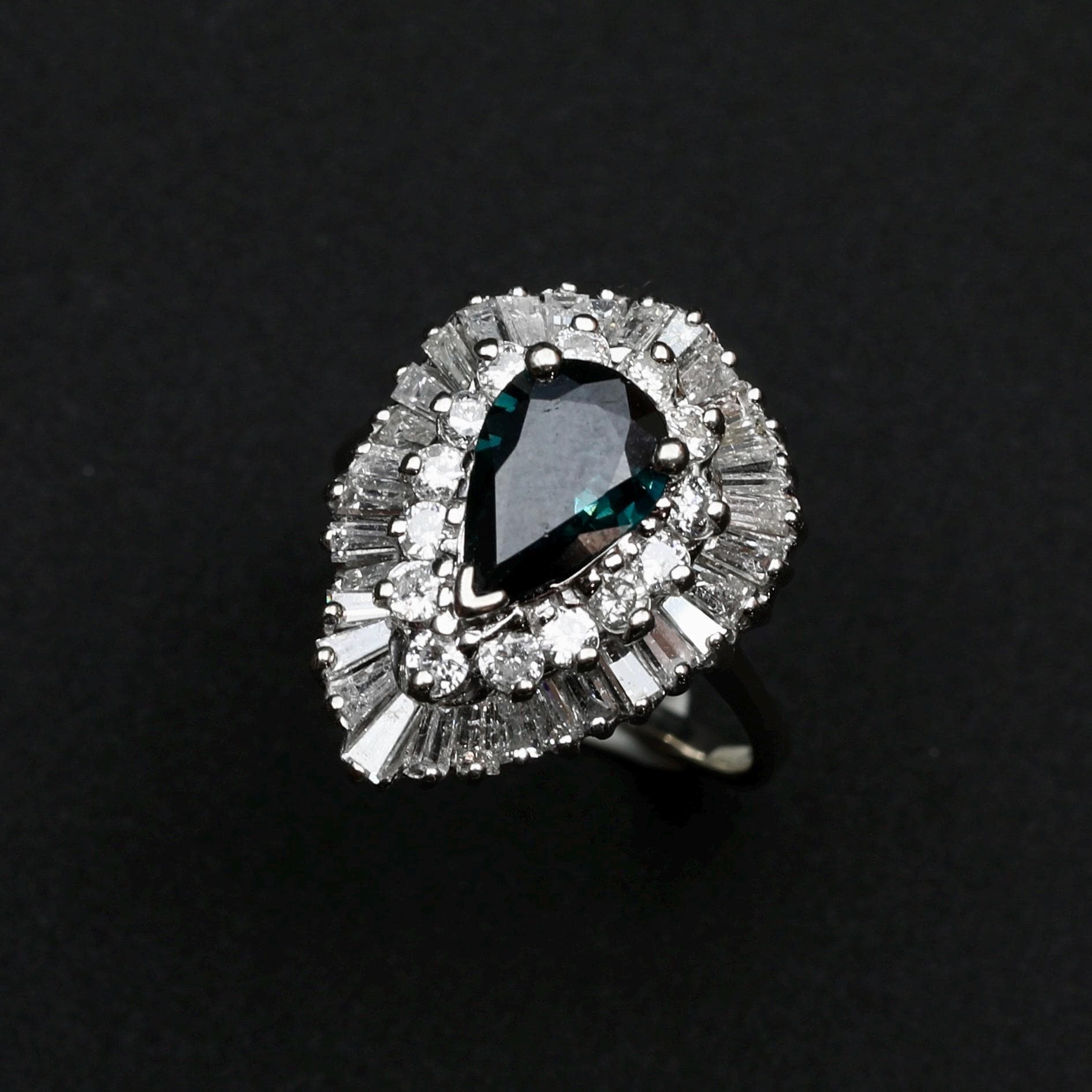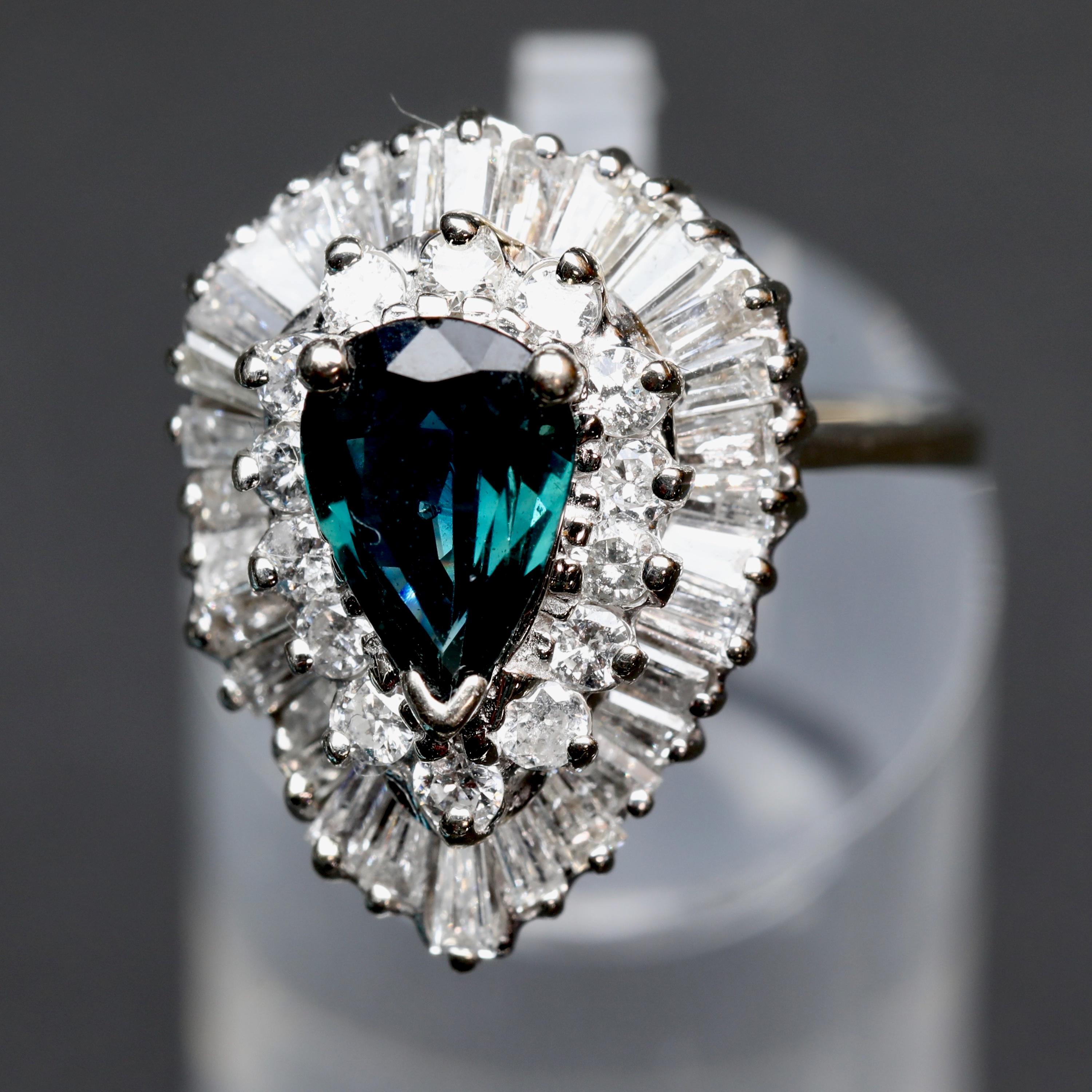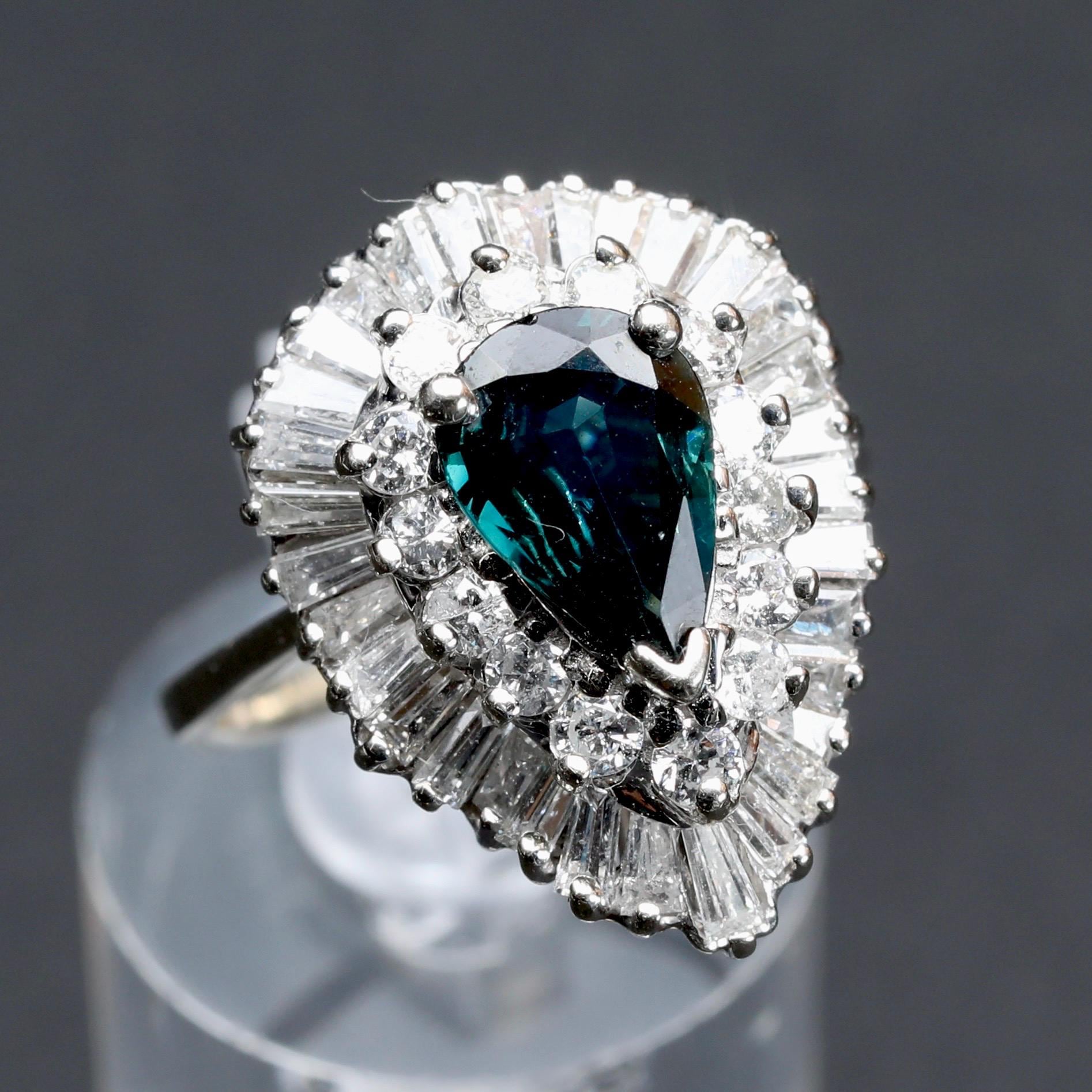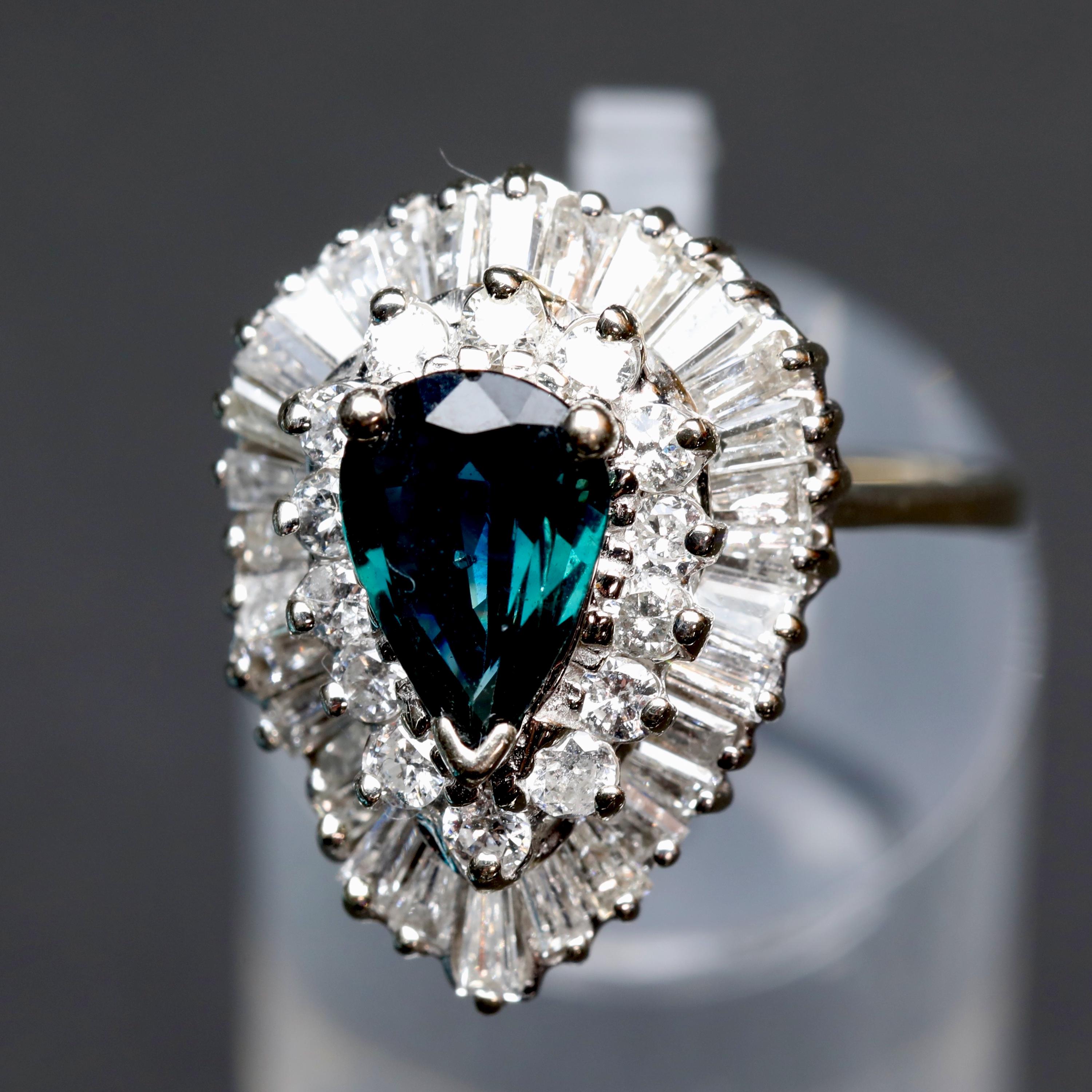 This breathtaking 18K tourmaline and diamond ballerina ring is a perfect choice for an anniversary, an October birthday, or anyone who appreciates bold vintage luxury. Crafted in solid 18K white gold, this incredible 1980s statement ring features a vibrant 2.07-carat pear-cut tourmaline framed by an explosion of light from 46 natural diamonds. The ballerina halo, one of the most intricate and labor-intensive designs in fine jewelry, creates shimmering motion from every angle, giving the ring its unmistakable architectural presence.