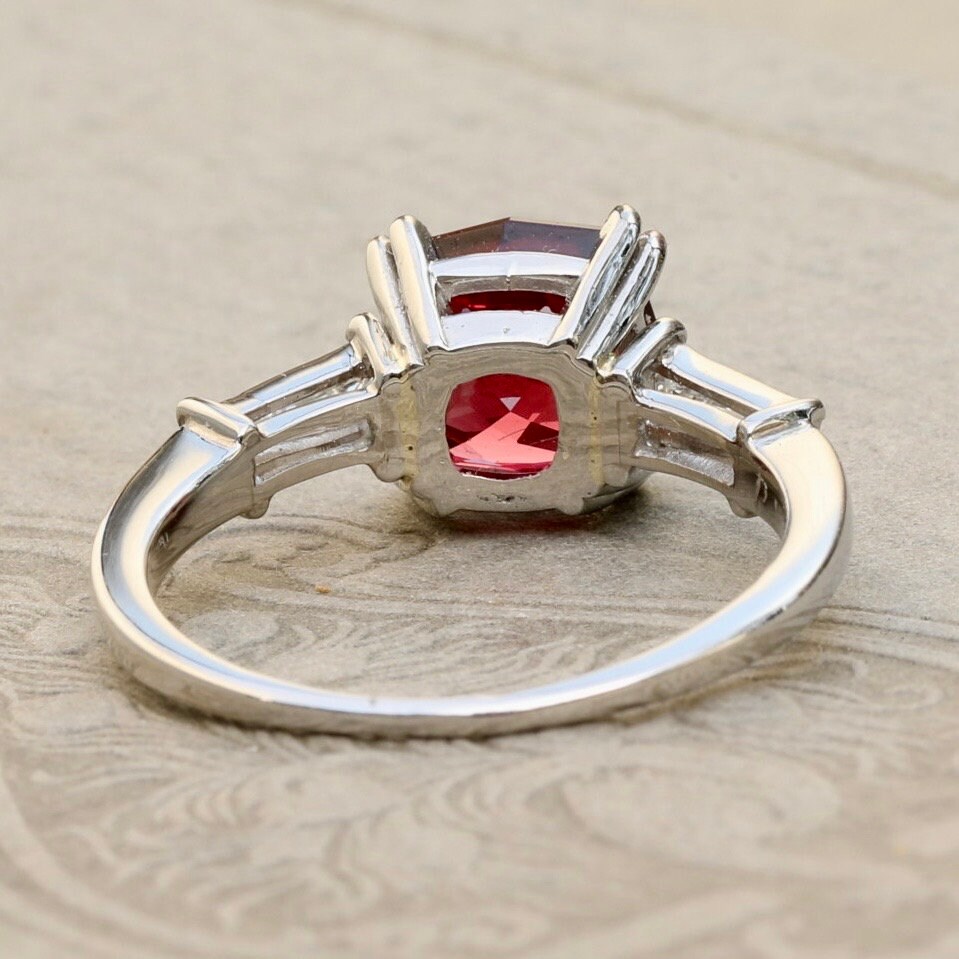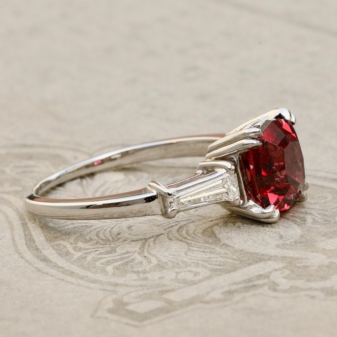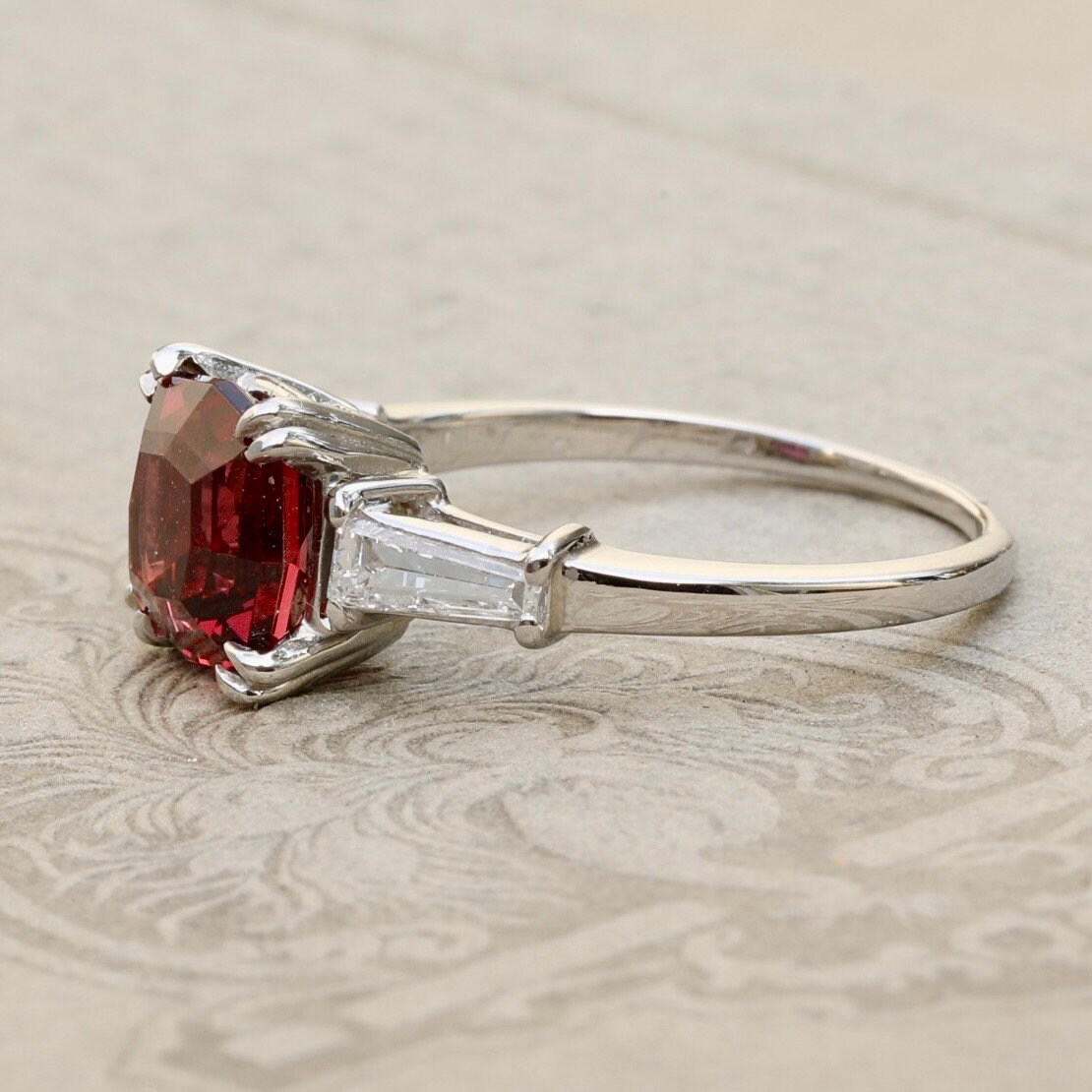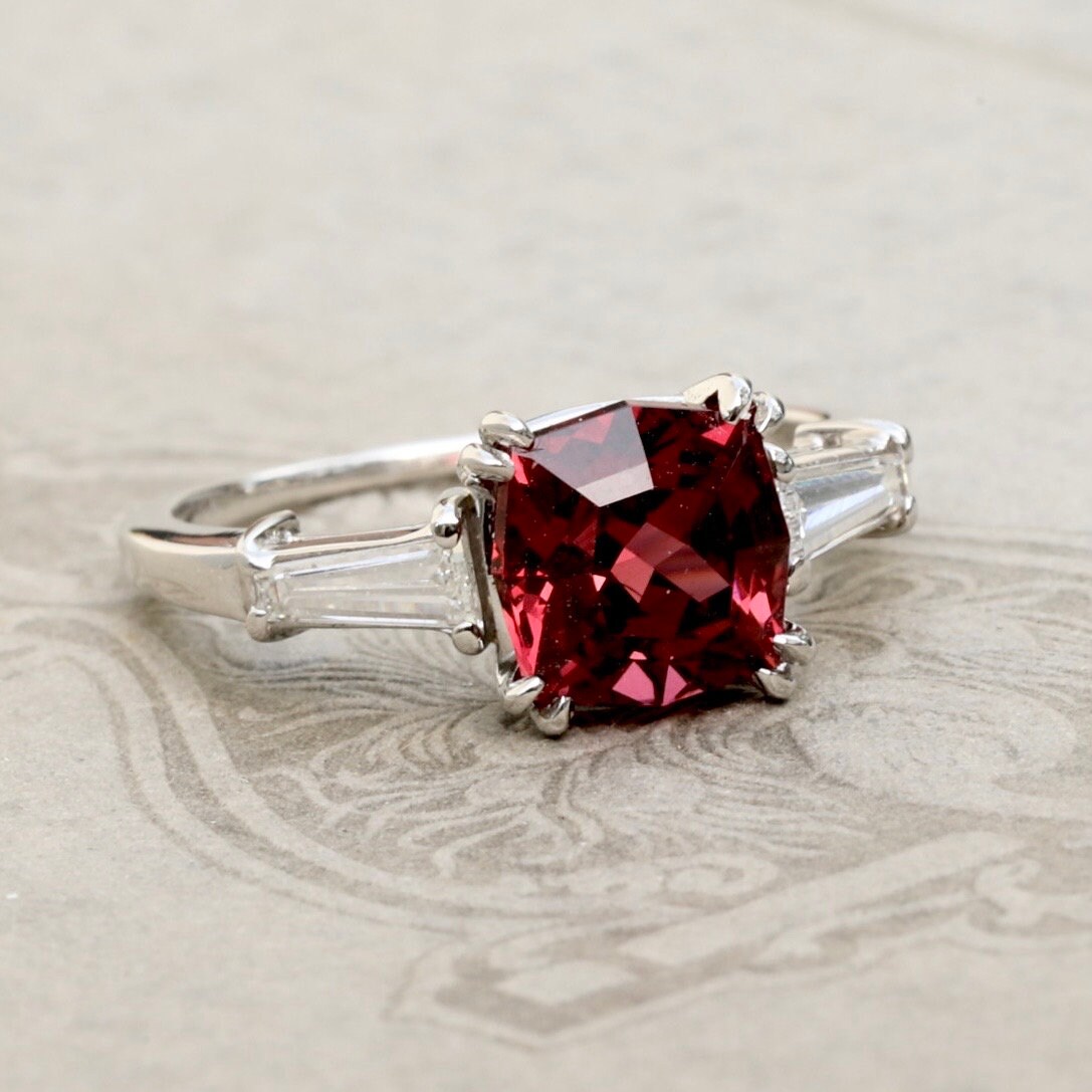 Set in solid platinum and accented with tapered baguette diamonds, the ring balances a refined silhouette with incredible sparkle. Double-claw prongs frame the garnet securely while allowing maximum brilliance, and the tapered baguettes add timeless Art Deco-inspired elegance.