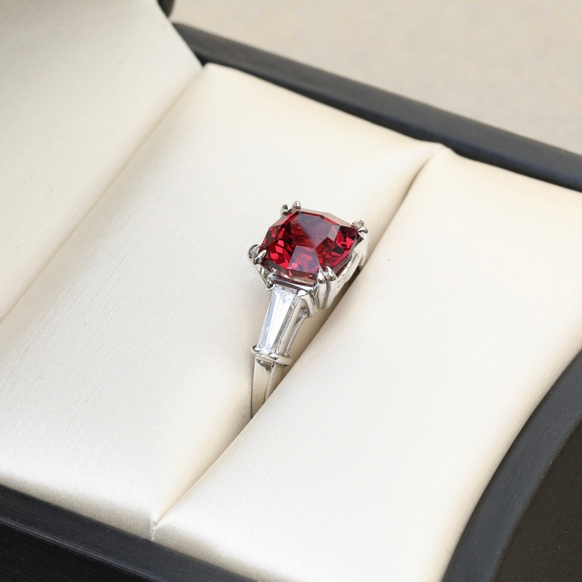 This platinum 3ct Garnet Diamond Ring featuring an extraordinary 3.01-carat cushion-cut garnet with fire so intense it flashes like a red diamond. This garnet is among the finest we have ever sourced, vivid red saturation, crisp brilliant faceting, and exceptional light return that stays lively in multiple lighting conditions.
