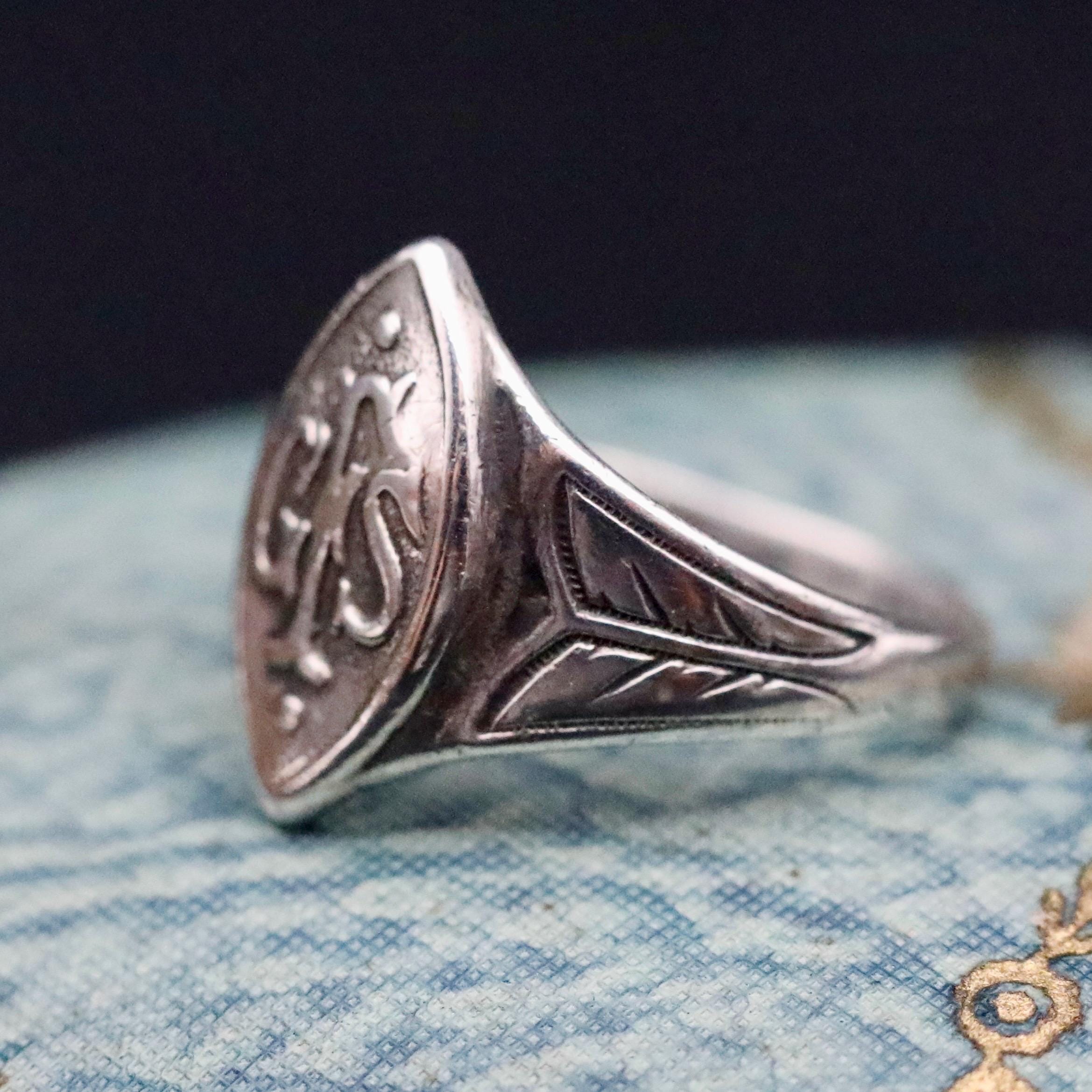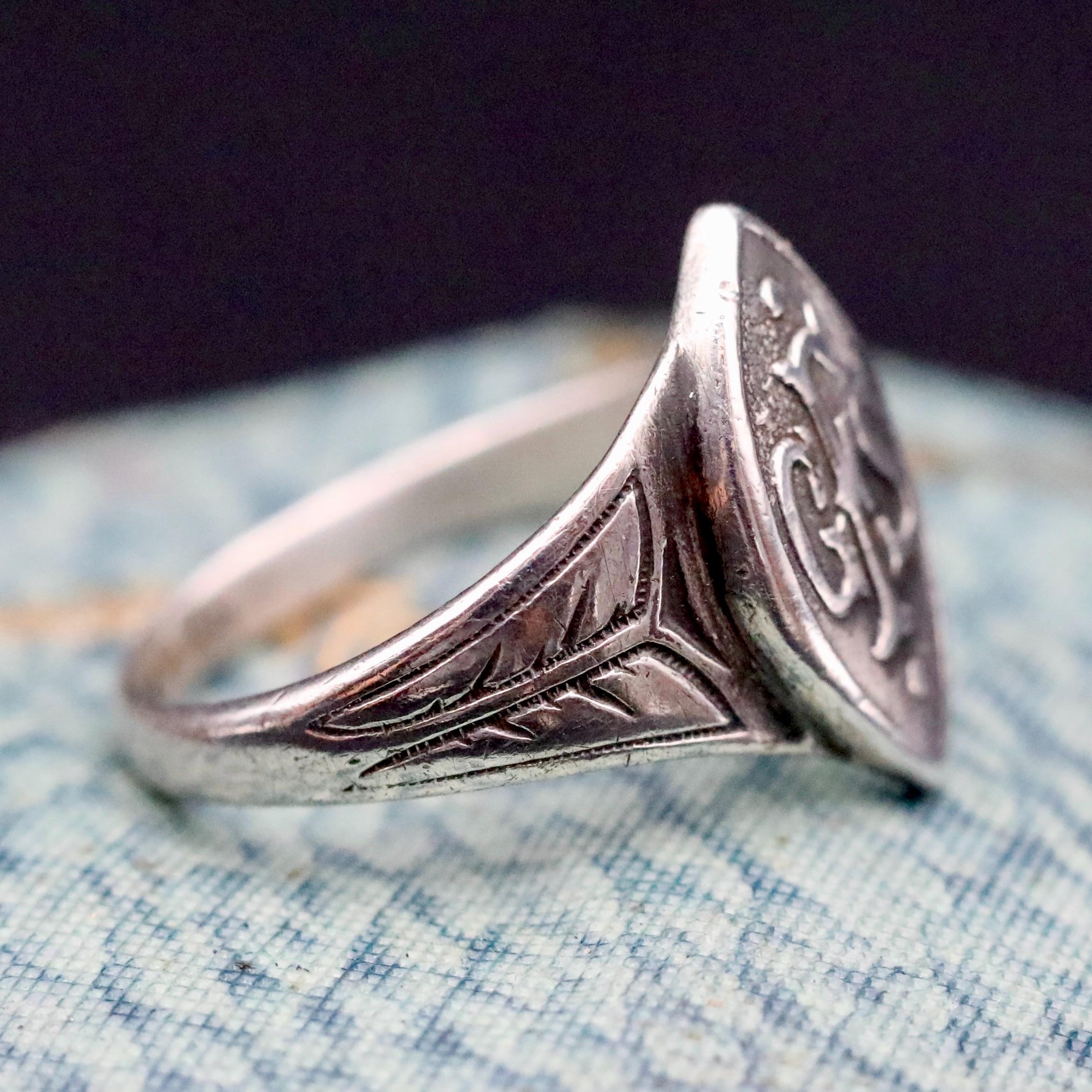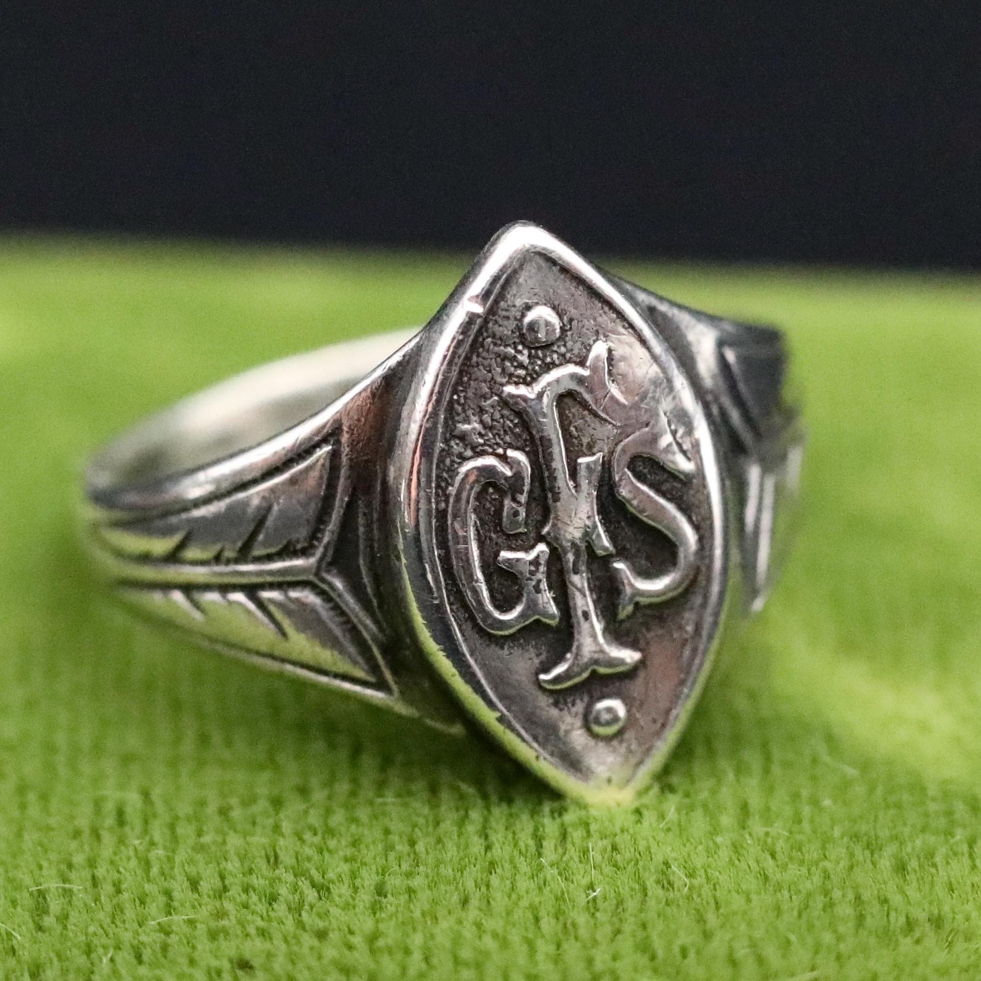 This antique sterling silver signet ring features the raised GFS monogram for the Girls’ Friendly Society, an organization founded in 1875, to support and protect young working women during the Victorian and Edwardian eras. With Queen Victoria as its patron, the GFS became a meaningful symbol of early female advocacy and empowerment.