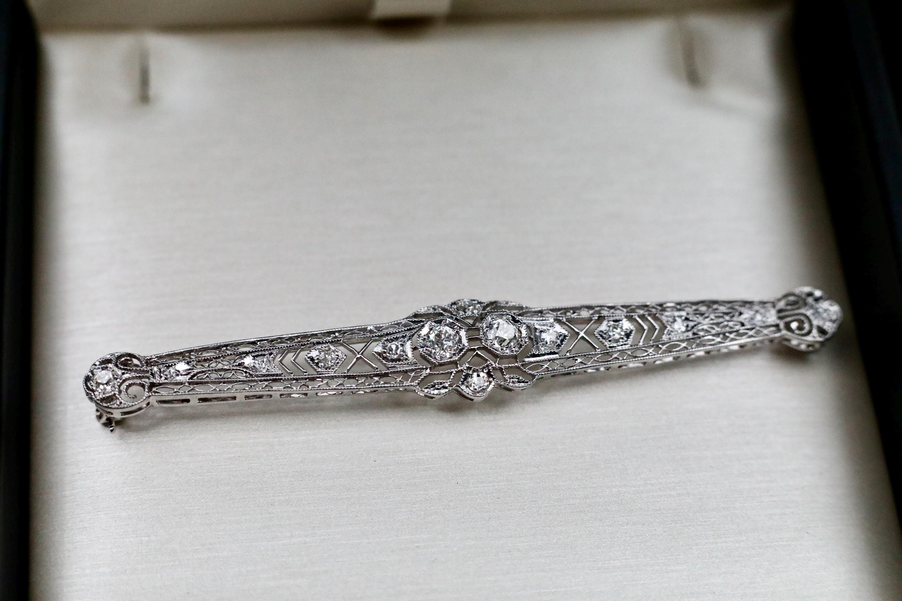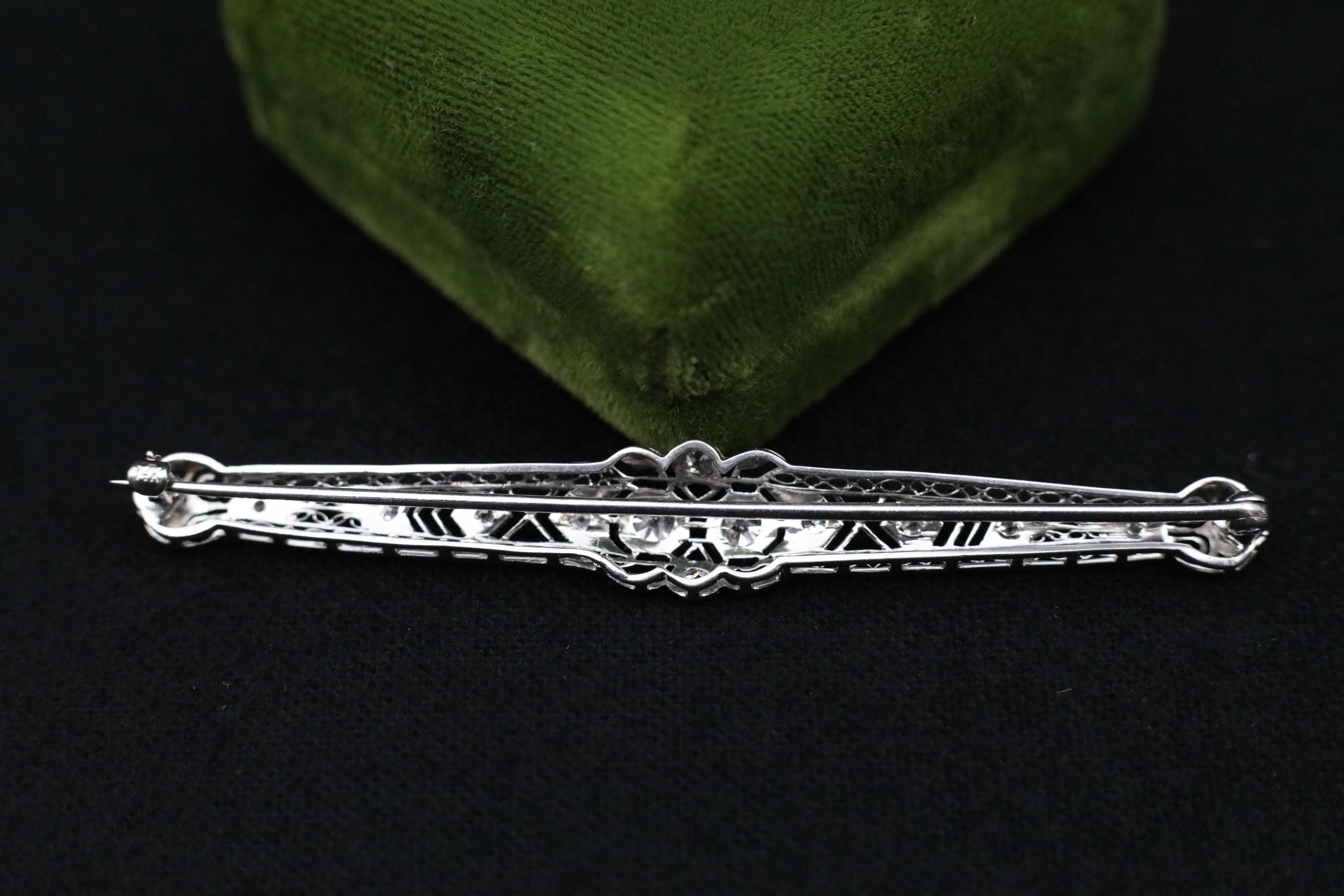 A striking antique bar brooch crafted in platinum and set with fourteen old mine cut diamonds totaling 1.56 carats. The diamonds are exceptionally bright, graded G color and SI1 clarity during gemological review, and arranged in a continuous line that creates beautiful fire and presence. This elongated 3-inch design showcases the craftsmanship and character of early diamond cutting, with each stone offering its own subtle individuality.