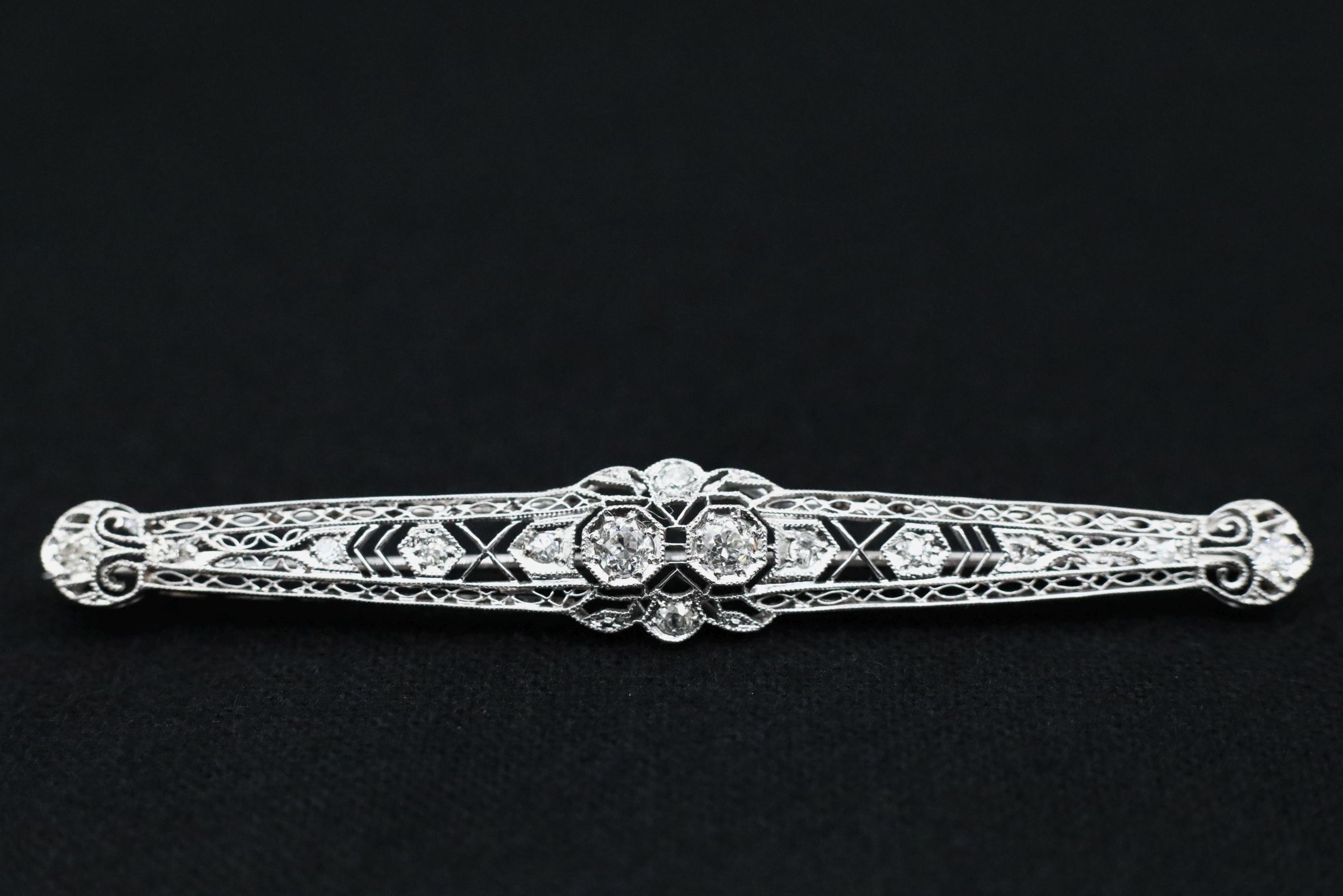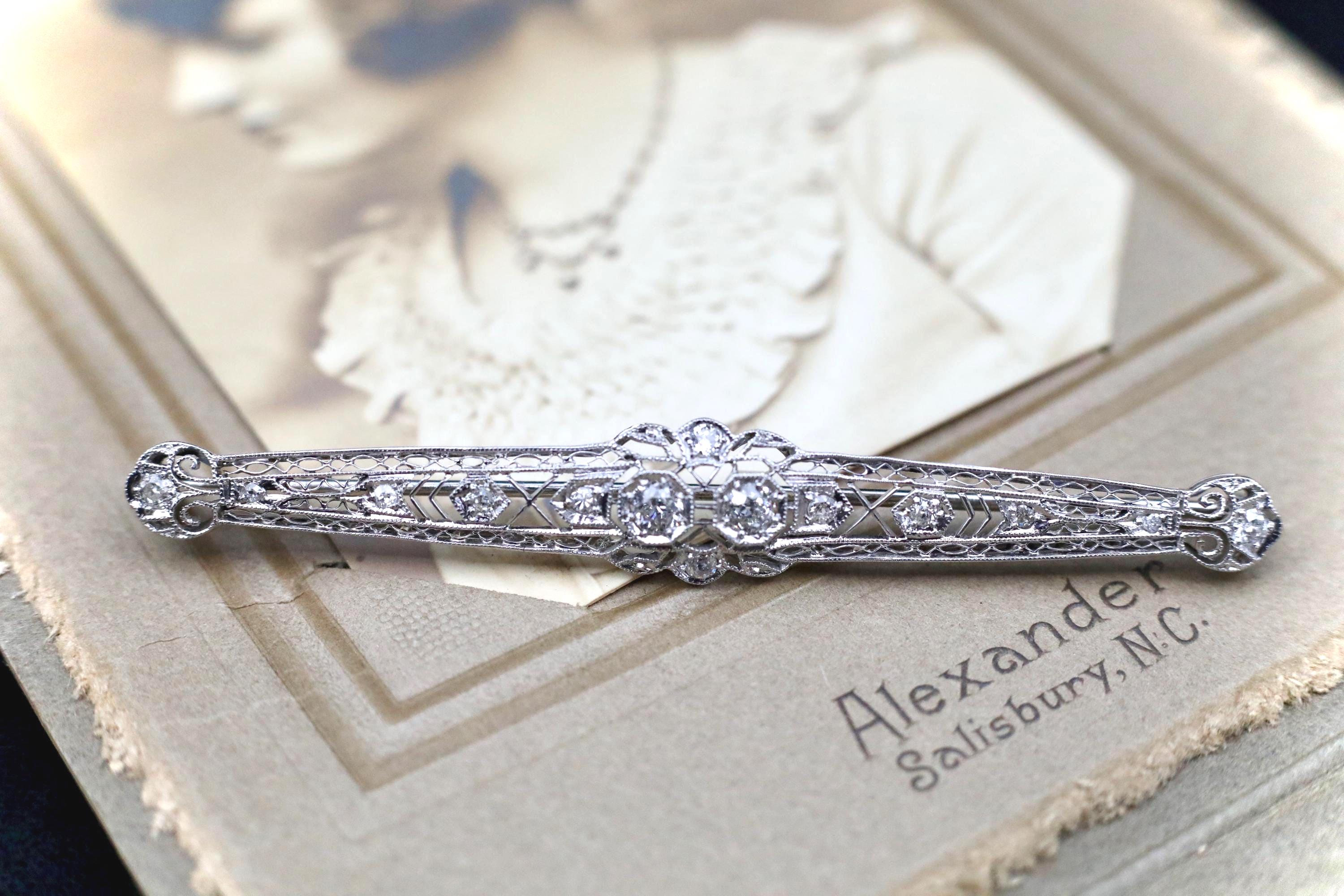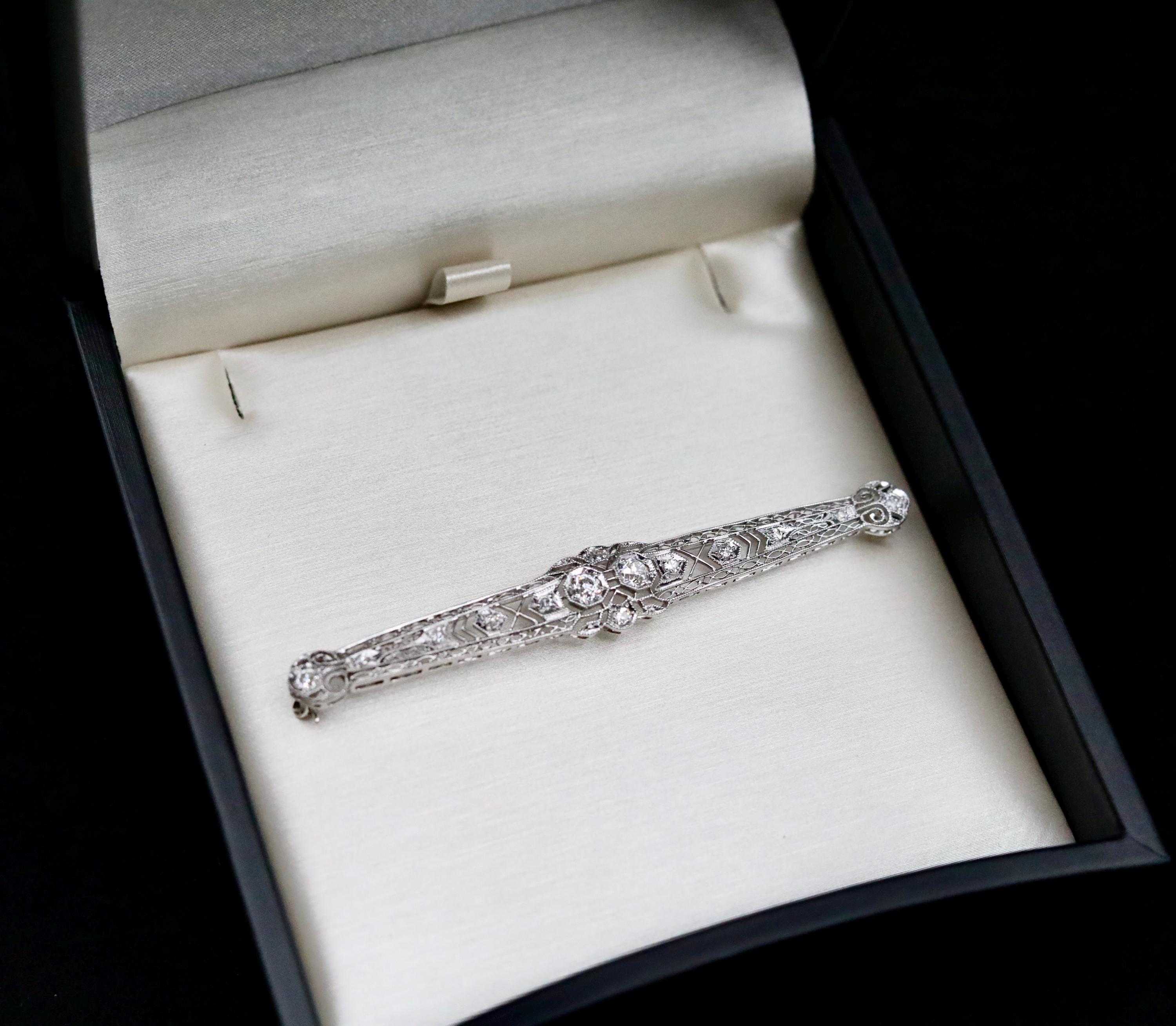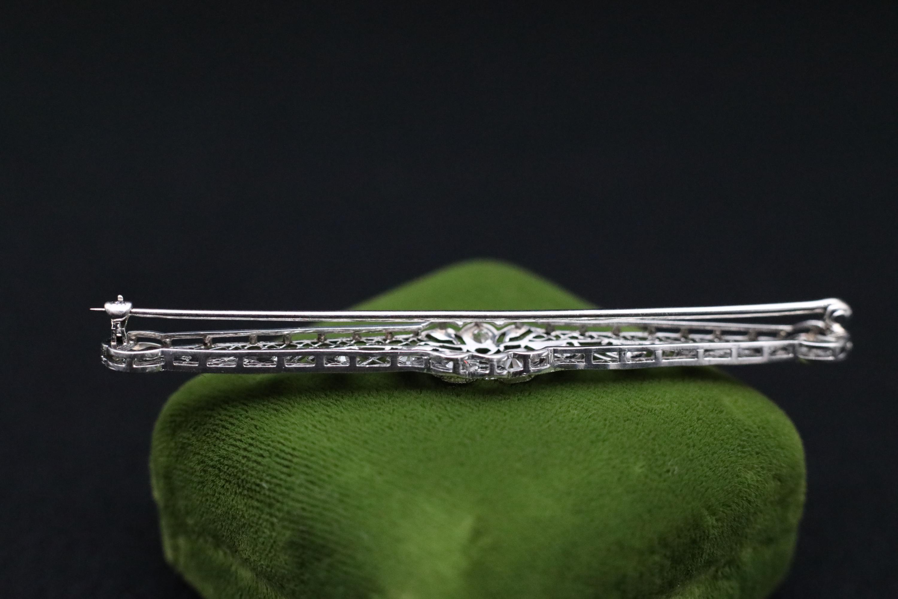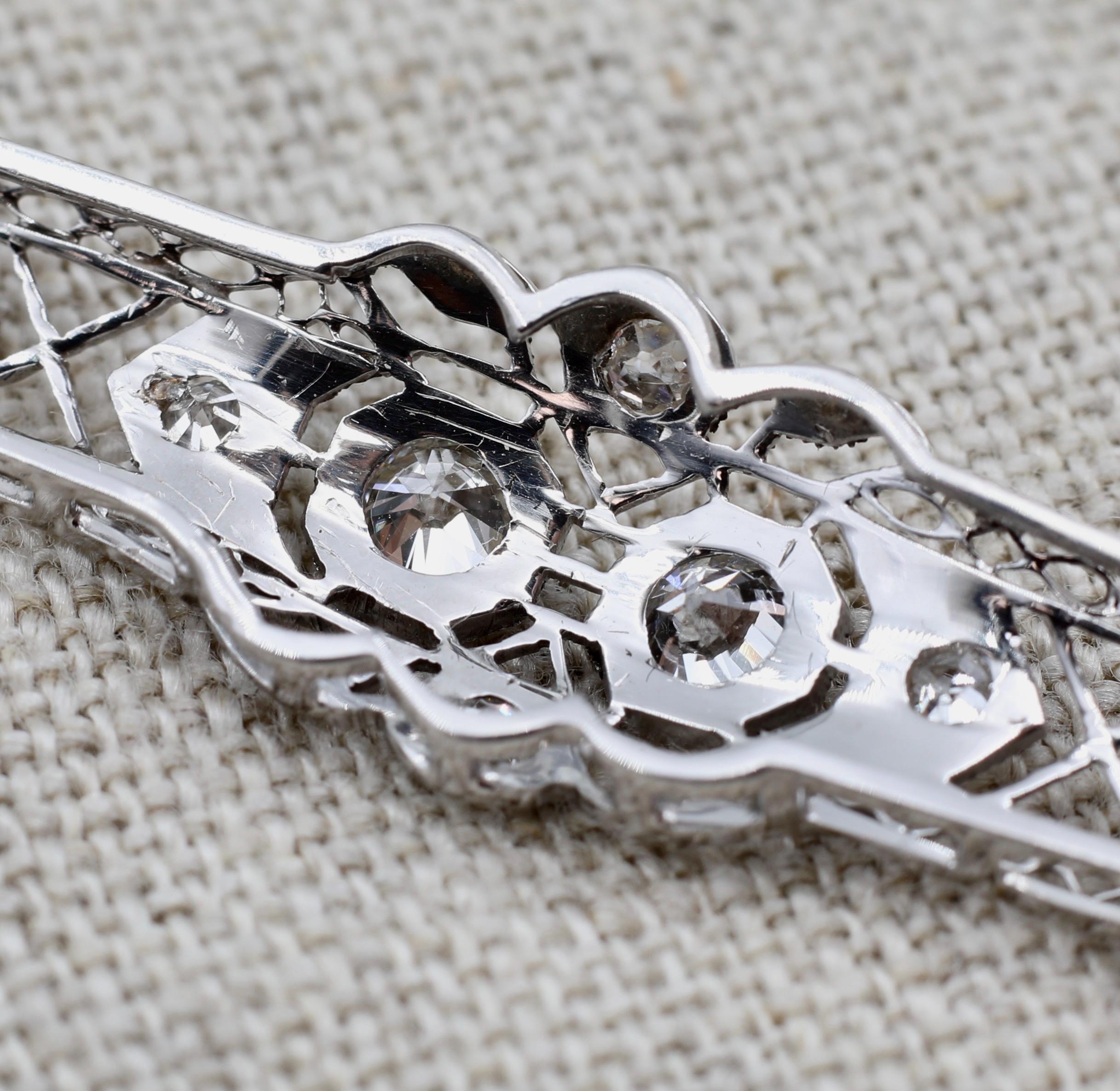 The reverse features a 14k white gold pin and clasp, professionally tested and marked, with platinum forming the entire front framework. Secure, smooth functioning, and in excellent antique condition. An elegant piece for collectors of old mine cut diamonds, bridal wear, jacket lapels, or anyone who loves refined antique jewelry with real sparkle and sophistication.