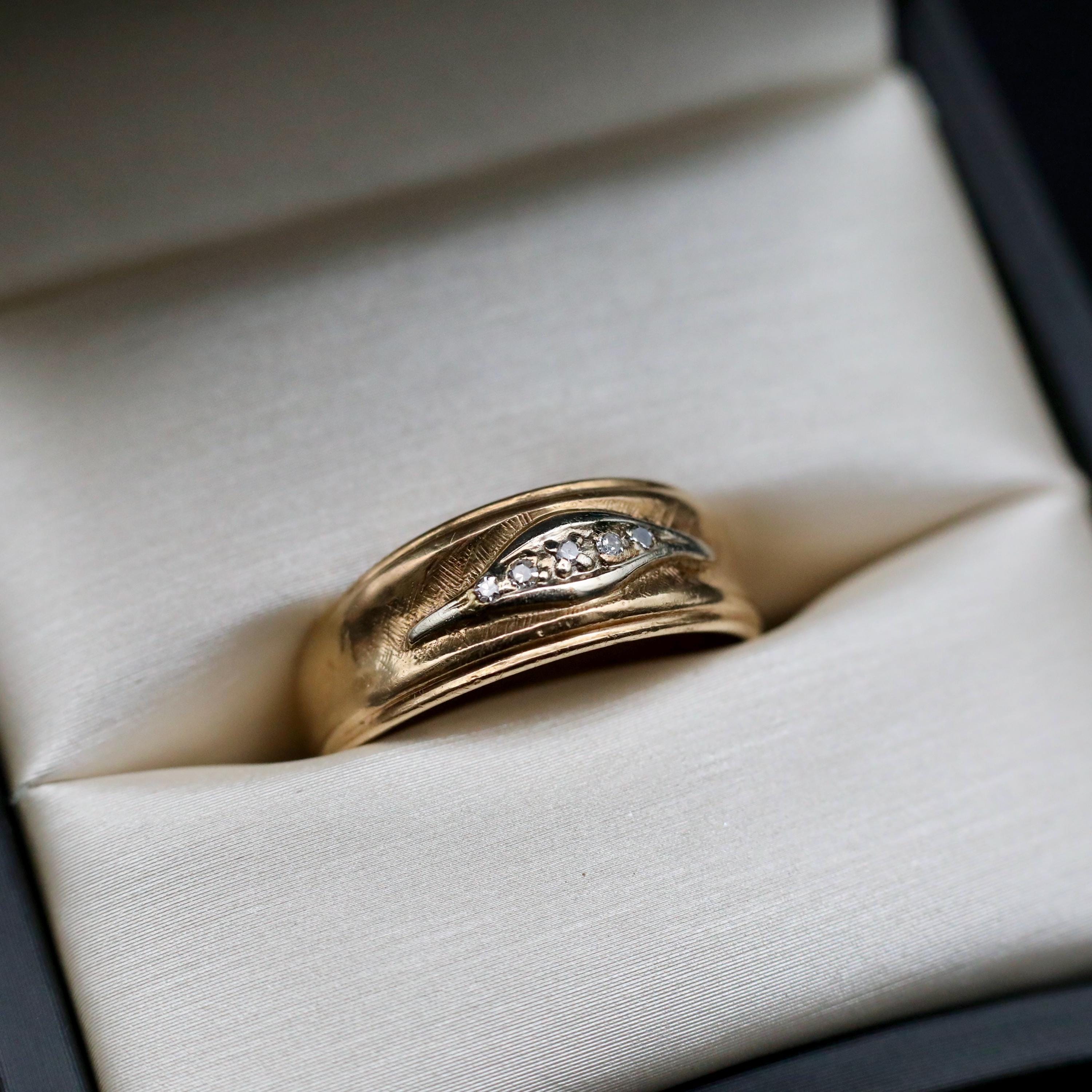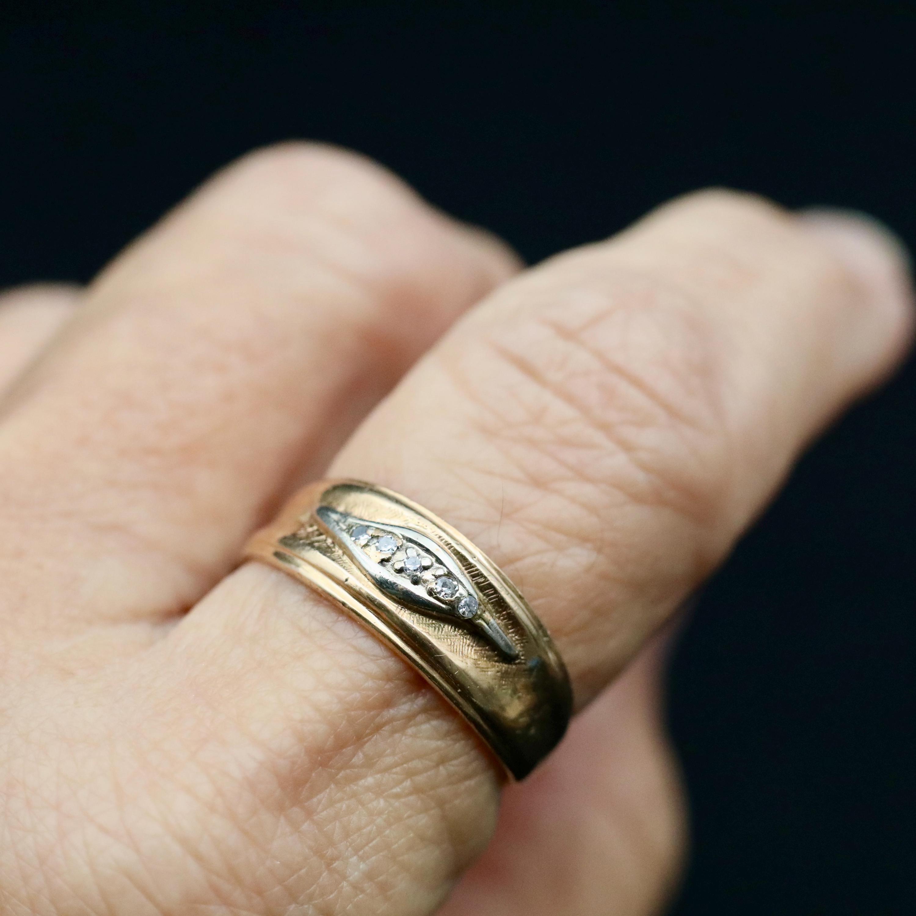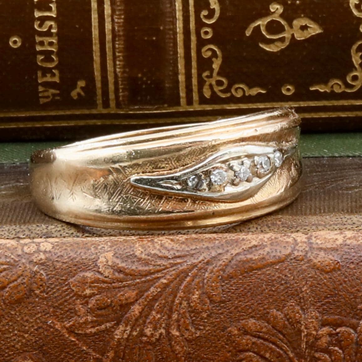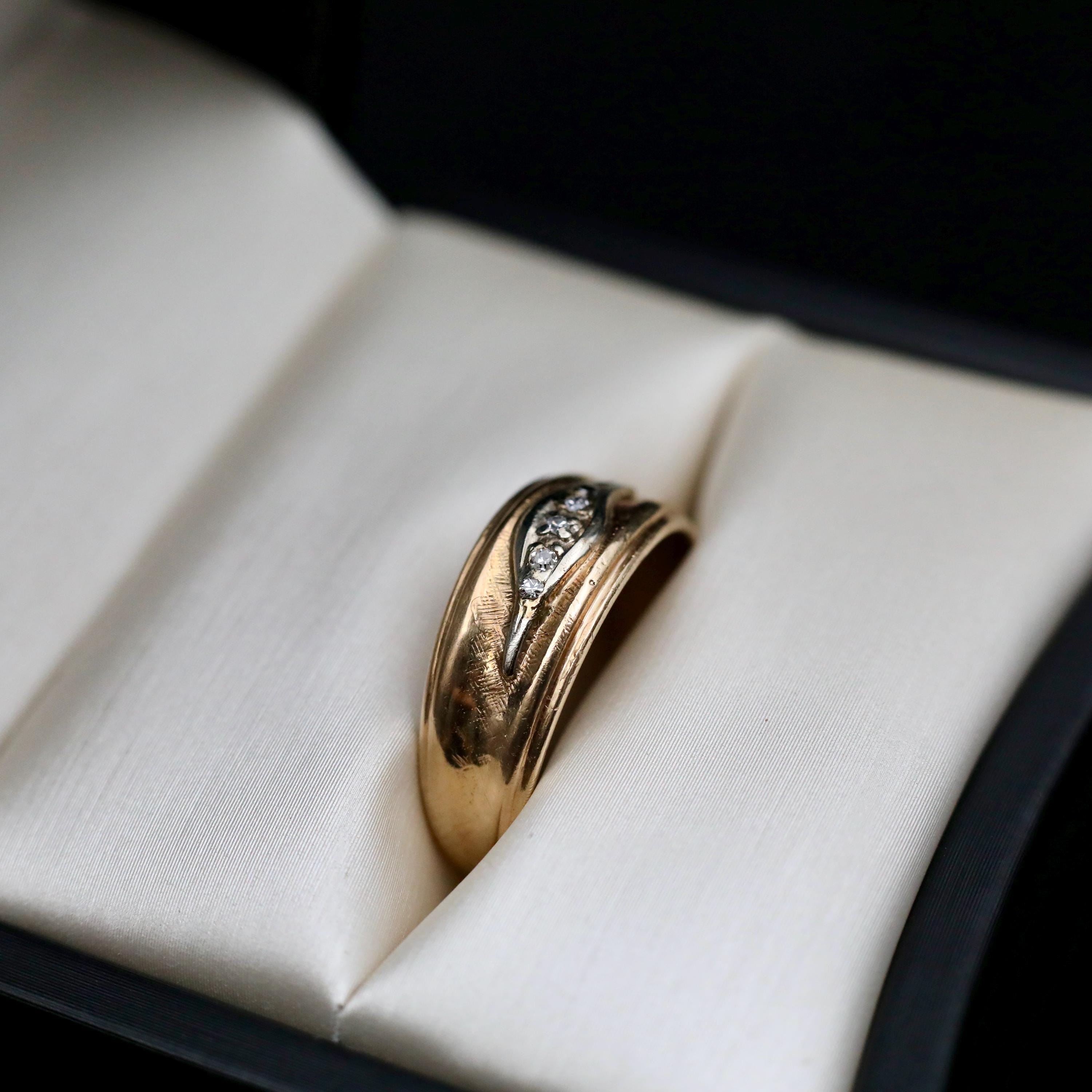 This 18k solid gold & diamond vintage men's wedding ring has a hand done Florentine finish around a setting of white gold, featuring 5 diamonds totaling .25 carats. This ring is a US size 10, can be resized.