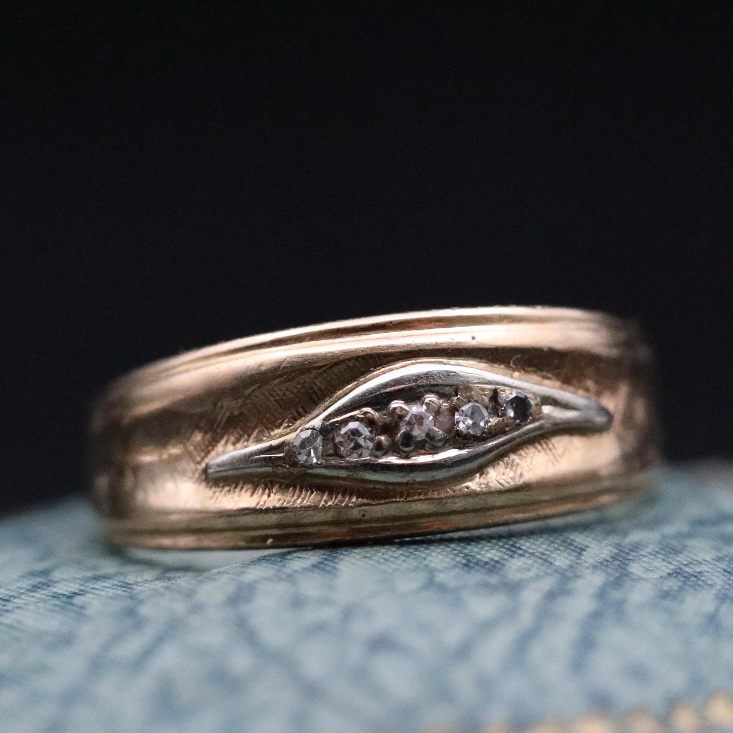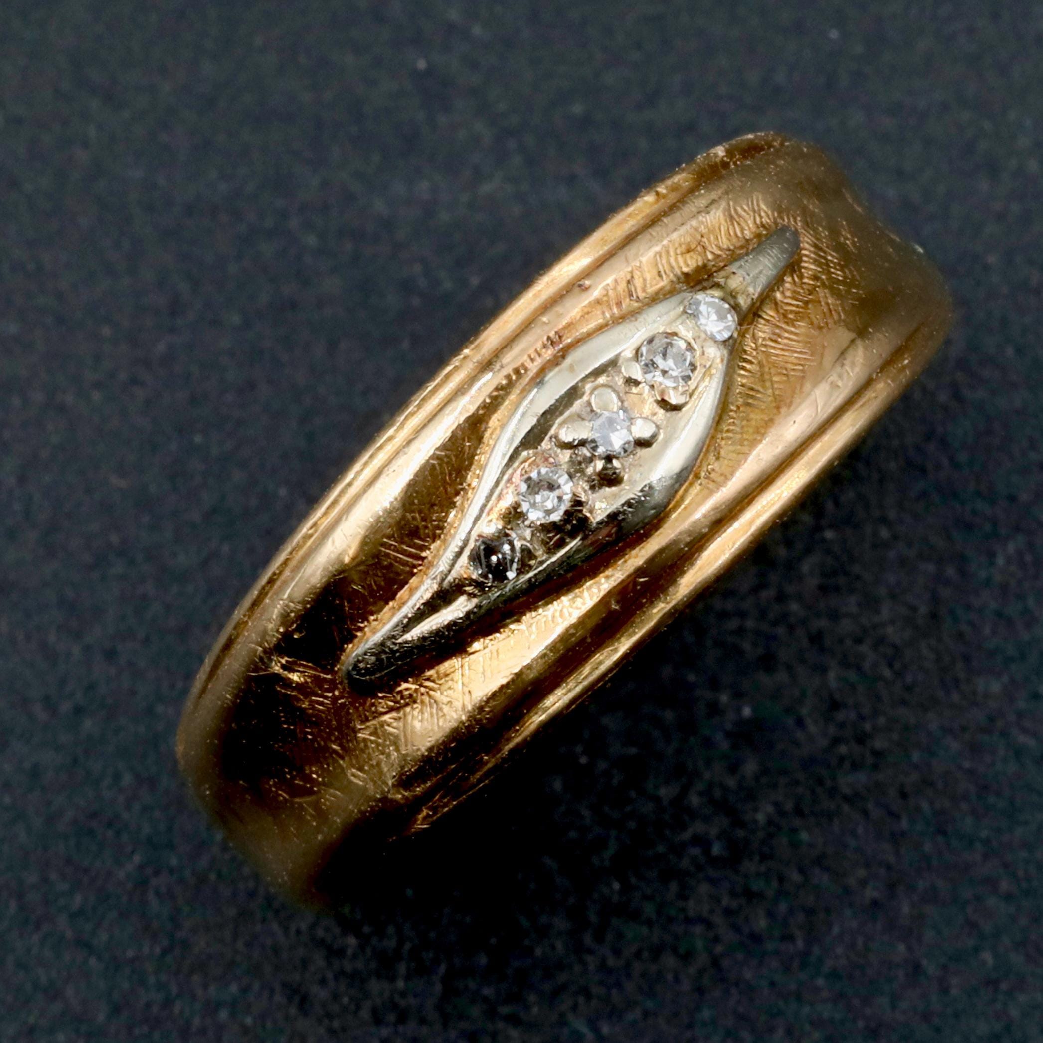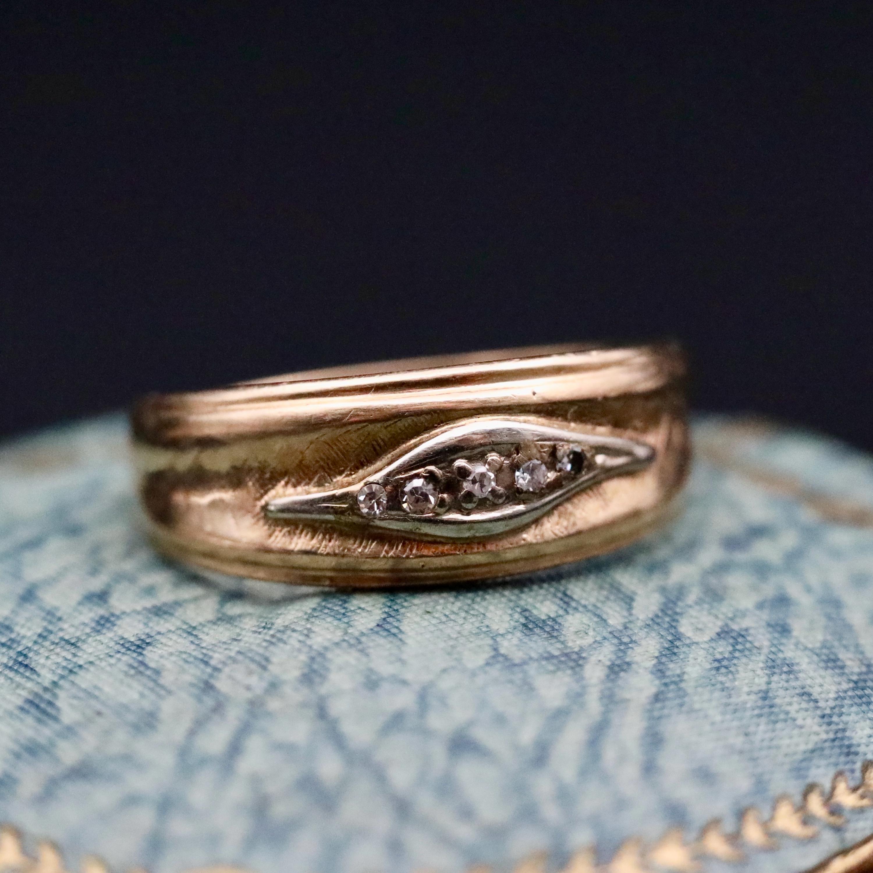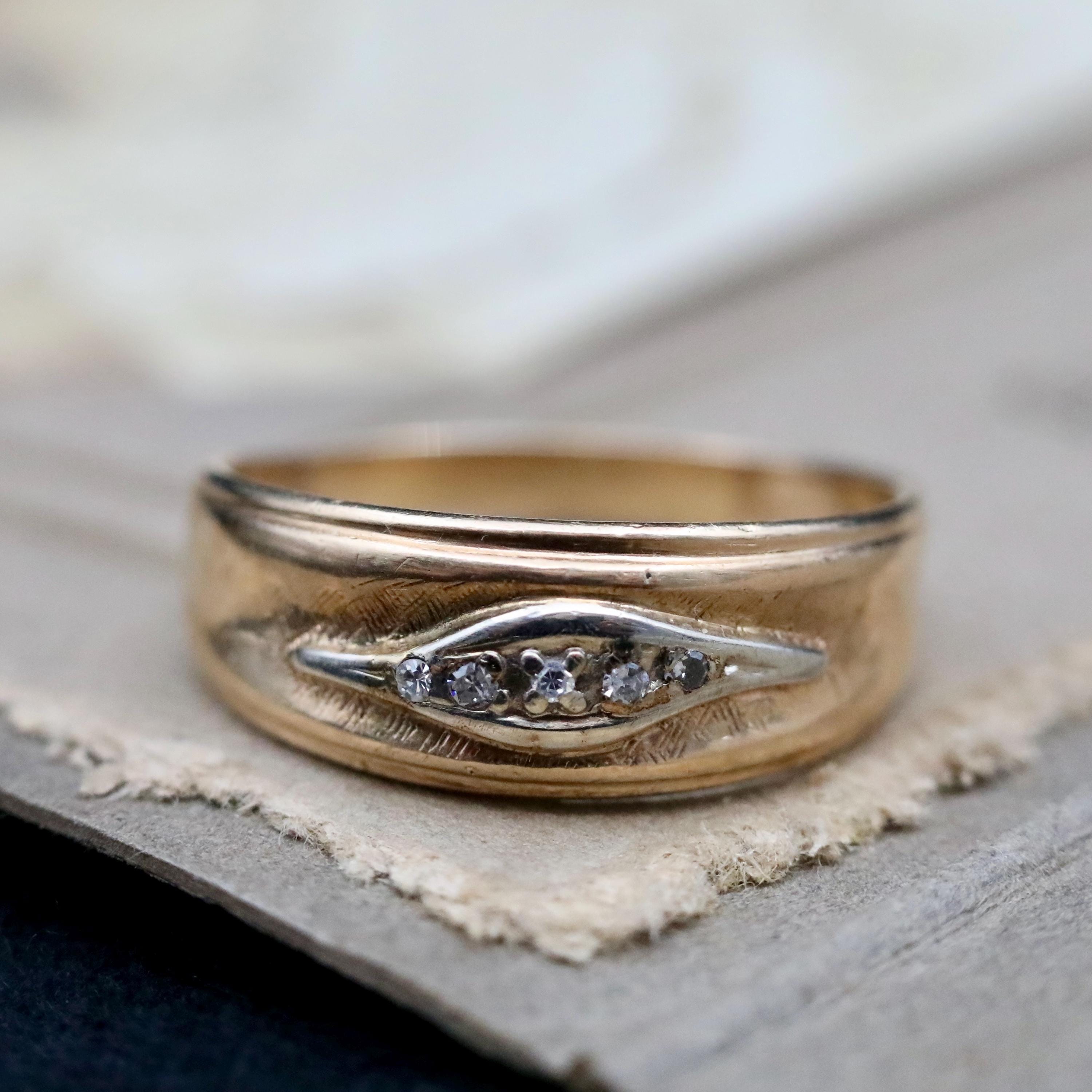 This 18k solid gold & diamond vintage men's wedding ring has a hand done Florentine finish around a setting of white gold, featuring 5 diamonds totaling .25 carats. This ring is a US size 10, can be resized.