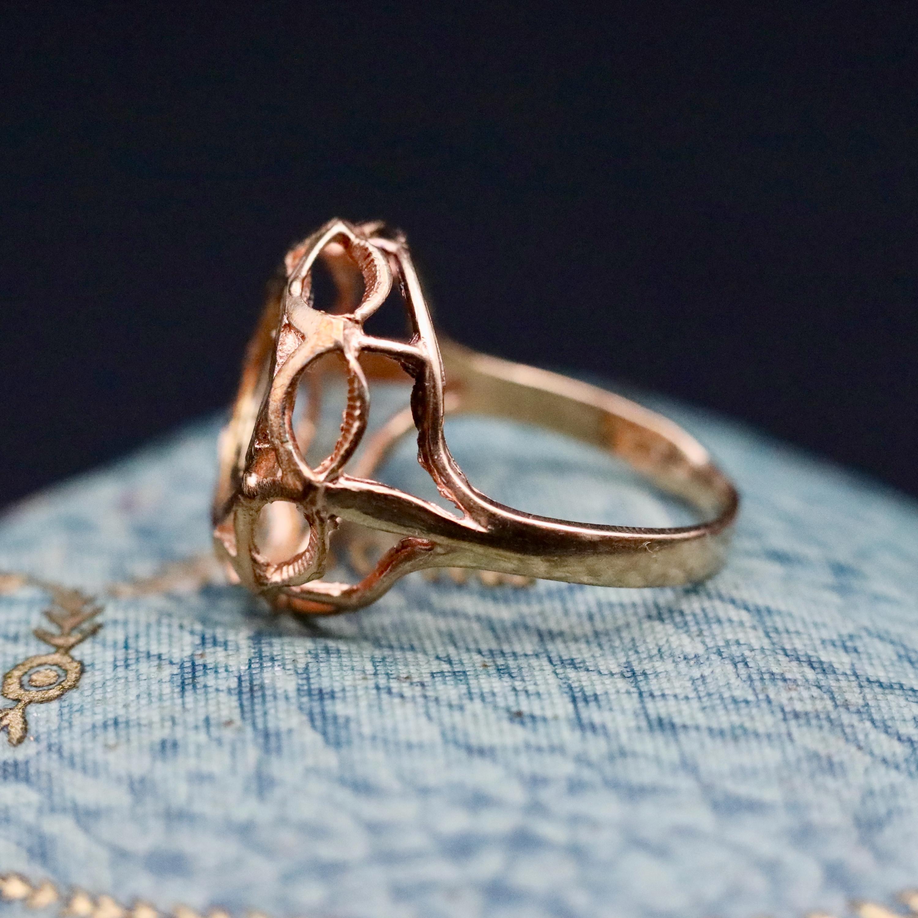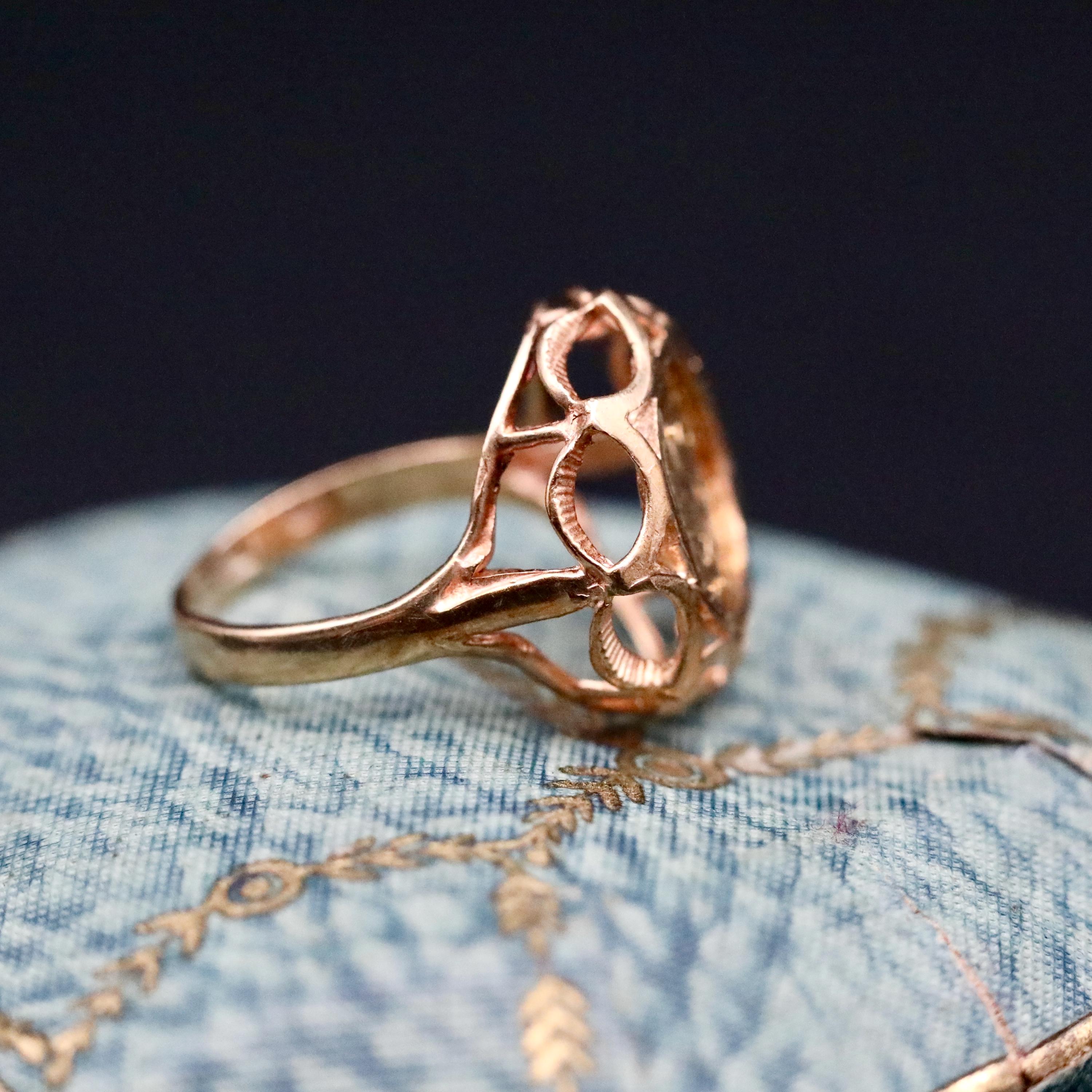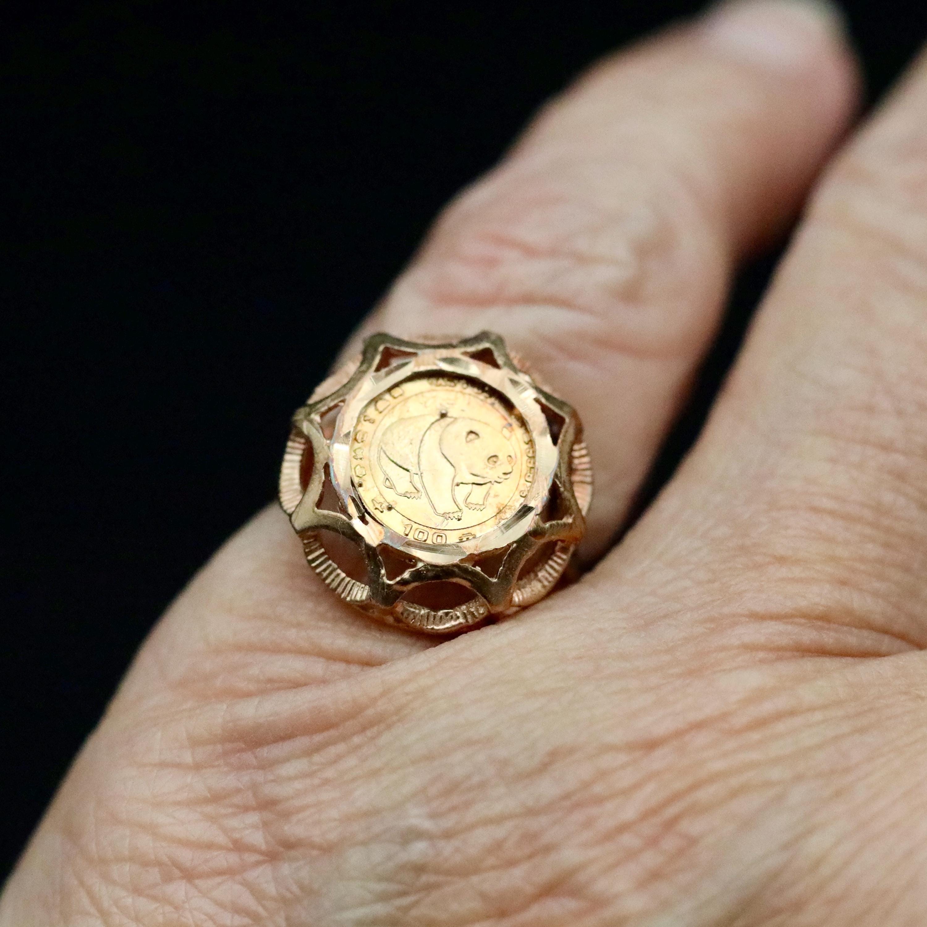 A vintage Chinese gold Panda coin is bezel-set into a 10k gold ring, creating a striking pinky ring with cultural and collectible appeal. The 22k coin features the beloved panda motif and measures 11.5mm in diameter; its warm high-karat glow contrasts beautifully with the sculpted 10k mounting.