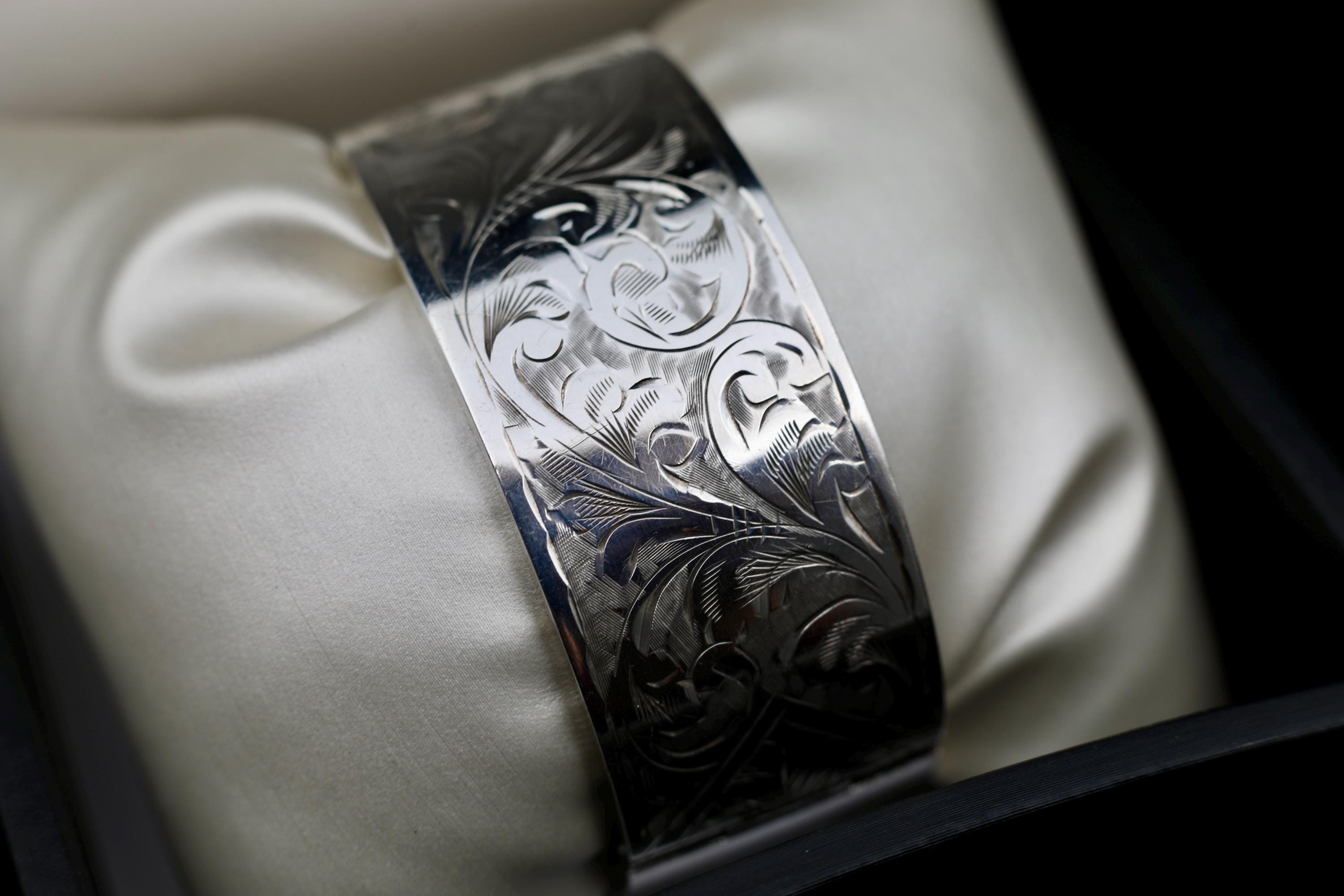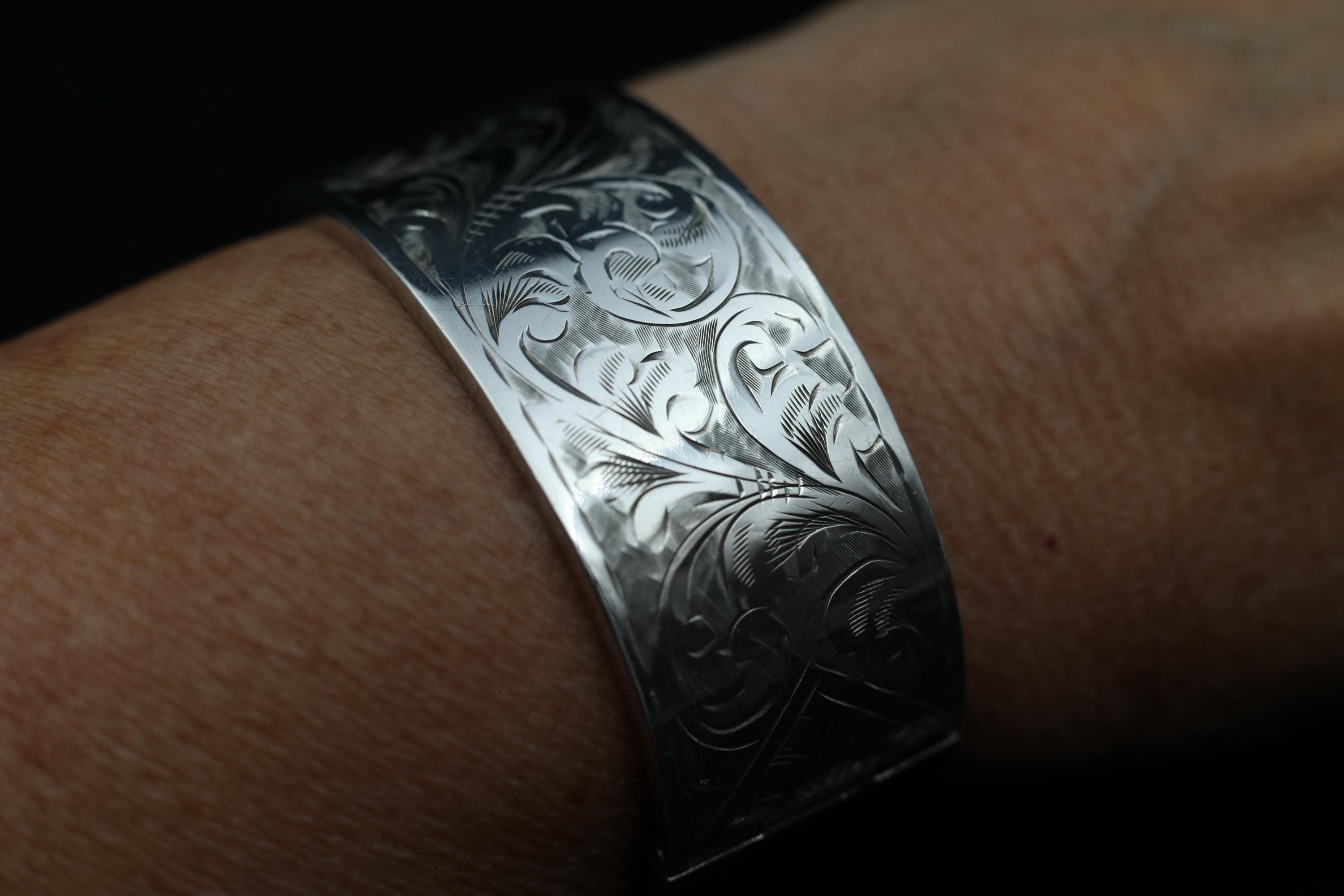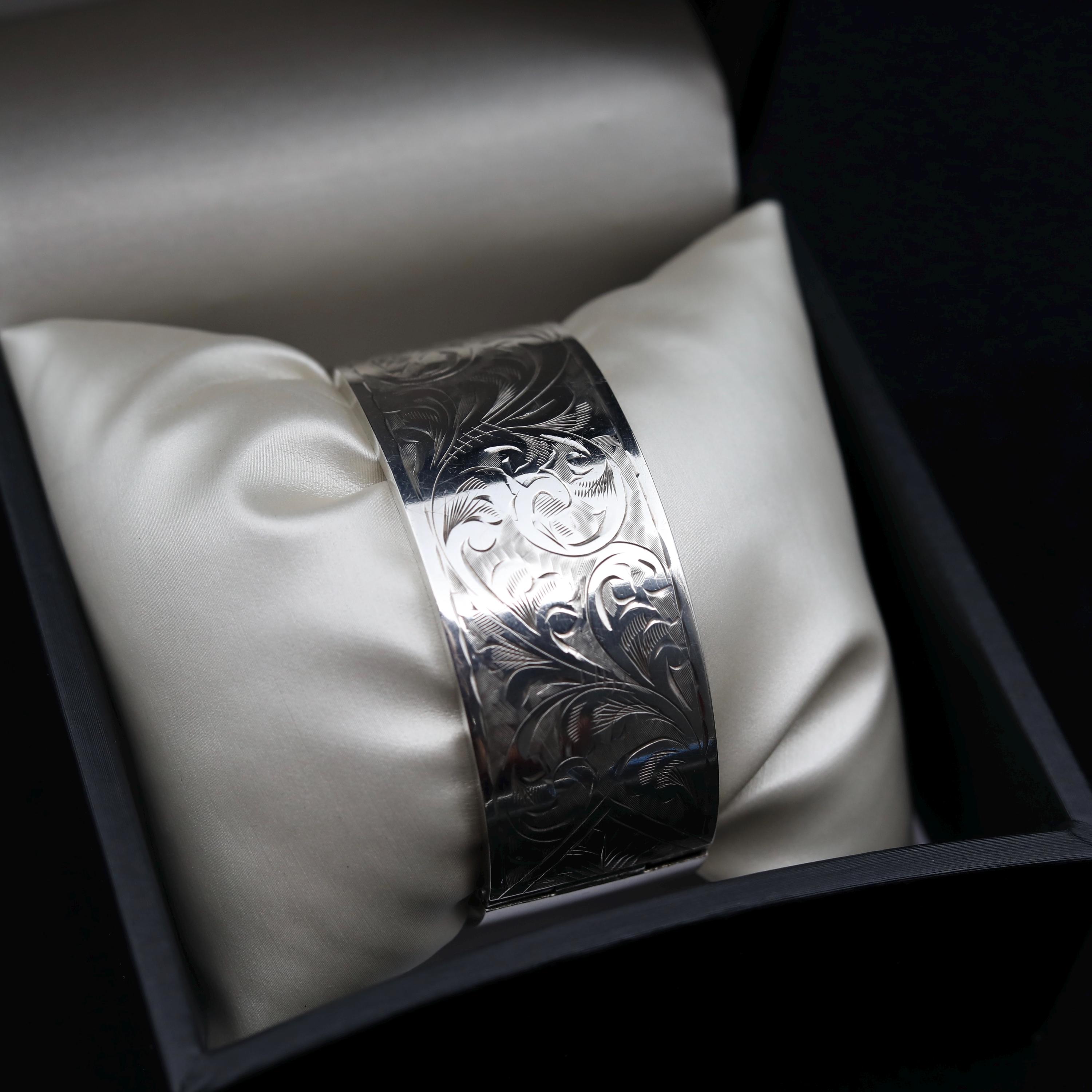 This beautifully engraved vintage sterling silver bangle is a fully hallmarked piece from Birmingham, England, crafted in 1940 by NC Reading Co. Wide, weighty, and richly decorated with hand-cut acanthus scrollwork, it captures the romantic detail of Victorian Revival design while offering the refined structure of a mid-century British cuff.