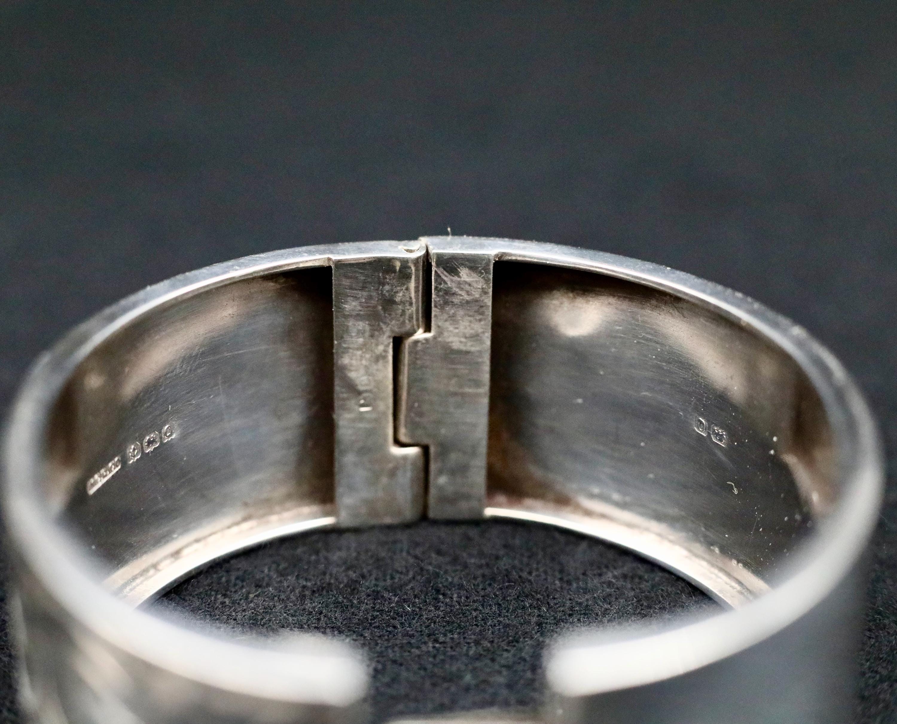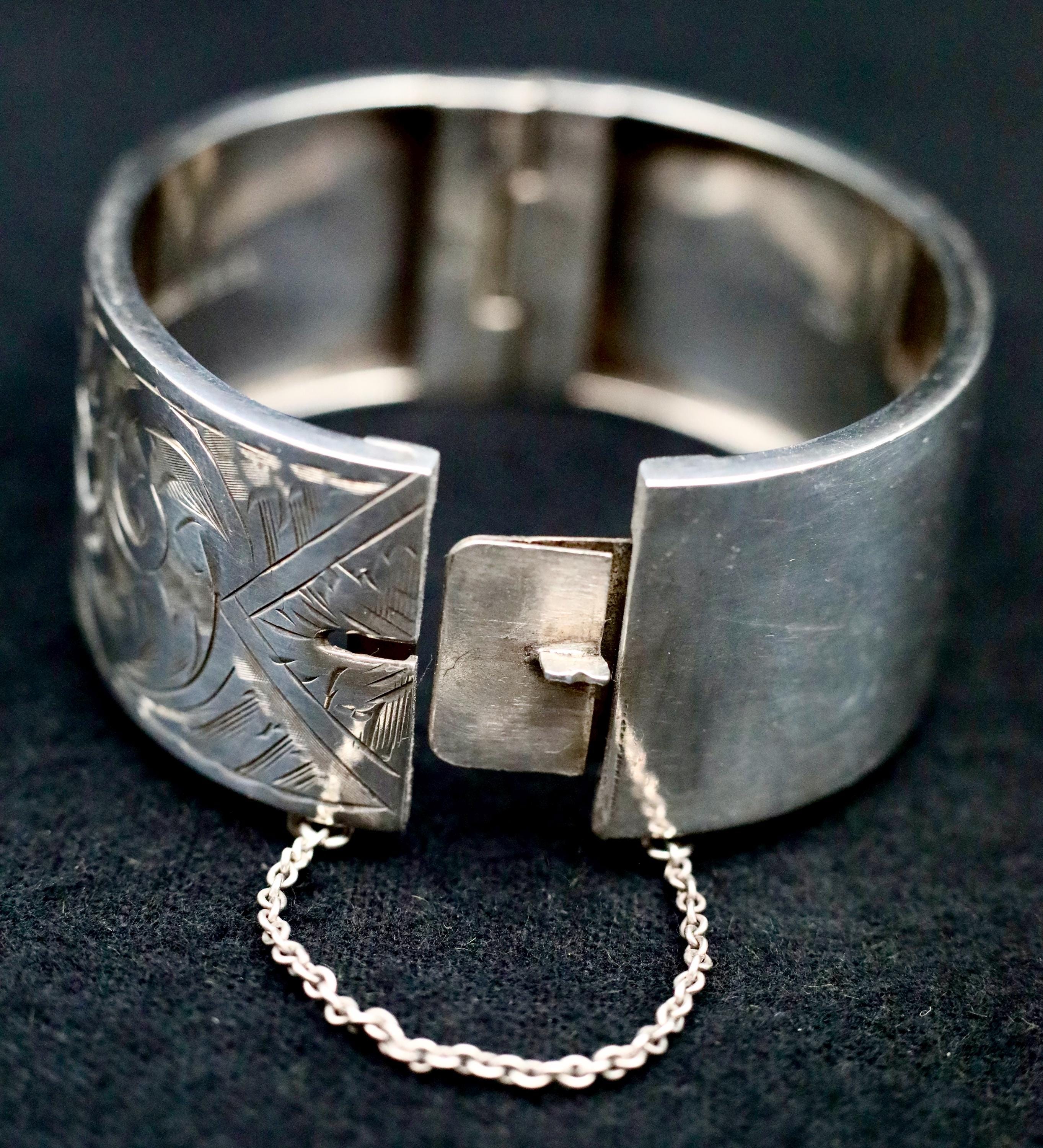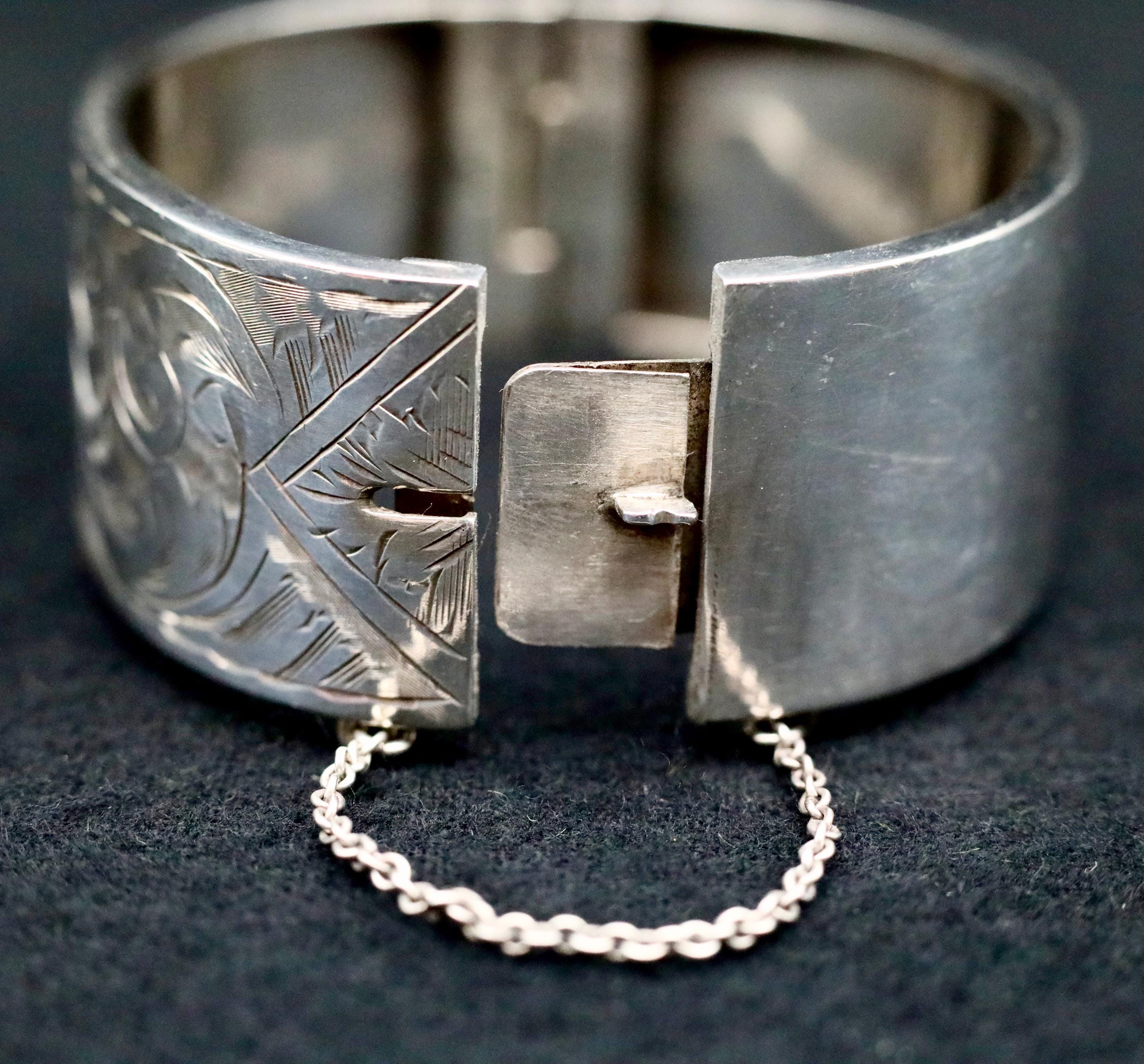 Made from solid .925 sterling silver, the bangle features a secure hinge, a well-working clasp, and the original safety chain for added confidence. Measuring 1 inch wide with a 6 3/4 inch interior, (fits a 7" wrist) it makes a striking standalone statement and layers beautifully with other sterling bracelets.