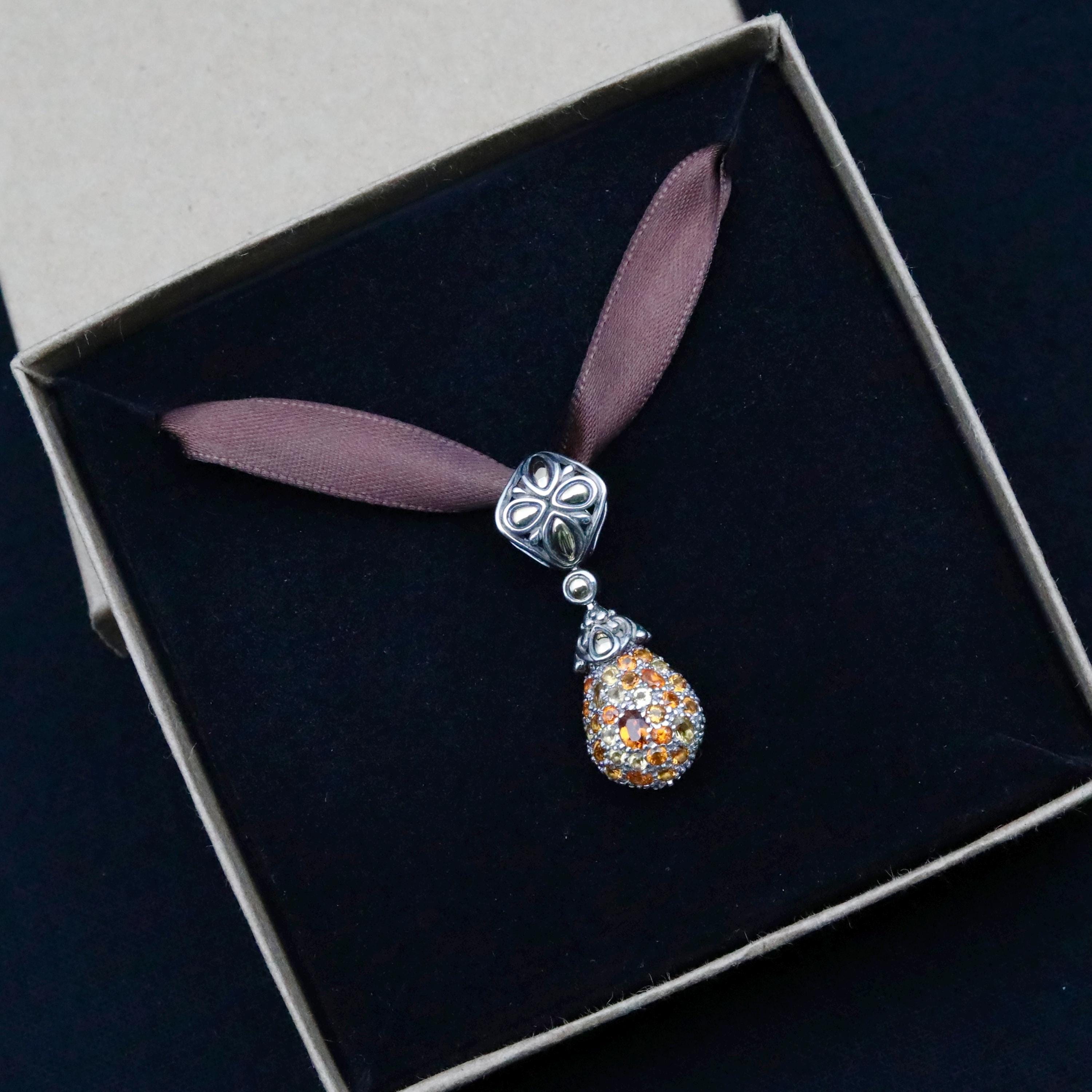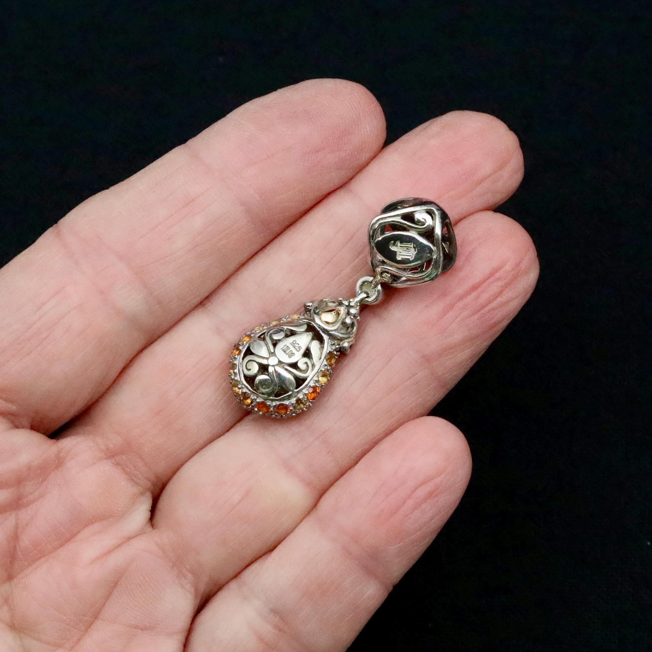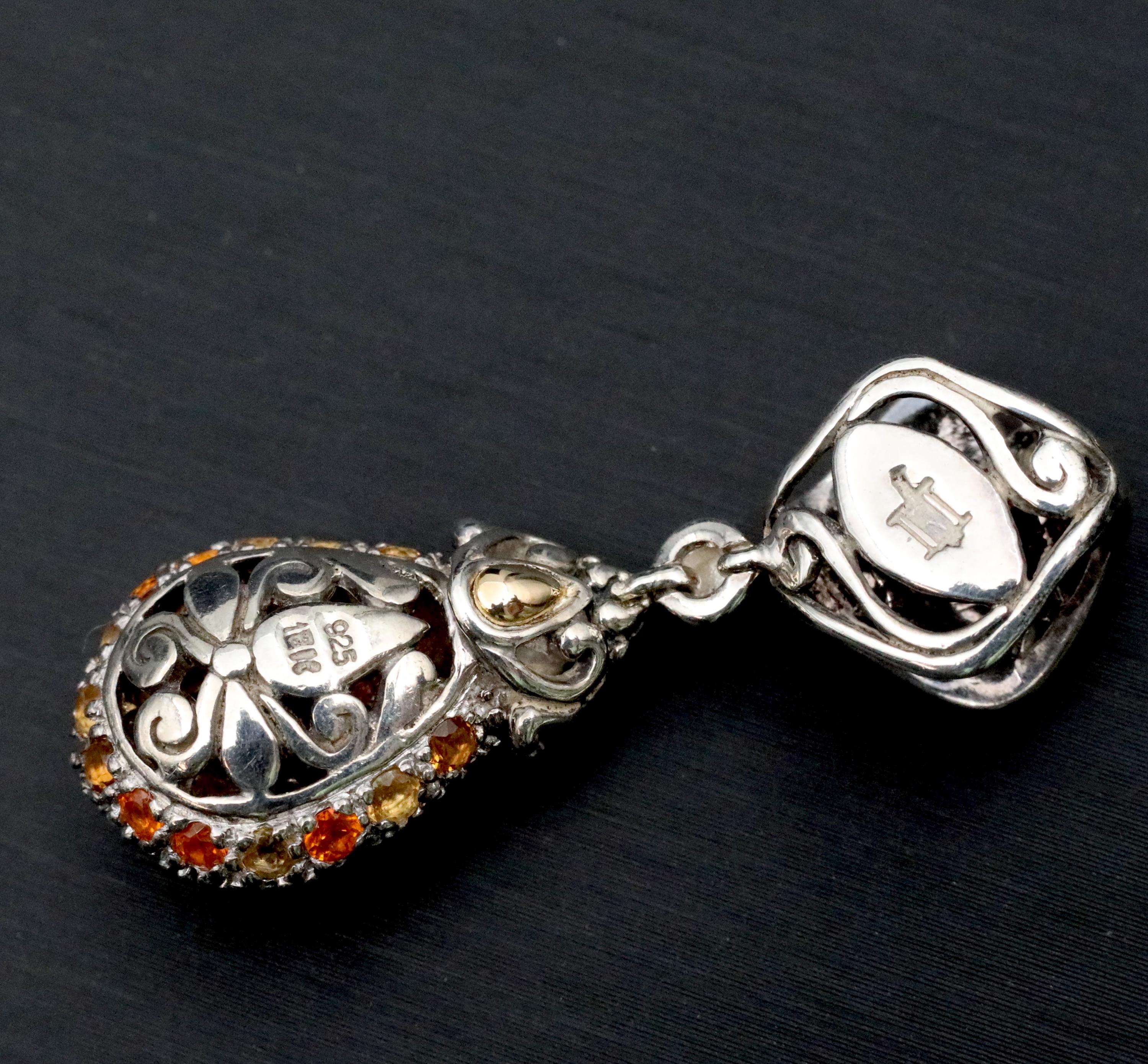 This statement citrine pendant features warm, glowing citrines set in sculpted sterling silver with rich 18k gold accents. Designed as a bold mixed-metal charm with architectural presence, the piece balances color, texture, and contrast in a refined, expressive form.