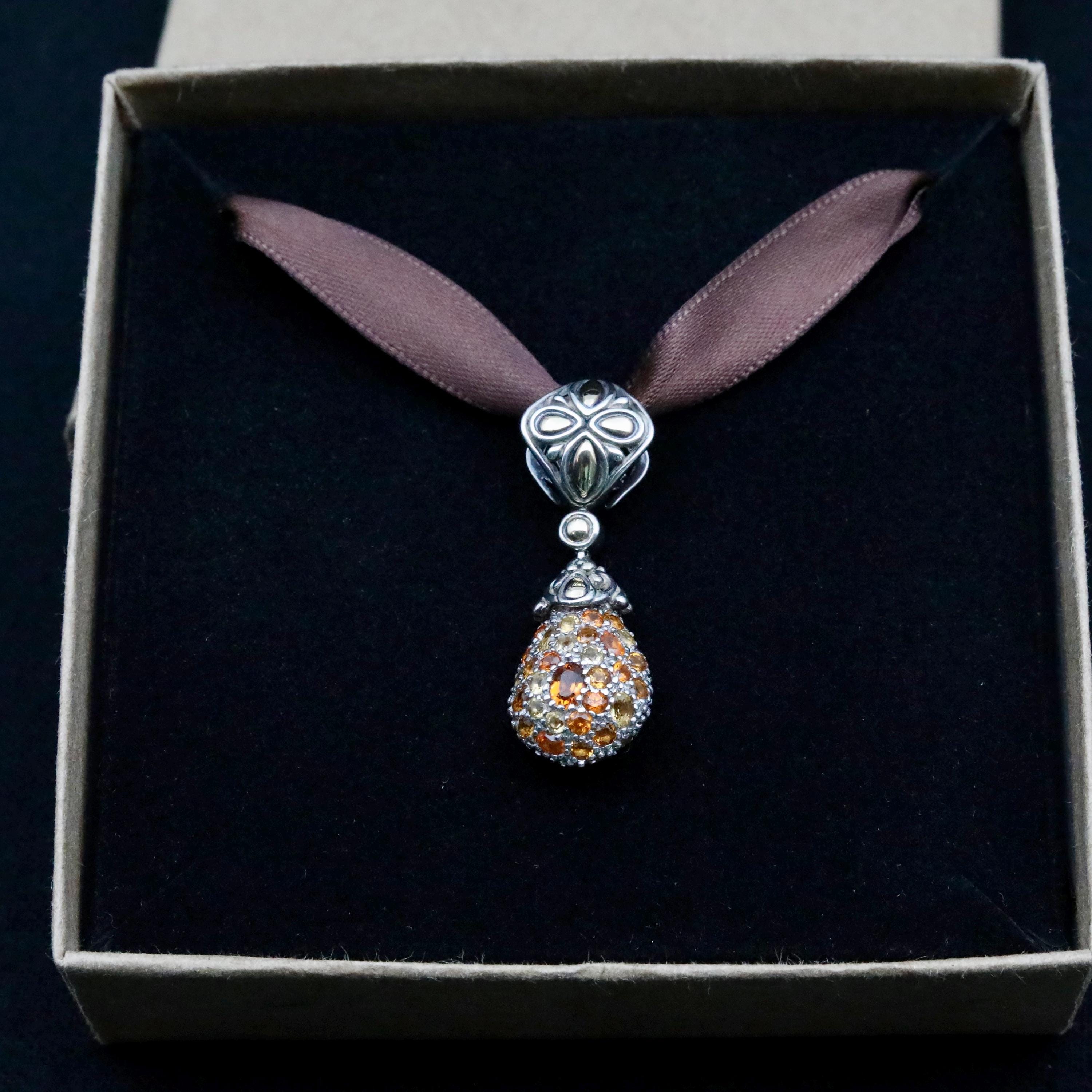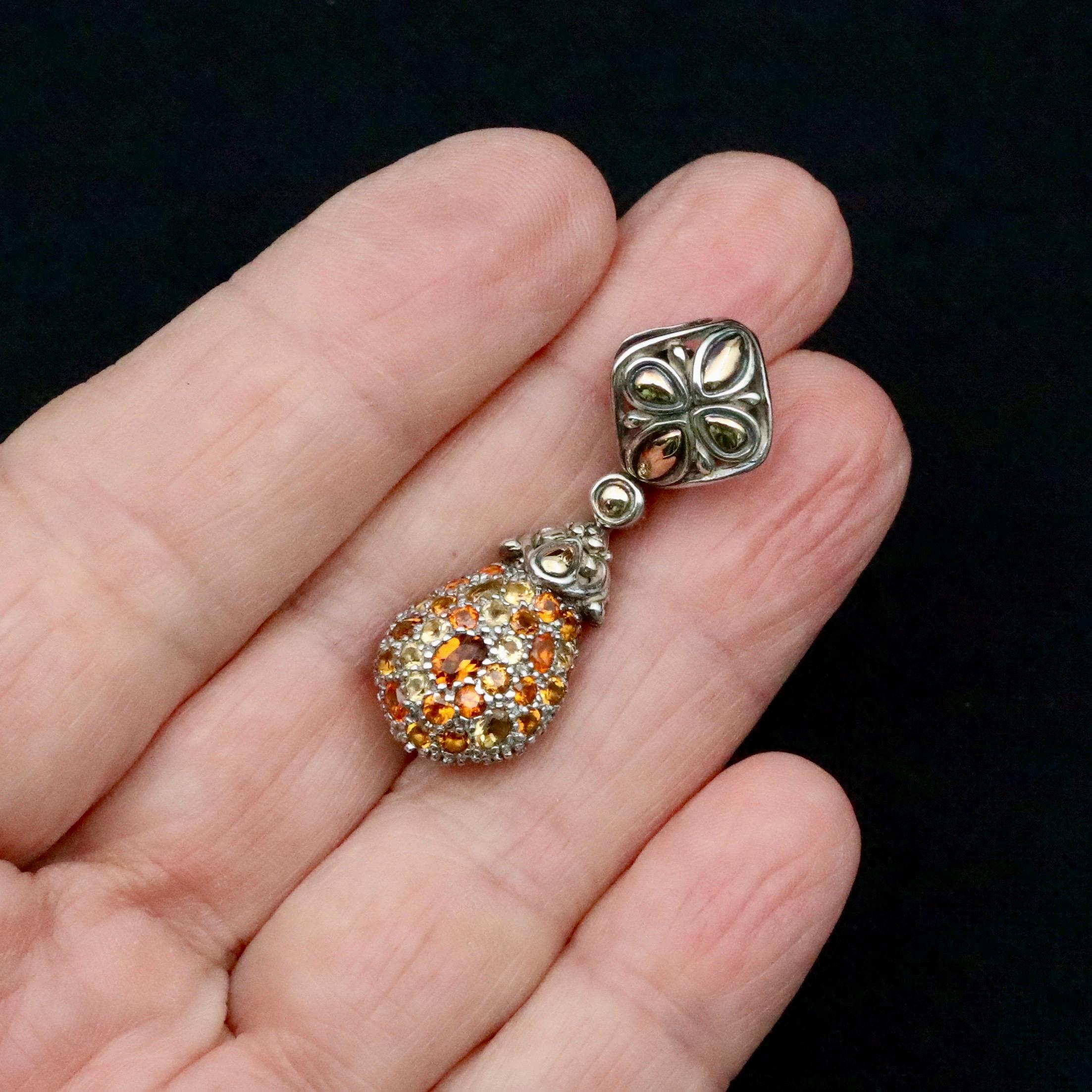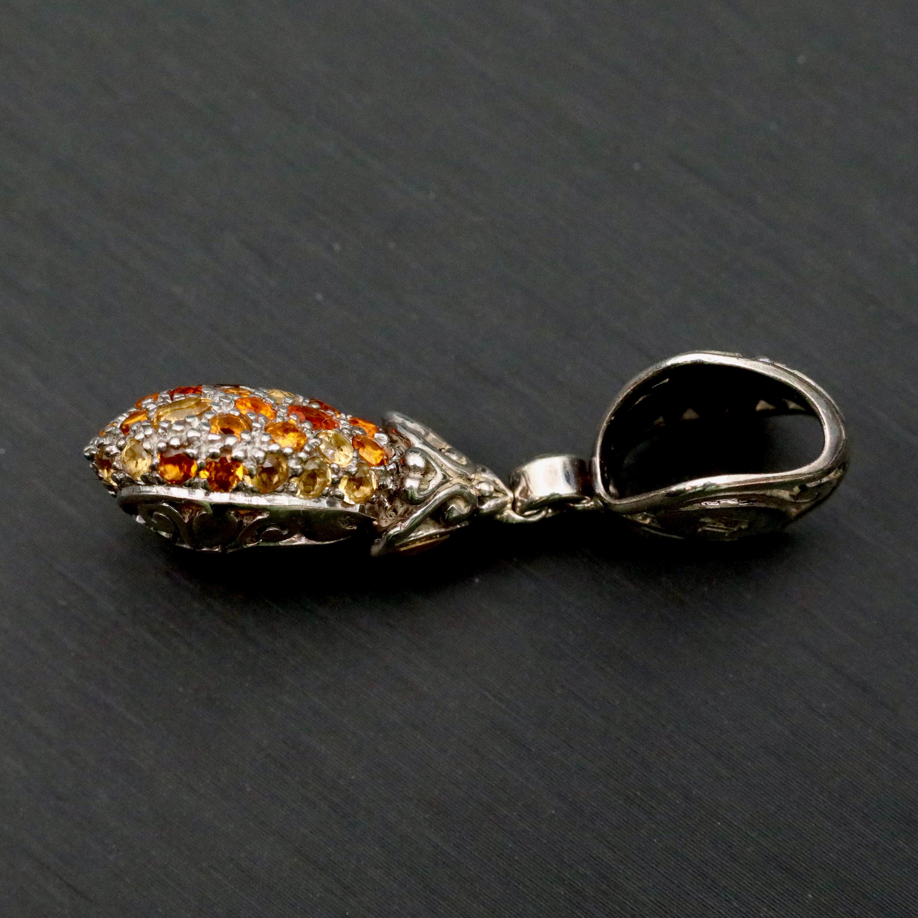 The teardrop cluster of natural citrines is arranged in a gradient of amber, honey, and pale gold tones, each stone individually set to create depth and movement. The hinged drop allows the pendant to catch the light as you wear it, while the openwork back reflects the level of craftsmanship throughout.