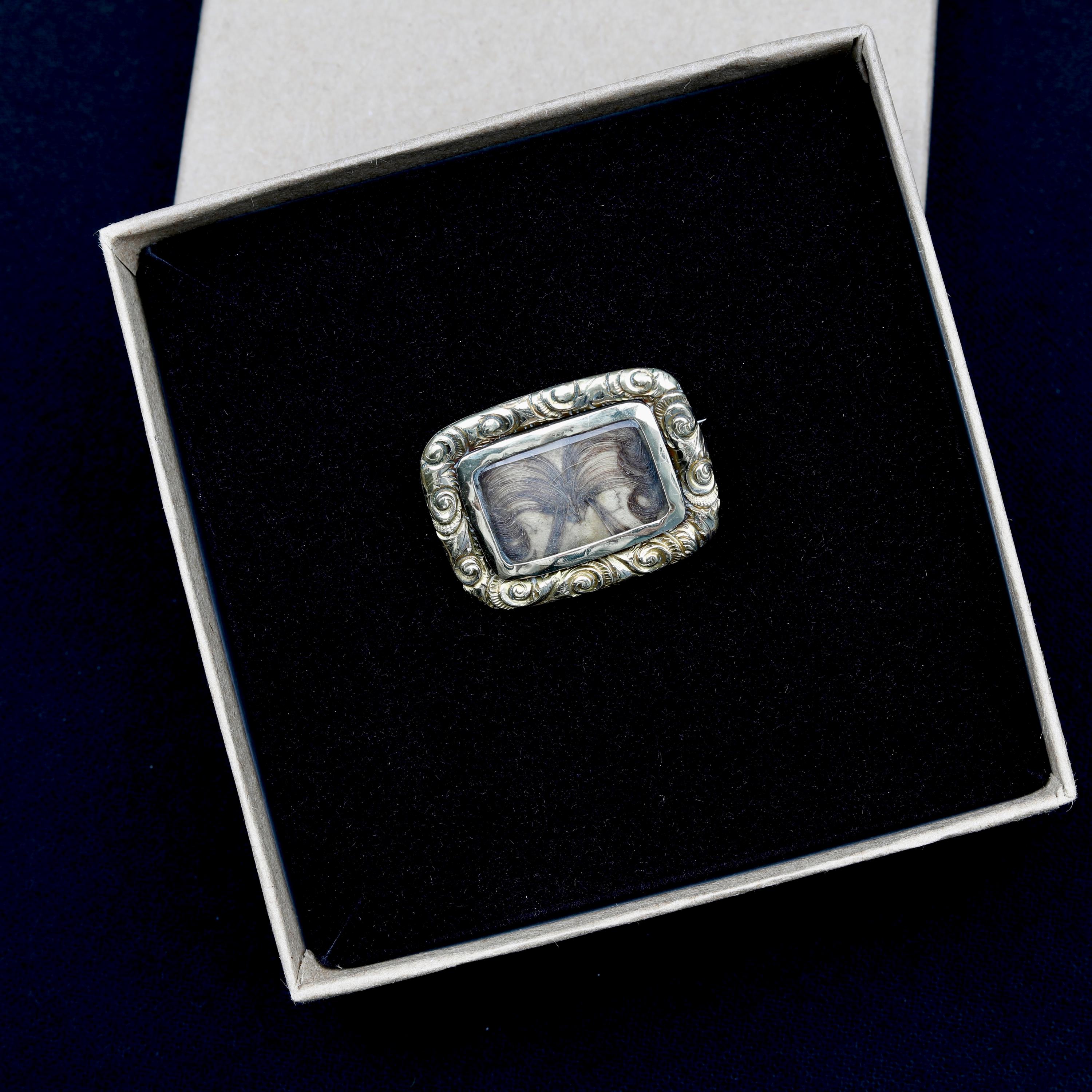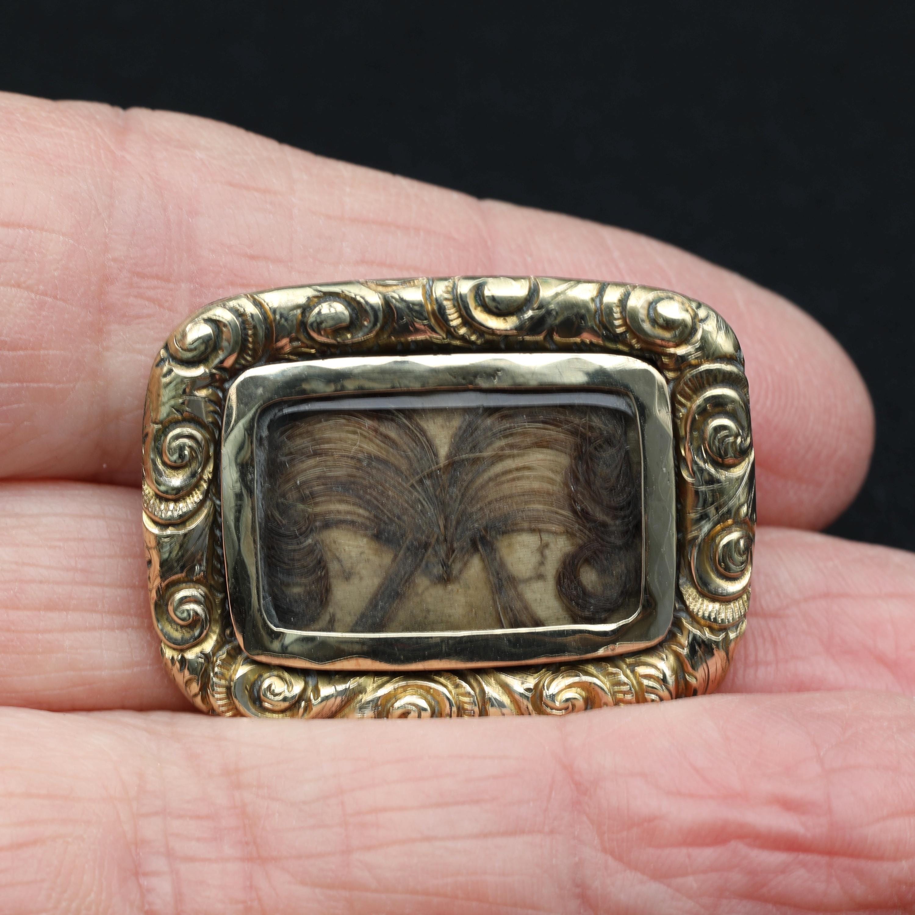 This antique Georgian mourning brooch features a gold-filled repoussé scrollwork frame surrounding preserved hairwork beneath a crystal cover. Hair jewelry of this period served as a deeply personal form of memorial adornment, and examples from the late Georgian to early Victorian era remain especially collectible. This piece is well suited to historical jewelry collections, mourning jewelry studies, and for wear by those drawn to early gothic and romantic symbolism.