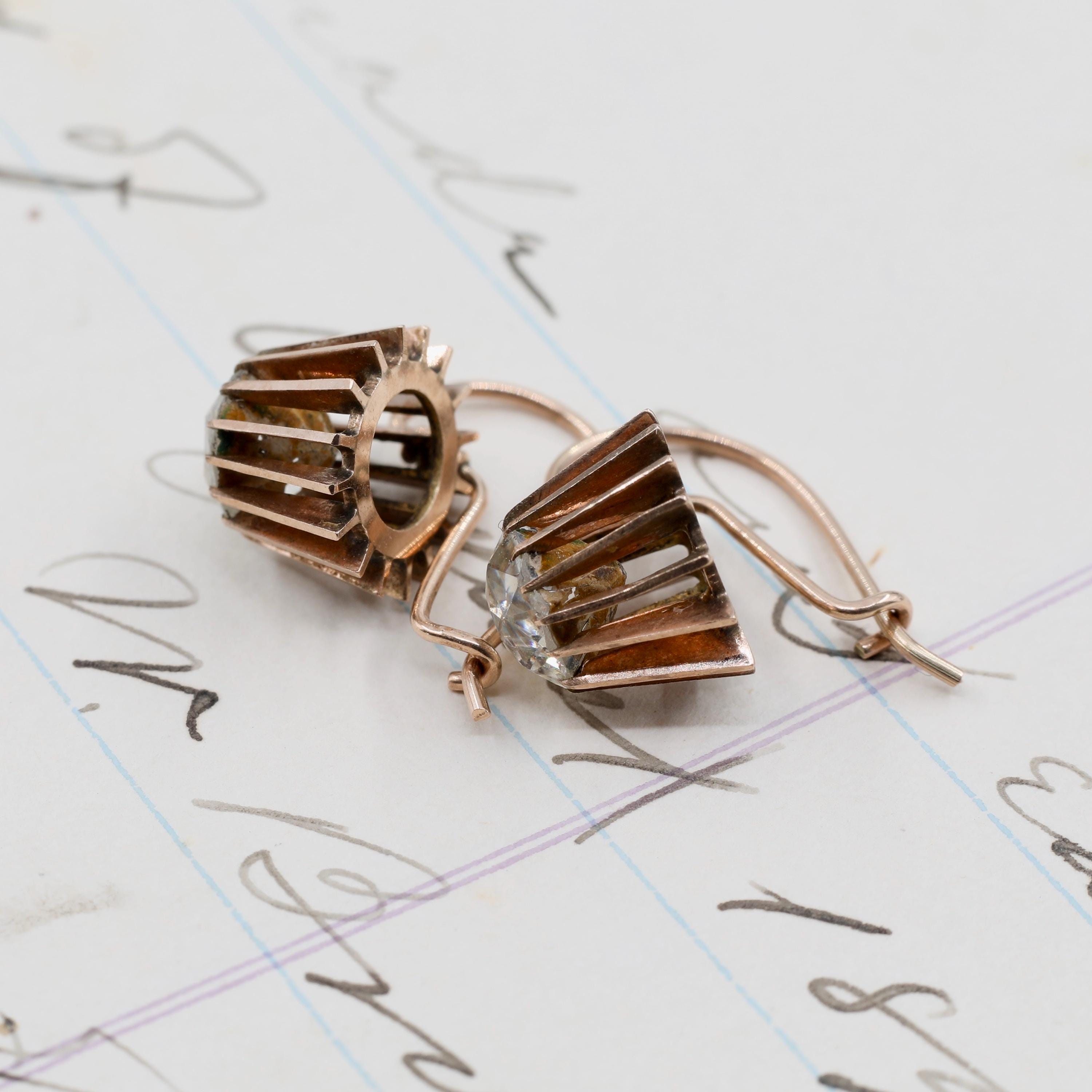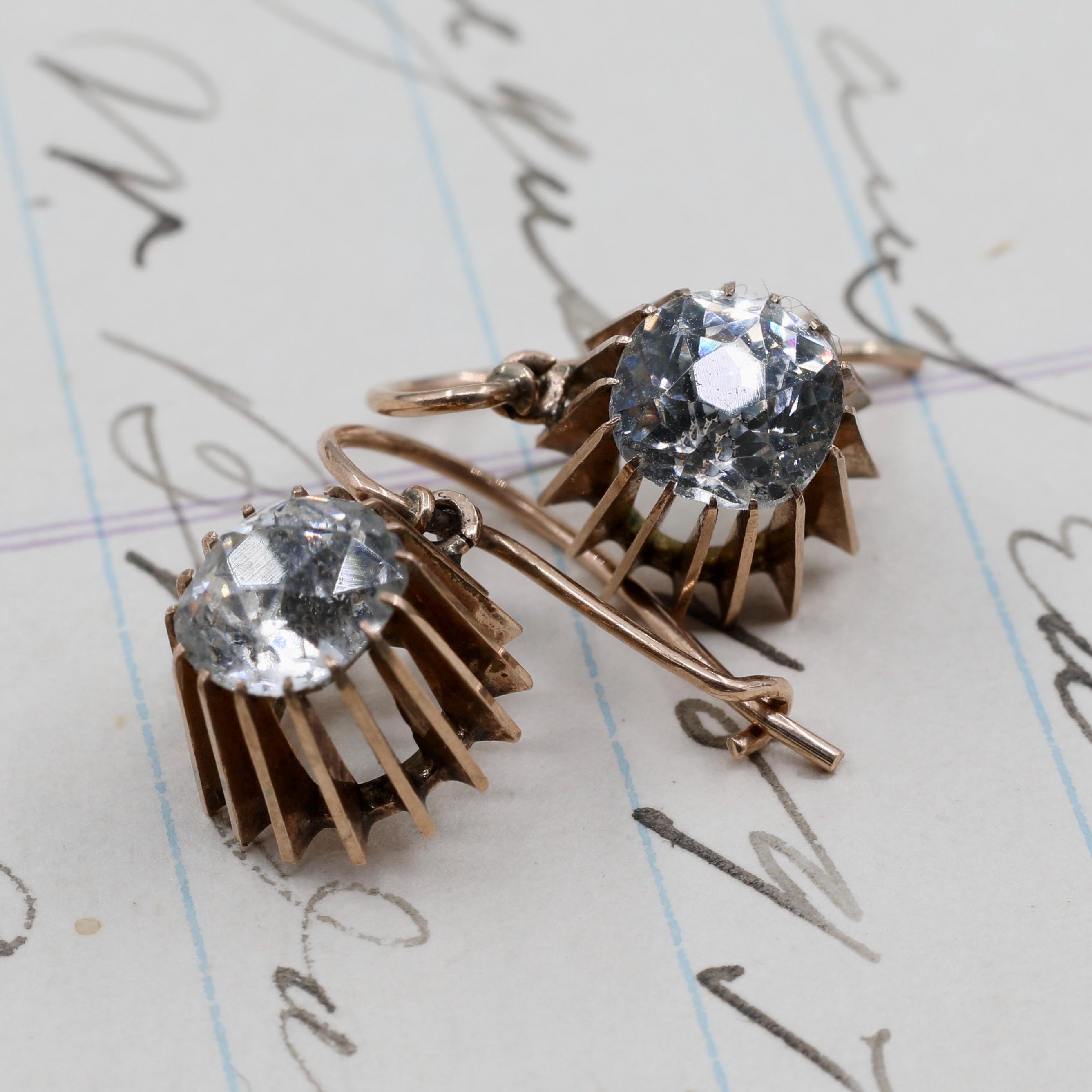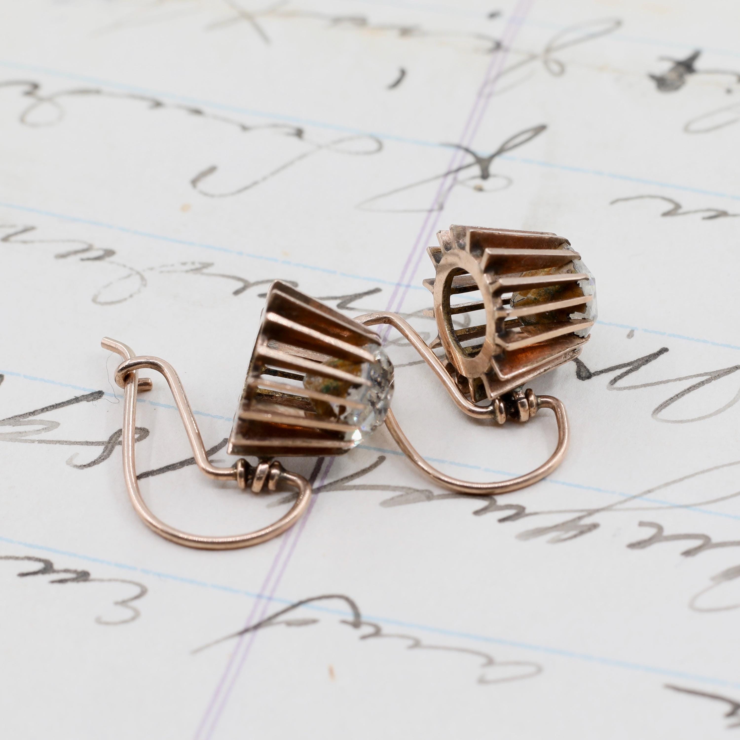 These Georgian 14k gold paste dangle earrings shimmer with the distinctive fire of early foiled stones, each one hand-cut in an Old European style and set in beautifully delicate Georgian mounts. Lightweight, comfortable, and entirely handmade, they retain their original 14k gold ear wires and the subtle irregularities beloved in true 19th-century craftsmanship.