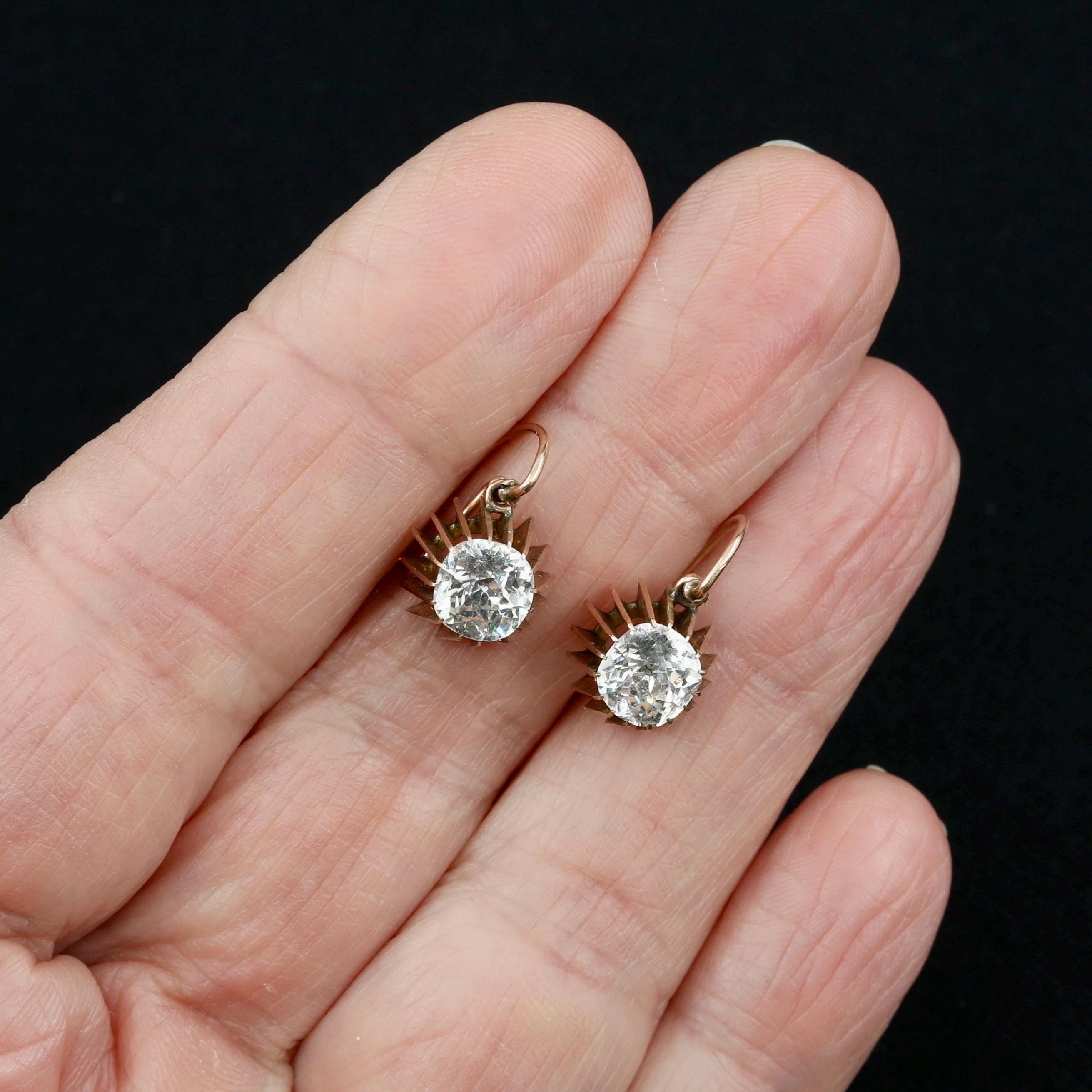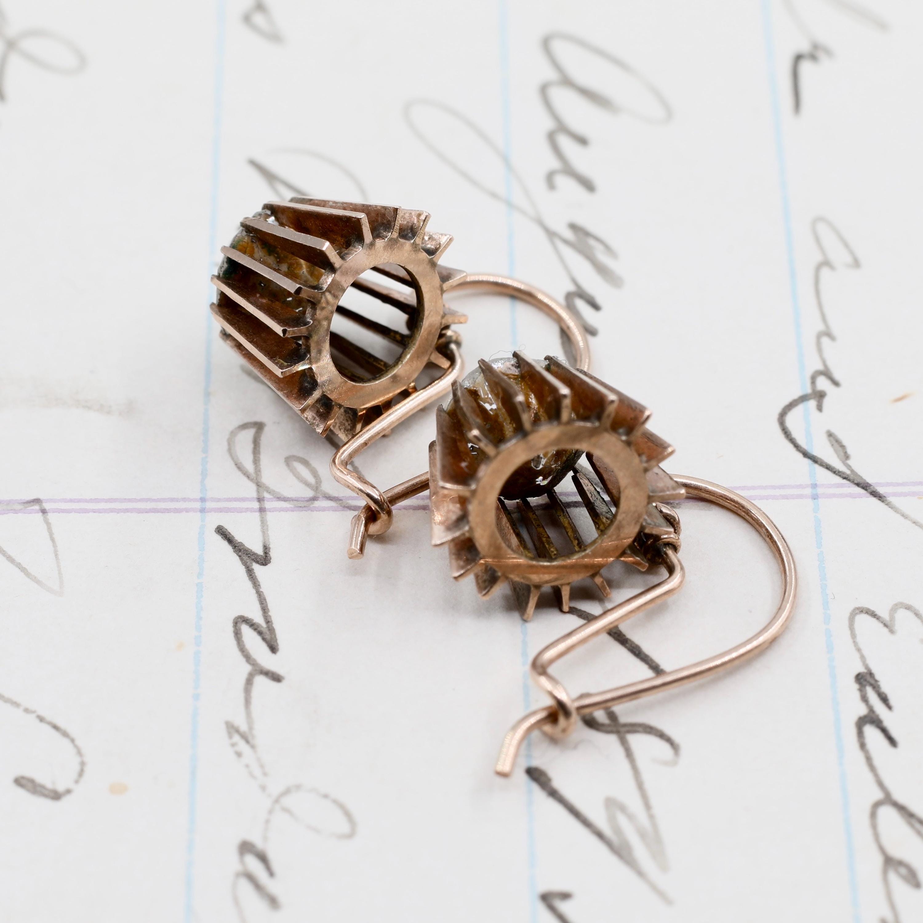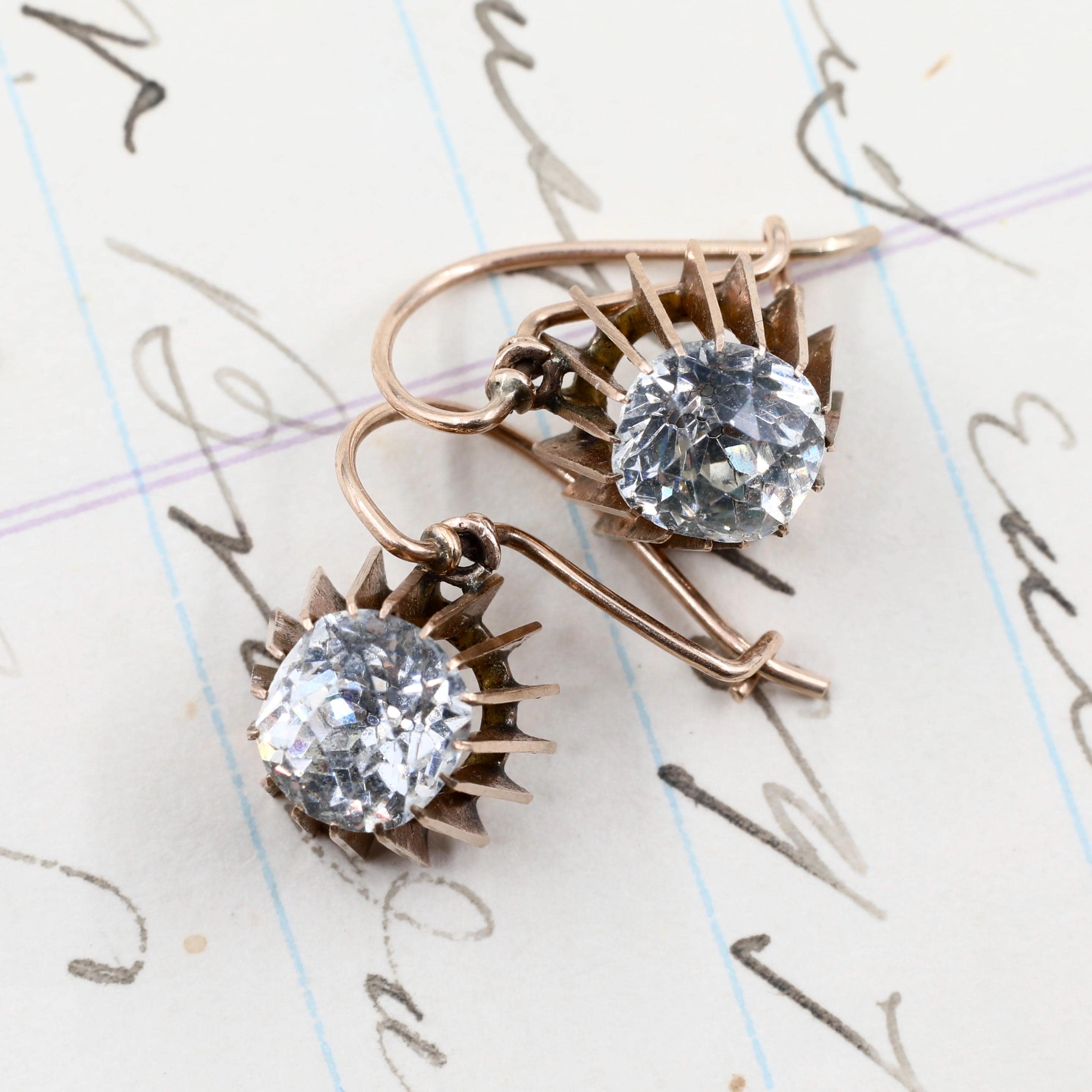 These Georgian 14k gold paste dangle earrings shimmer with the distinctive fire of early foiled stones, each one hand-cut in an Old European style and set in beautifully delicate Georgian mounts. Lightweight, comfortable, and entirely handmade, they retain their original 14k gold ear wires and the subtle irregularities beloved in true 19th-century craftsmanship.