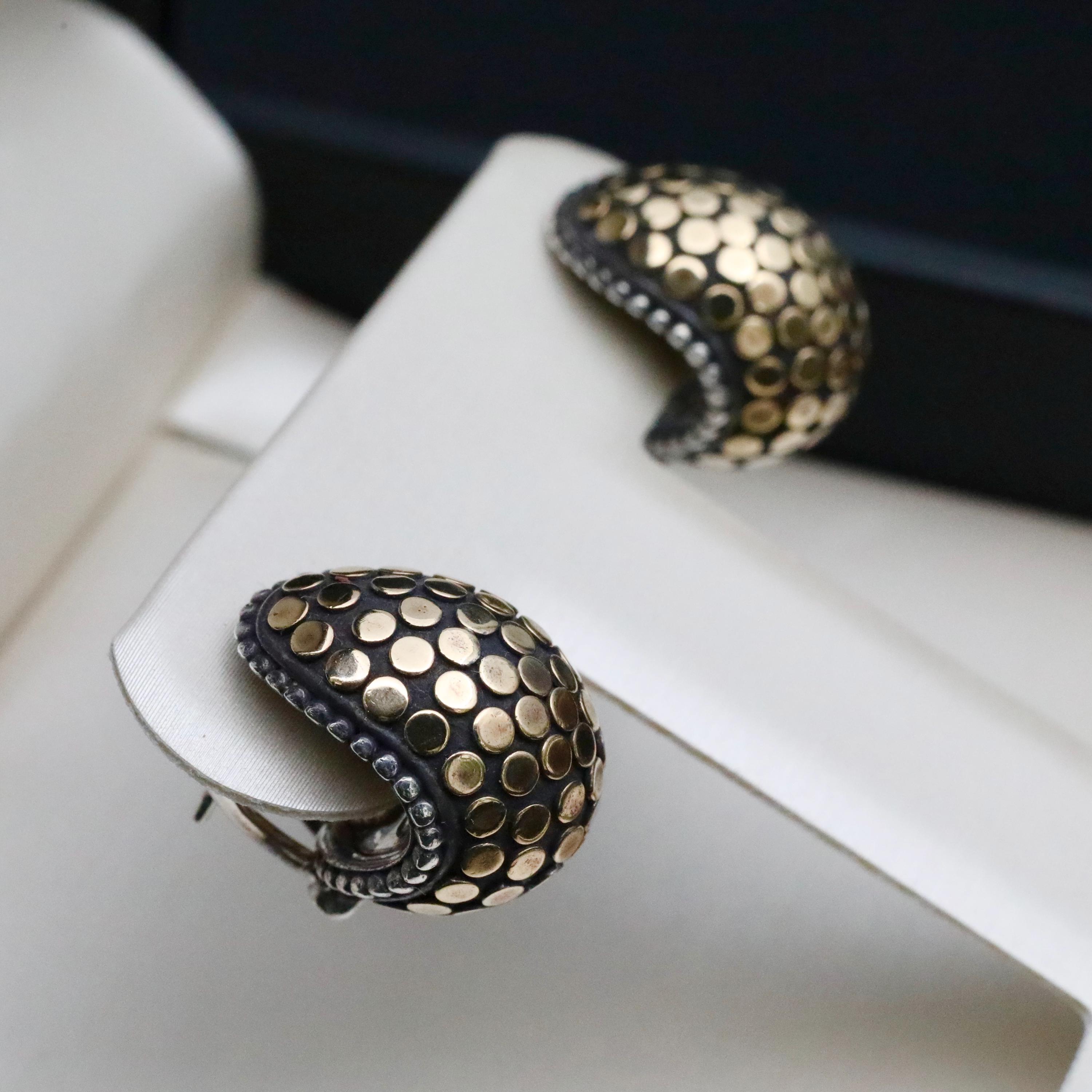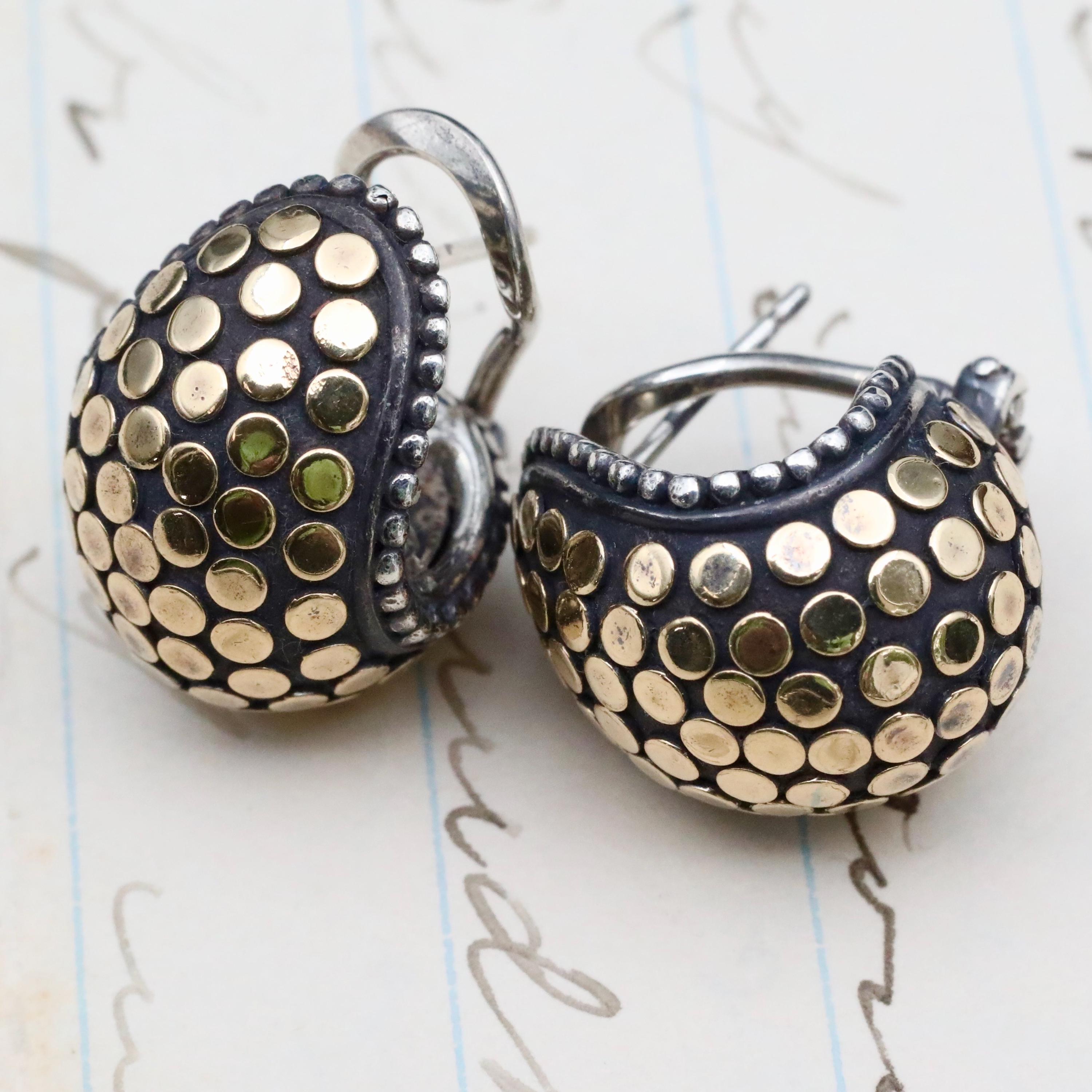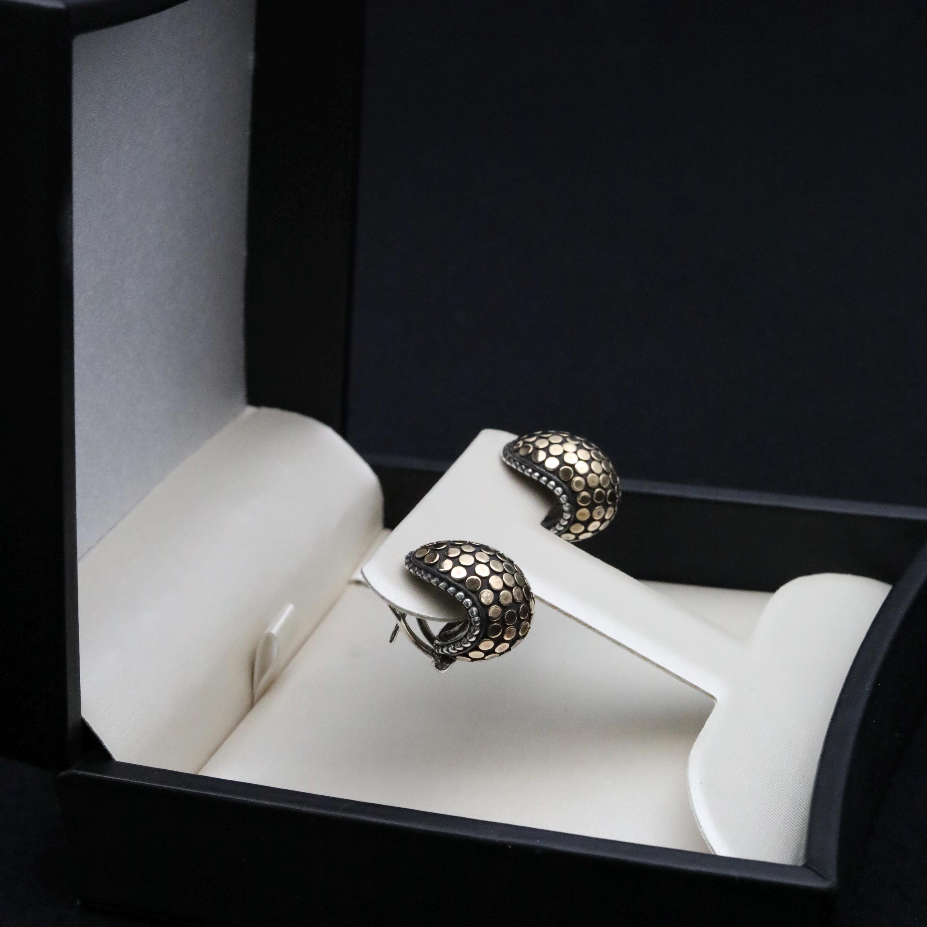 A bold pair of John Hardy mixed-metal “Buddha Belly” hoop earrings, crafted in sterling silver with applied 18k yellow gold dots. This sculptural design reflects the distinctive forms of Hardy’s late-1990s workshop, where weight, texture, and proportion were central to the collection’s aesthetic. The earrings are fitted with secure omega backs, a signature detail used in many of the house’s more substantial styles.