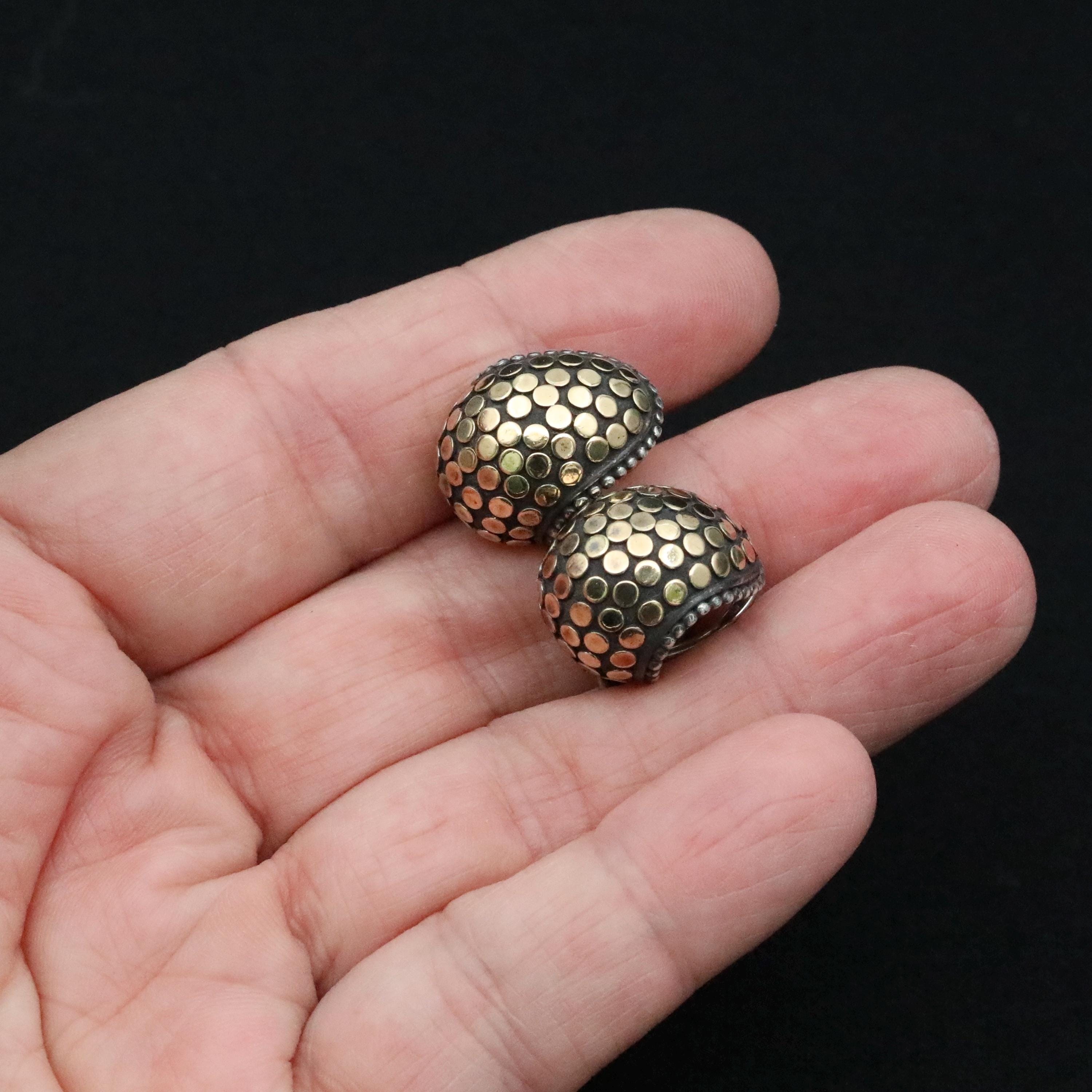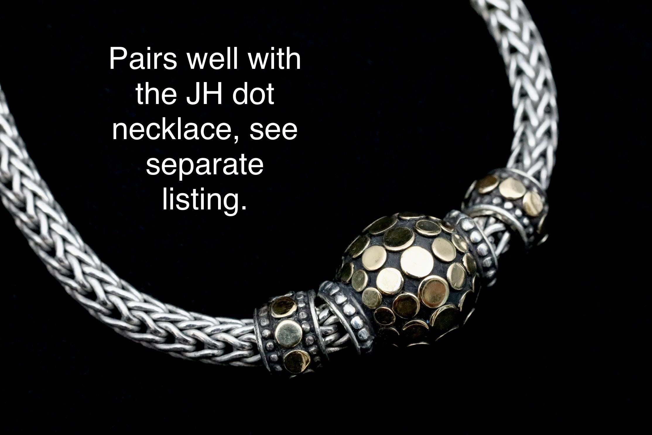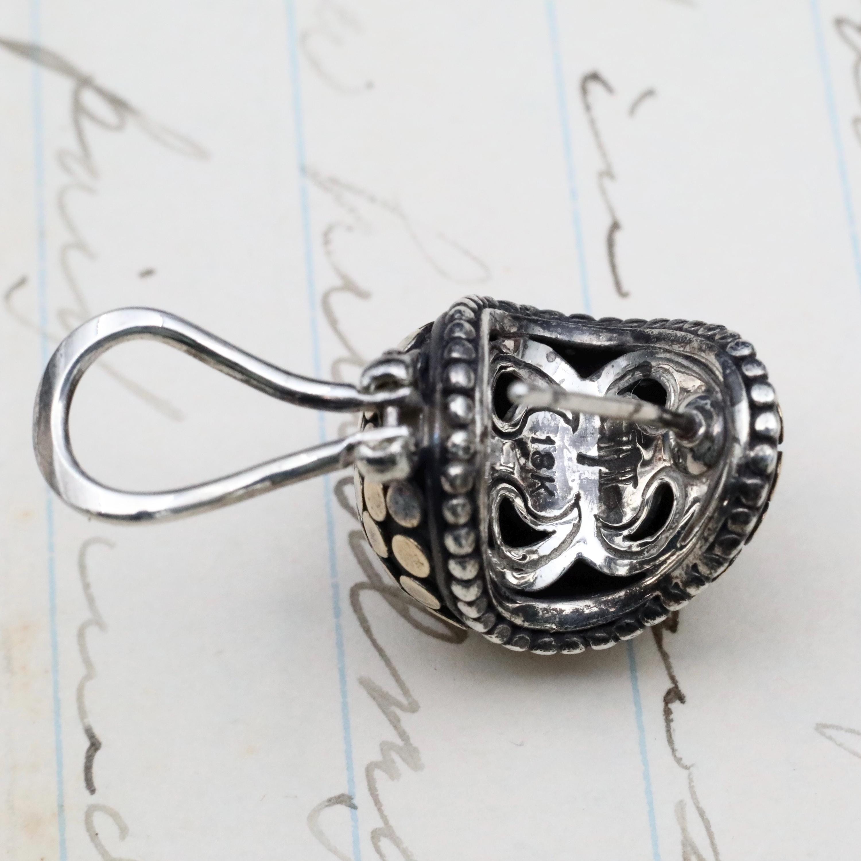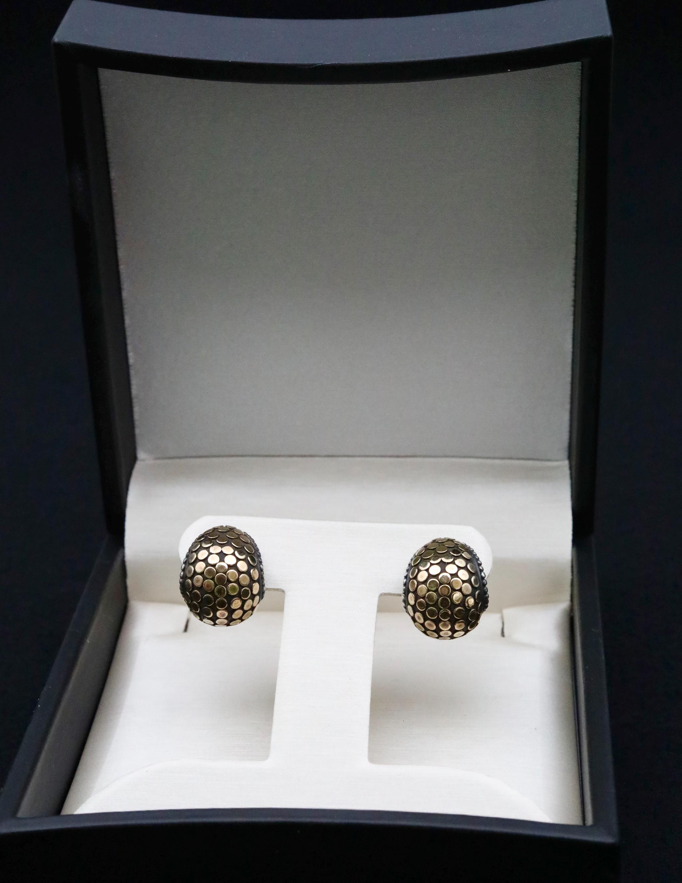 A bold pair of John Hardy mixed-metal “Buddha Belly” hoop earrings, crafted in sterling silver with applied 18k yellow gold dots. This sculptural design reflects the distinctive forms of Hardy’s late-1990s workshop, where weight, texture, and proportion were central to the collection’s aesthetic. The earrings are fitted with secure omega backs, a signature detail used in many of the house’s more substantial styles.