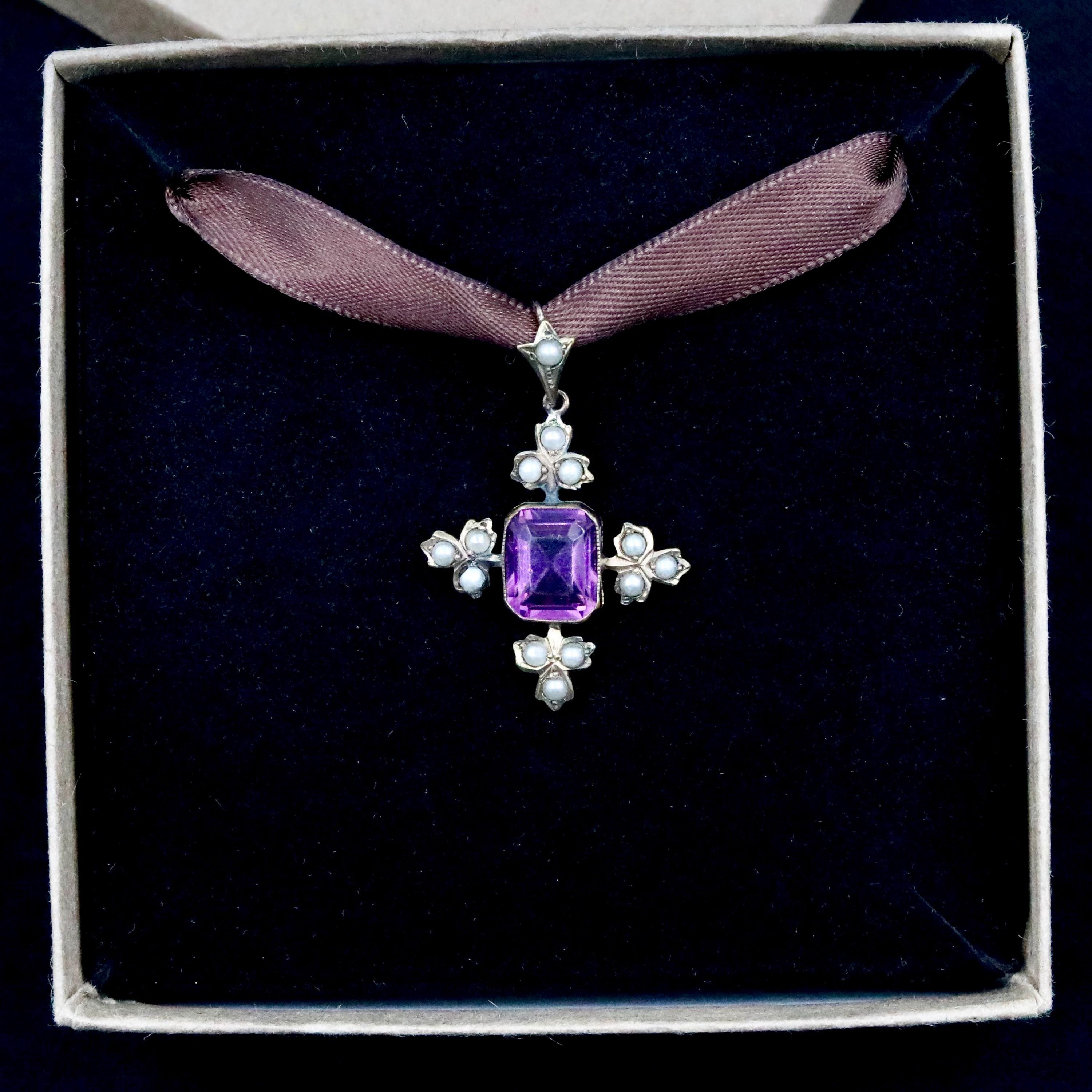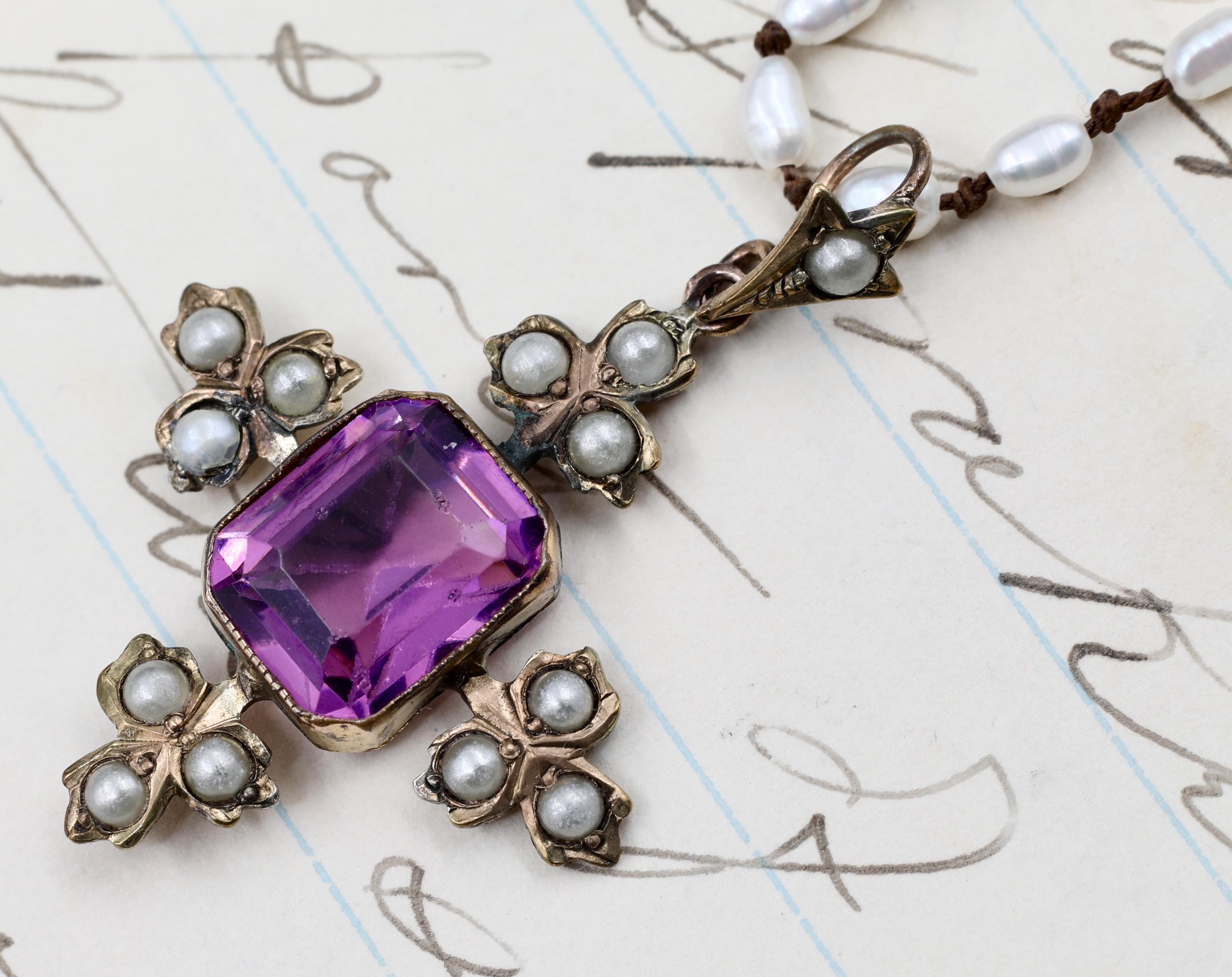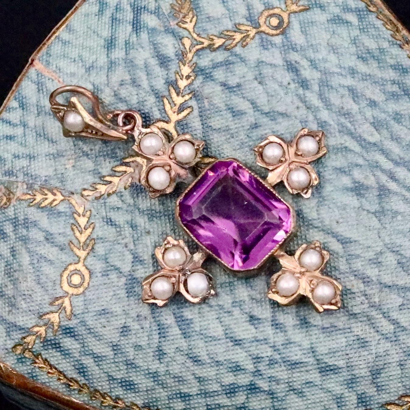 Antique Victorian Amethyst & Pearl Cross Pendant, Gold-Washed Silver, c. 1840–1860. A beautifully preserved early Victorian cross pendant, centered with a richly colored emerald-cut amethyst of exceptional hue. Surrounding the stone are four trefoil clusters of natural seed pearls, each set in softly worn floral bezels typical of mid-19th-century work. A pearl-accented bail completes the design.