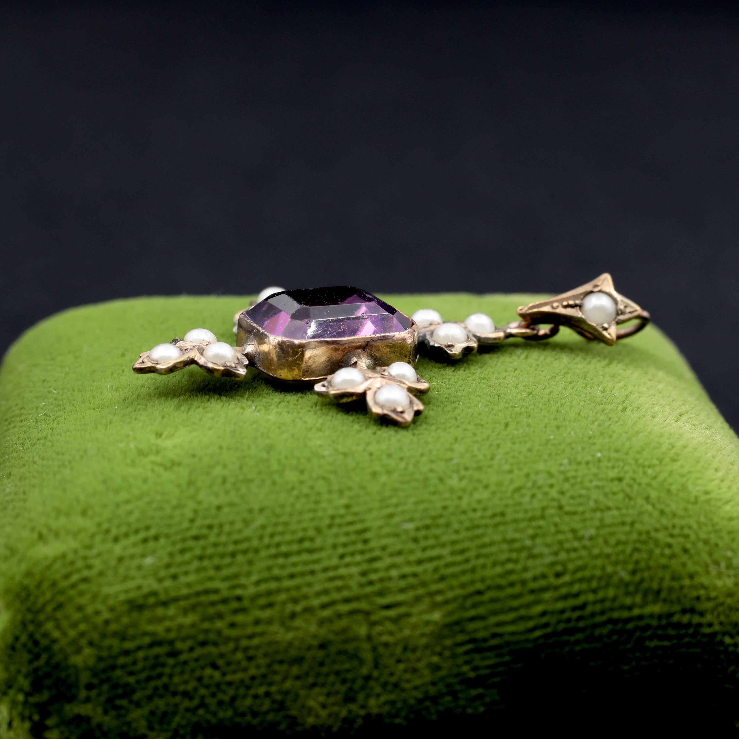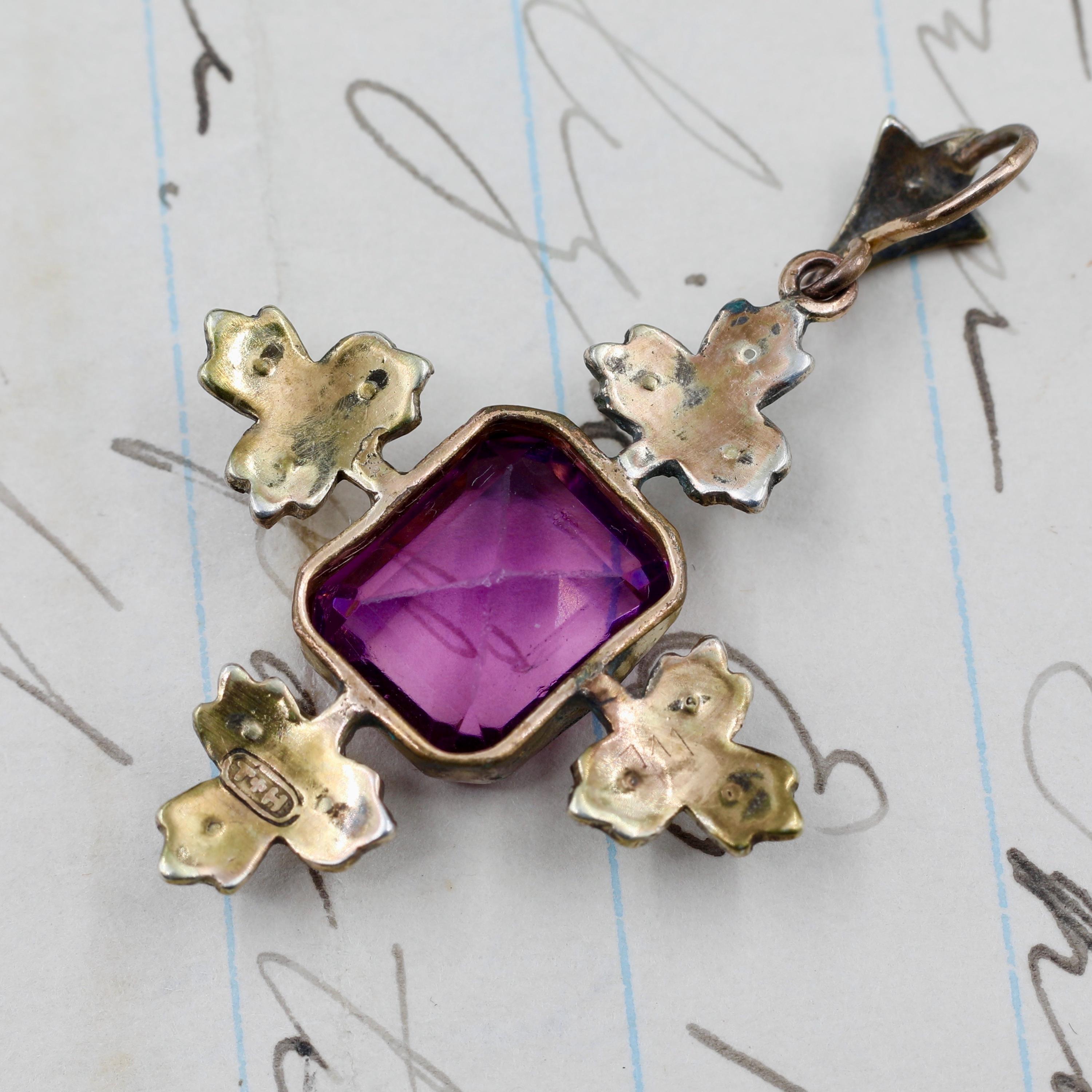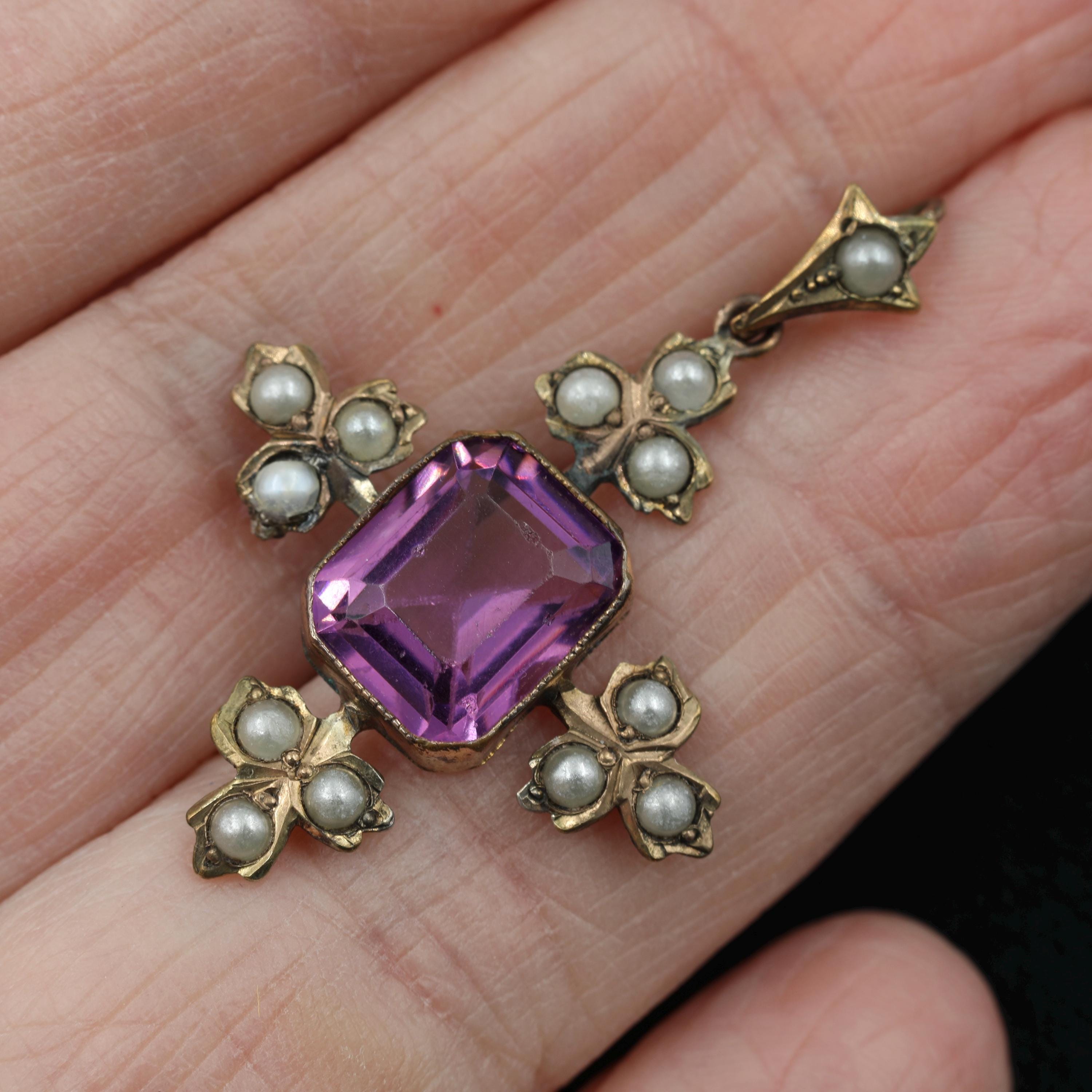 Antique Victorian Amethyst & Pearl Cross Pendant, Gold-Washed Silver, c. 1840–1860. A beautifully preserved early Victorian cross pendant, centered with a richly colored emerald-cut amethyst of exceptional hue. Surrounding the stone are four trefoil clusters of natural seed pearls, each set in softly worn floral bezels typical of mid-19th-century work. A pearl-accented bail completes the design.