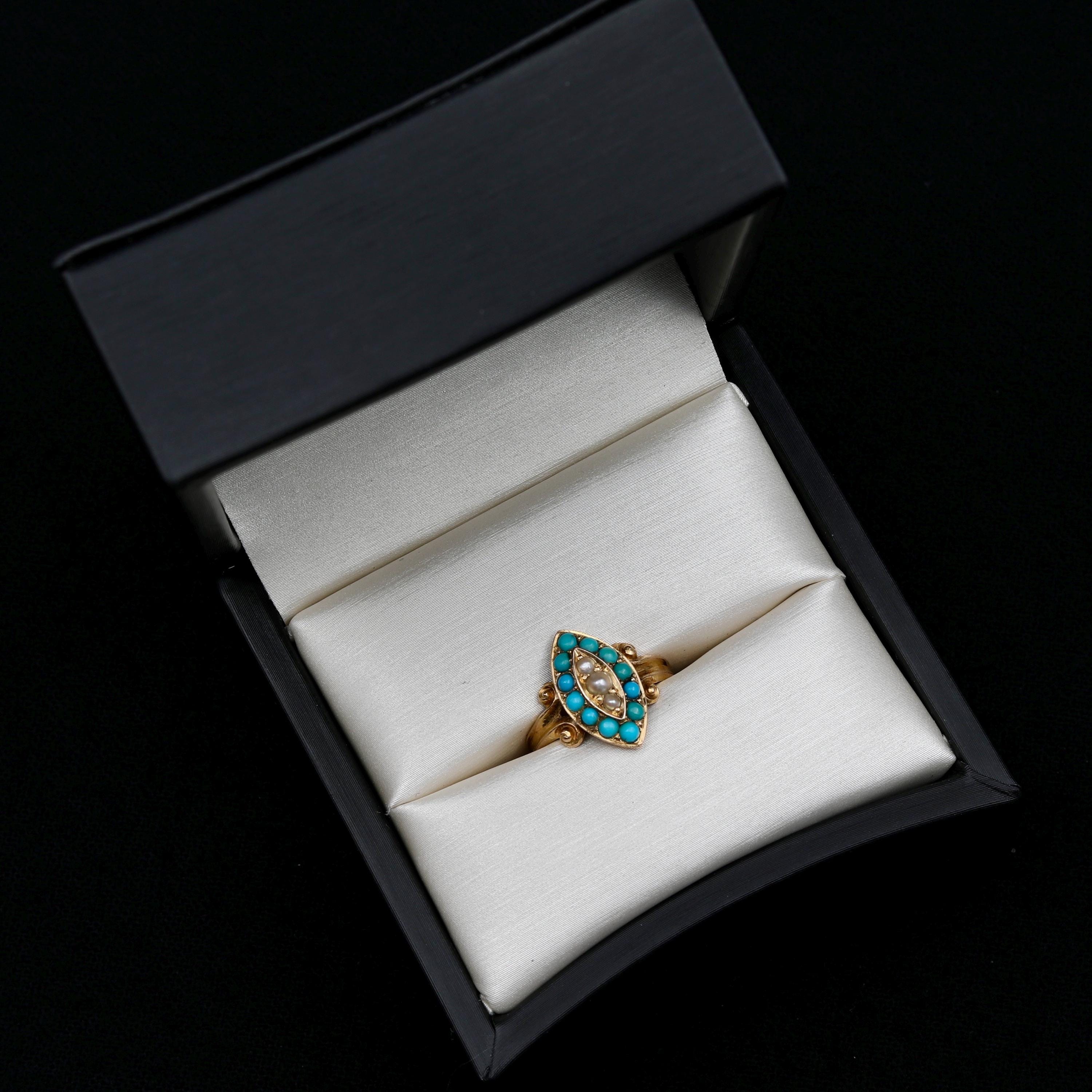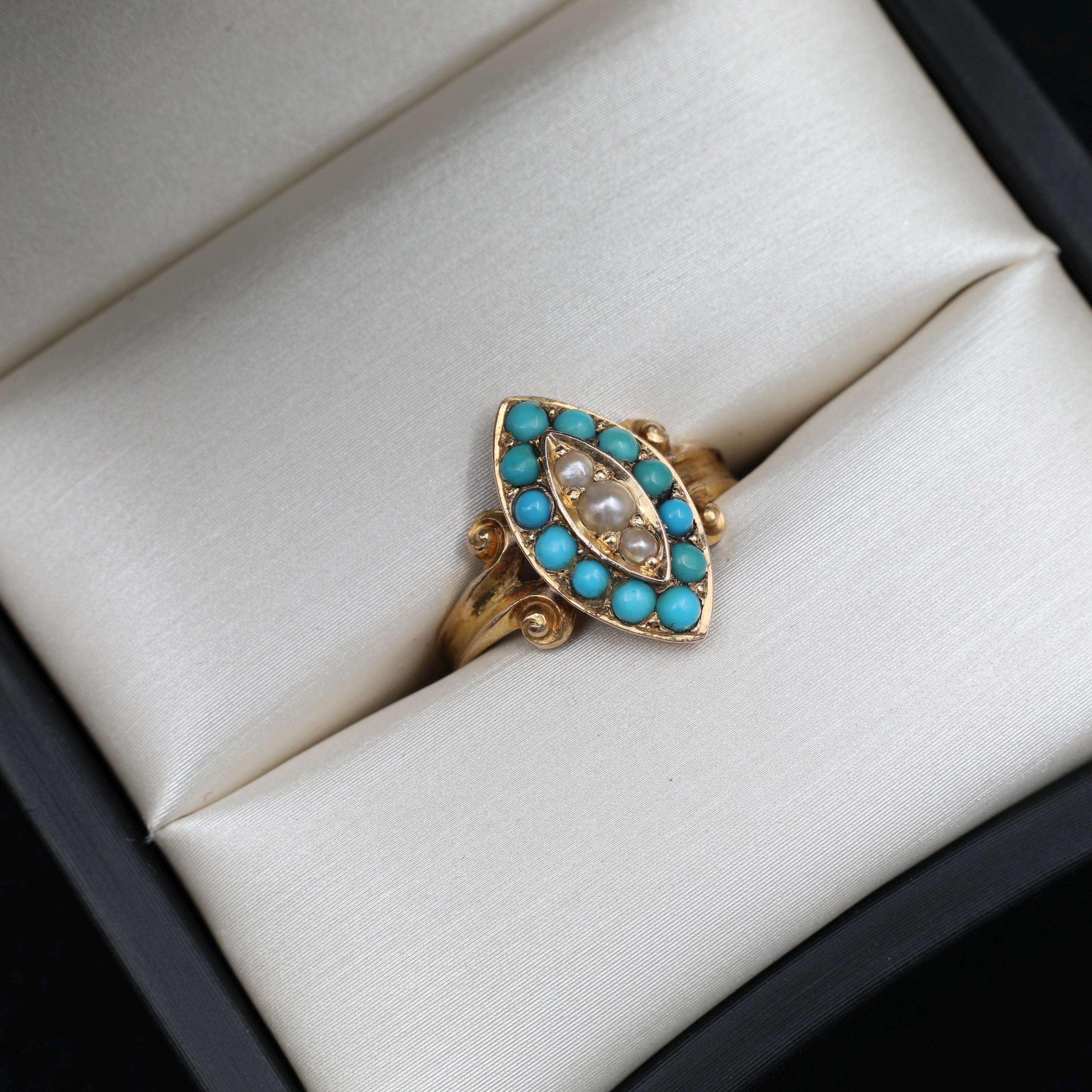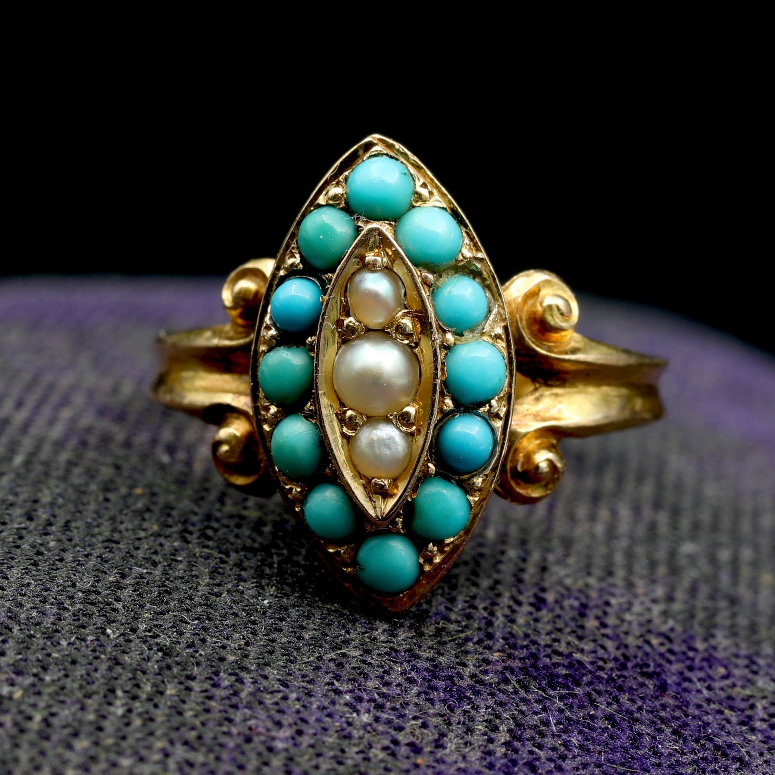 This charming turquoise and pearl solid gold navette ring is so cheery. Topped with a navette marquise shape, natural bright cabochon turquoise and pearls pop down the center of this colorful ring. The Victorians loved turquoise and this 15k gold ring would make a perfect fine jewelry birthstone gift for those with December birthdays. Currently a size 5 3/4, can be resized.