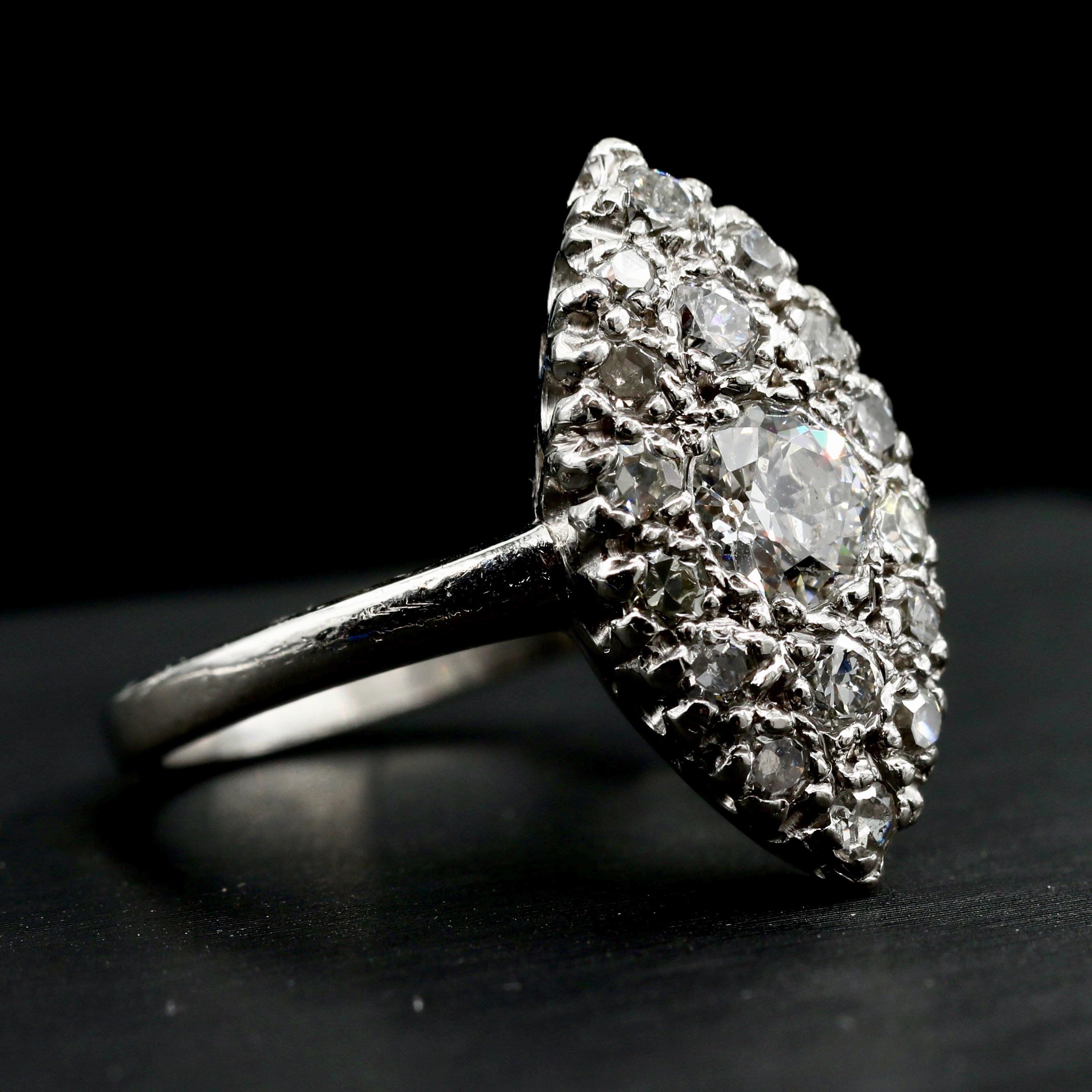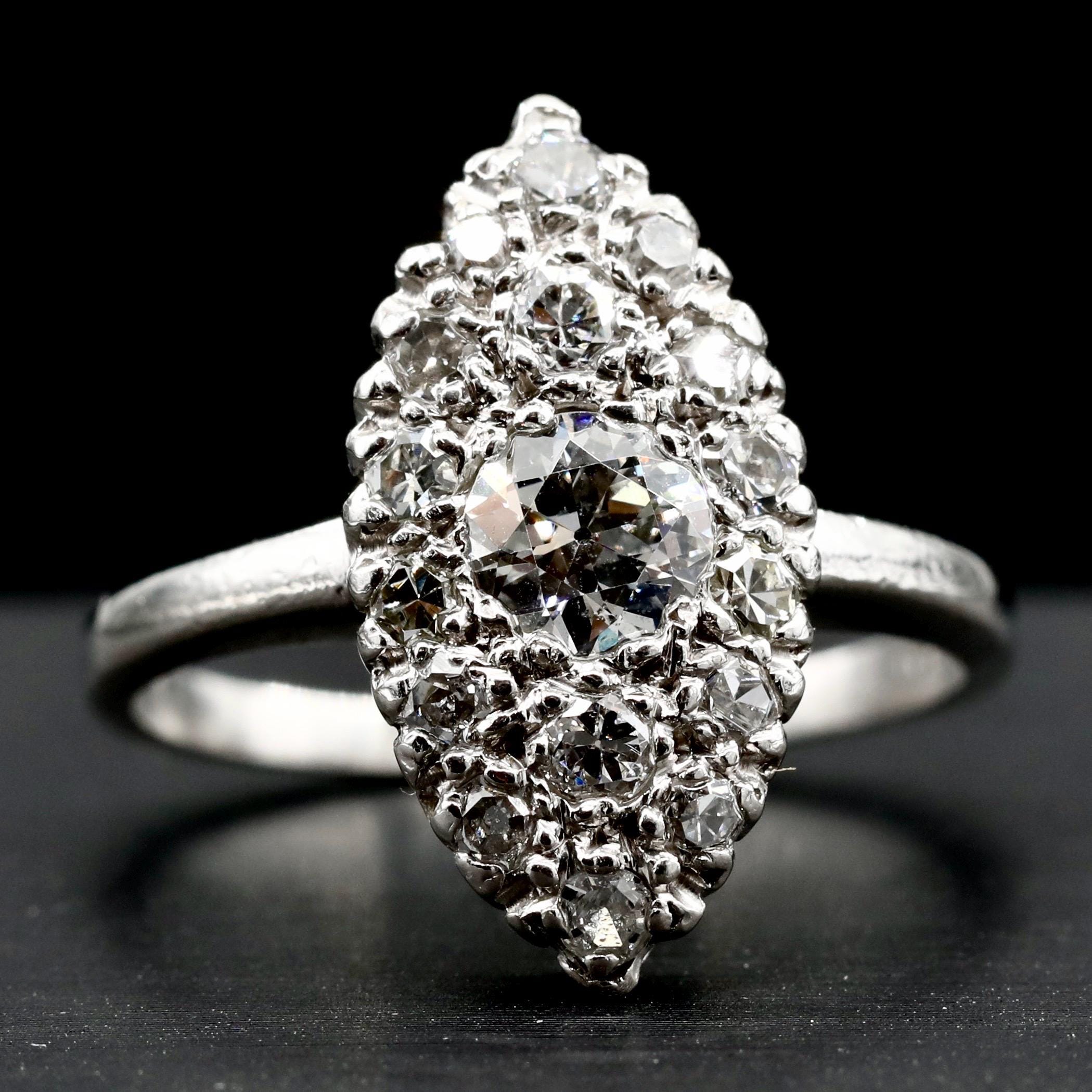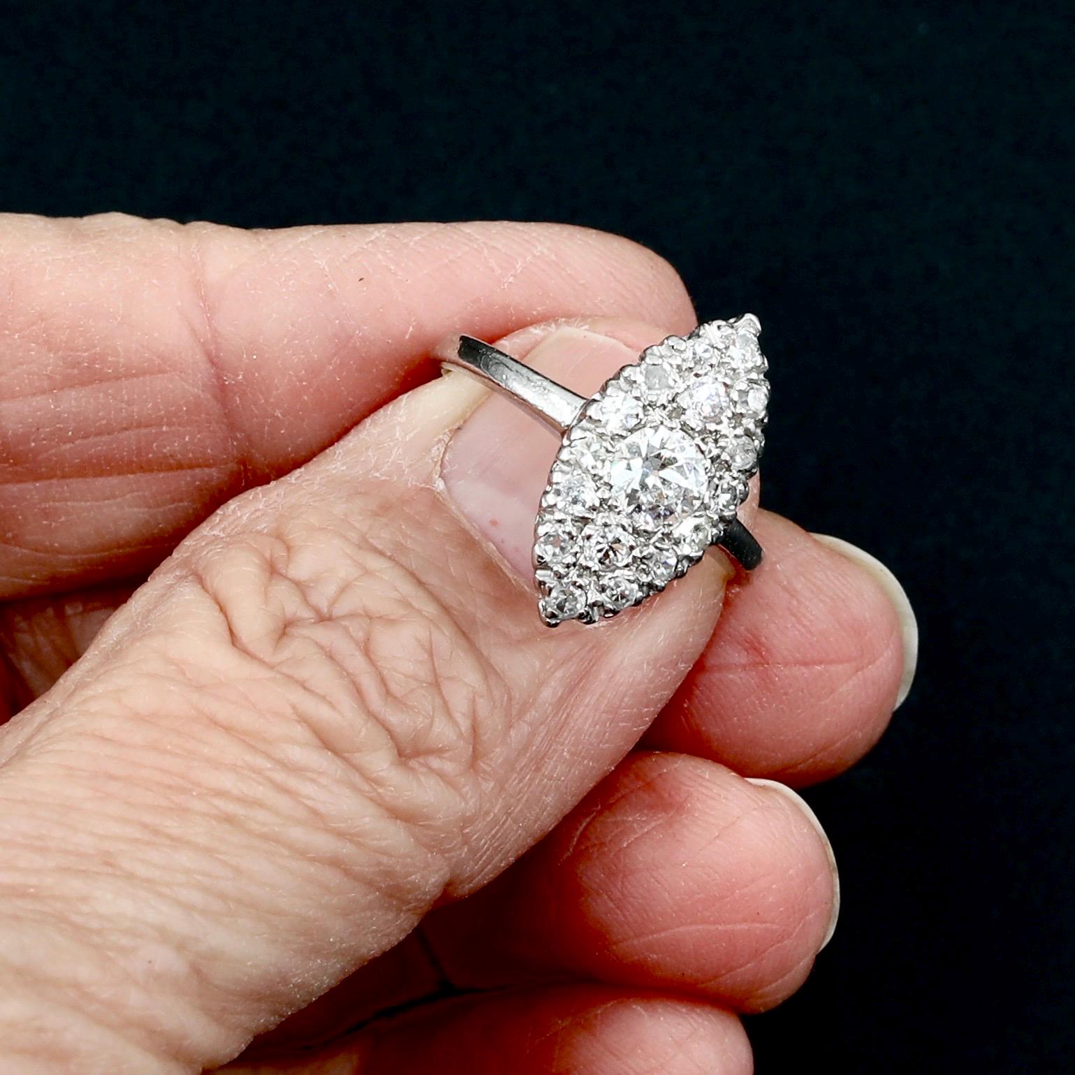 A breathtaking Edwardian navette ring in solid platinum, set with over a carat of luminous old European and single-cut diamonds. Each facet catches the light with antique brilliance, echoing the craftsmanship of the early 1900s.