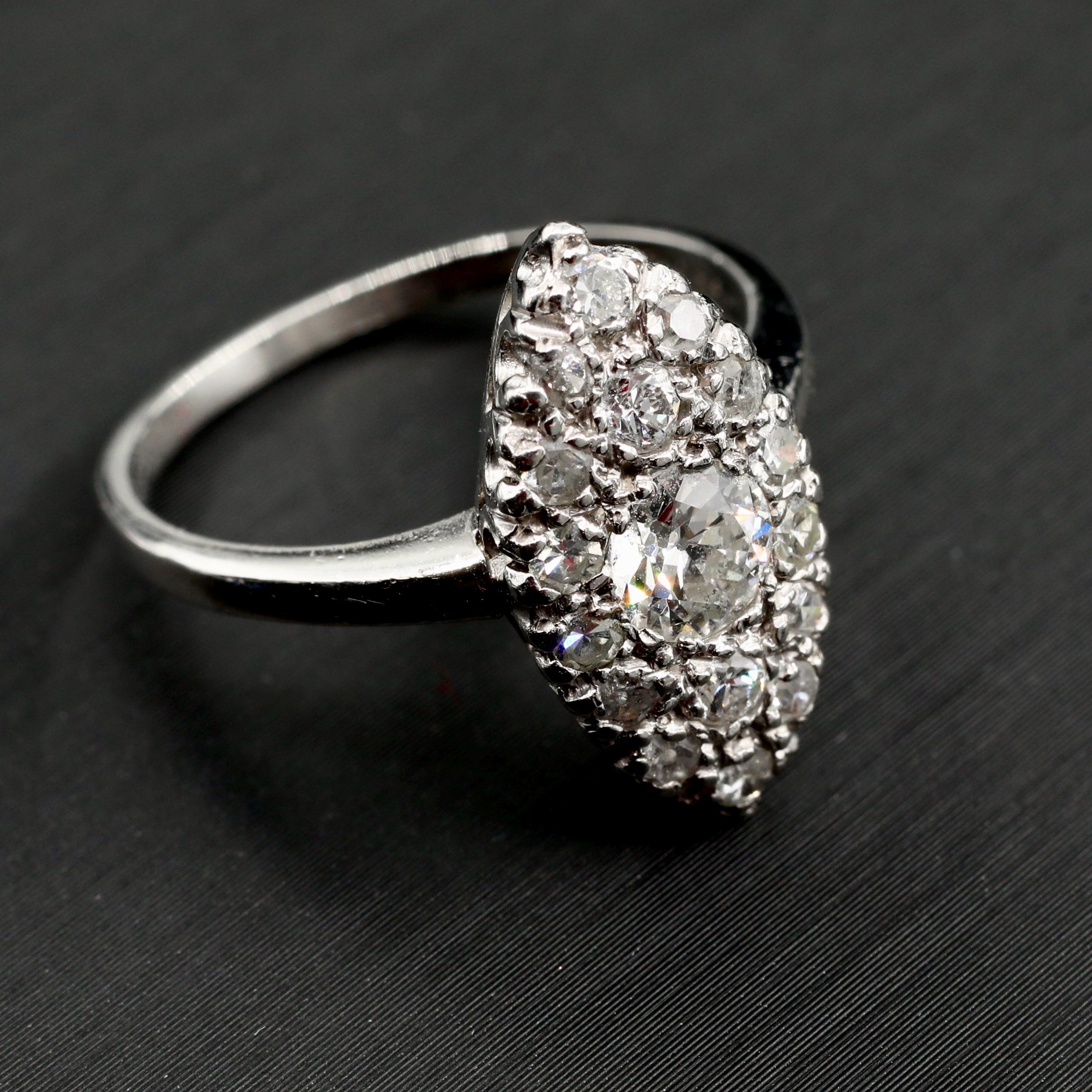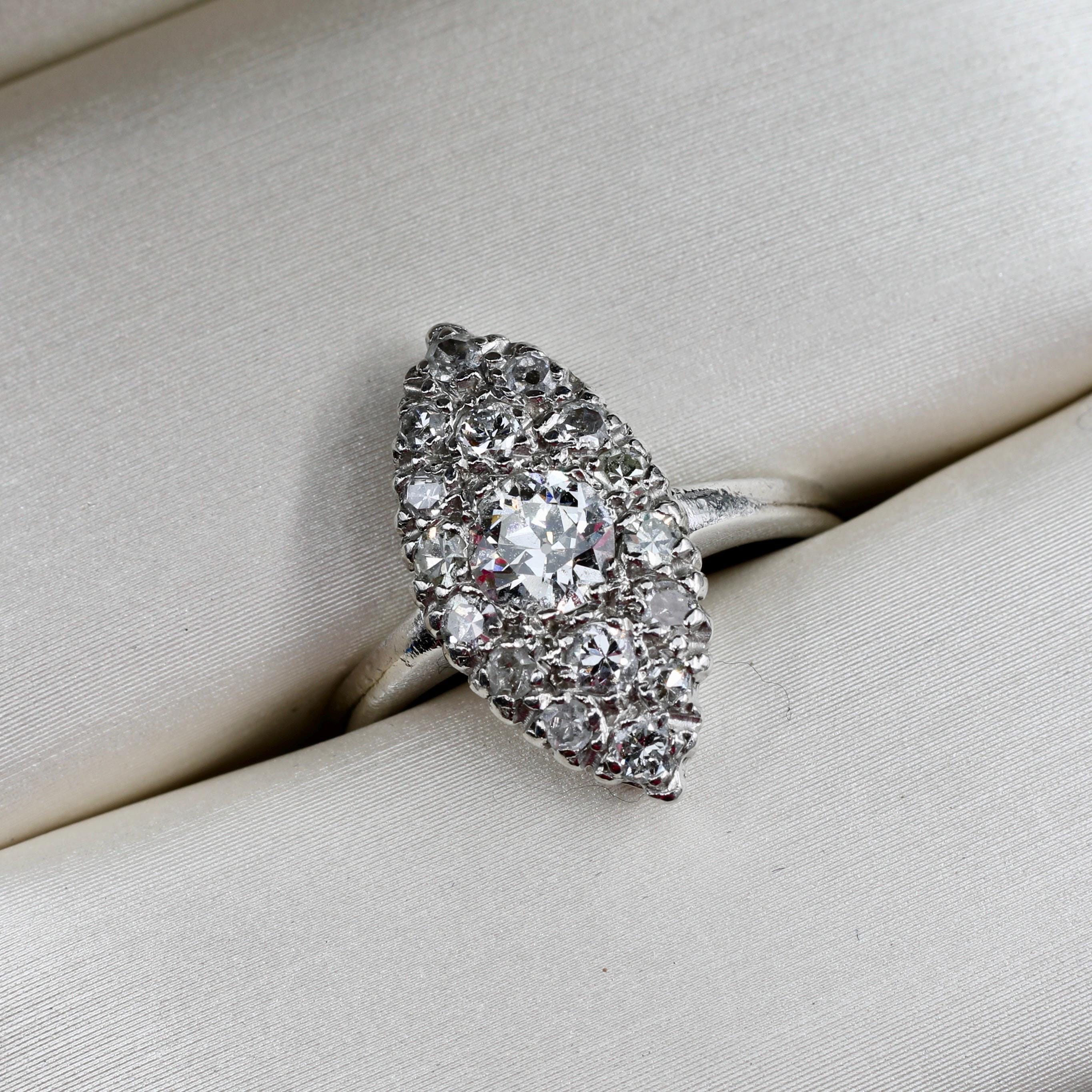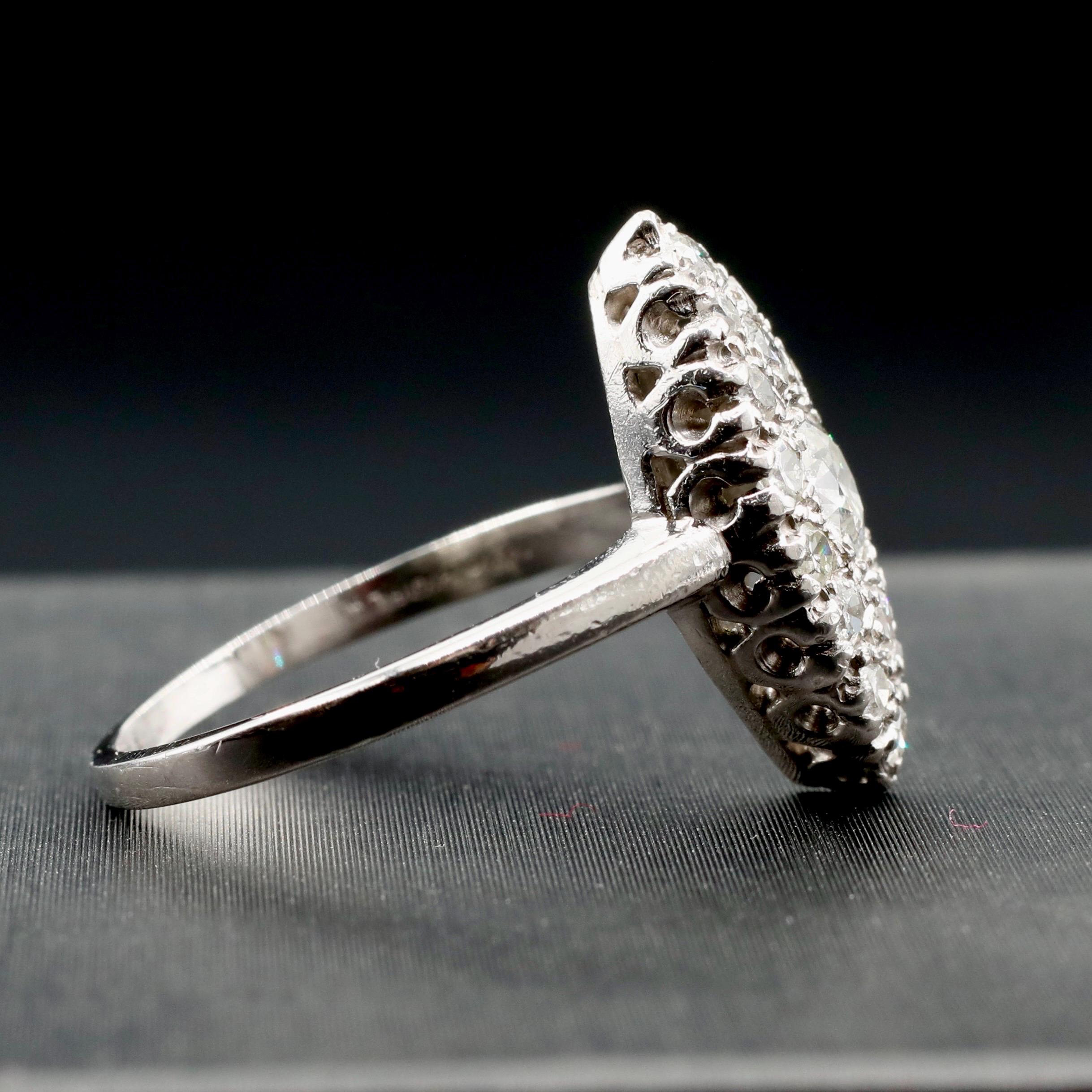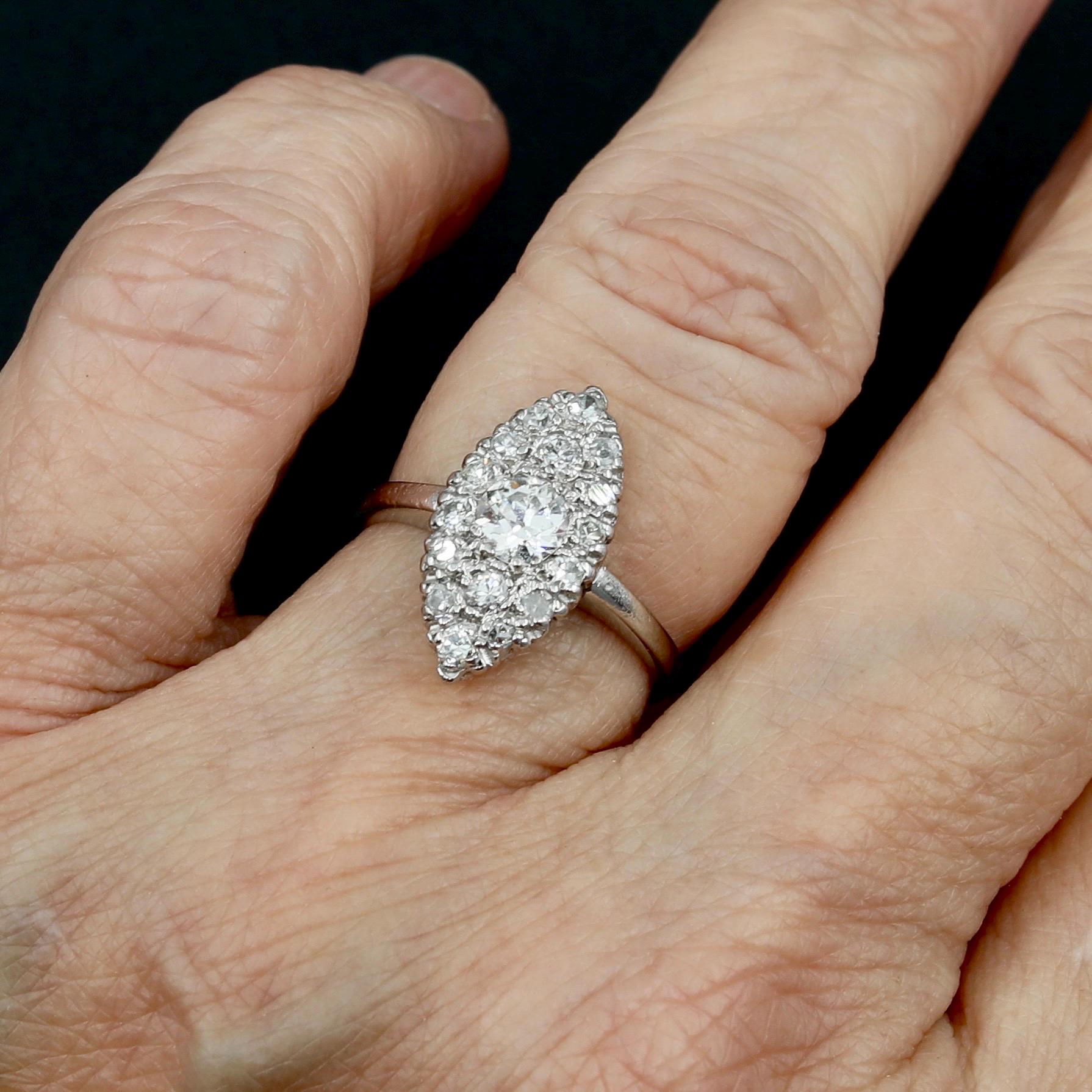 A breathtaking Edwardian navette ring in solid platinum, set with over a carat of luminous old European and single-cut diamonds. Each facet catches the light with antique brilliance, echoing the craftsmanship of the early 1900s.