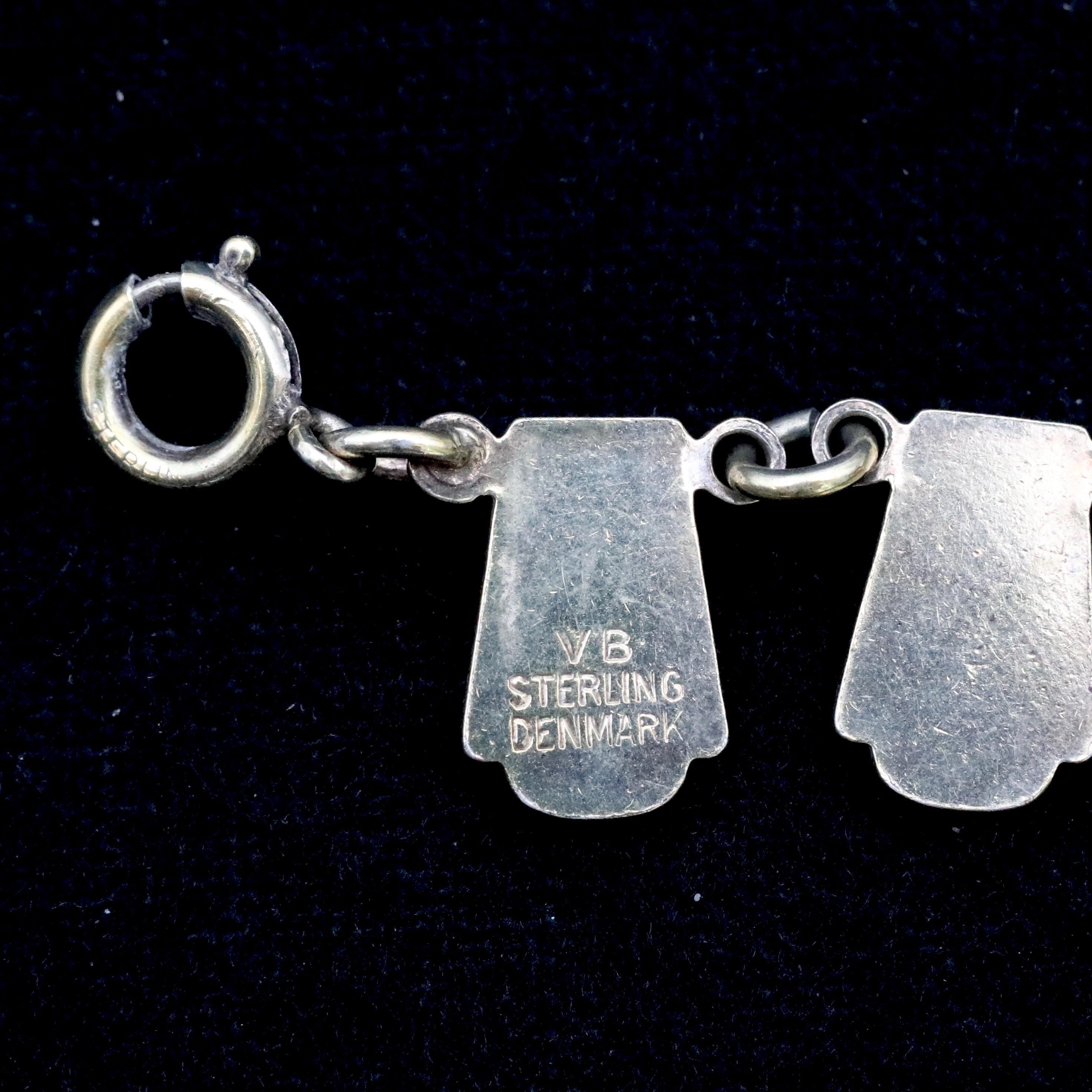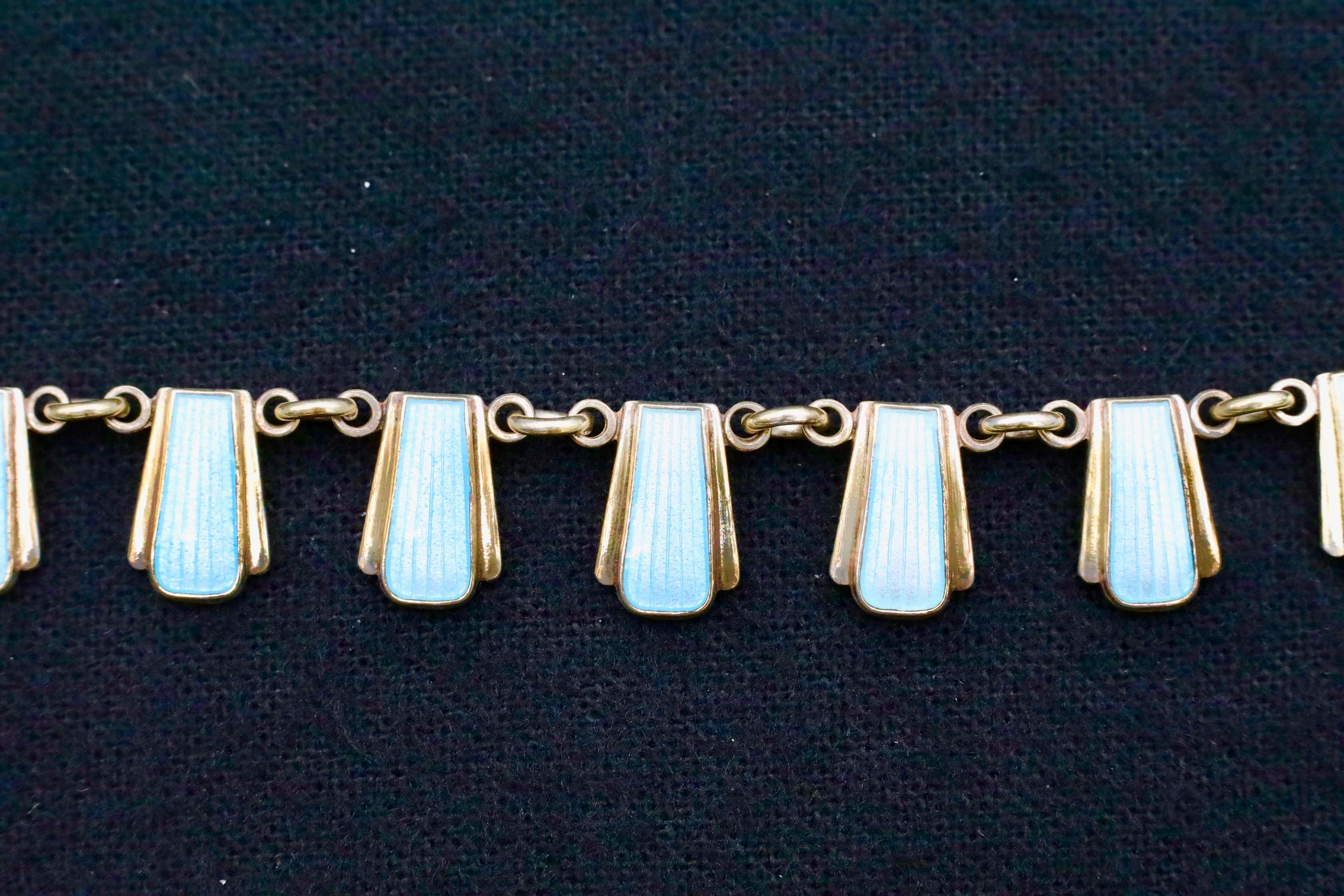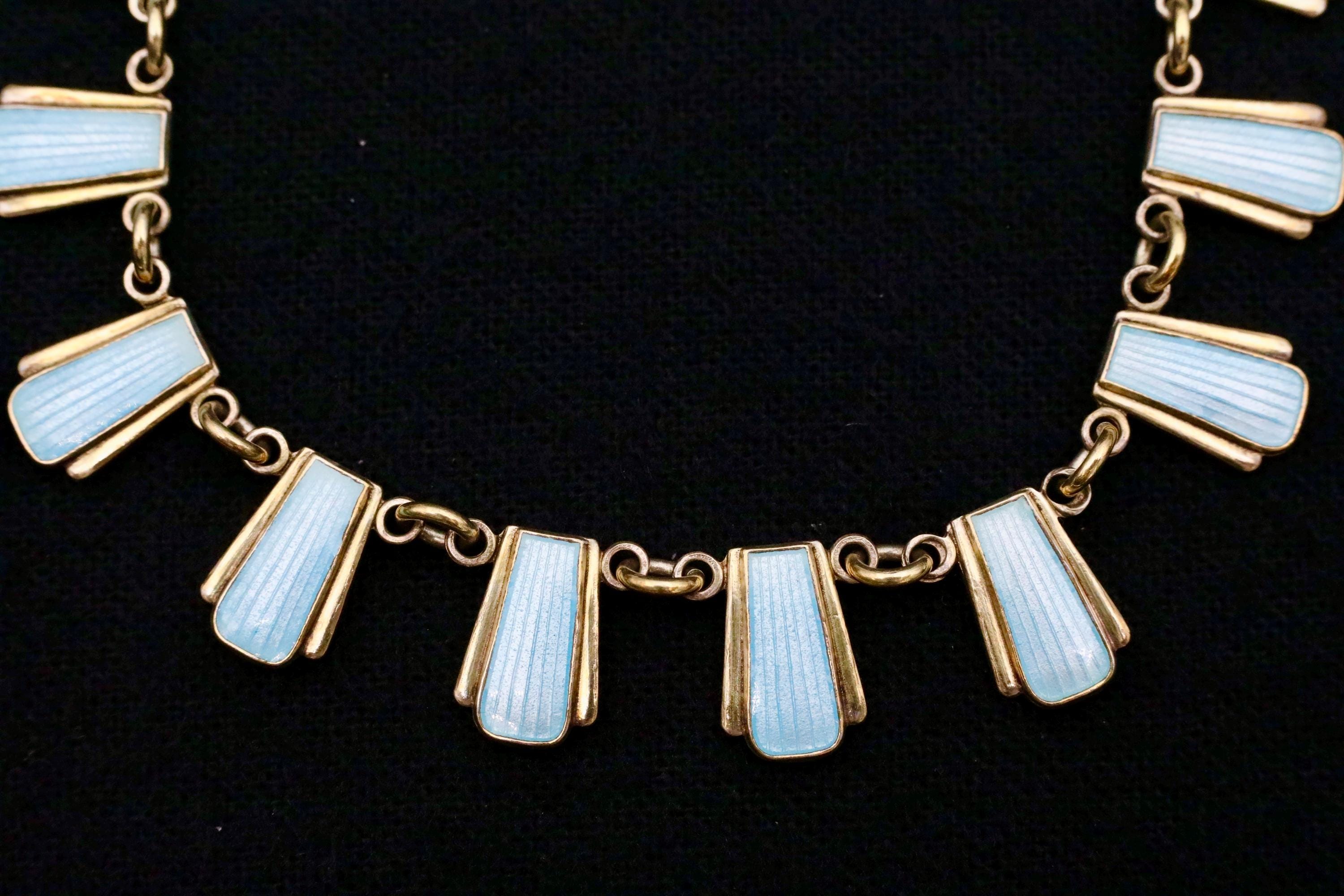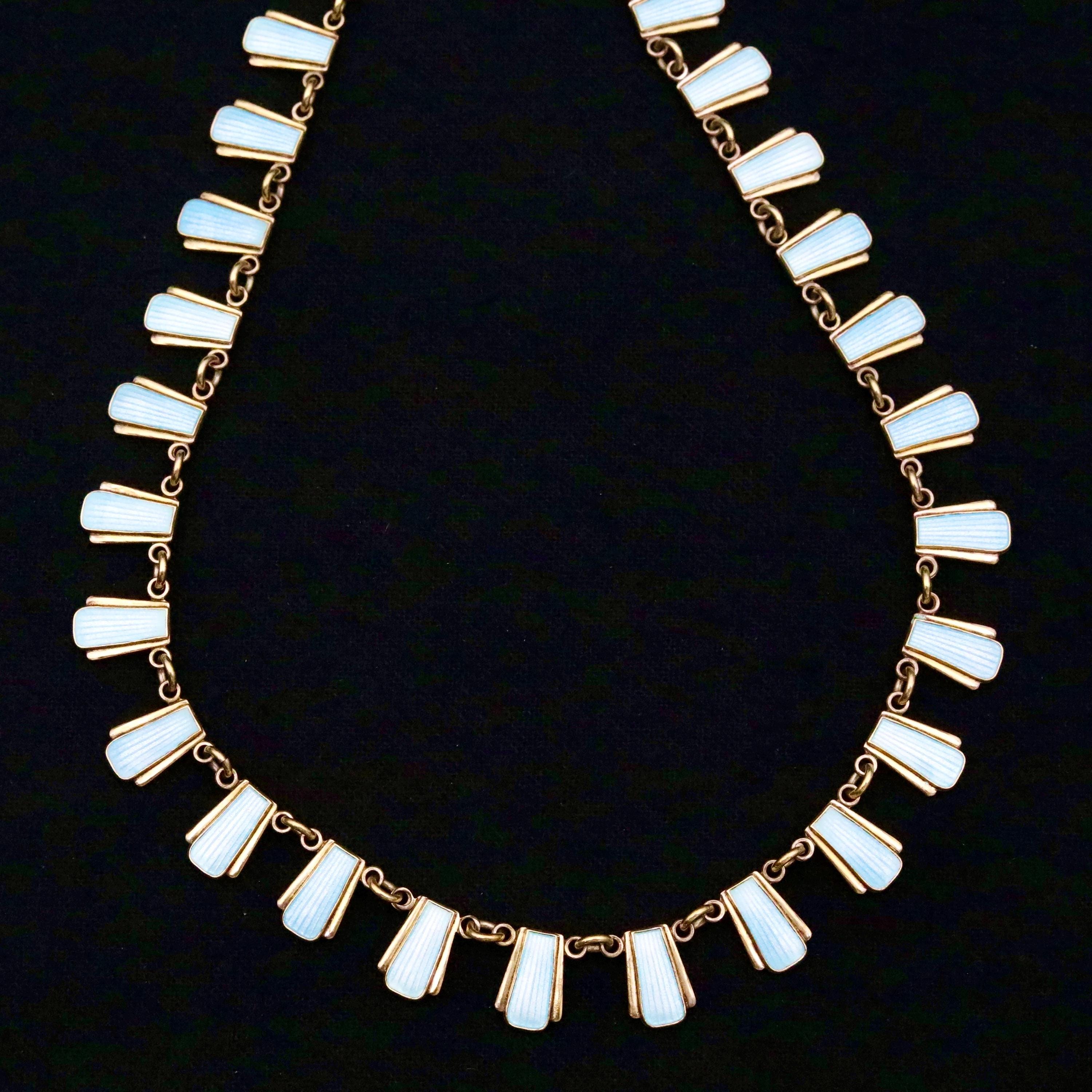 A beautifully crafted guilloché enamel collar necklace by Danish designer Volmer Bahner, known for his precise enameling and clean mid-century aesthetic. The necklace is composed of thirty gently arched links, each finished in light blue enamel over patterned silver and backed with a soft 14k gold wash. The effect is smooth, fluid, and quietly striking. Classic Scandinavian modern design at its best.