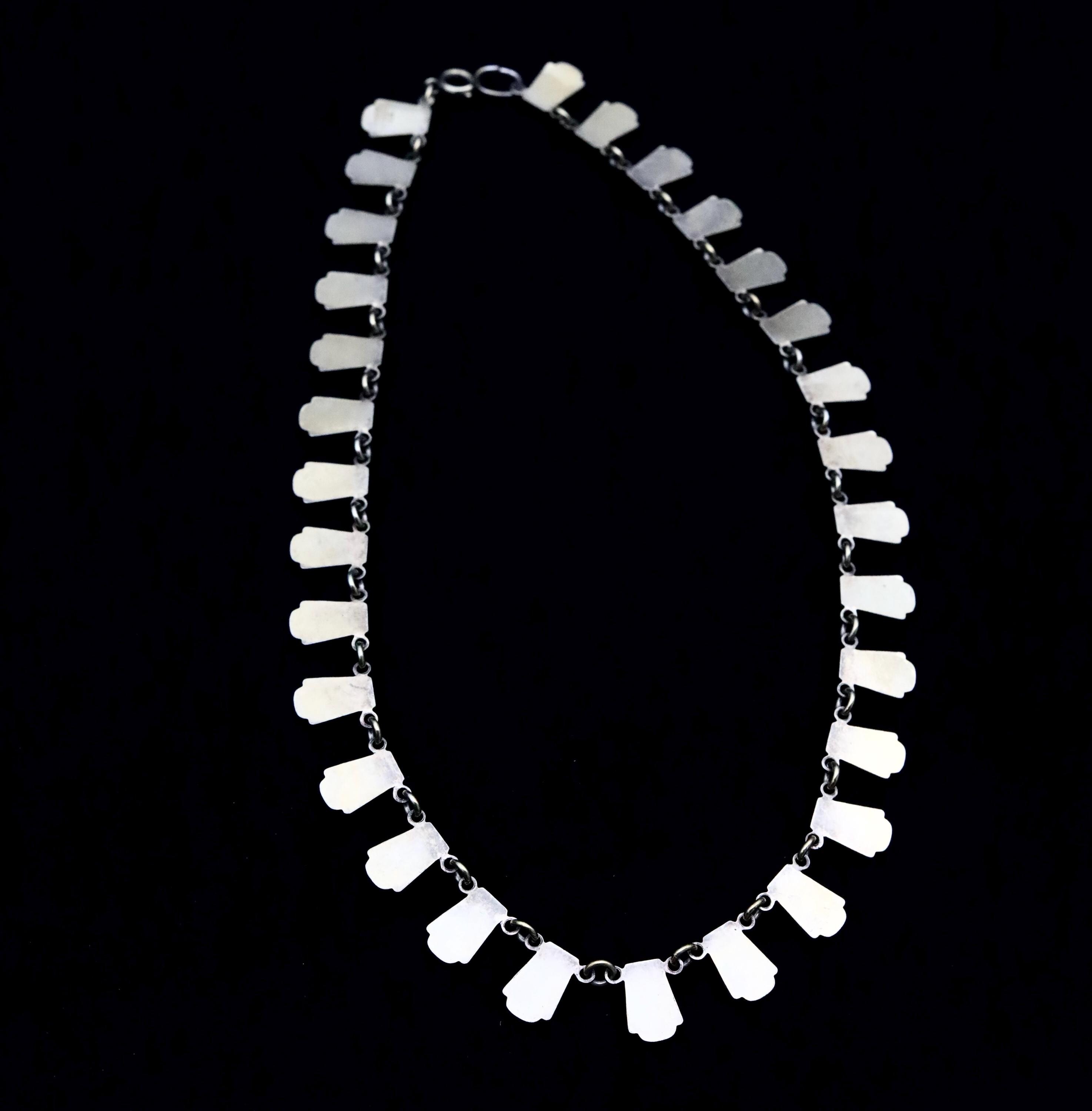 The collar sits elegantly around the neck at 16 inches, laying flat and comfortable. The delicate translucence of the enamel reveals the engine-turned pattern beneath, giving the necklace a subtle shimmer in the light. Fully marked for Bahner and sterling silver.