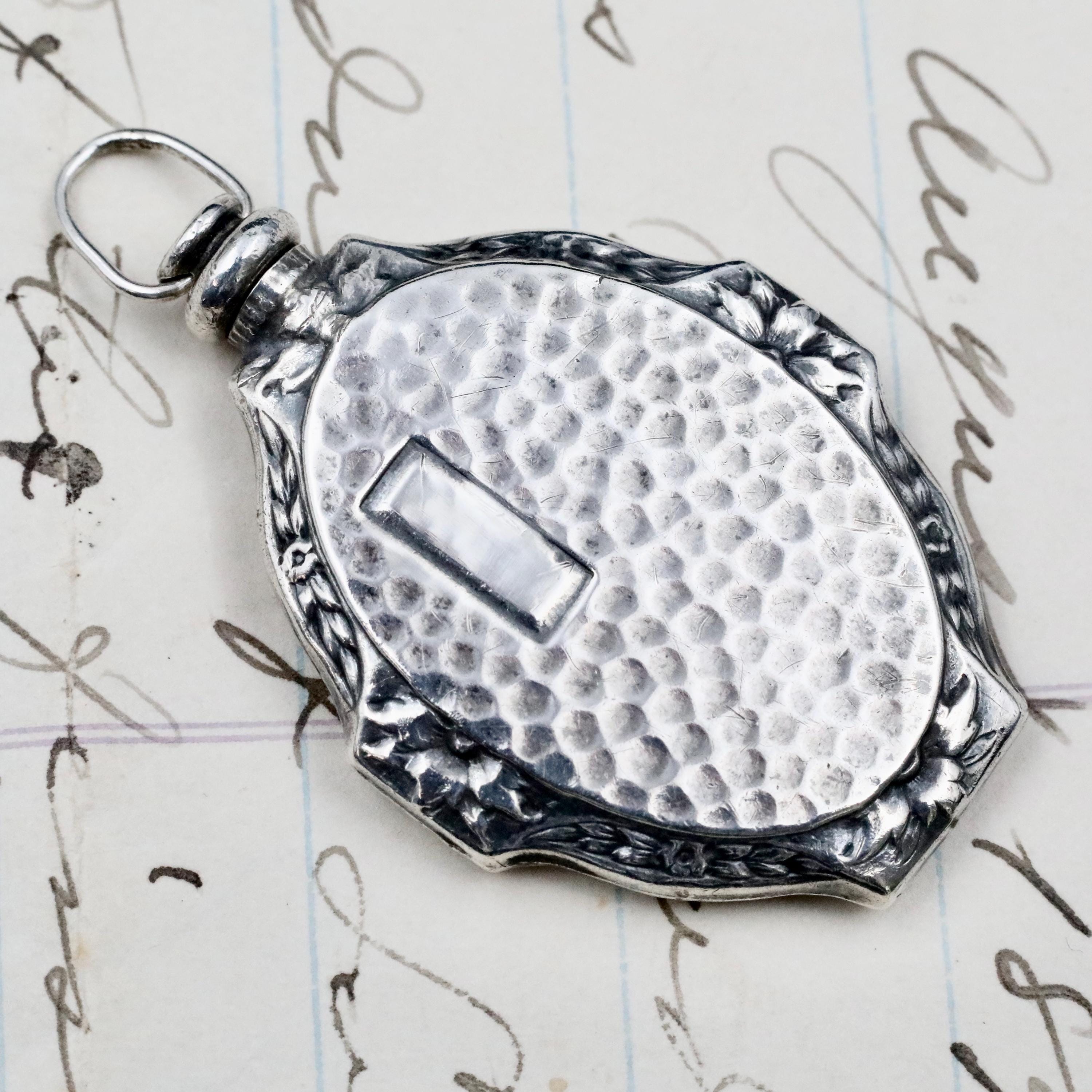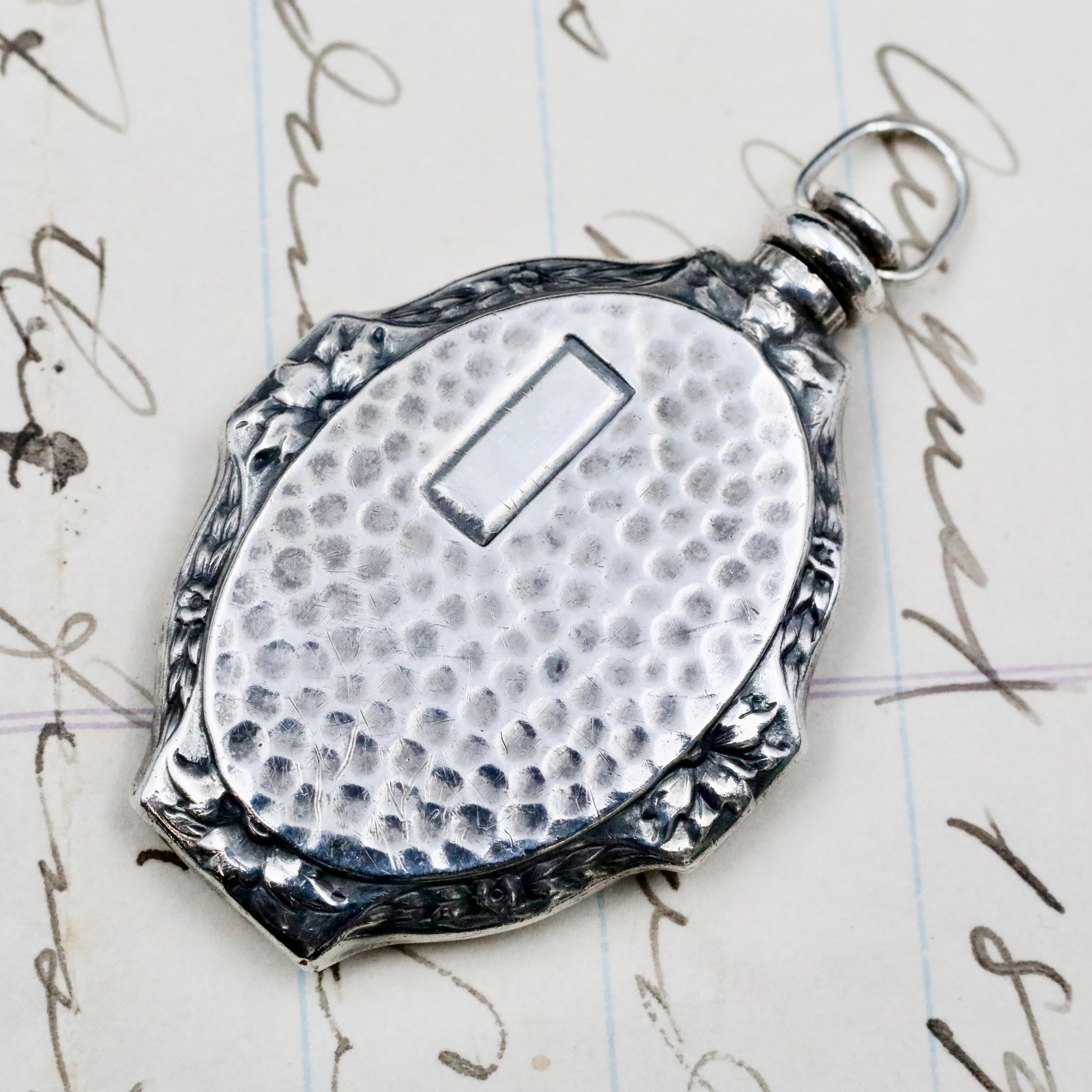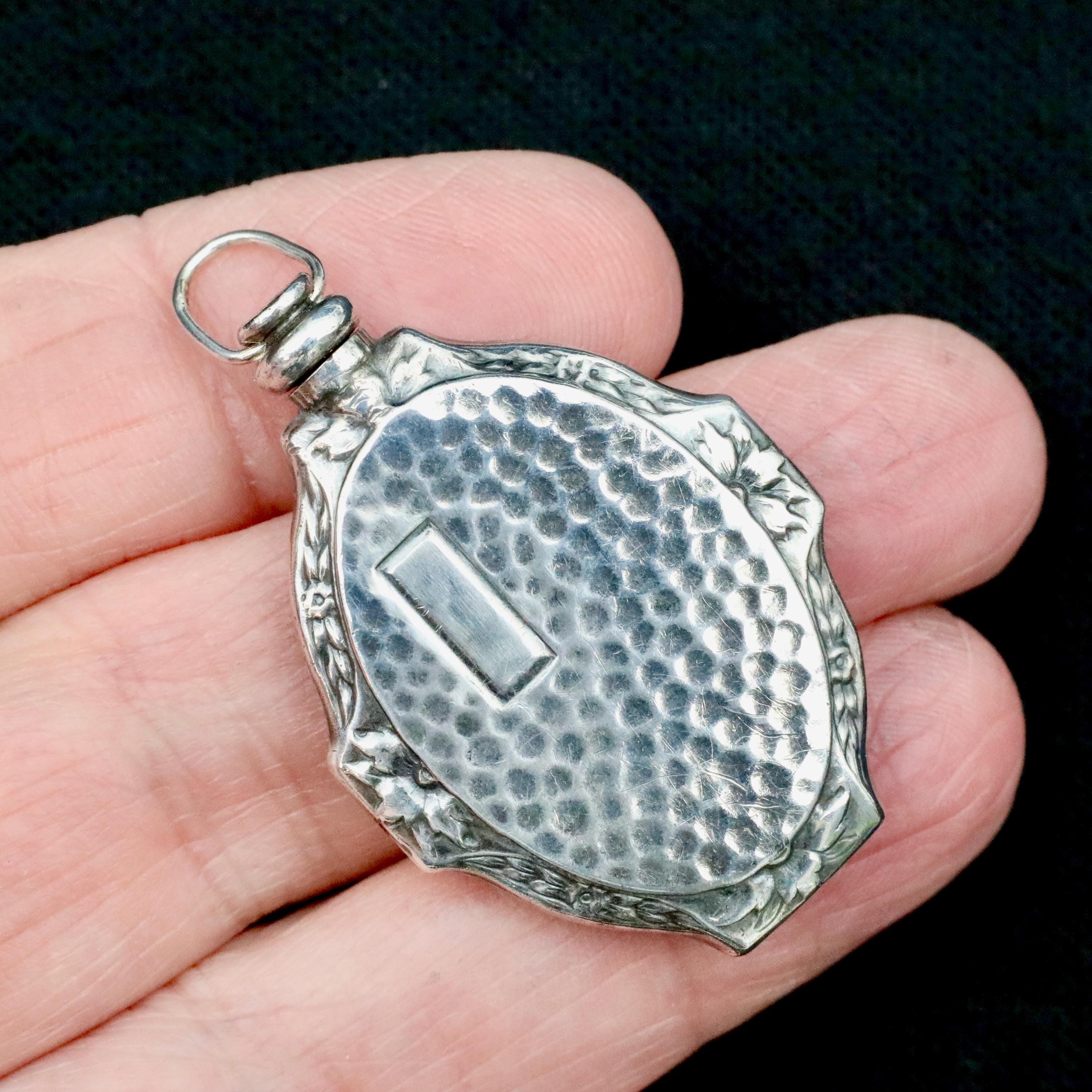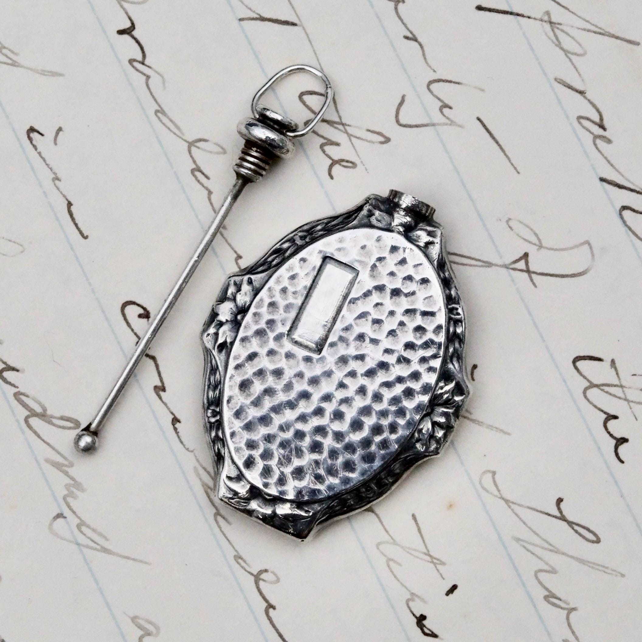 A late Victorian chatelaine perfume bottle crafted in solid sterling silver, dating to the late 19th century. These small scent bottles were designed to be worn at the waist or on a chain, personal objects meant to hold fragrance close throughout the day.