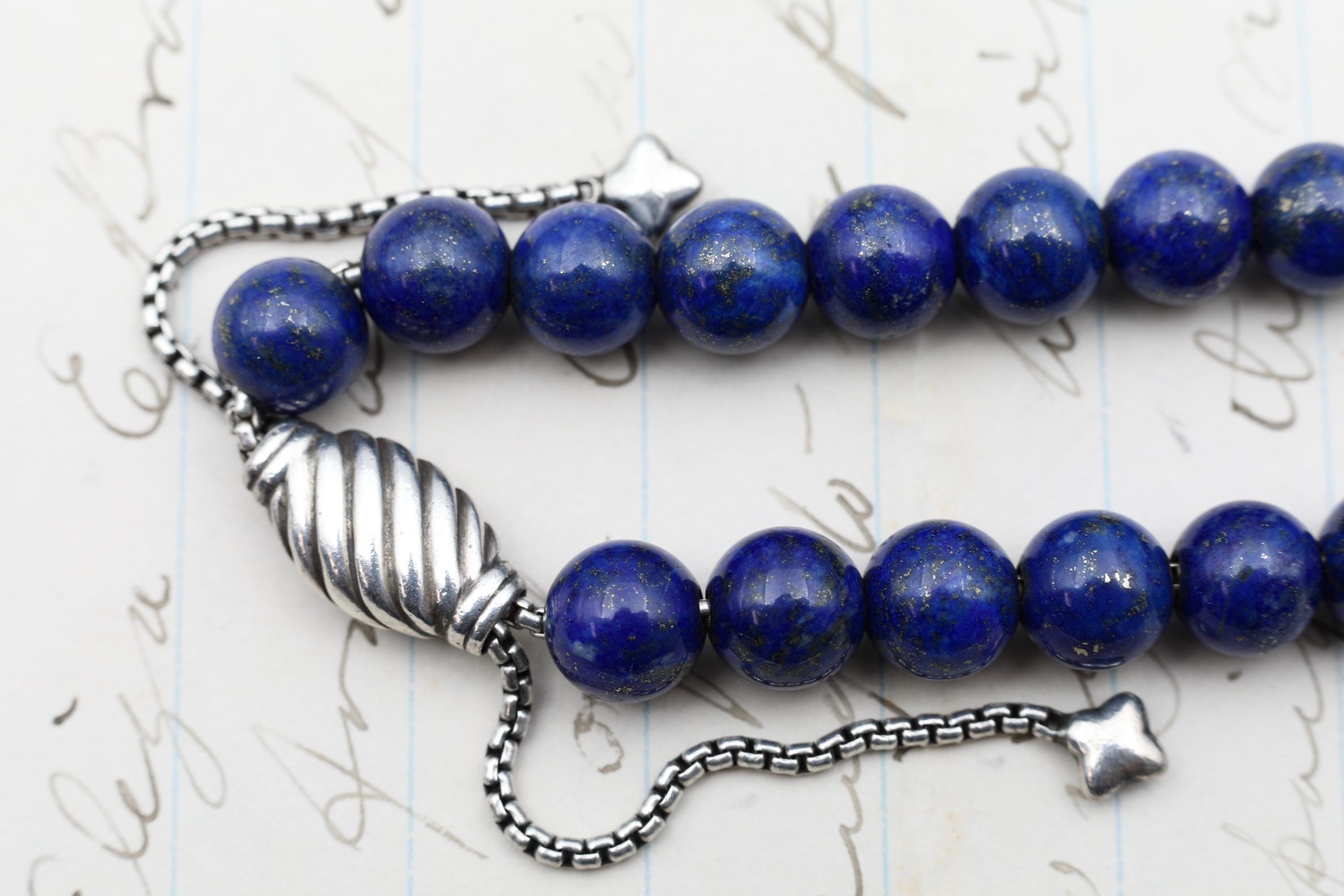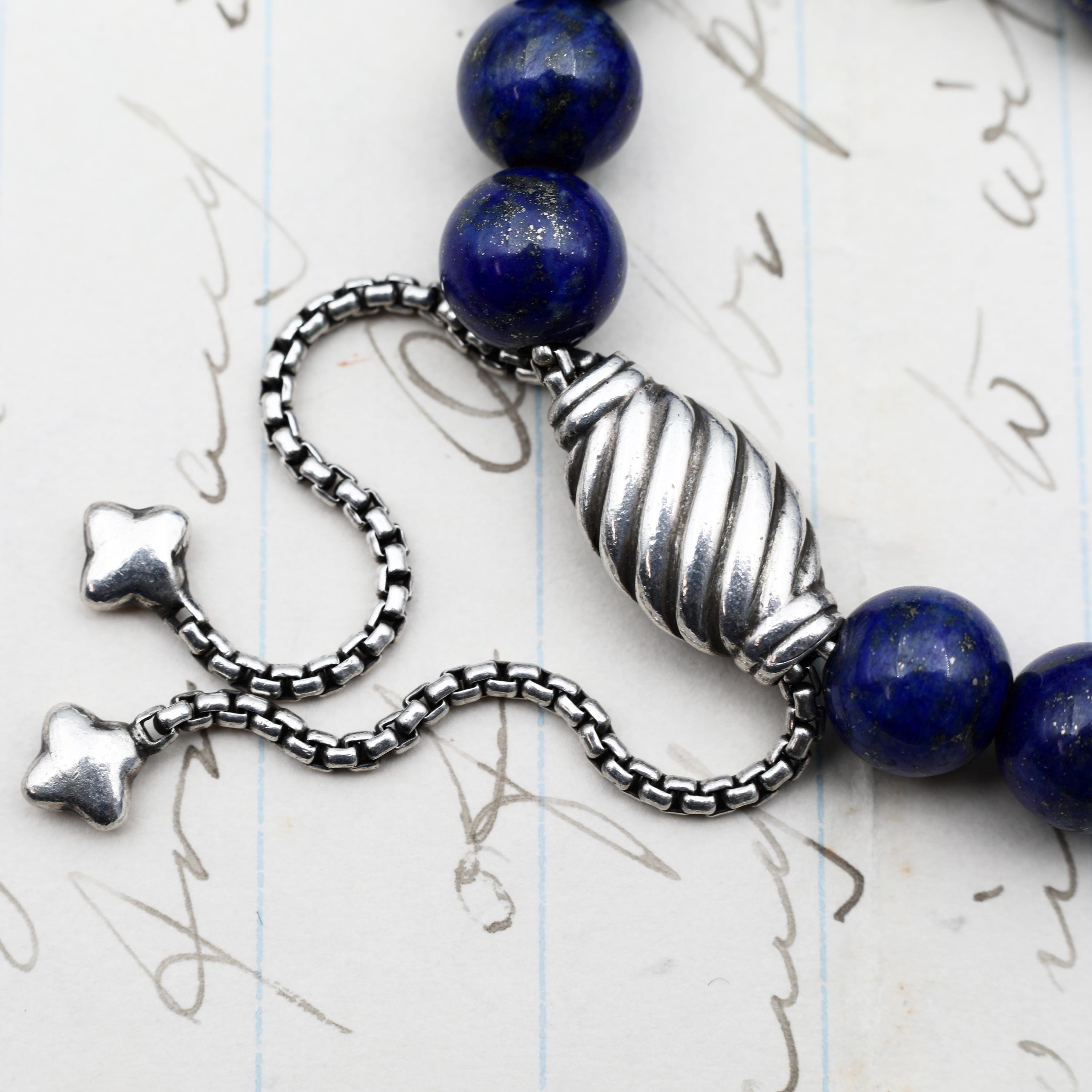 This vintage David Yurman lapis lazuli Spiritual Beads bracelet blends rich gemstone color with the iconic silver detail Yurman is known for. Deep blue lapis beads with natural gold flecking are paired with sterling silver box chain and an adjustable slider clasp, making it easy to wear alone or stacked. Authentic, comfortable, and beautifully designed, a classic DY piece.