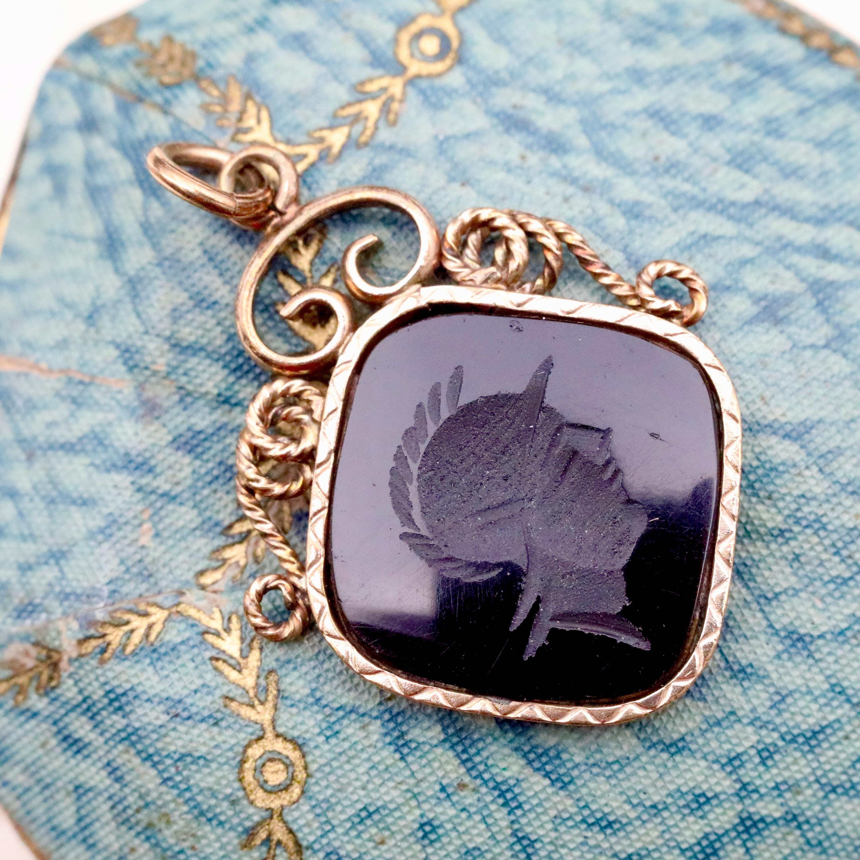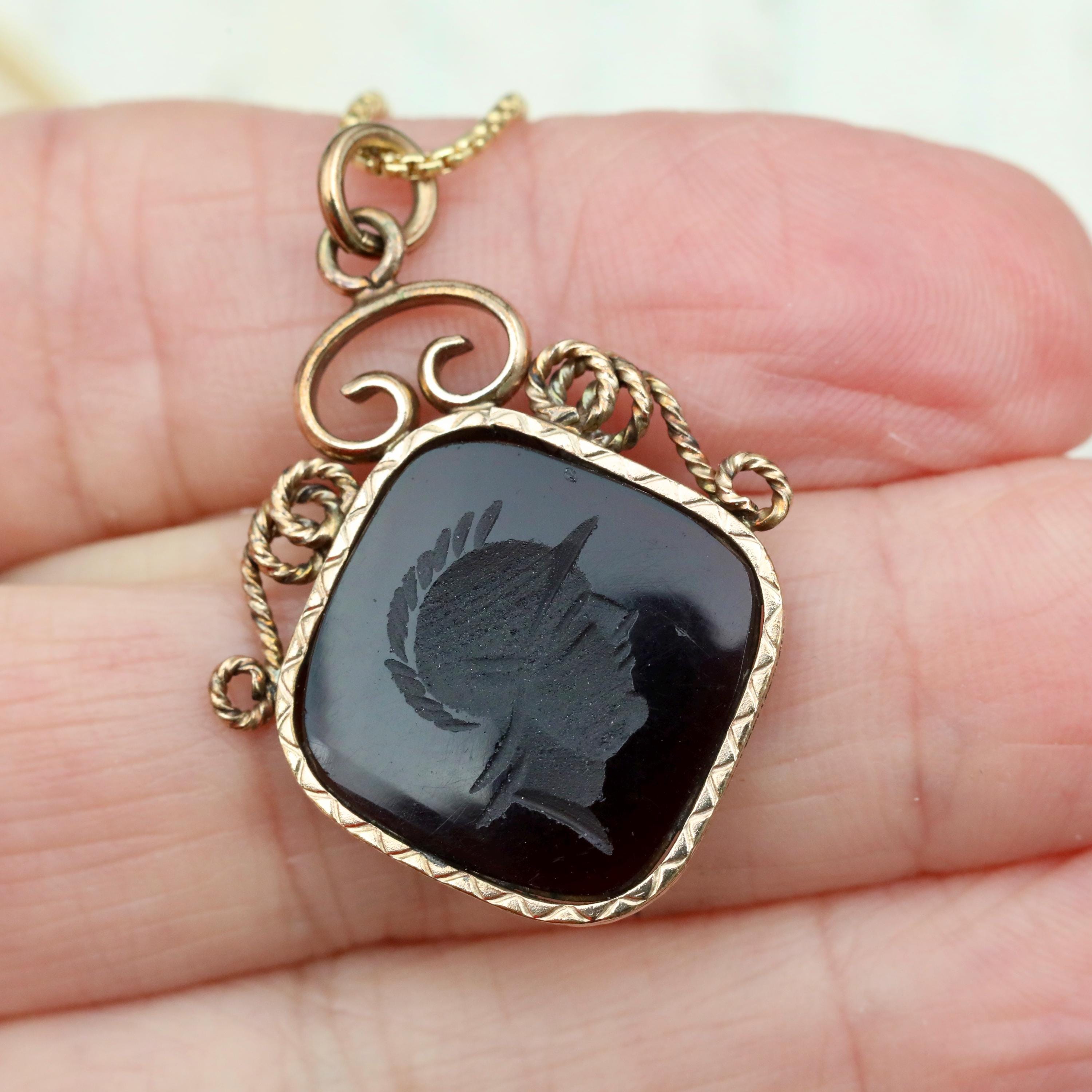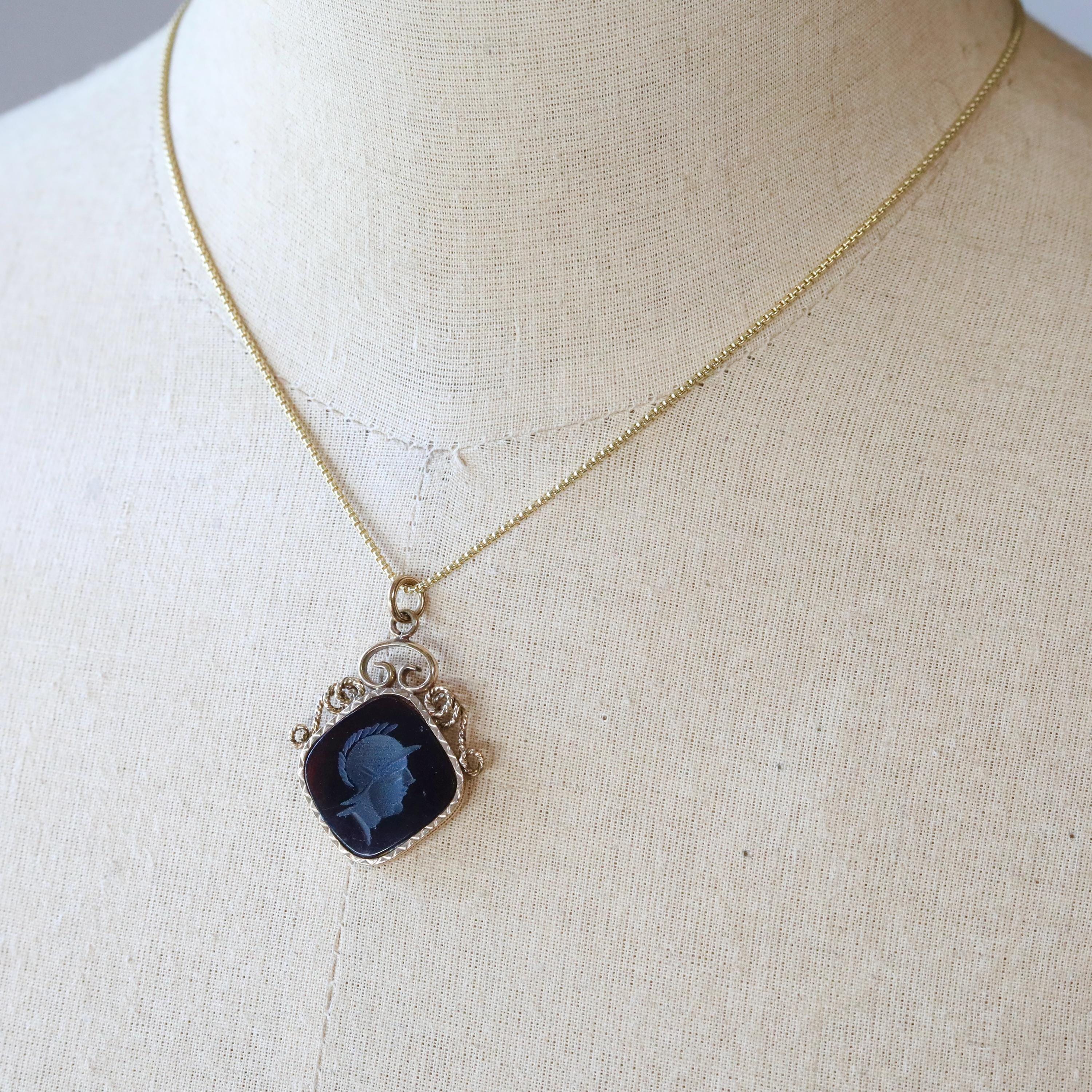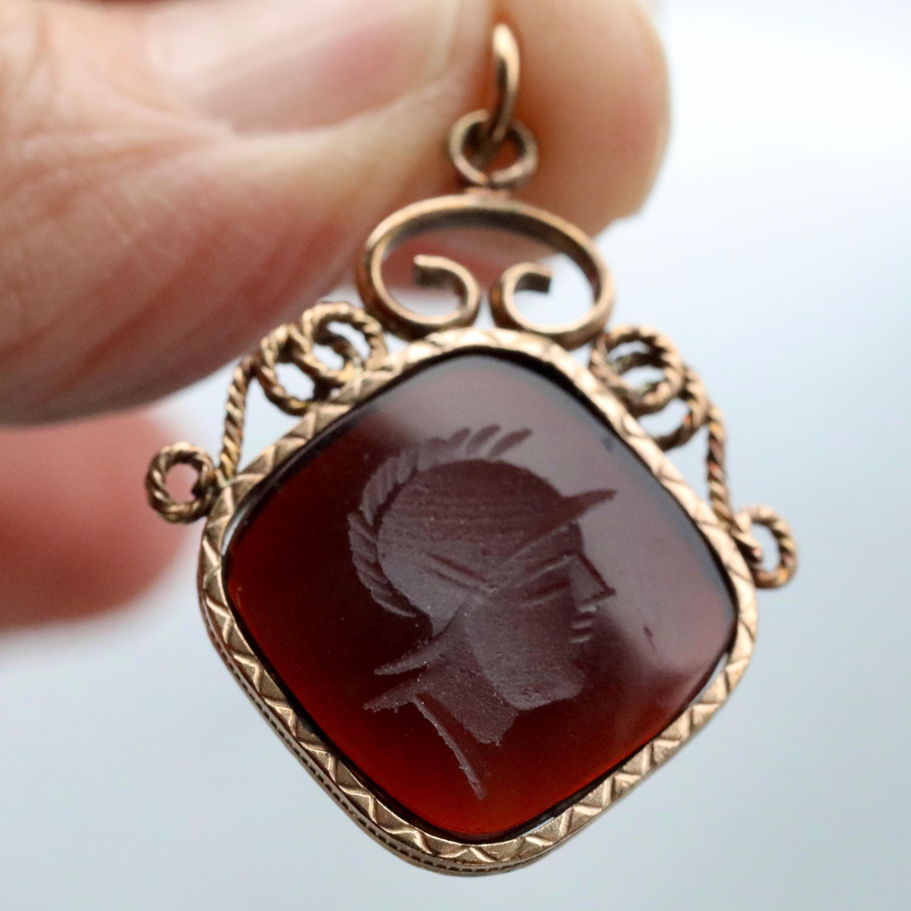 A beautifully preserved Victorian carnelian intaglio pendant, carved with the profile of a Roman soldier, a classic symbol of strength, protection, and virtue in 19th-century jewelry. The rich dark carnelian appears nearly black until held to the light, where it glows a deep ember orange, a telltale sign of quality antique carnelian.