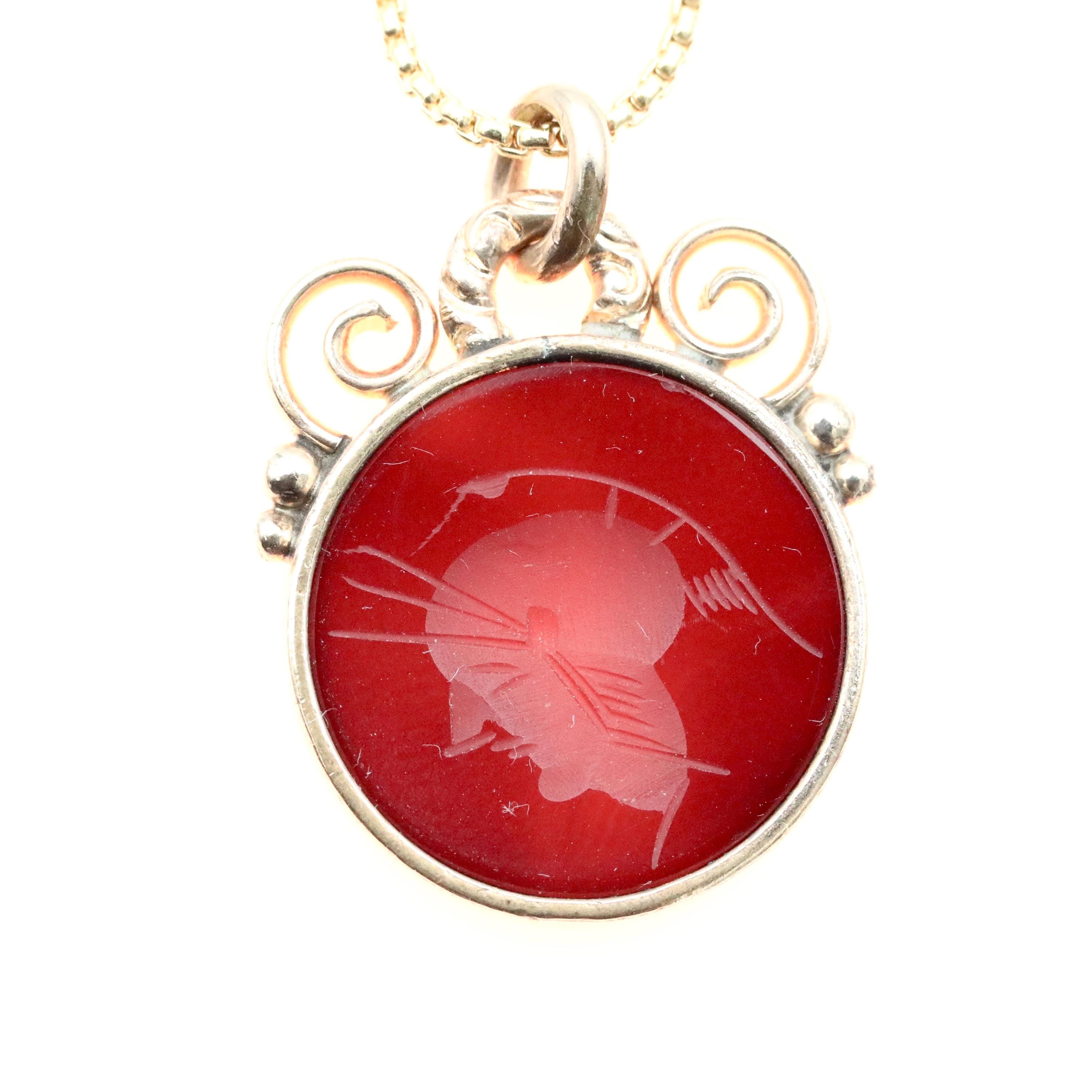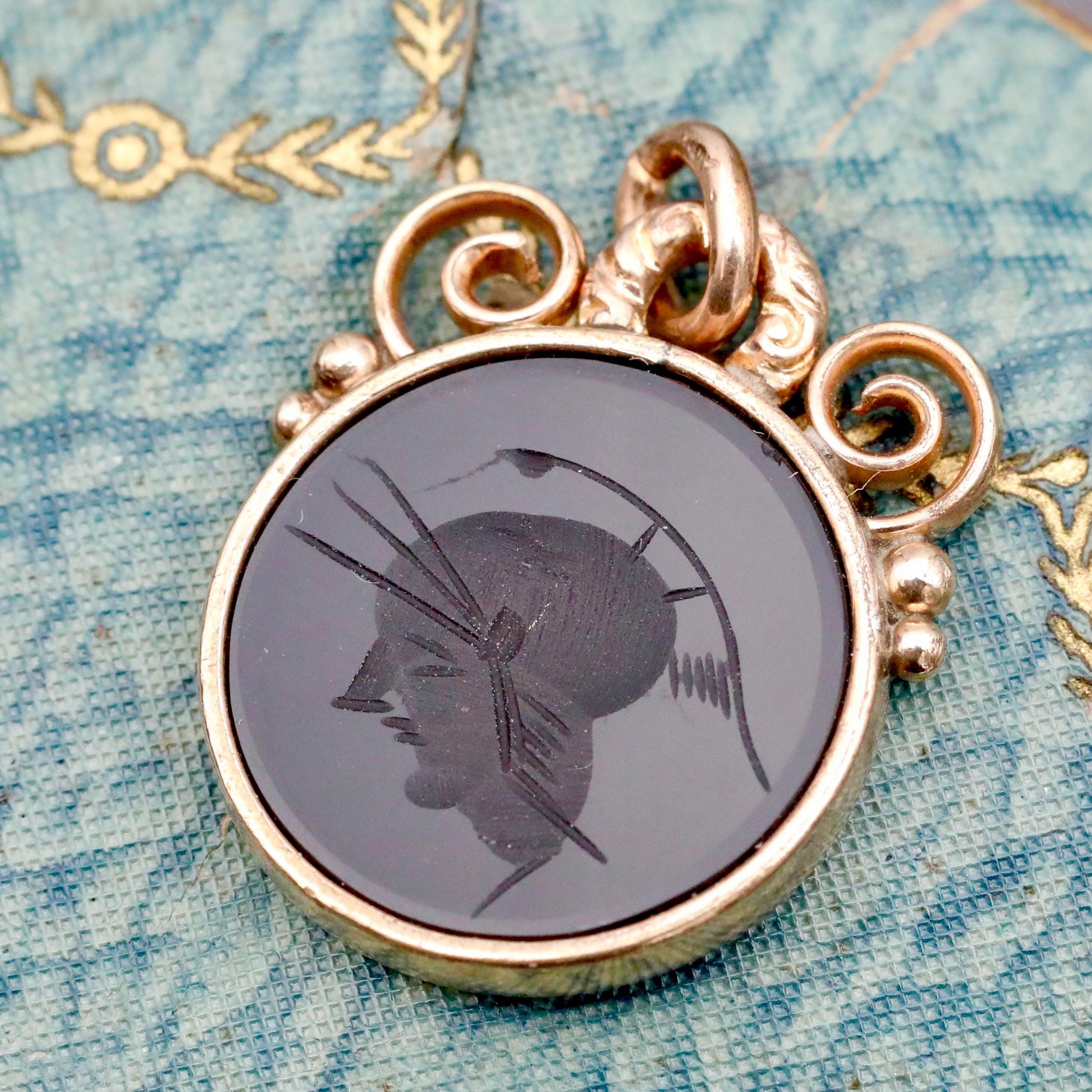 Popular throughout the Victorian era, this carnelian and gold-filled intaglio pendant features a finely carved profile of a Roman soldier. The Victorians adored classical imagery and often incorporated ancient motifs into their jewelry. This antique piece is a true example of that fascination, created purely for adornment.