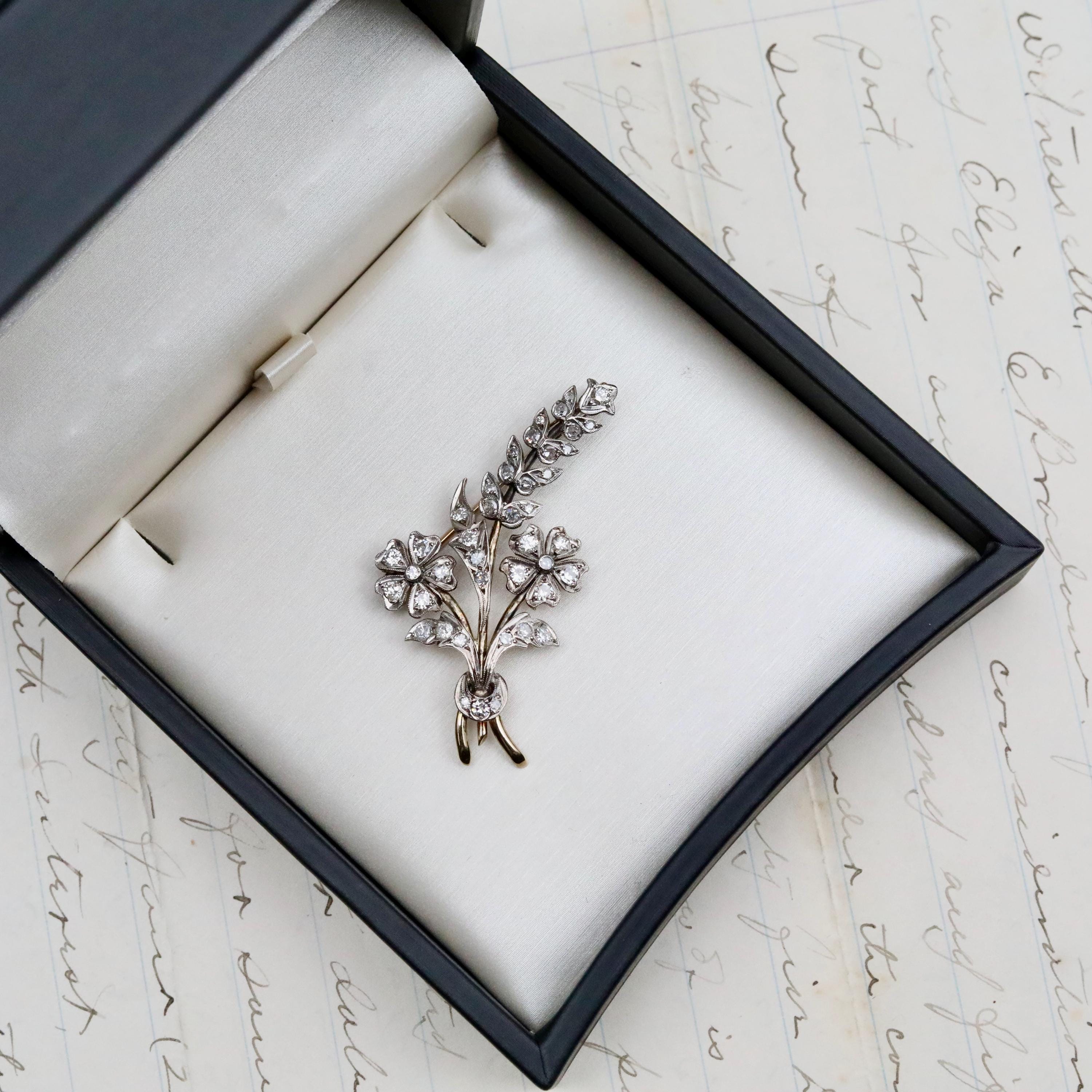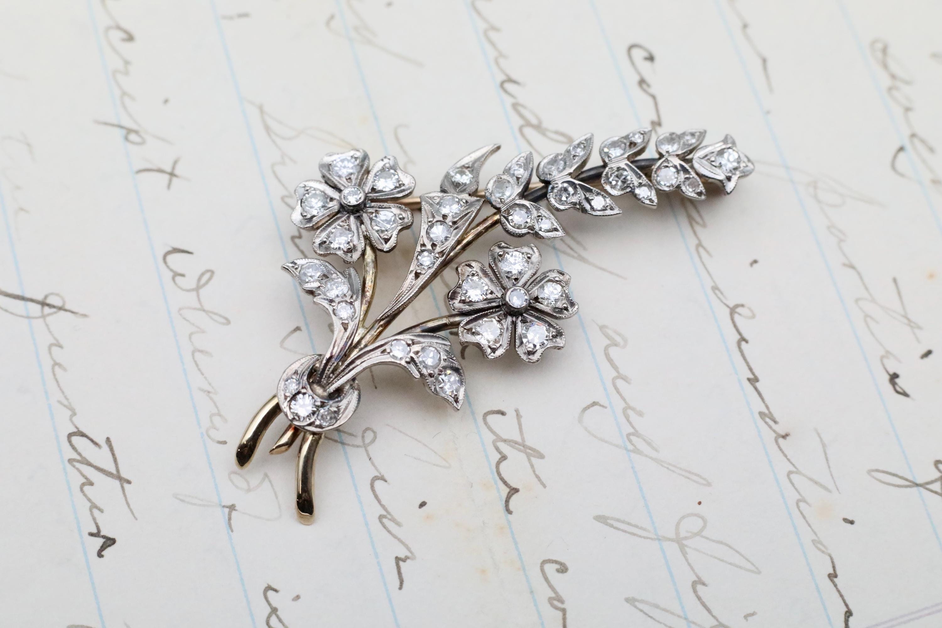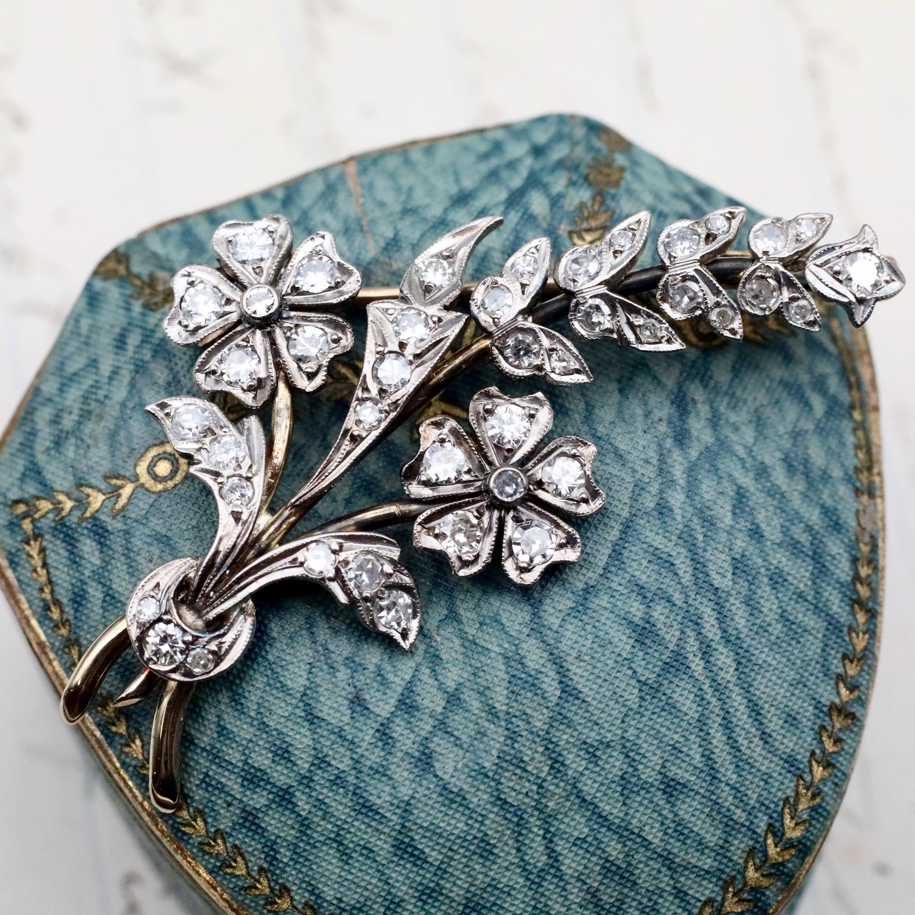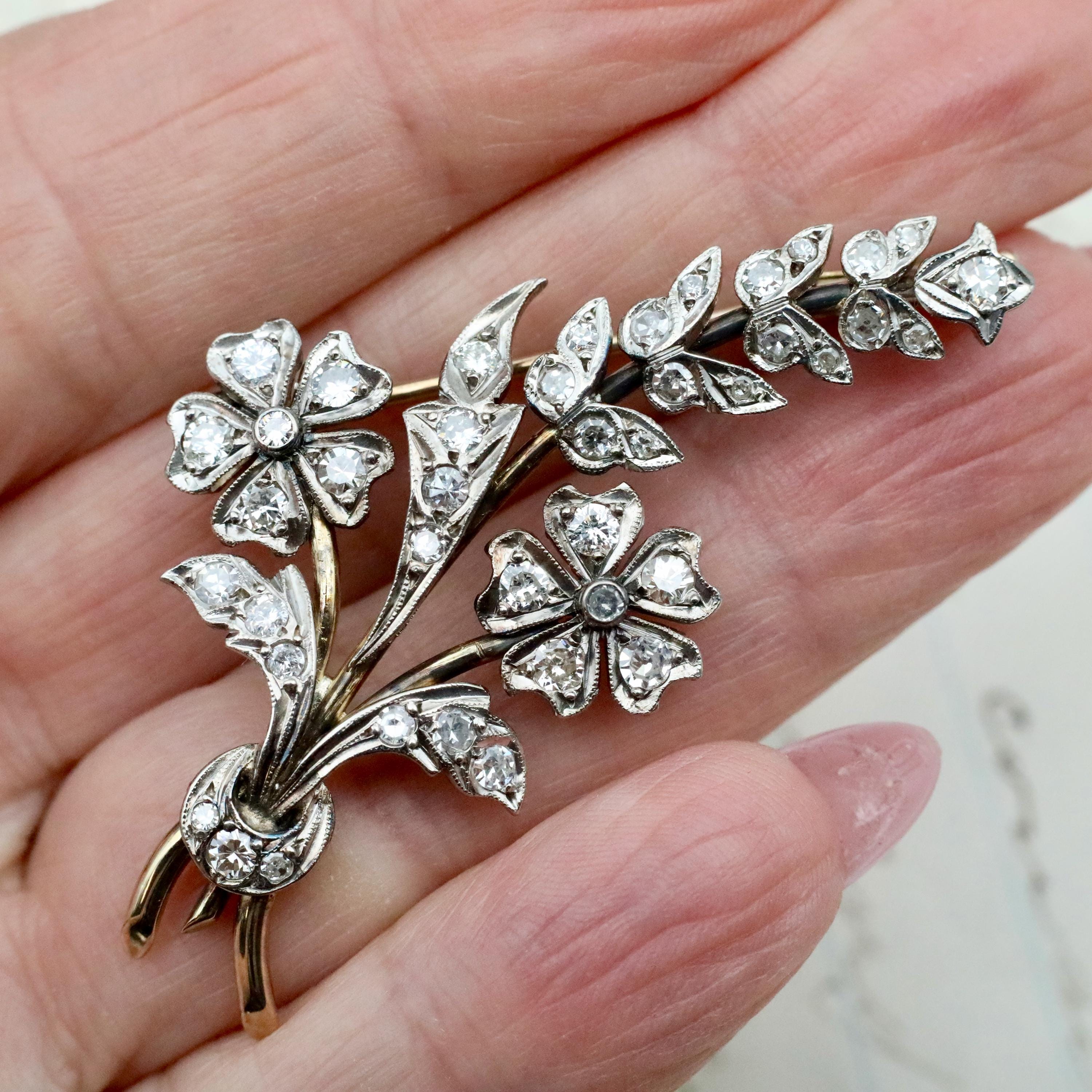 This Art Nouveau 14k gold, sterling silver and diamond flower brooch is a stunning piece of antique fine jewelry that blends artistry with sentiment. Handcrafted with exquisite detail, this brooch pin features delicate floral and butterfly-inspired motifs. Whether worn as a statement piece or gifted as a meaningful keepsake, this piece is ideal for an anniversary gift, or a unique something old for the bride.