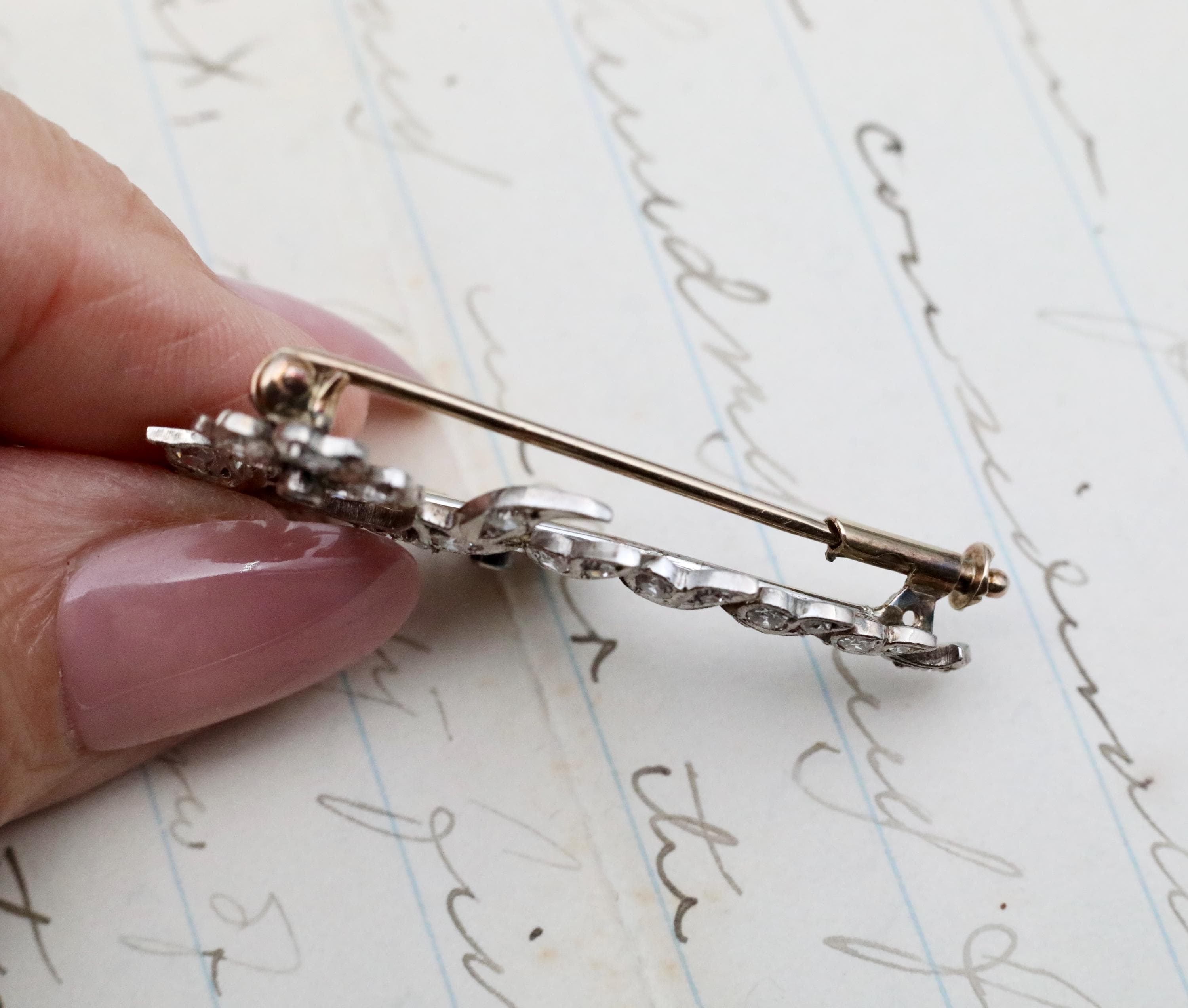 Based on materials and construction, we believe this piece to be from 1890-1910, of French make. This is a handmade piece, not die struck