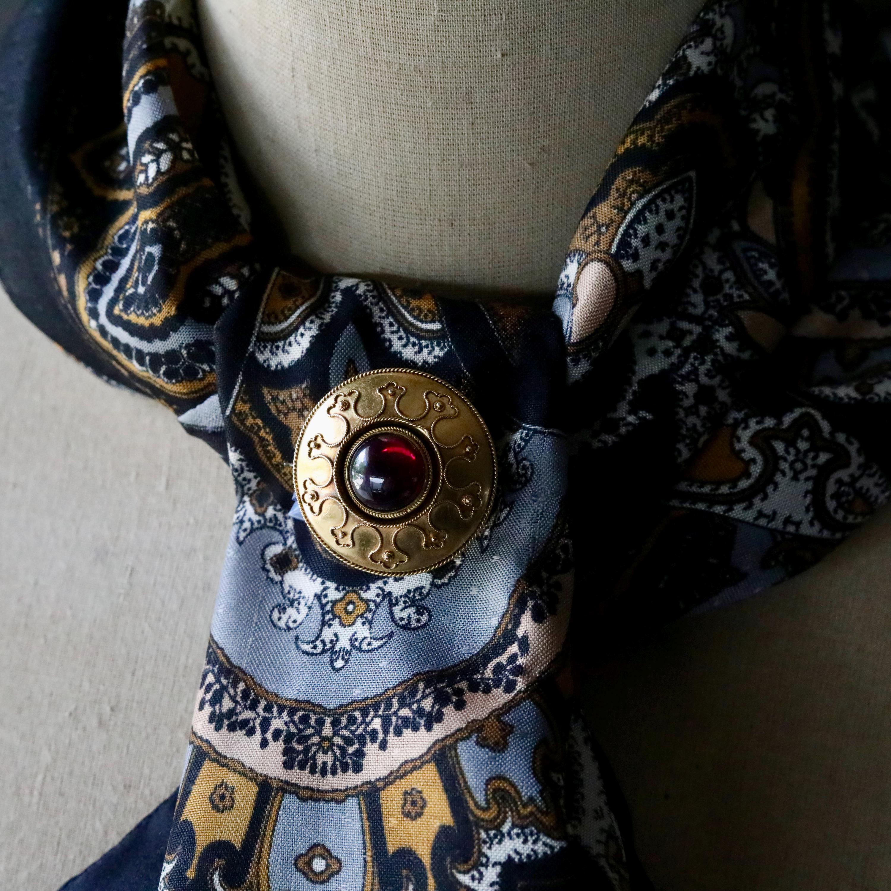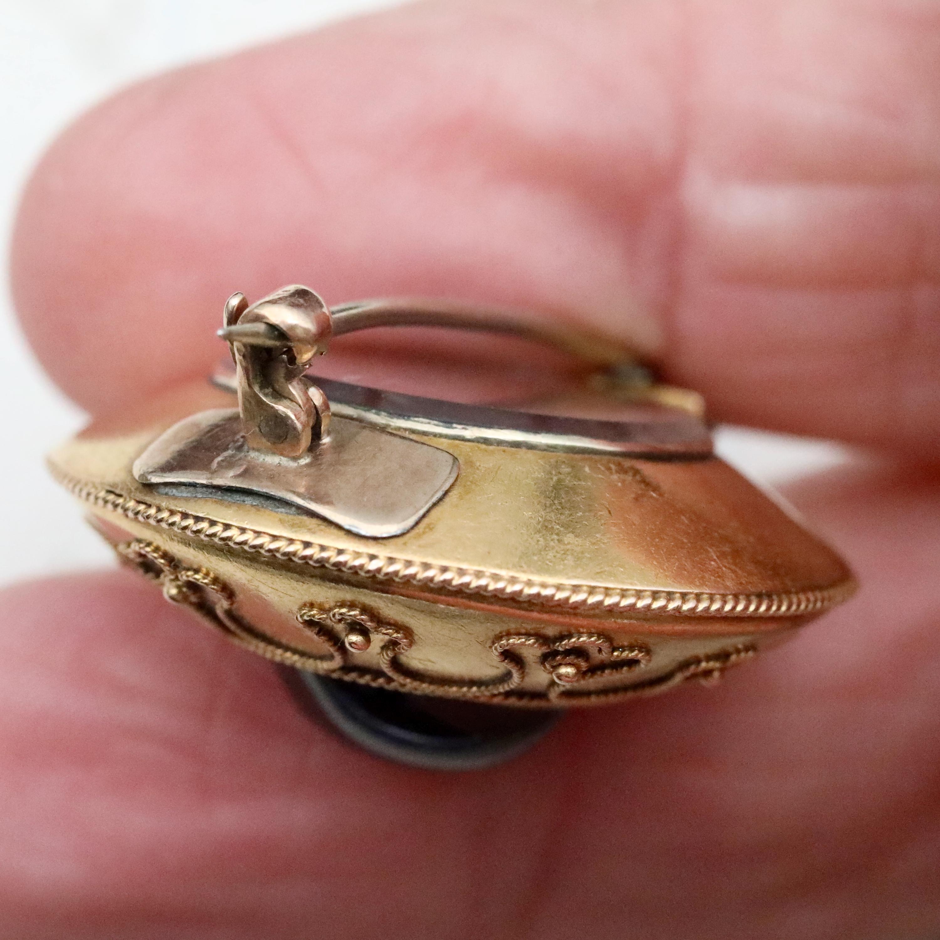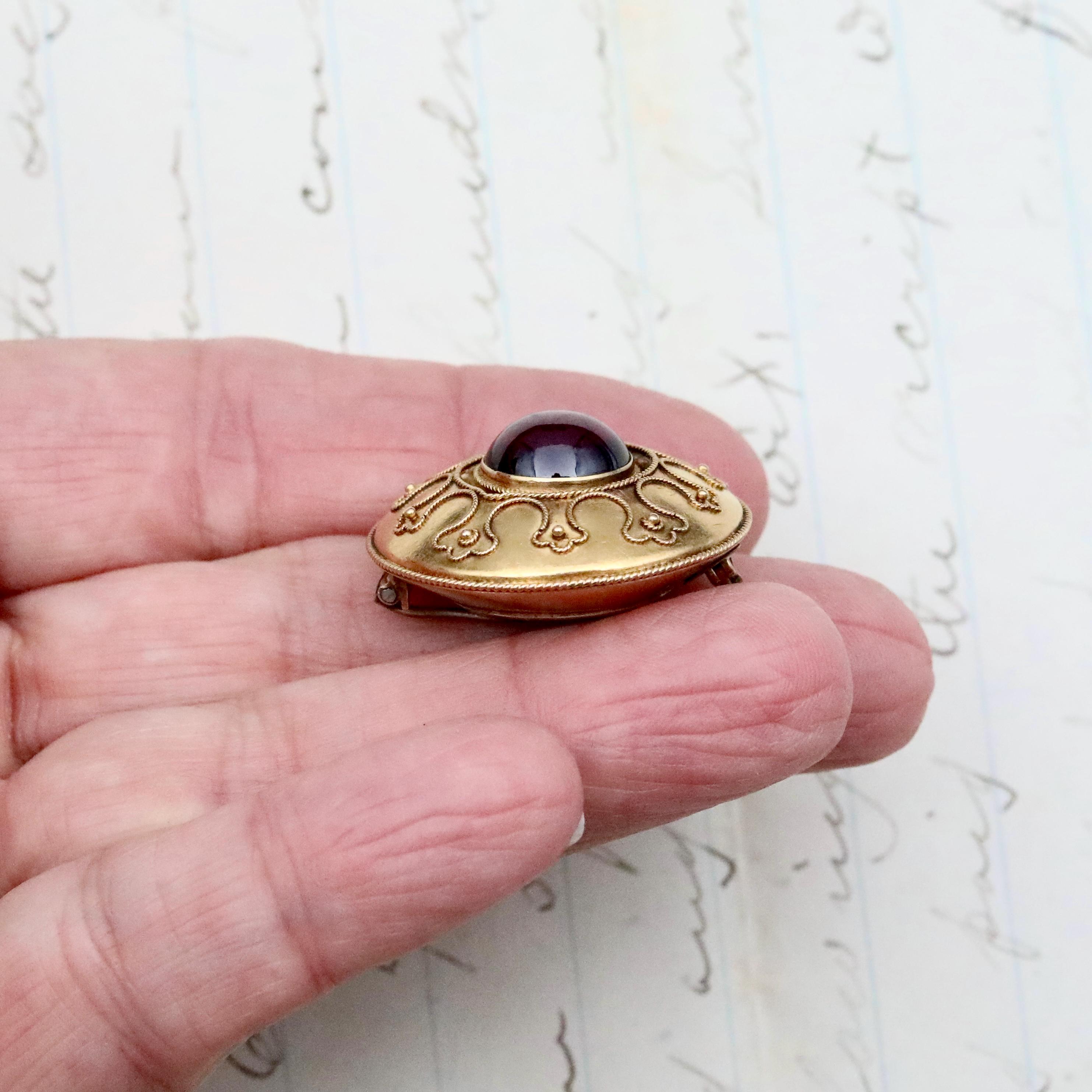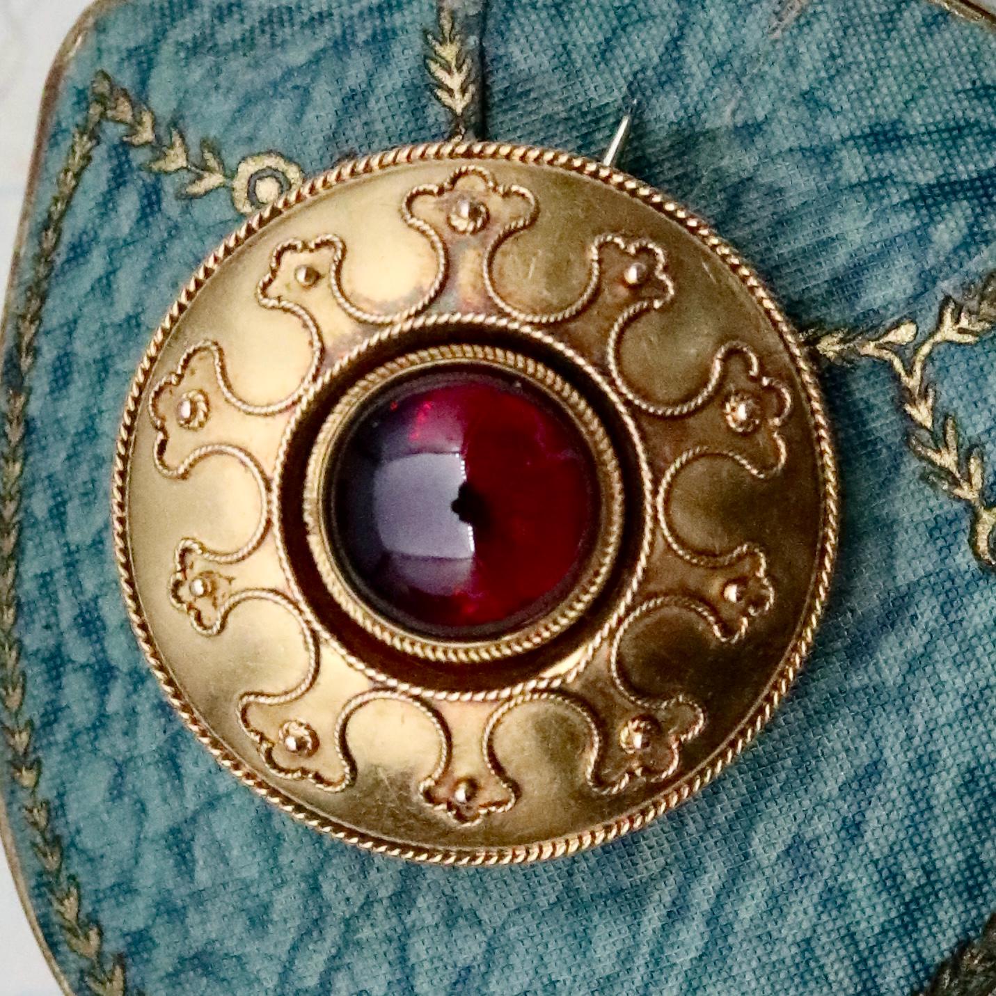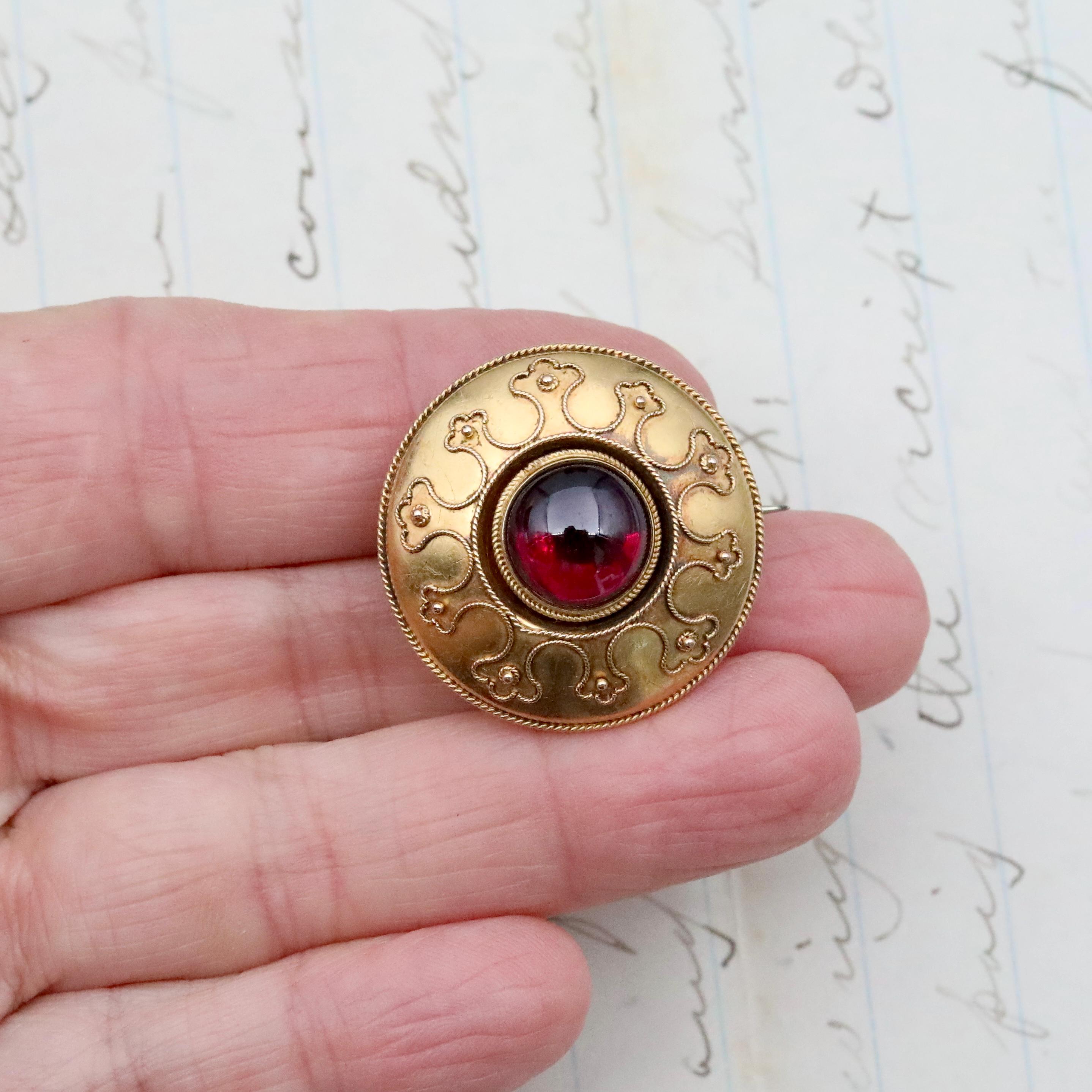 Victorian jewelers drew inspiration from every corner of the ancient world, and the Etruscan revival was among their most captivating styles. This antique mid-1800s lapel pin features a vivid raspberry-pink rubellite tourmaline cabochon set within intricate Etruscan-style wirework and granulation. The richly detailed gold dome, ringed with rope-edge borders and bead accents, creates a striking Gothic presence, refined but dramatic, collectible yet wearable.