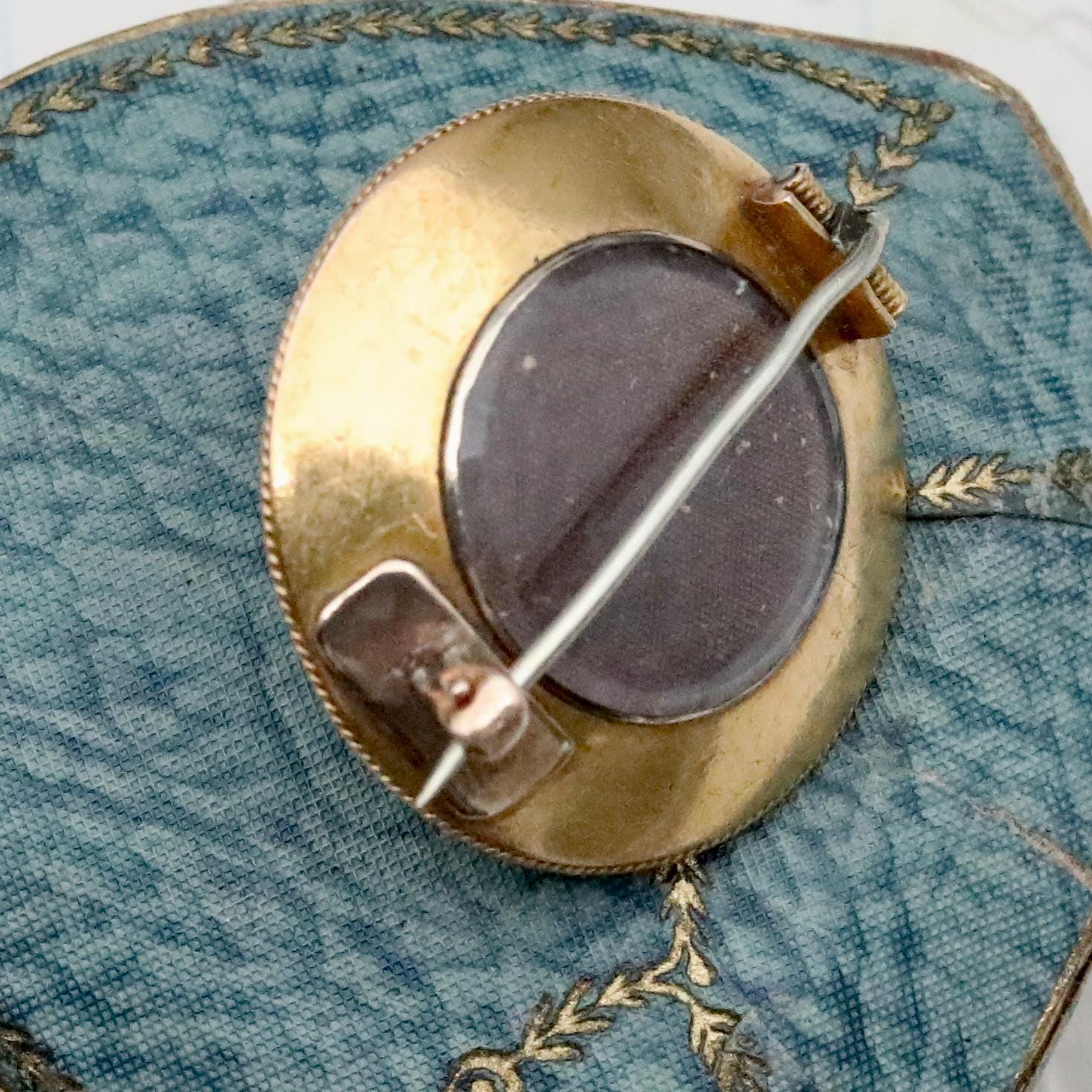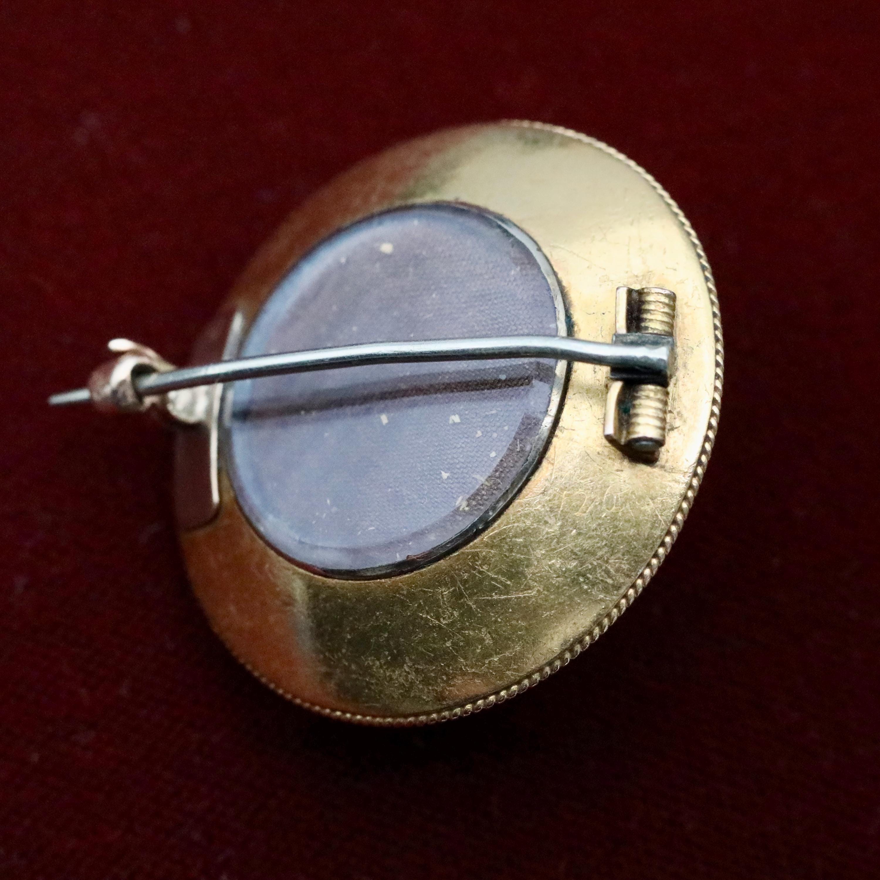 A rare surviving example of Victorian sentimental jewelry, the reverse features a crystal-covered compartment originally meant to hold a lock of hair or a tiny portrait. It currently retains only the original textile backing, a reminder of its intimate past. The cabochon tourmaline displays excellent transparency and color, confirmed by a GIA gemologist.