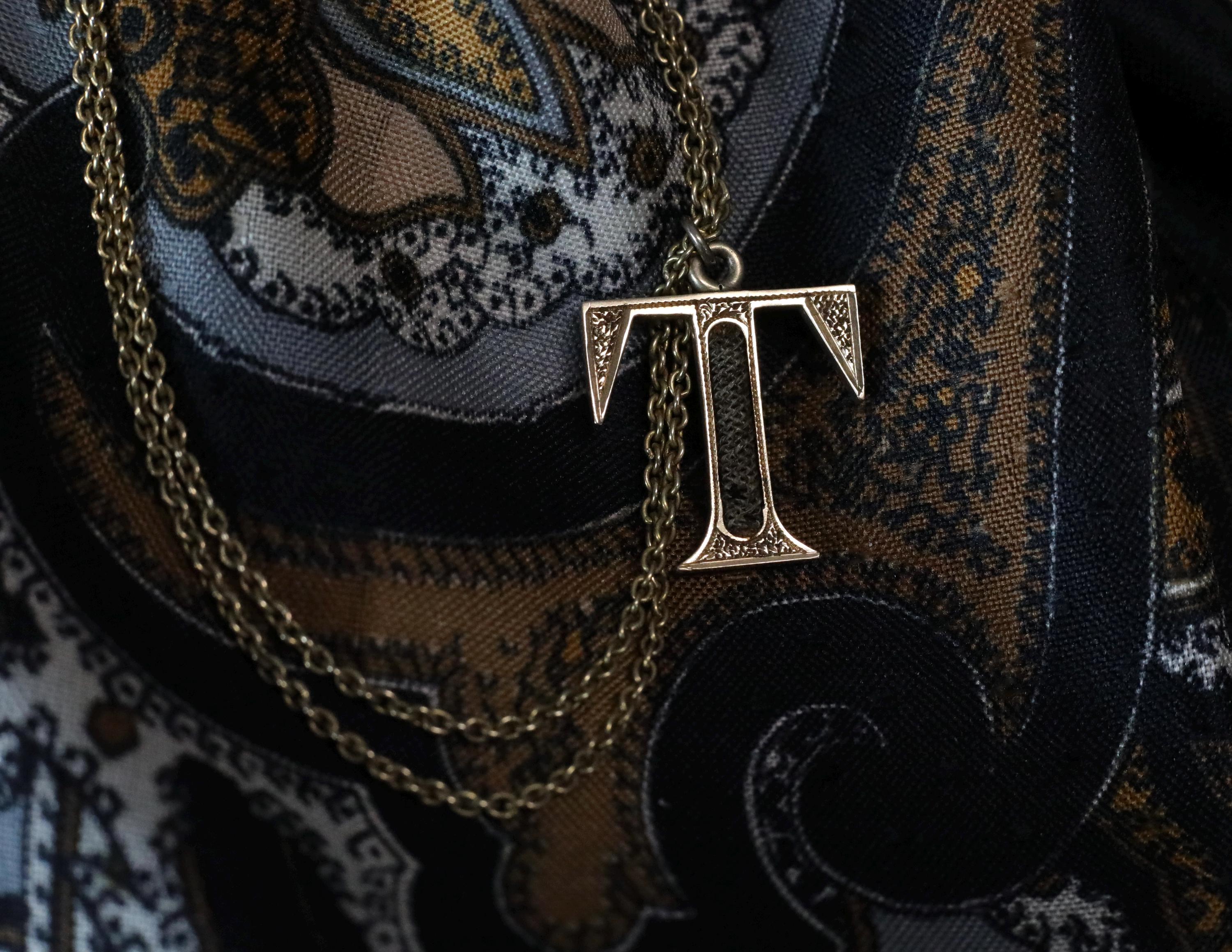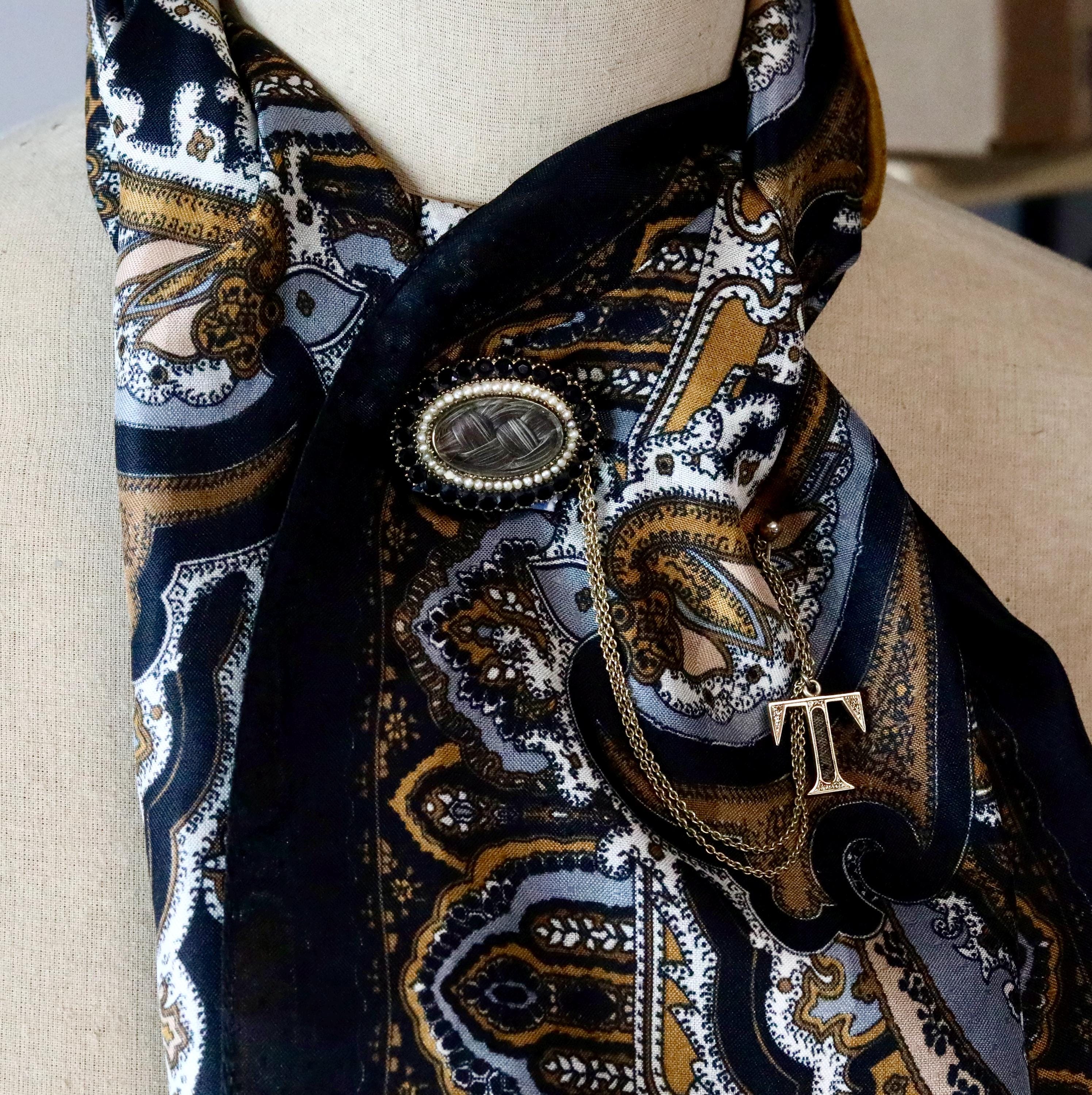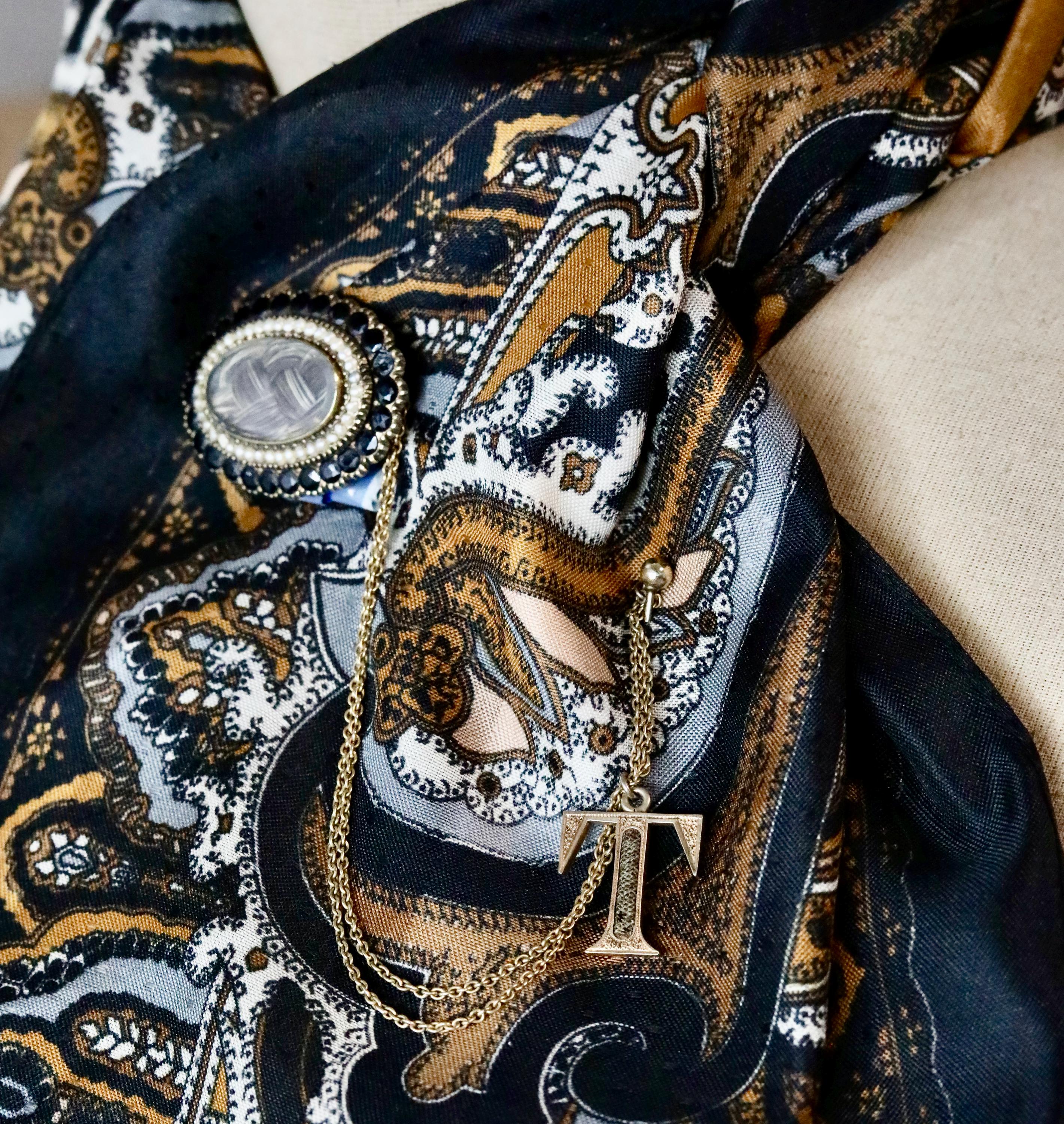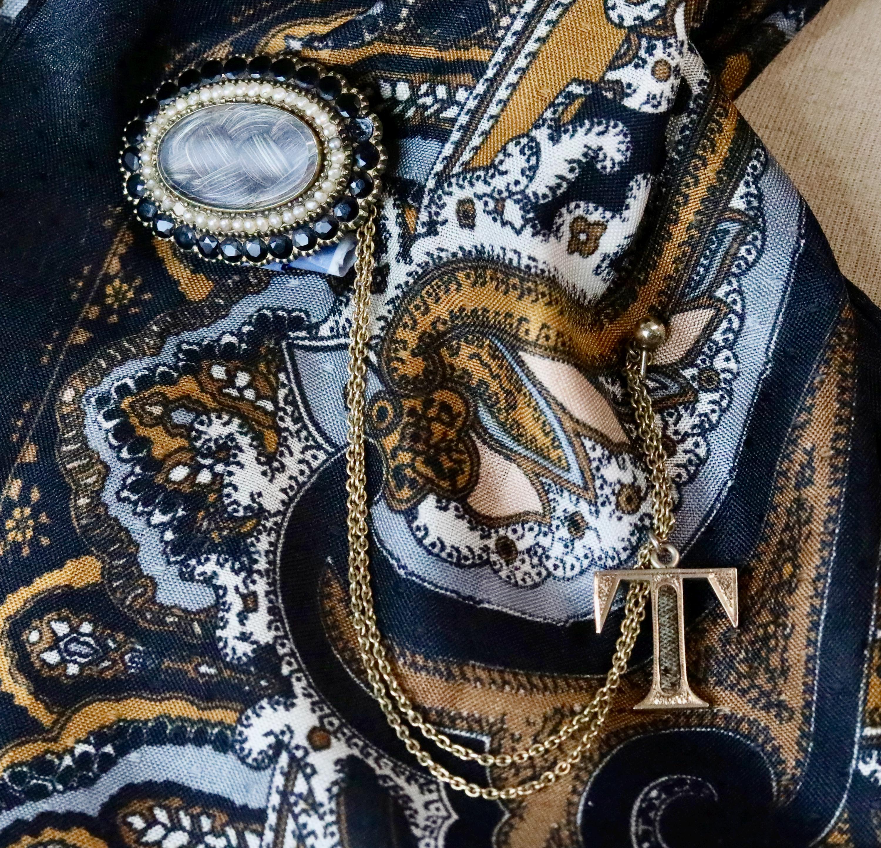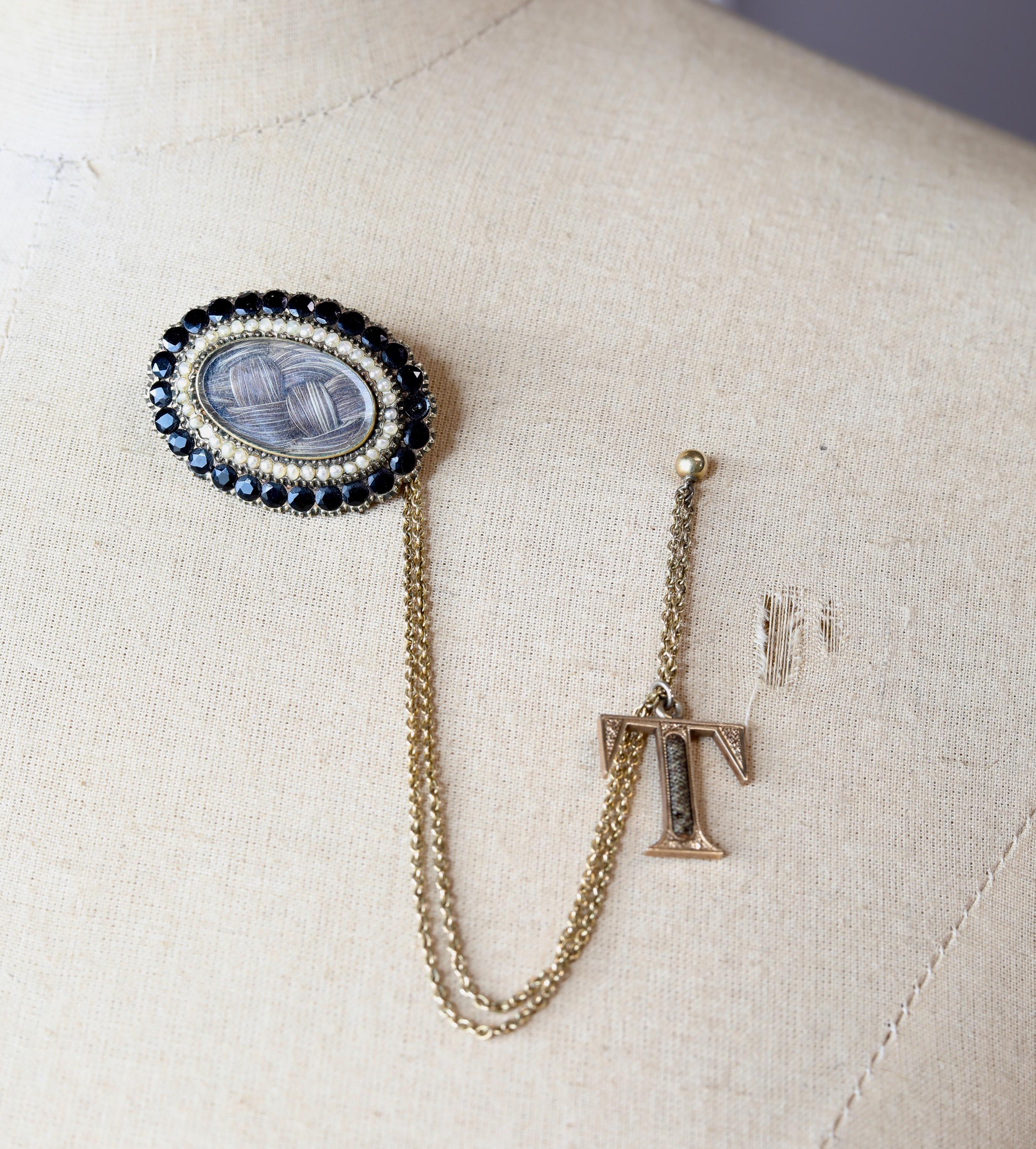 One of the most exceptional details is the articulated capital letter T charm, suspended from its original gold chain. The charm contains carefully woven hair set inside the vertical shaft—a highly unusual and desirable Victorian feature. The safety pin attachment shows a twisted shaft, another hallmark of 19th-century craftsmanship.