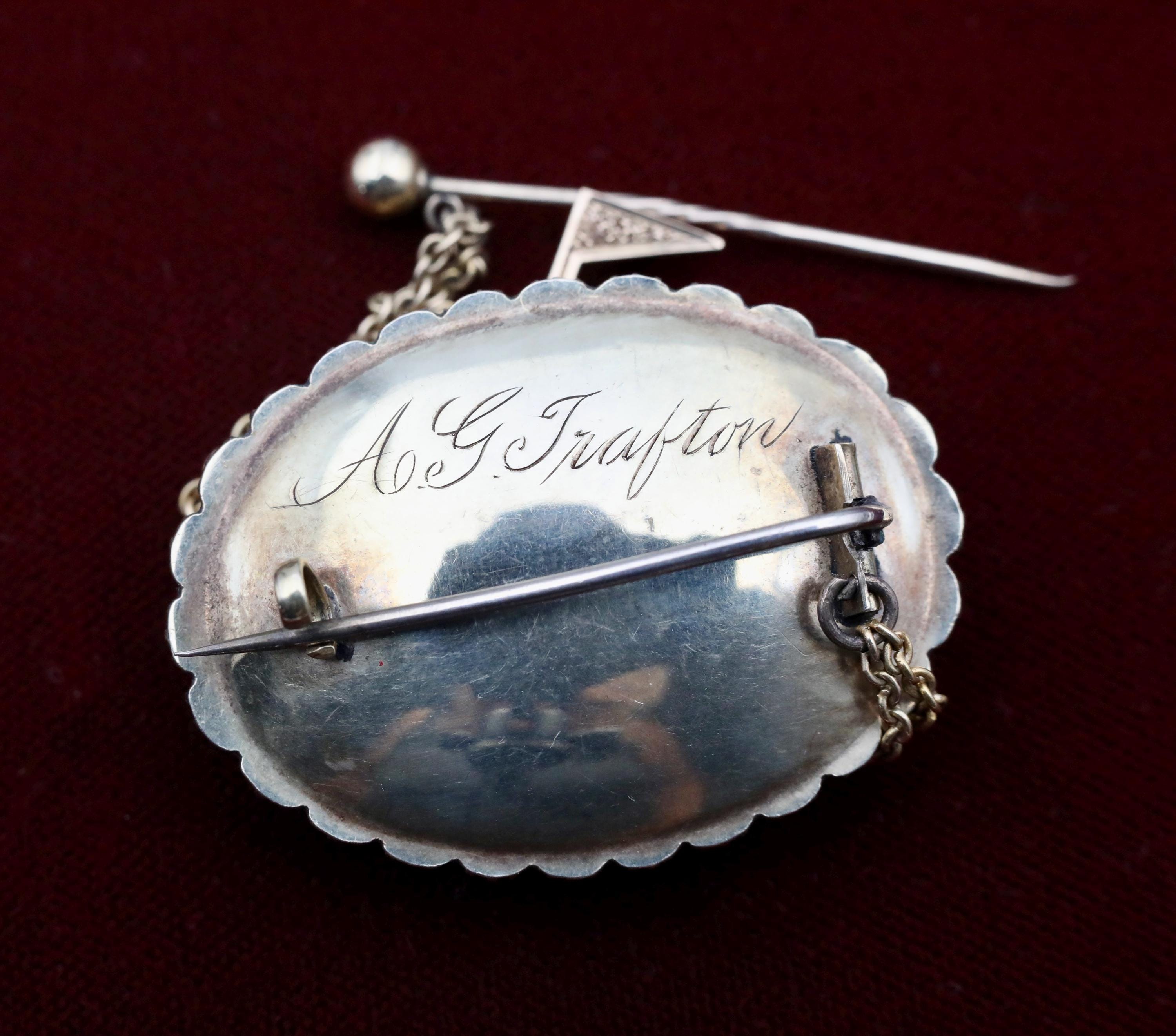 The reverse is engraved “A.G. Trafton,” adding genealogy and historical character. Trafton families were well documented in Maine and New Hampshire throughout the 1800s, including references to an A.G. Trafton in Alfred, Maine. Named mourning pieces with intact hairwork are particularly sought-after by collectors.